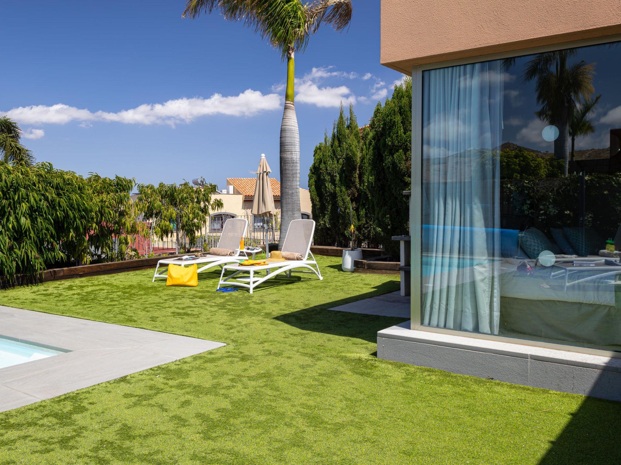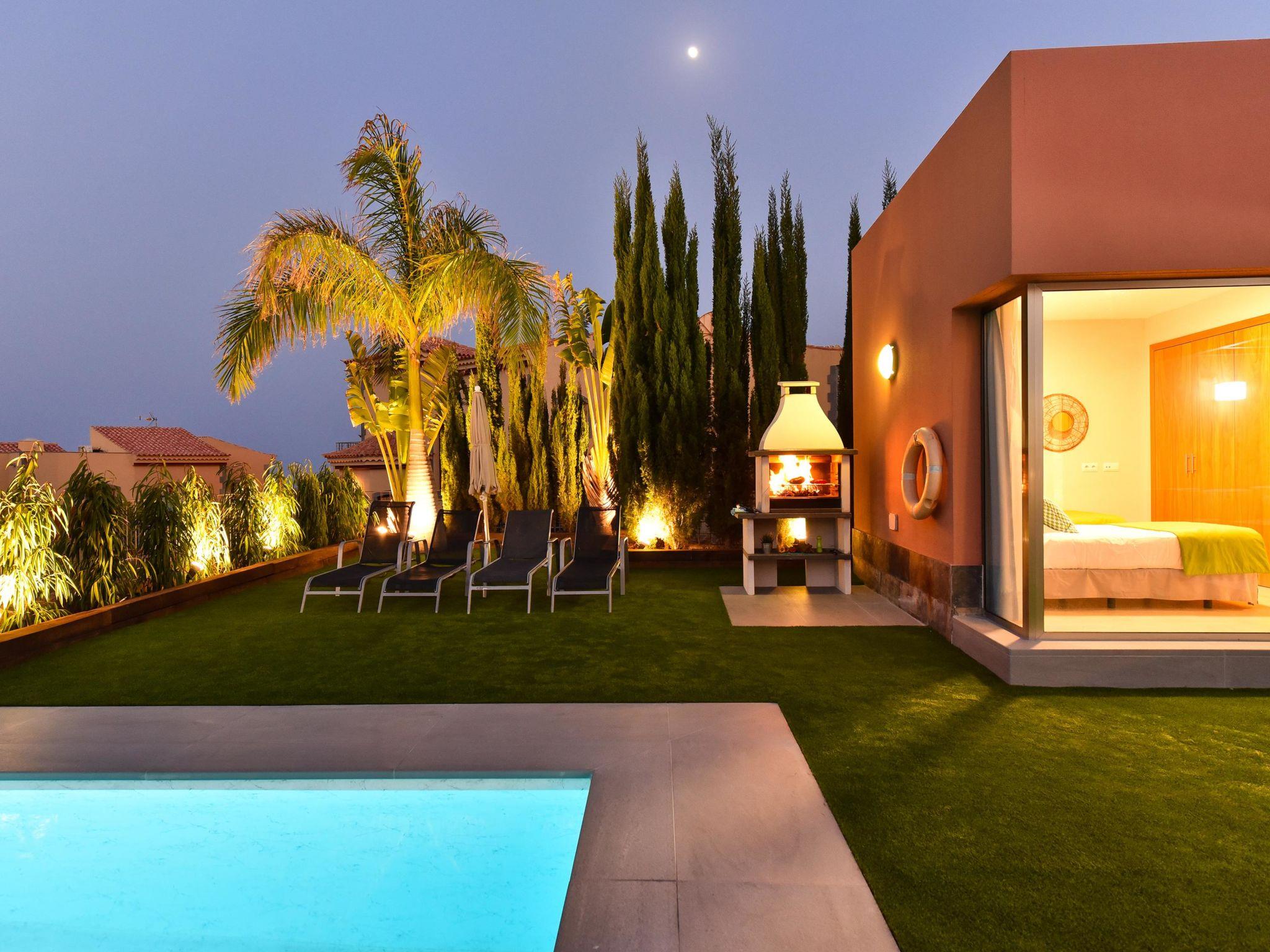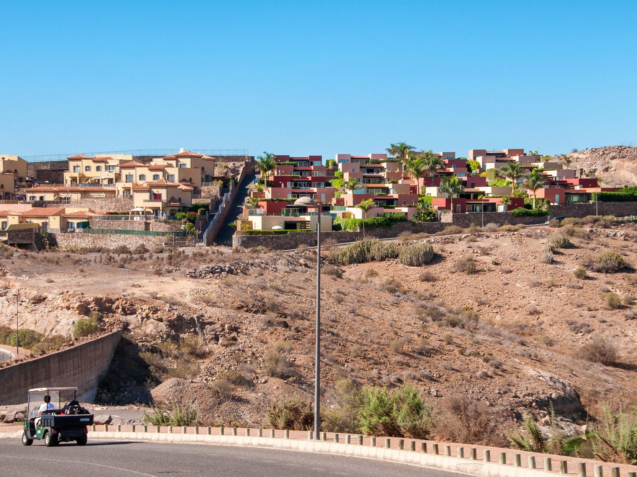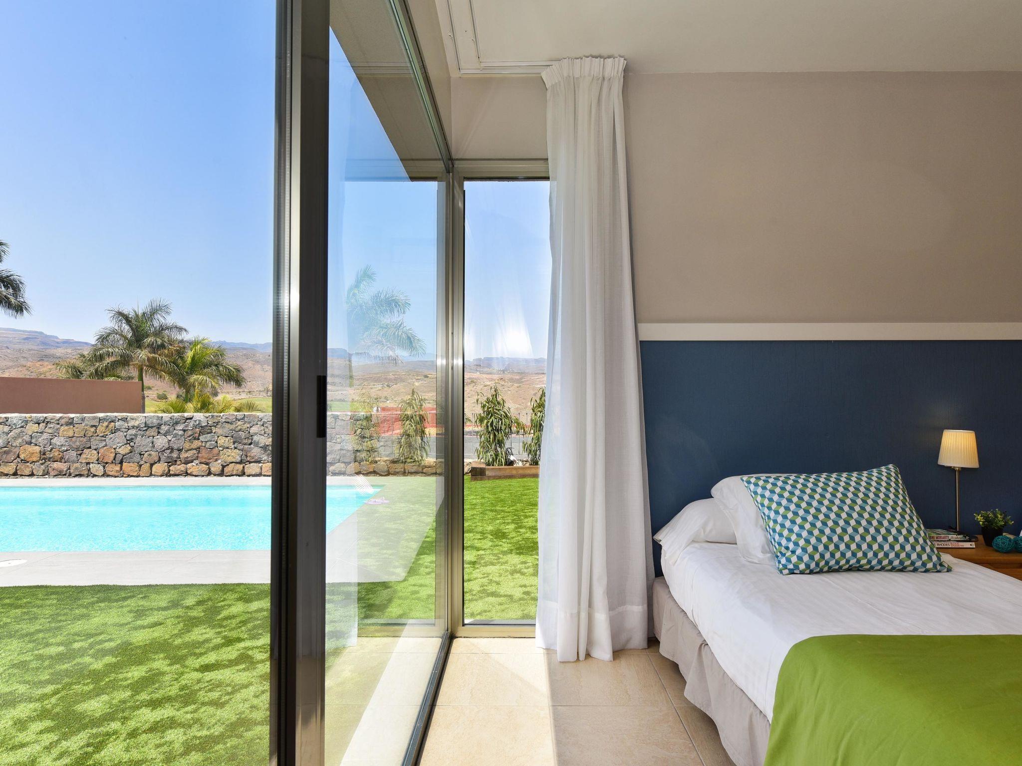 Modern, comfortable villa "Par4 Villa 8". In the centre of Salobre Golf Resort Maspalomas 5 km Meloneras 7 km, in a quiet, sunny, elevated position in the residential district. Private: property 380 m2 (fenced), garden 80 m2, lawn for sunbathing, swimming pool (8 x 4 m, depth 140 cm, seasonal availability: 01.Jan. - 31.Dec.). Garden furniture, barbecue. In the house: air conditioning, laundry, washing machine. Shop 4 km, shopping centre 1 km, restaurant 200 m, bus stop "Las Crucitas" 19 km, sandy beach "3000". Please note: car recommended. Baby equipment on request. The owner does not accept any youth groups. Airfield 25 km from the property.