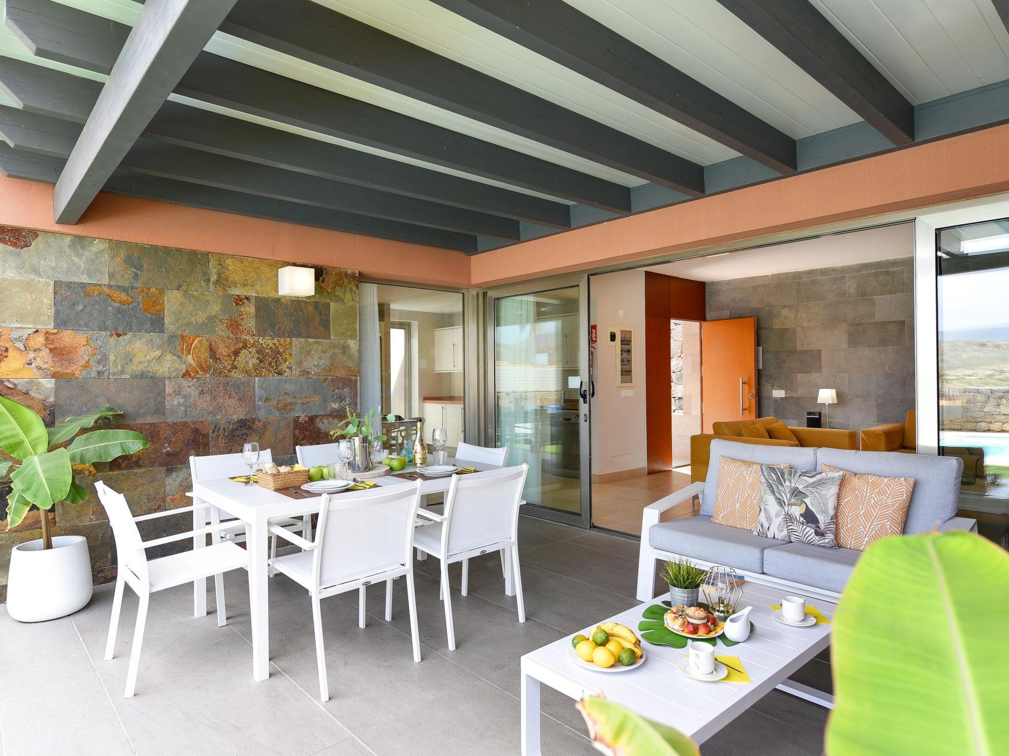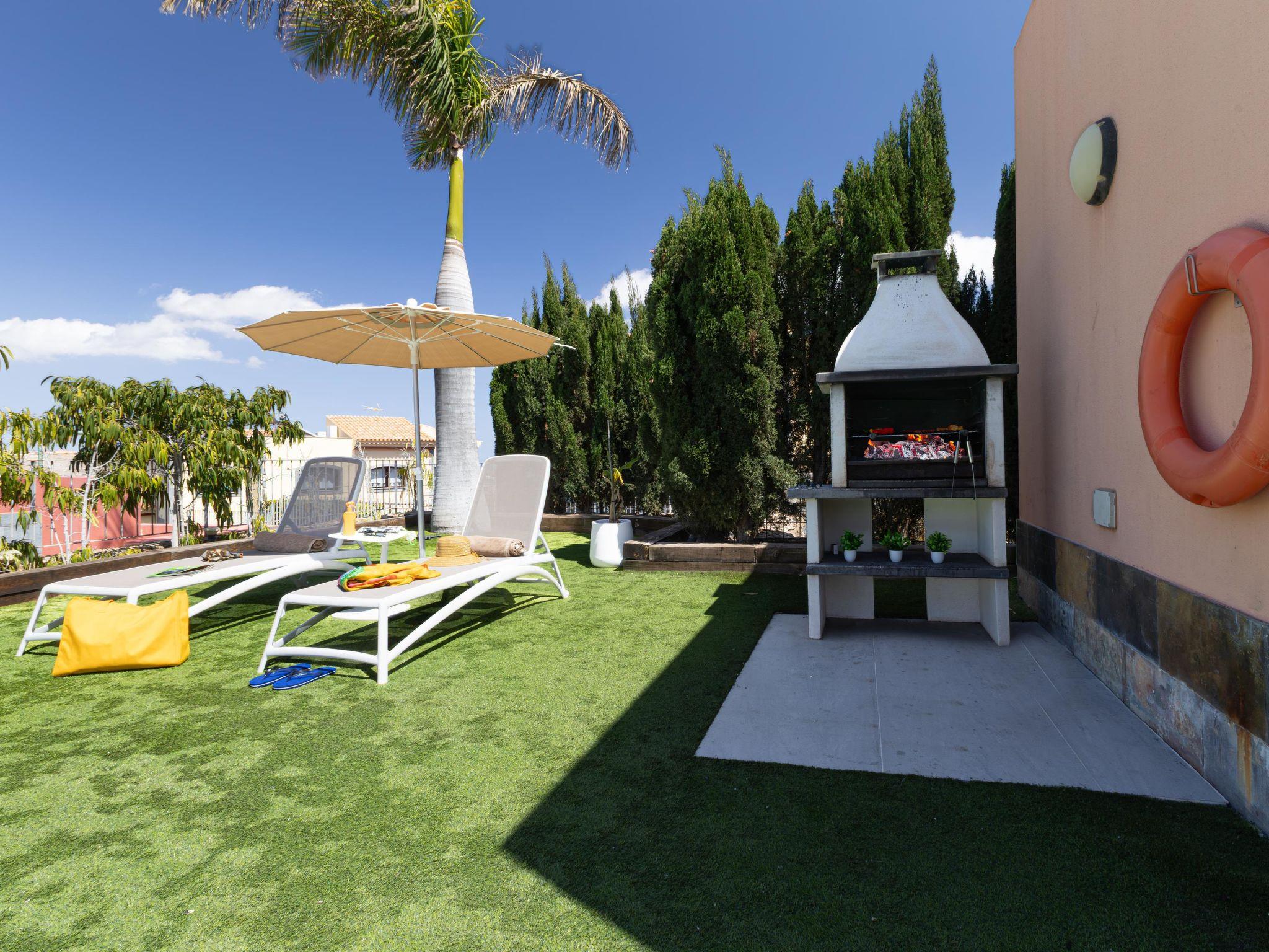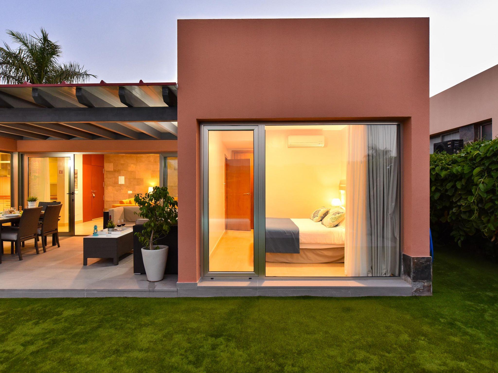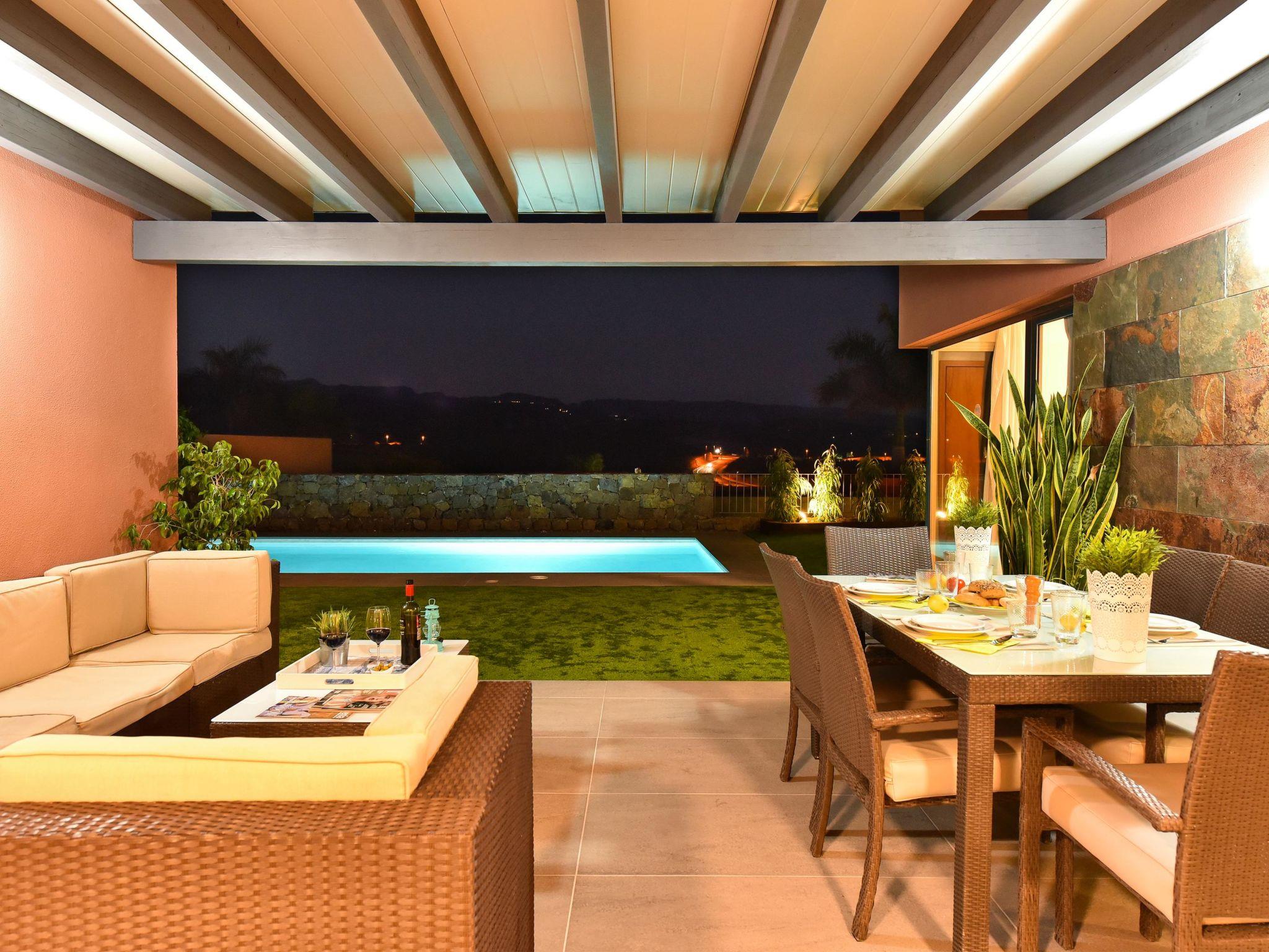 Modern, comfortable villa "Par4 Villa 8". In the centre of Salobre Golf Resort Maspalomas 5 km Meloneras 7 km, in a quiet, sunny, elevated position in the residential district. Private: property 380 m2 (fenced), garden 80 m2, lawn for sunbathing, swimming pool (8 x 4 m, depth 140 cm, seasonal availability: 01.Jan. - 31.Dec.). Garden furniture, barbecue. In the house: air conditioning, laundry, washing machine. Shop 4 km, shopping centre 1 km, restaurant 200 m, bus stop "Las Crucitas" 19 km, sandy beach "3000". Please note: car recommended. Baby equipment on request. The owner does not accept any youth groups. Airfield 25 km from the property.