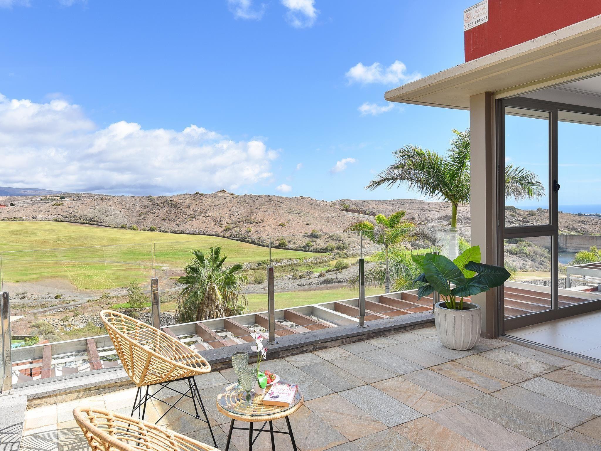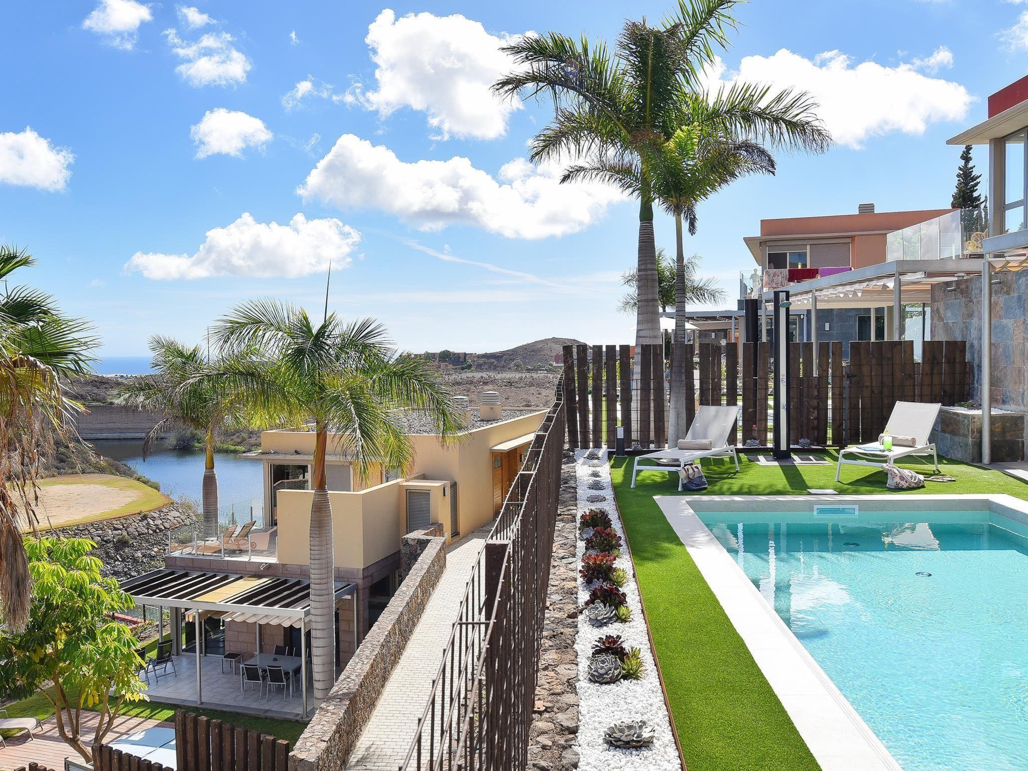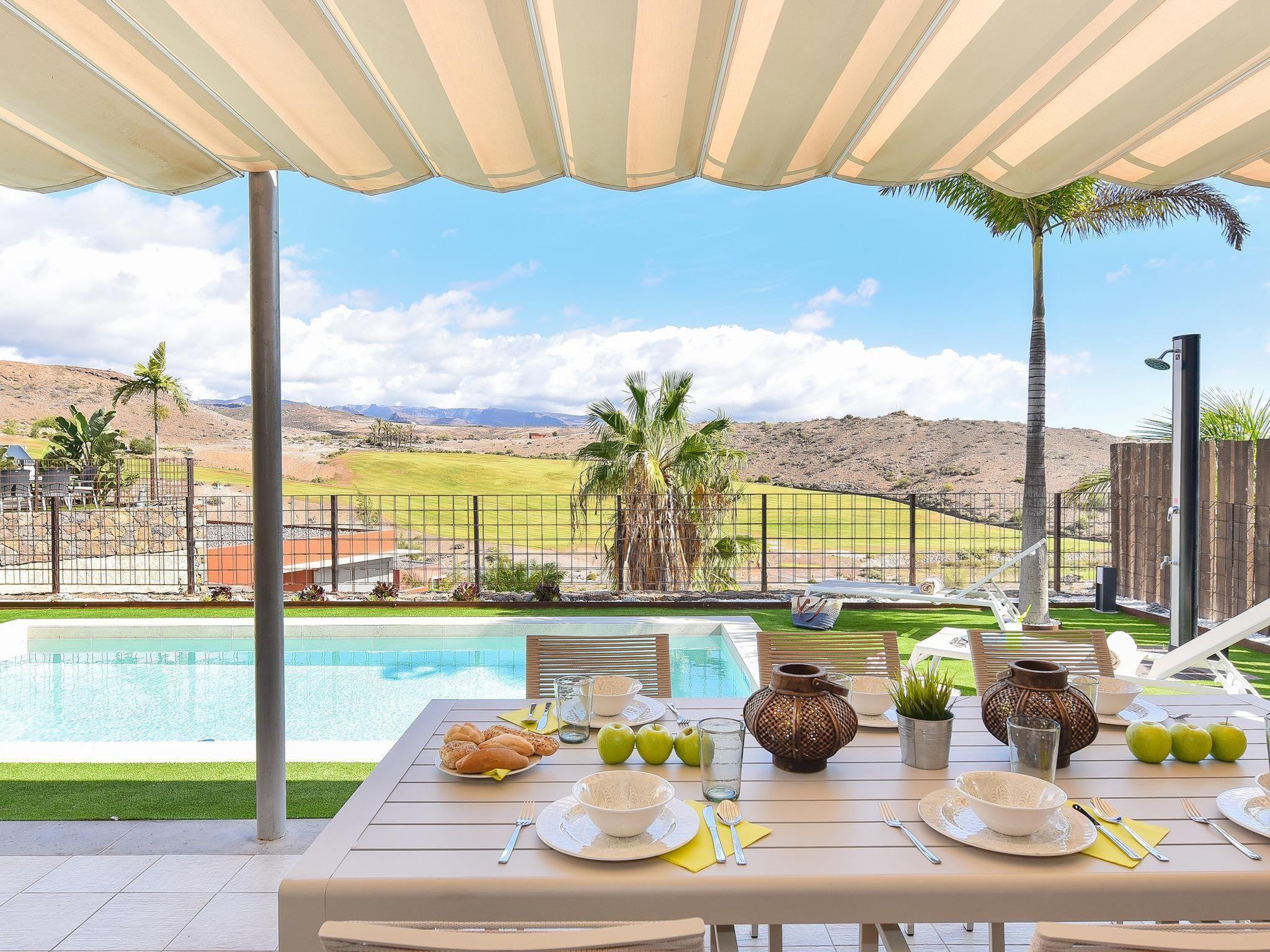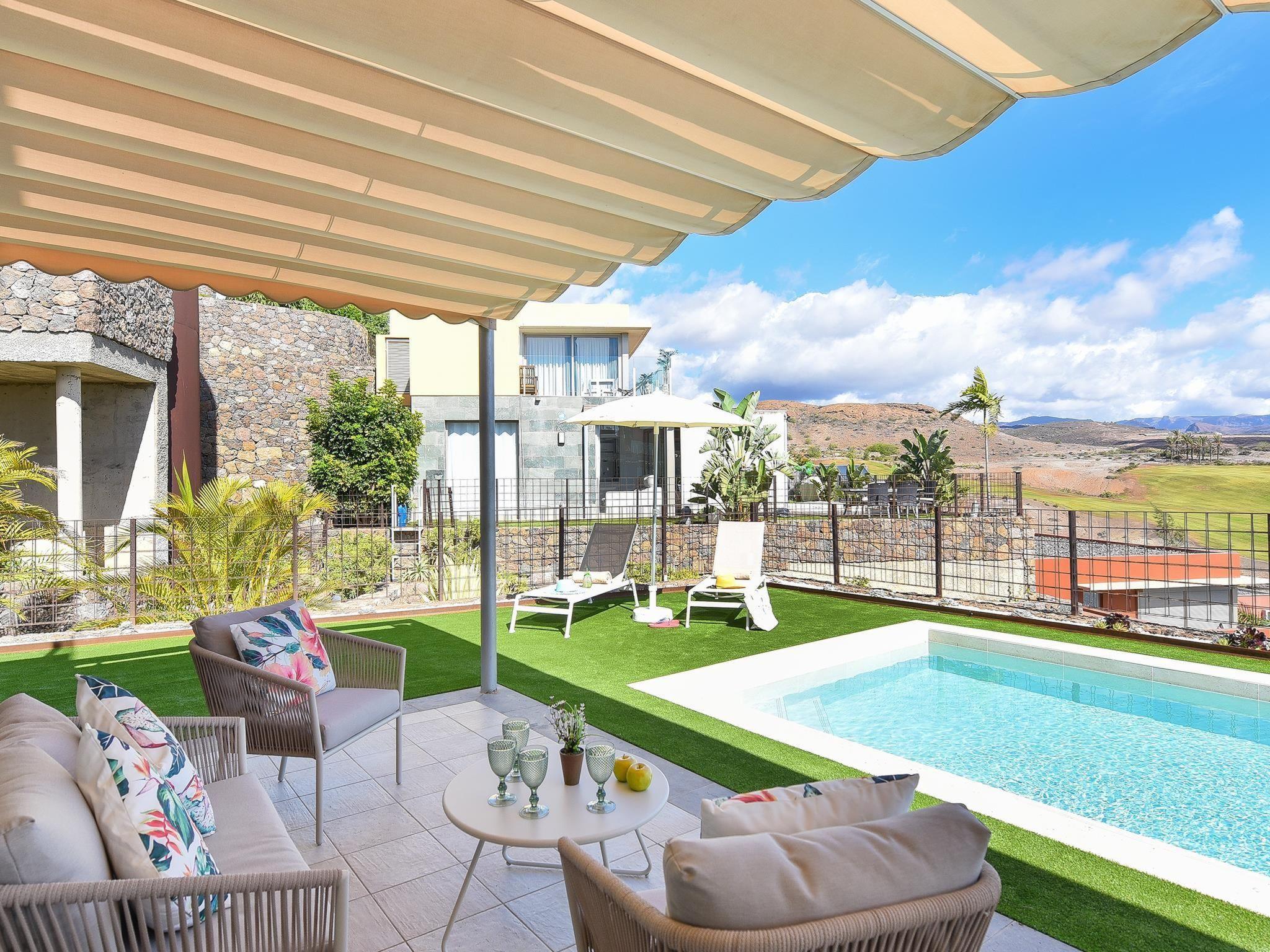 Modern, comfortable villa "Villa Dragos 4", renovated in 2020. In the centre of Salobre Golf Resort, in a secluded, quiet, sunny position in the residential district. Private: garden (fenced) with lawn, swimming pool angular (6 x 3 m, depth 100 - 100 cm, seasonal availability: 01.Jan. - 31.Dec.). Barbecue. In the house: sun terrace, air conditioning. Parking on the premises, public parking on the road. Bus stop "Las Crucitas" 19 km. The owner does not accept any youth groups. Neighbourhood highly sensitive to noise. Quietness and good behaviour expected.