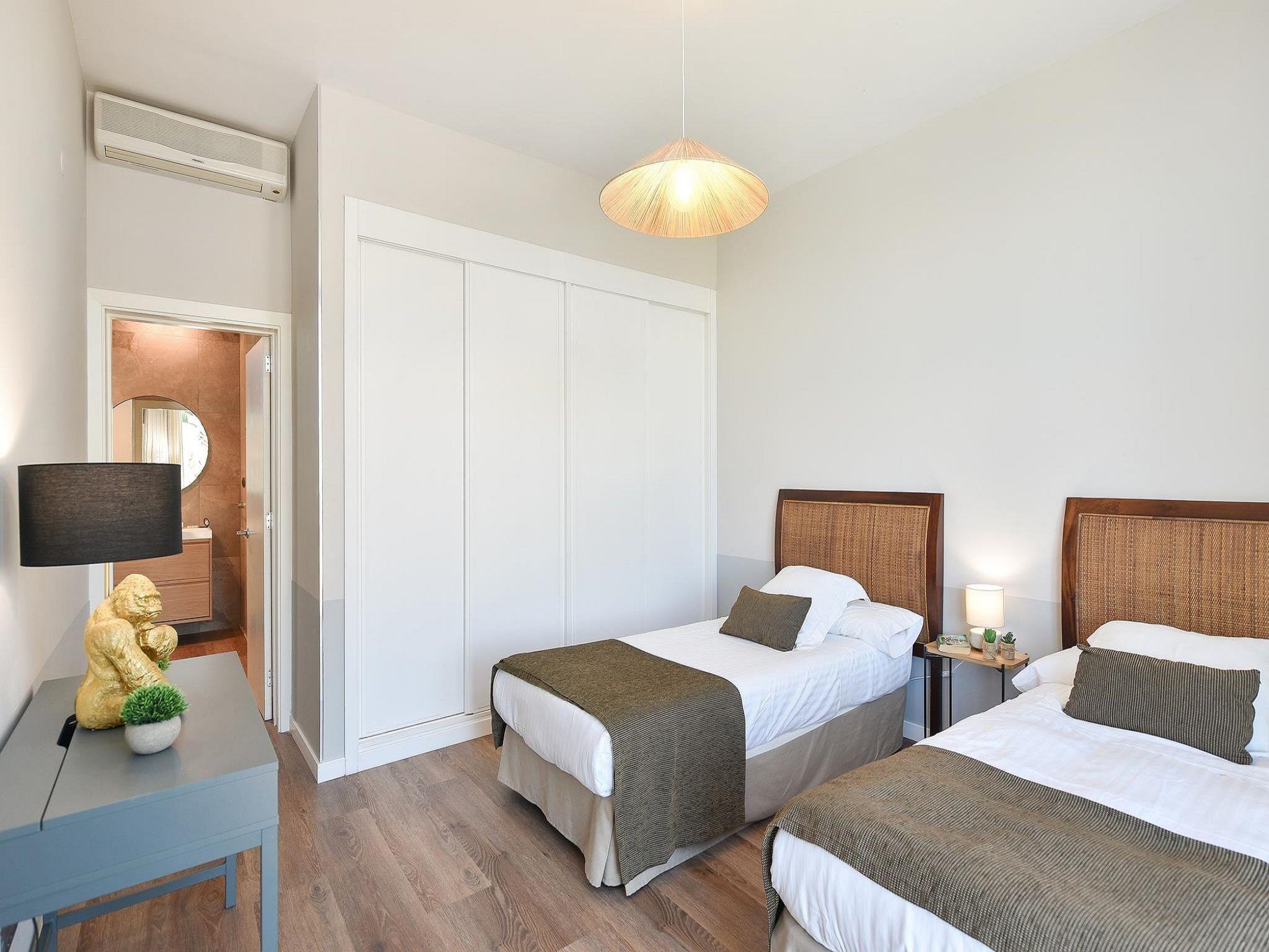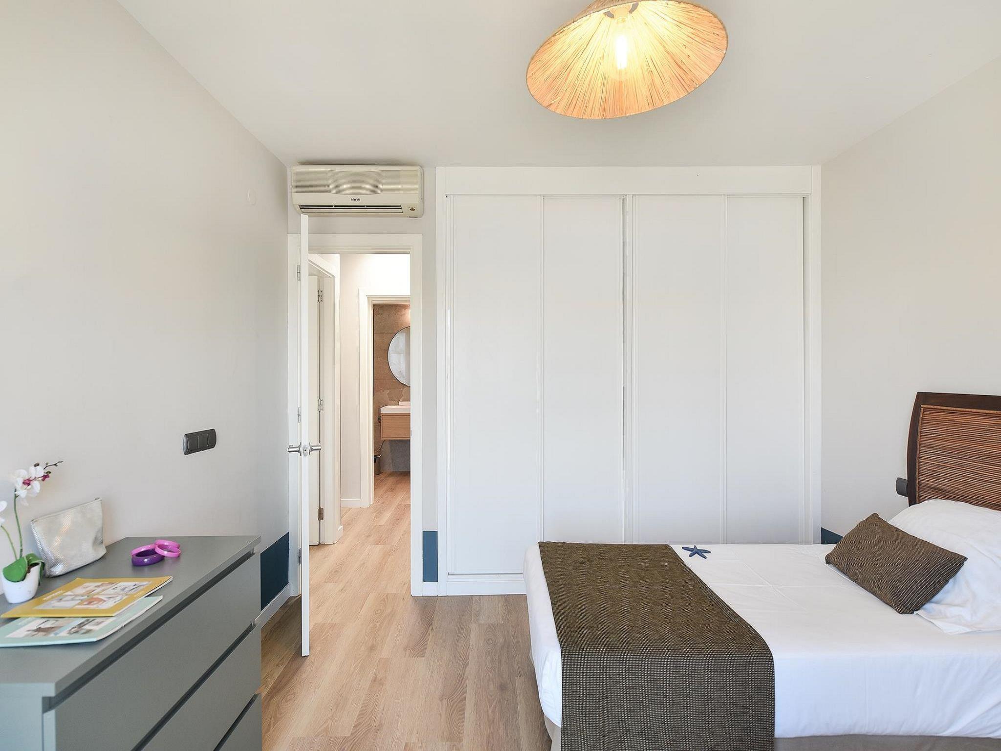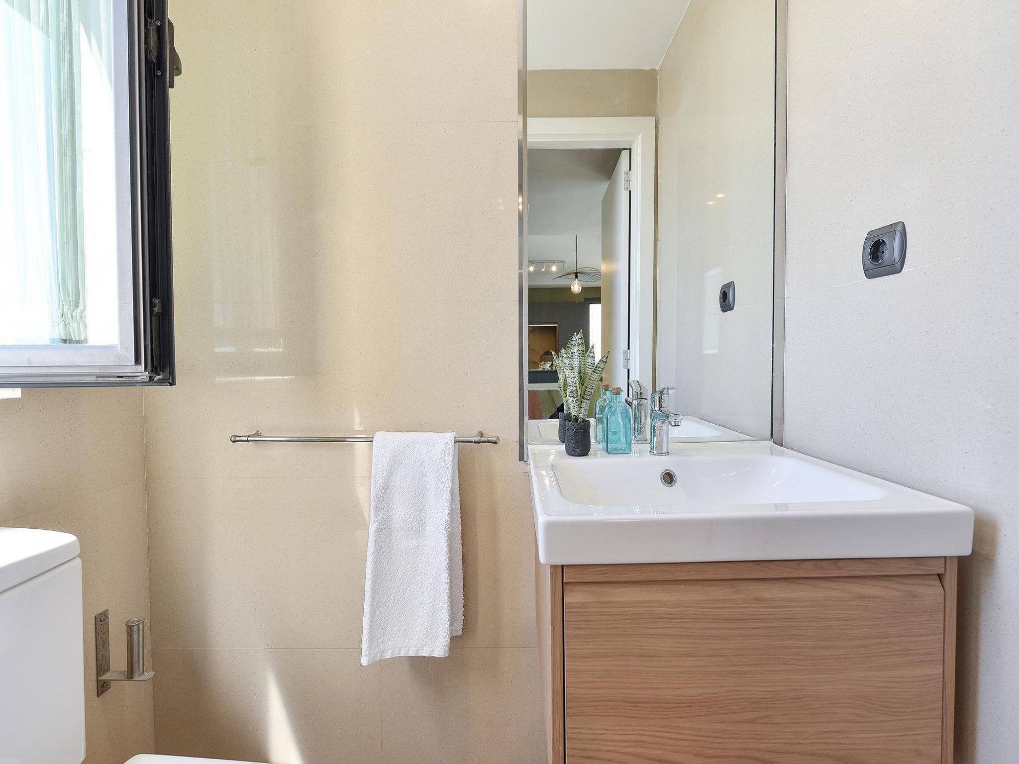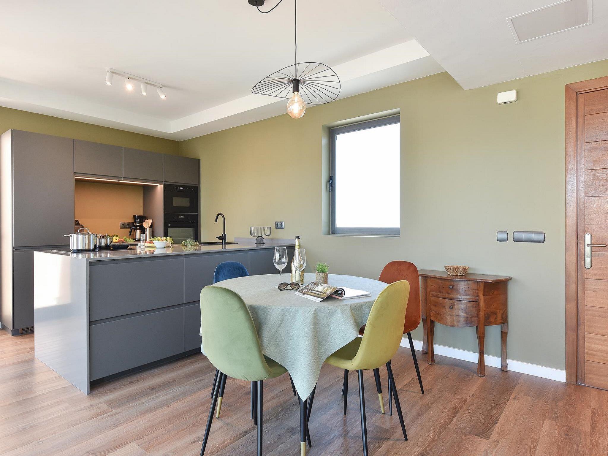 4-room house 115 m2. Modern furnishings: living/dining room with dining table, satellite TV, cable TV, digital TV, DVD and air conditioning. Exit to the patio. 1 room with 2 beds and shower/WC. Open kitchen (oven, dishwasher, 4 ceramic glass hob hotplates, toaster, kettle, microwave, freezer, electric coffee machine). Upper floor: 1 room with 1 french bed, shower/WC and air conditioning. 1 room with shower/WC and air conditioning. Balcony, patio. Terrace furniture, balcony furniture, barbecue, deck chairs. View of the mountains. Facilities: washing machine, iron, children's high chair, baby cot for up to 2 year olds, hair dryer. Internet (WiFi, free). Parking (1 car). Please note: non-smoking house. Maximum 1 pet/ dog allowed. 2024-T16525 // Reg. Nr.: ESFCTU0000350120003157900000000000000VV-35-1-00019332