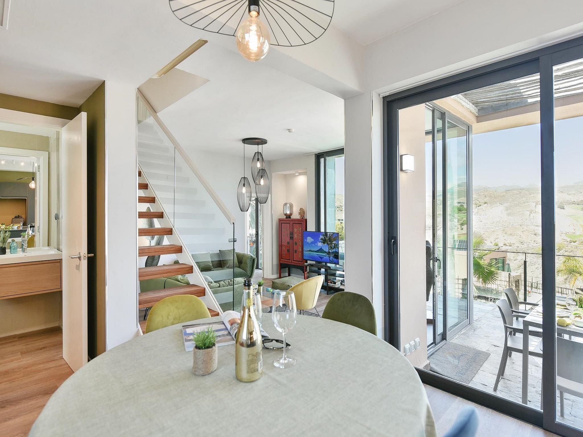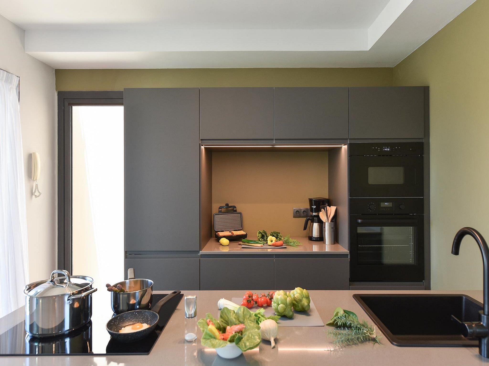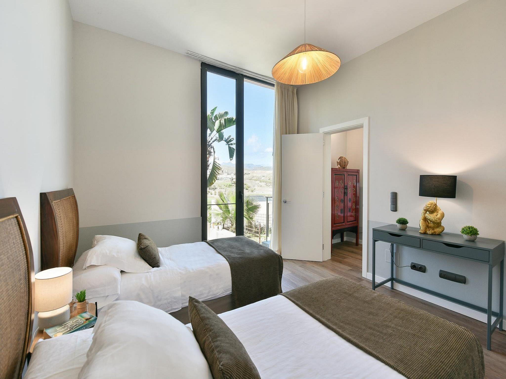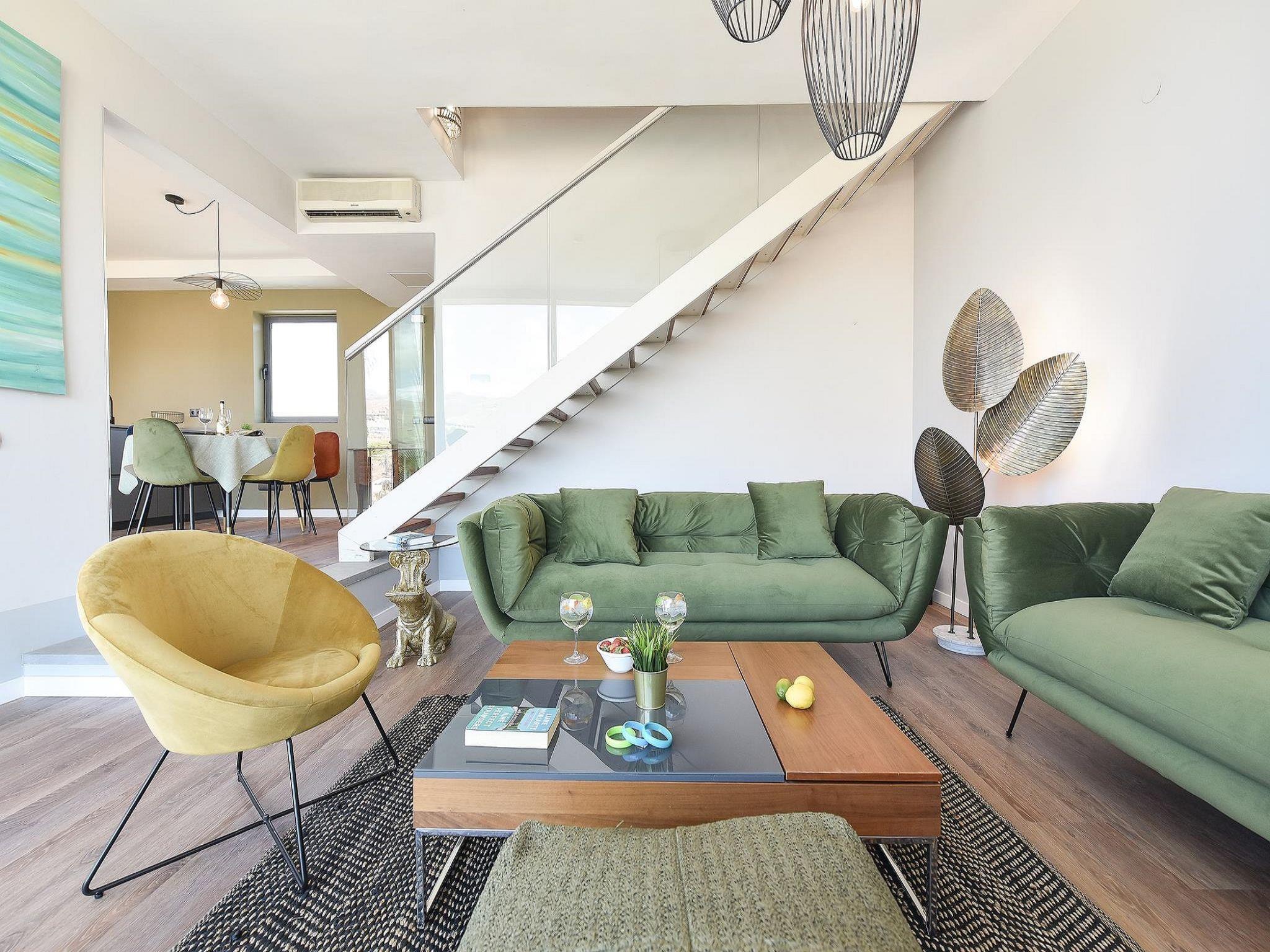 4-room house 115 m2. Modern furnishings: living/dining room with dining table, satellite TV, cable TV, digital TV, DVD and air conditioning. Exit to the patio. 1 room with 2 beds and shower/WC. Open kitchen (oven, dishwasher, 4 ceramic glass hob hotplates, toaster, kettle, microwave, freezer, electric coffee machine). Upper floor: 1 room with 1 french bed, shower/WC and air conditioning. 1 room with shower/WC and air conditioning. Balcony, patio. Terrace furniture, balcony furniture, barbecue, deck chairs. View of the mountains. Facilities: washing machine, iron, children's high chair, baby cot for up to 2 year olds, hair dryer. Internet (WiFi, free). Parking (1 car). Please note: non-smoking house. Maximum 1 pet/ dog allowed. 2024-T16525 // Reg. Nr.: ESFCTU0000350120003157900000000000000VV-35-1-00019332