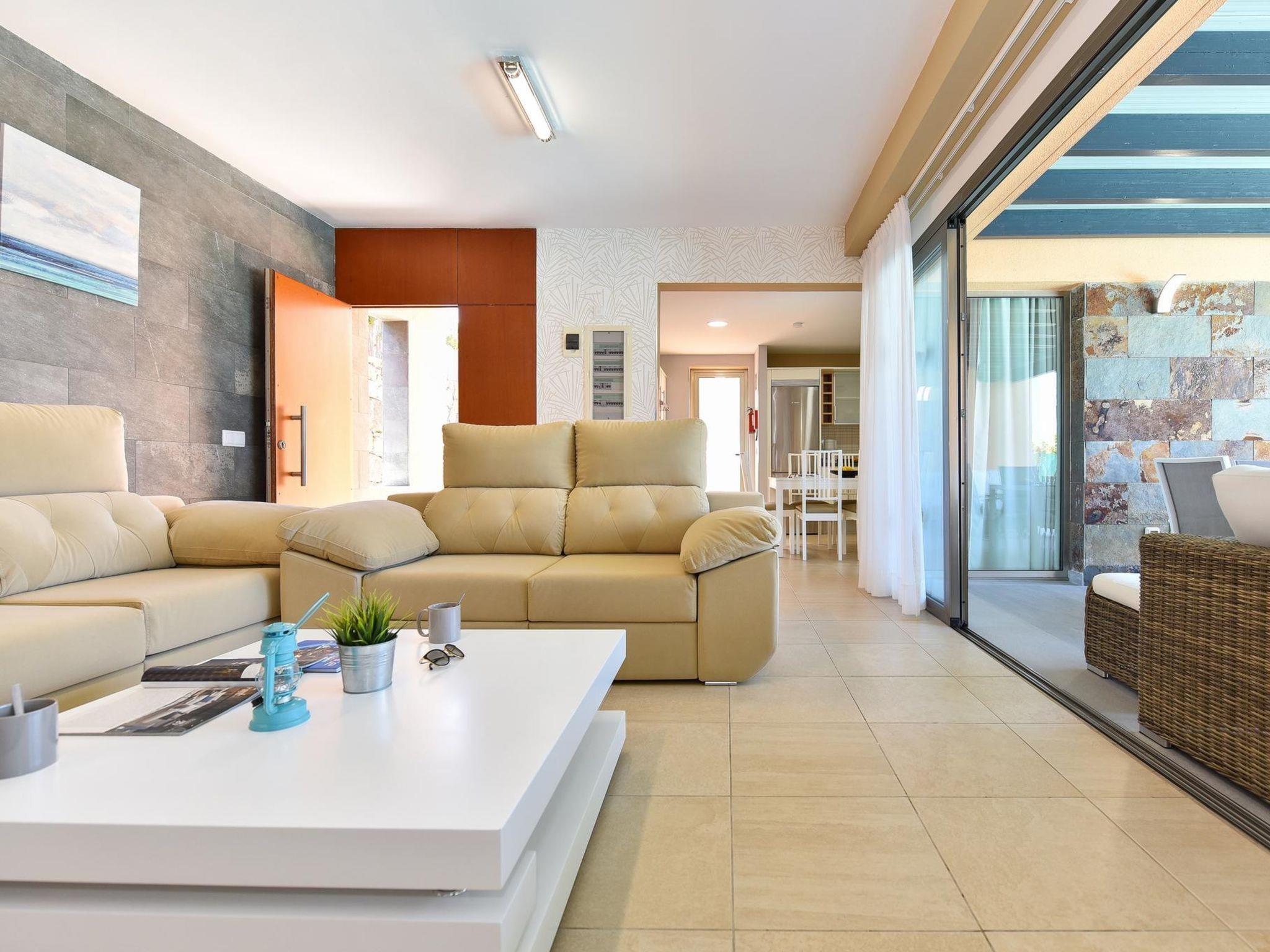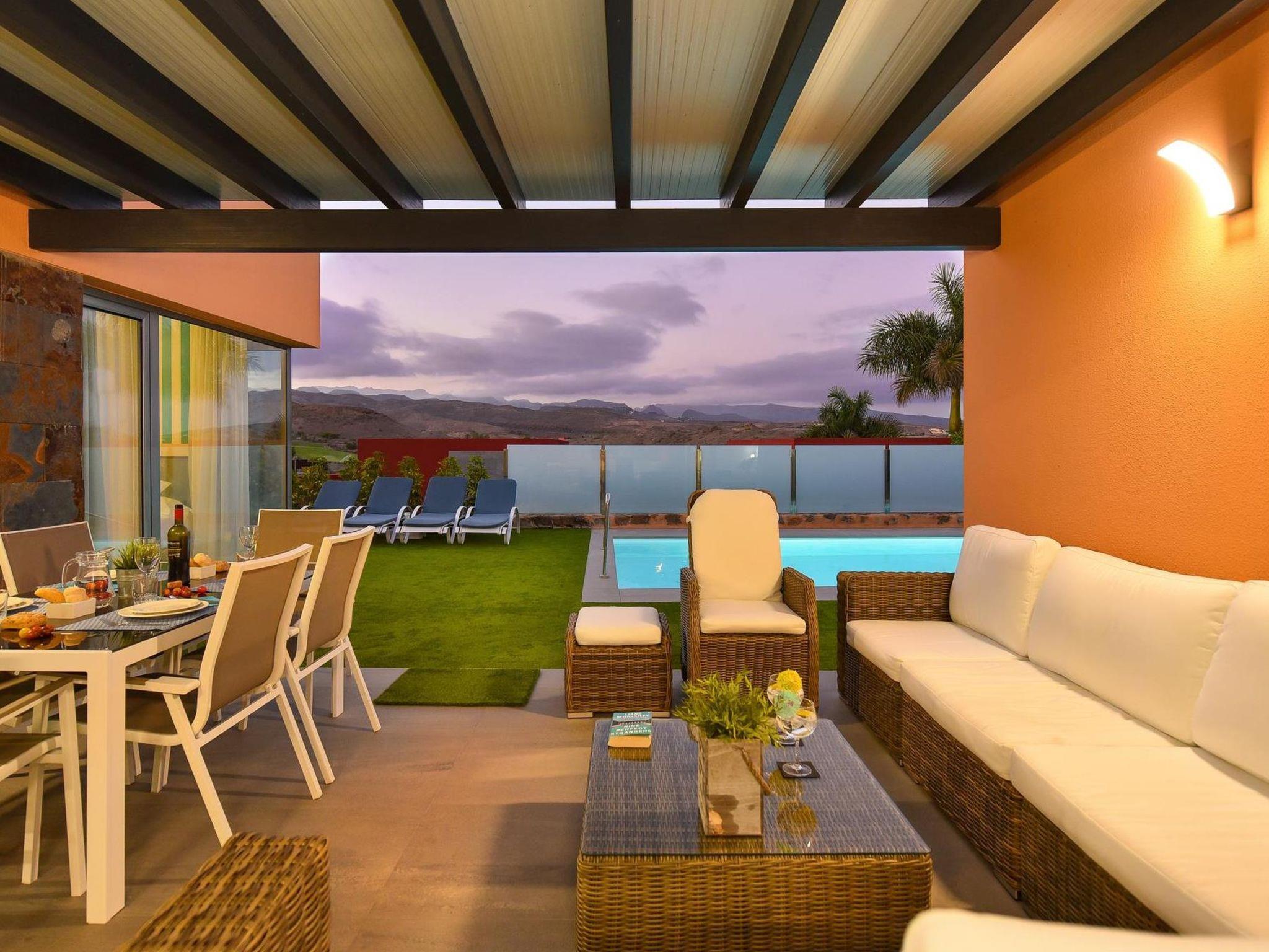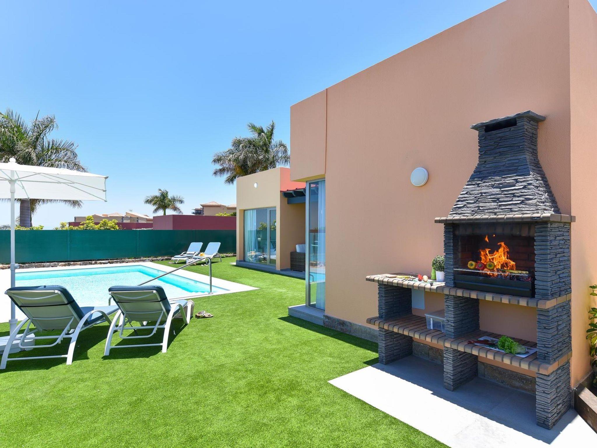 Modern villa "Par4 Villa 13", surrounded by fields. Maspaloma, on the outskirts Salobre, in a quiet, sunny position. For shared use: property, swimming pool (8 x 4 m, seasonal availability: 01.Jan. - 31.Dec.). Private: garden 210 m2. In the house: WiFi, air conditioning, washing machine, tumble dryer. E-charging station. Supermarket 1 km, restaurant 400 m, bus stop "Las Crucitas" 19 km, sandy beach "11000". Golf course (18 hole) 100 m. Please note: car recommended. Baby equipment on request. The owner does not accept any youth groups. Motorway 1.6 km from the property.