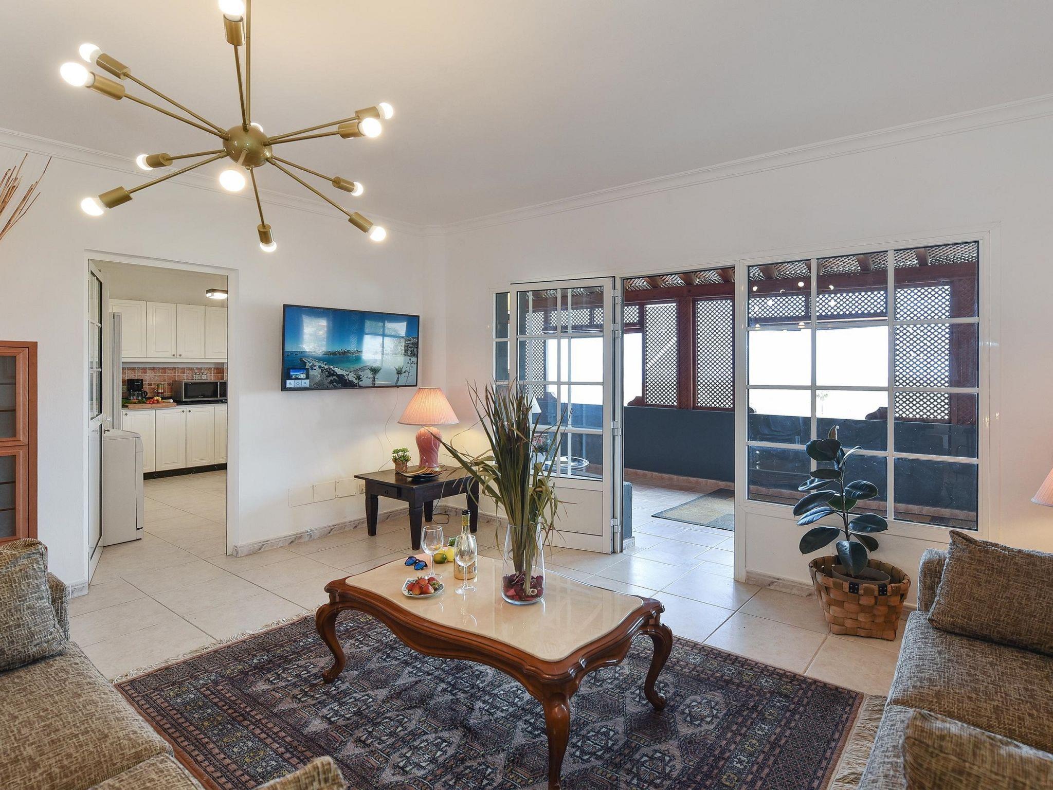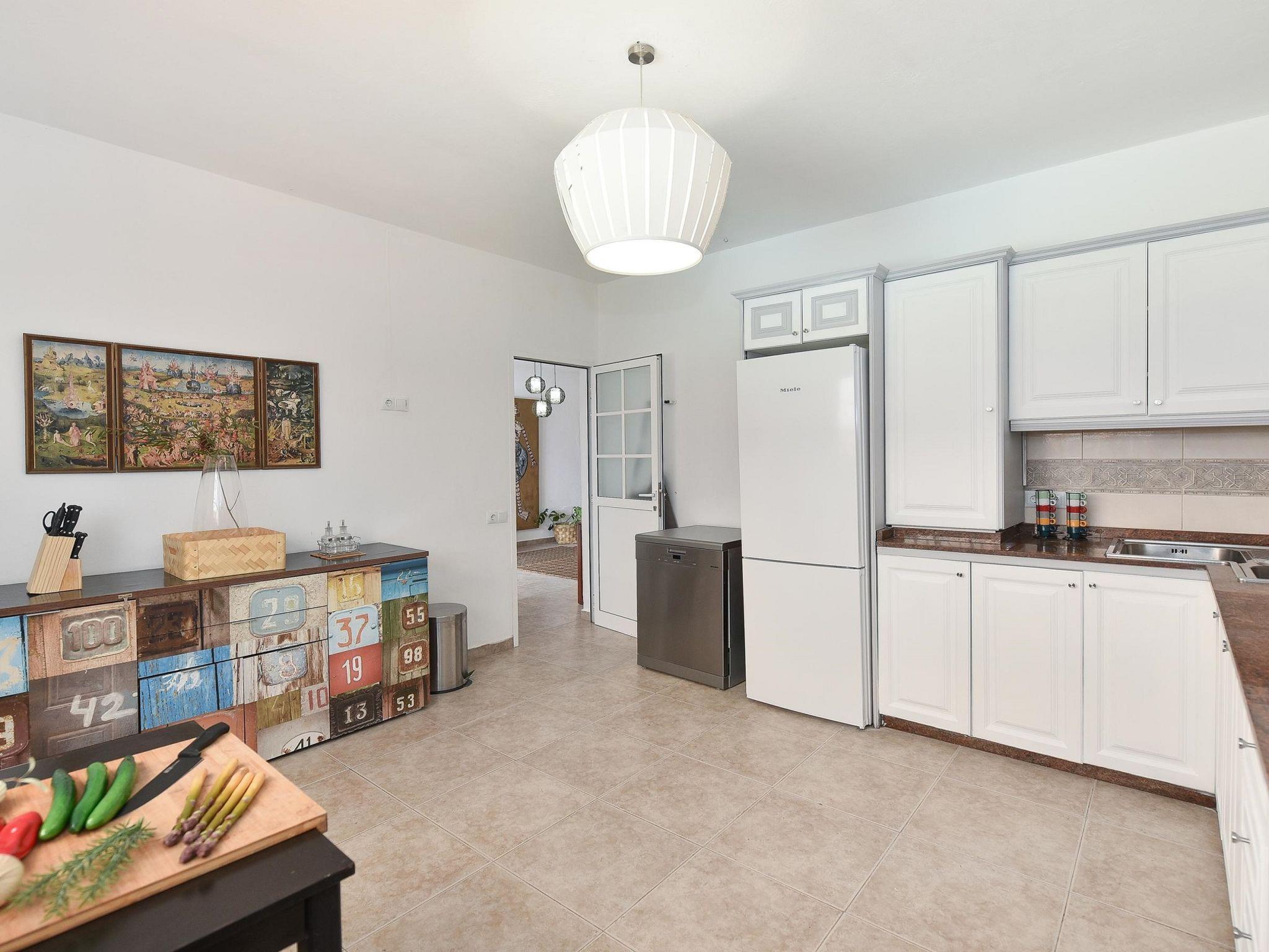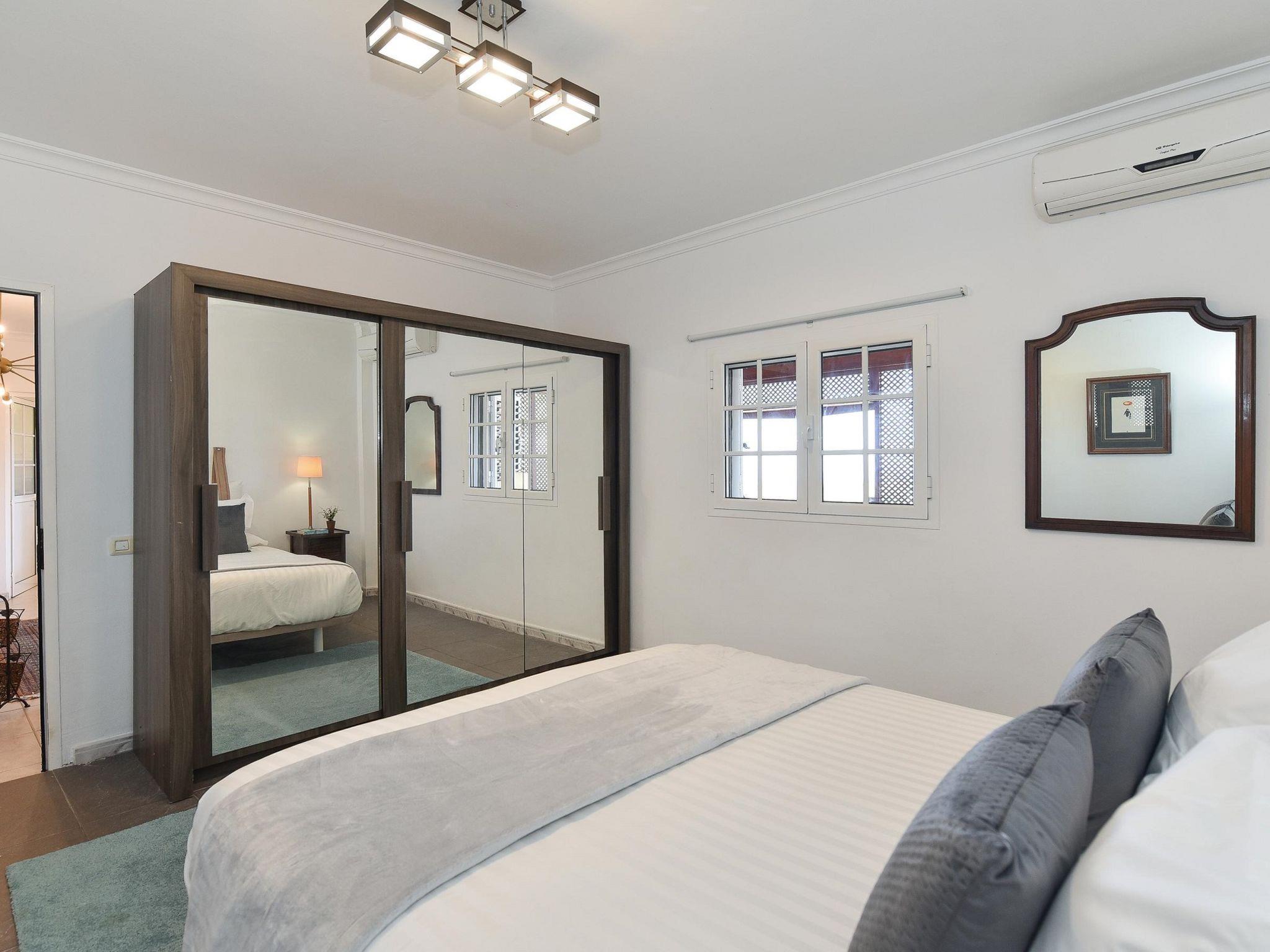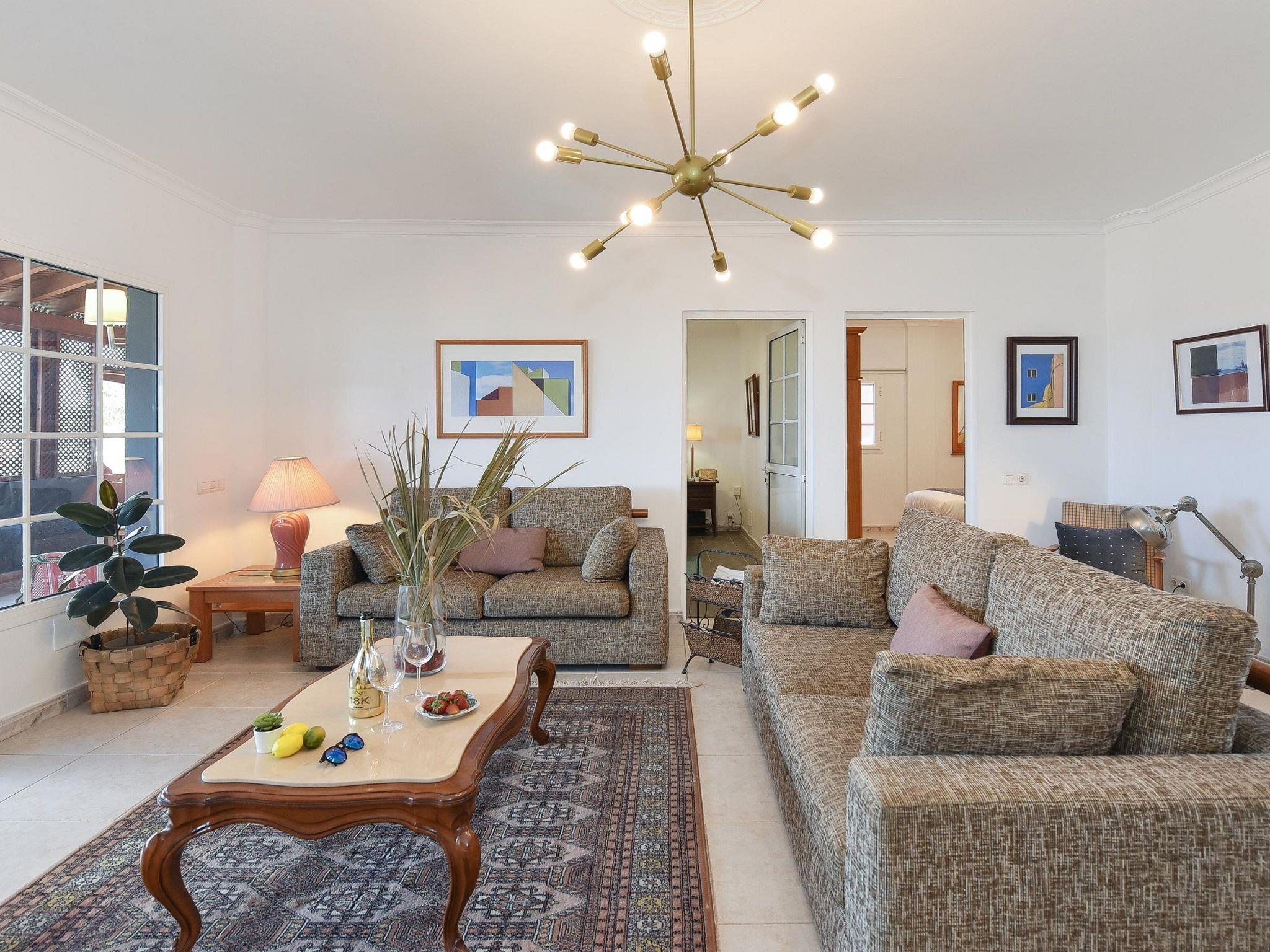 "Salobre Pueblo", 9-room farmhouse 400 m2 on 2 levels. Object suitable for 14 adults. Very simple and cosy furnishings: open living room with digital TV, flat screen and air conditioning. Exit to the loggia. 2 rooms, each room with 1 french bed. 1 room with 2 beds. Kitchen (oven, dishwasher, 4 ceramic glass hob hotplates, toaster, kettle, microwave, freezer, electric coffee machine). Bathroom, bath/shower, hip bath. Upper floor: (spiral staircase) living room with digital TV and flat screen. Exit to the loggia. 2 rooms, each room with 1 french bed. 2 rooms, each room with 2 beds. Kitchen (oven, dishwasher). Bath/shower. Natural stone floors. Terrace furniture, barbecue, deck chairs (8), covered balcony, sitting area. Beautiful view of the swimming pool and the garden. Facilities: washing machine, iron, children's high chair, baby cot for up to 2 year olds, hair dryer. Internet (WiFi, free). Please note: suitable for families. Non-smoking house. Maximum 1 pet/ dog allowed. 2024-T10696 // Reg. Nr.: ESFCTU0000350120001644730000000000000VV-35-1-00229083