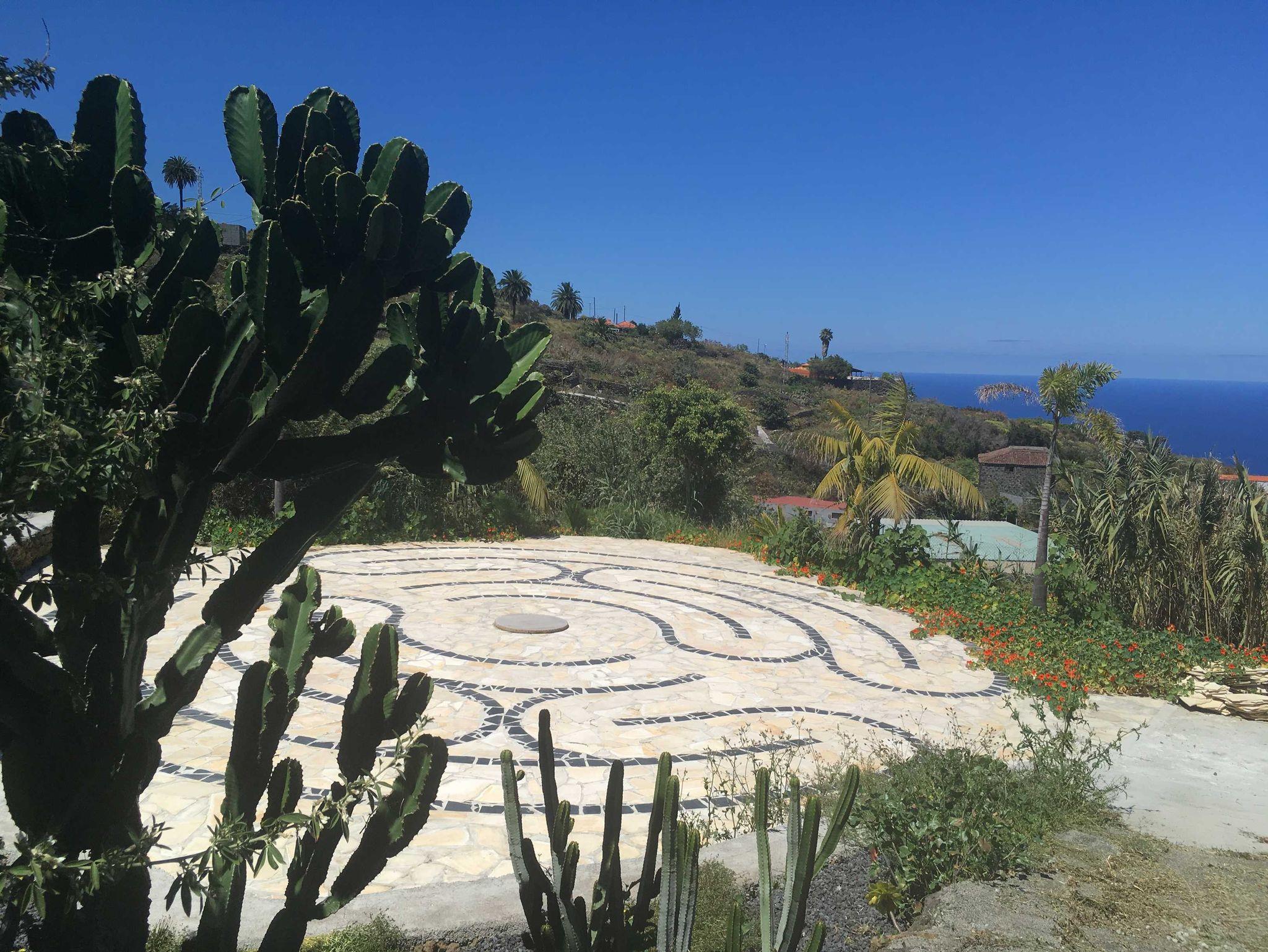 Das große Grundstück ist überwiegend terrassiert und mit befestigten Wegen erschlossen. Es lädt mit vielen Sitzecken, kleinen Gartentischen mit Stühlen und mit Hängematten zum Ausruhen und Verweilen ein. Etwas Besonderes ist die ca. 150 m2 große und mit Natursteinplatten in labyrinthartigem Muster angelegte Palmenterrasse.
