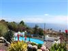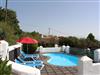 Der lagunenförmige Pool ist umgeben von einem 1800qm großen Garten. Um den Pool gruppieren sich Sonnenliegen. Ein Weg führt an Obstbäumen vorbei zum überdachten Grillhaus mit einem Tisch und zwei Bänken.