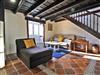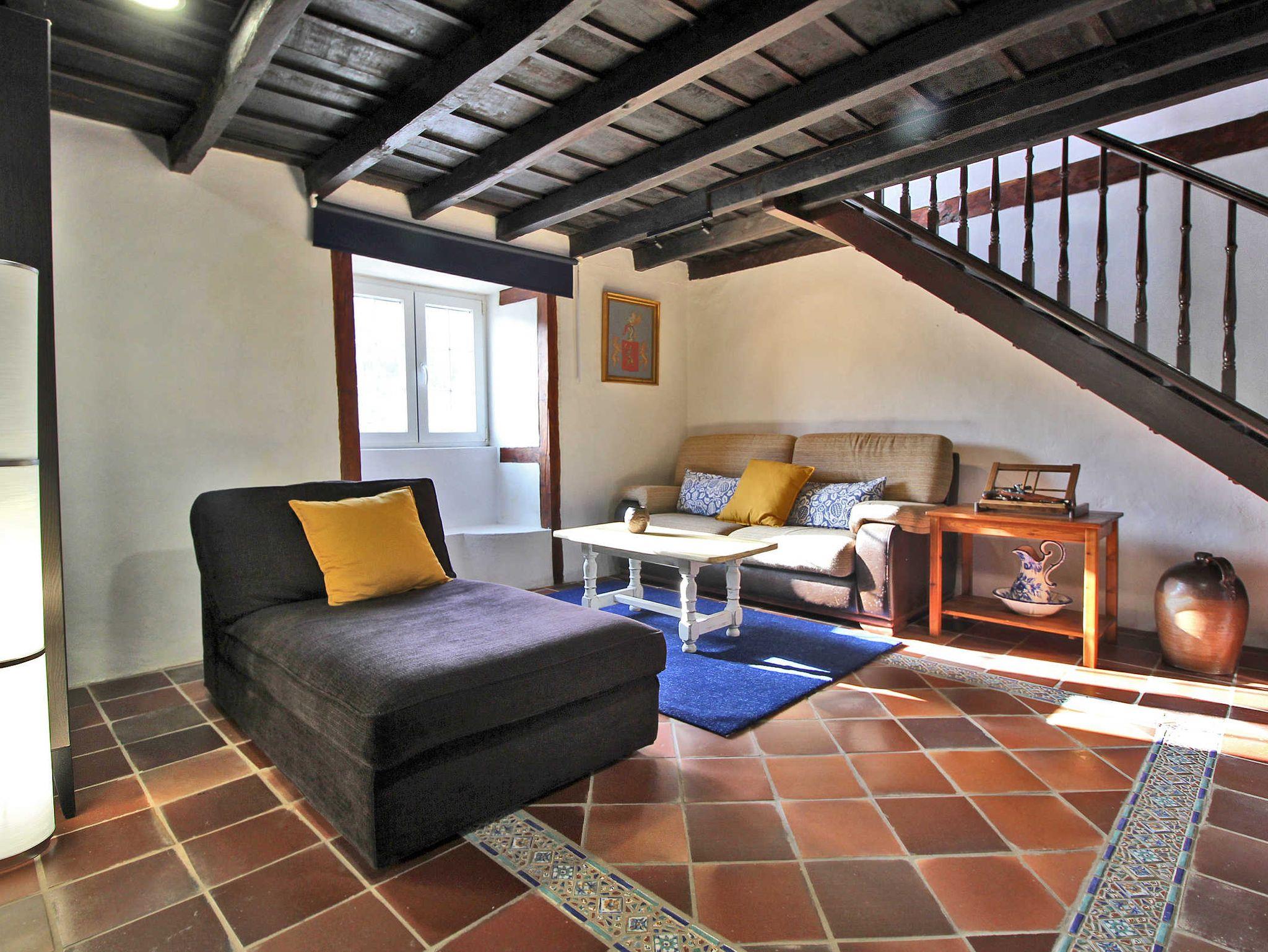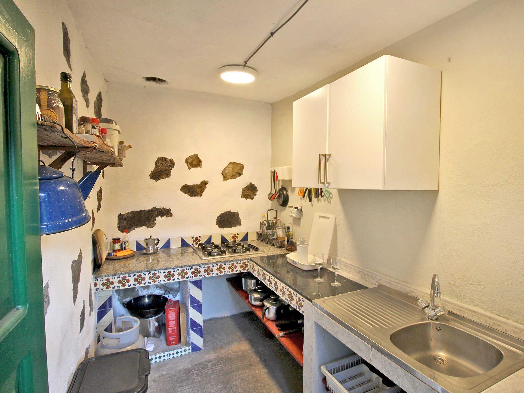• Bodega, uriger Speiseraum mit Ausstattung und Sofa und dazugehöriger kleinen Küche mit Gasherd, Spüle und Kochutensilien