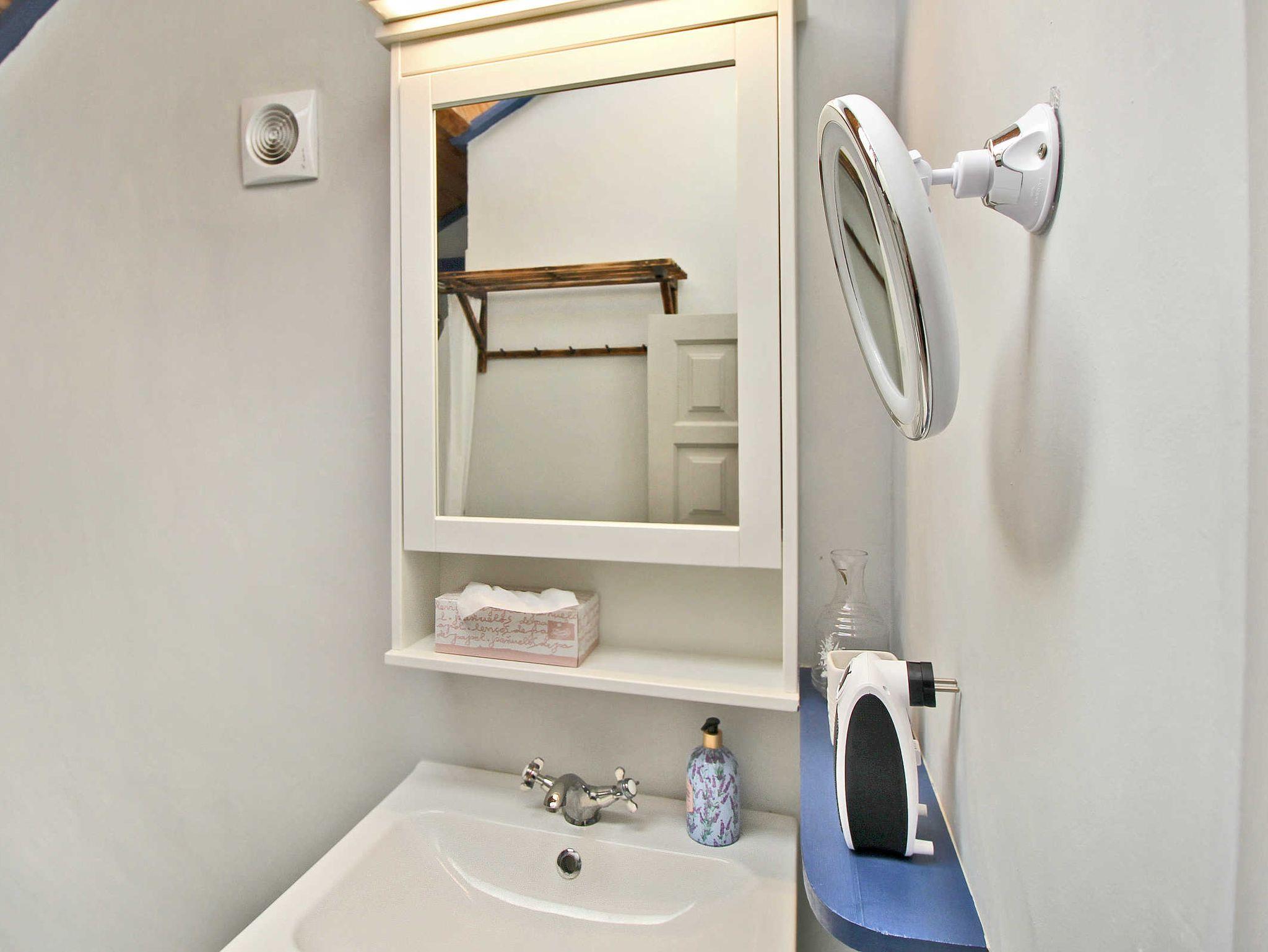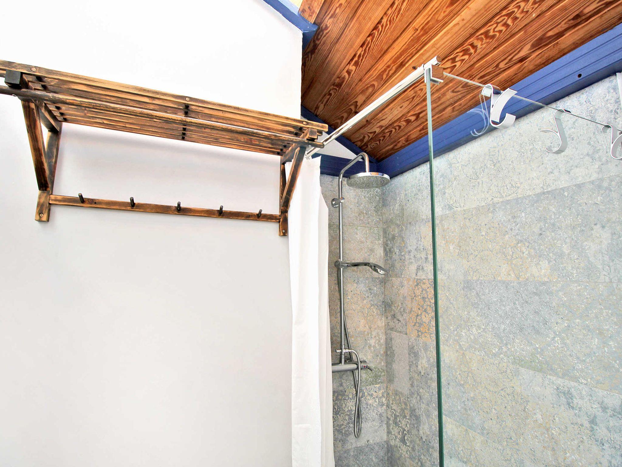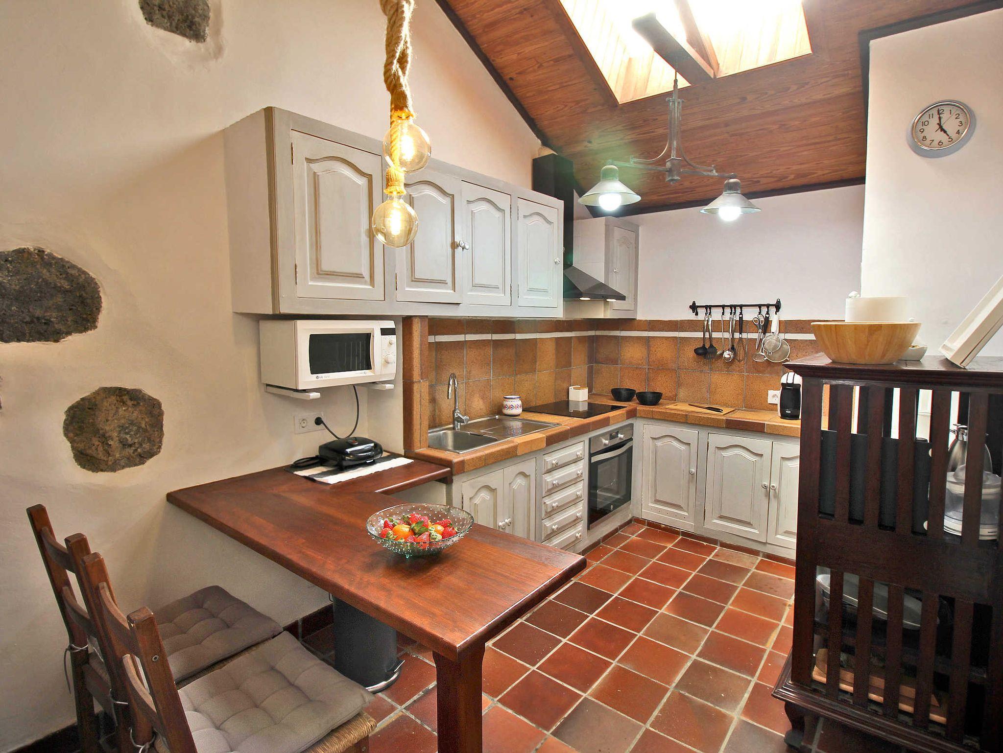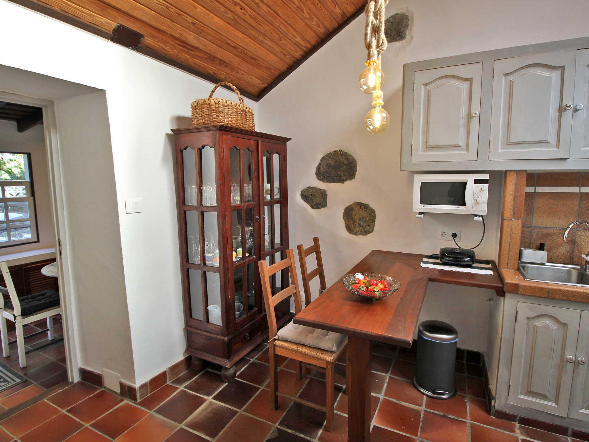 Im Haus selbst befindet sich ein rustikaler Speiseraum, den Sie nutzen können, ebenso wie den bereits erwähnten Esstisch im neuen Hausteil. Die Küche ist nicht sehr groß, ist aber mit Backofen, Mikrowelle und diversen Kochutensilien gut ausgestattet, nur gibt es keinen Geschirrspüler. Hier bietet ein hoher Tisch Platz für zwei Personen.