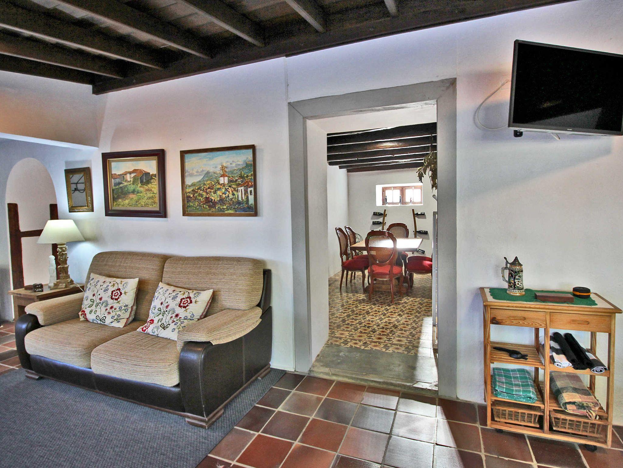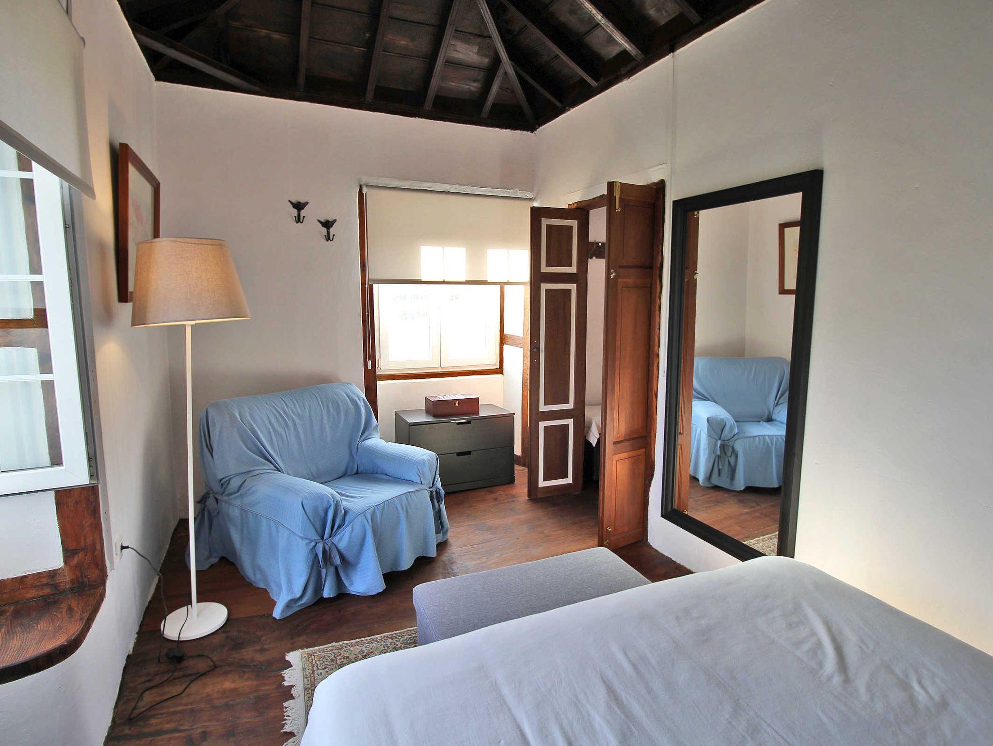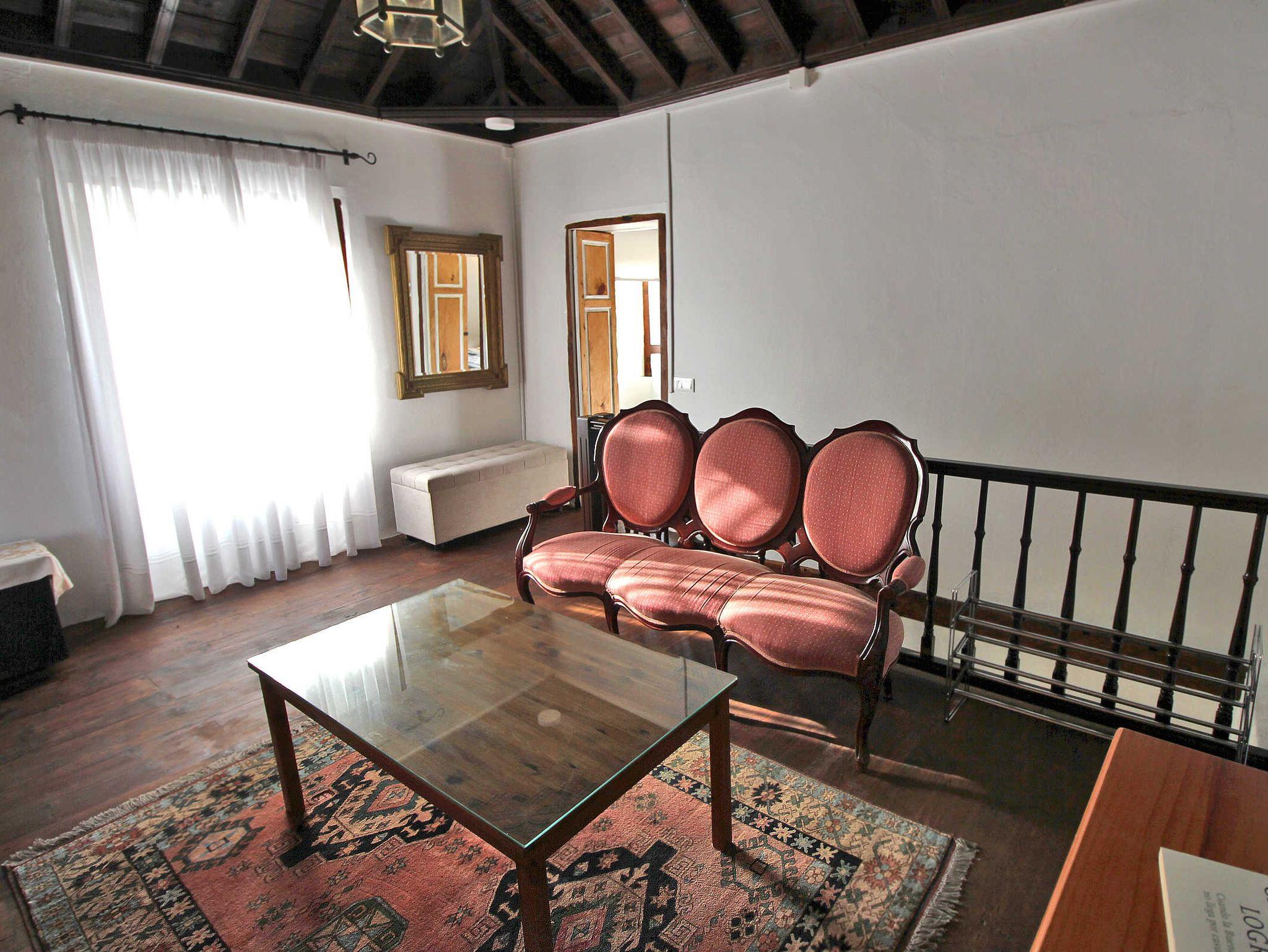 Im Wohnzimmer mit Sofa, Chaiselongue und TV befinden sich auch Bücher, darunter das Werk Arquitectura de La Palma (Architektur auf La Palma), in dem auch ein Bericht mit Fotos vom Haus zu finden ist. Vom Wohnzimmer geht das Kinderschlafzimmer ab, es hat Glastüren, zwei ausziehbare Betten, einen kleinen Schreibtisch sowie eine Kleiderstange und eine Truhe. Das schöne kanarische Erkerfenster bietet sich als Sitzplatz oder Ablagefläche an.