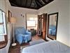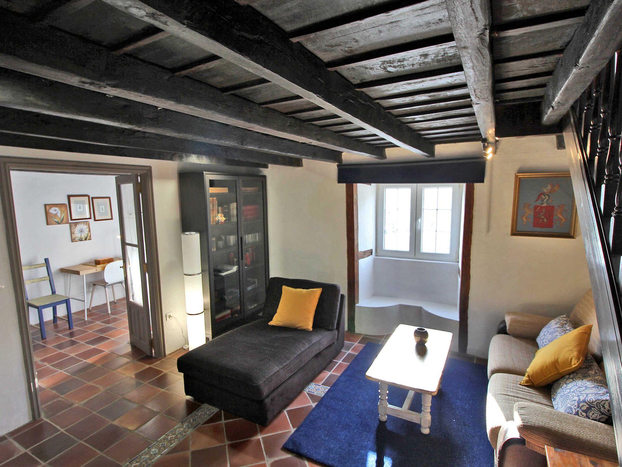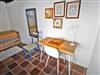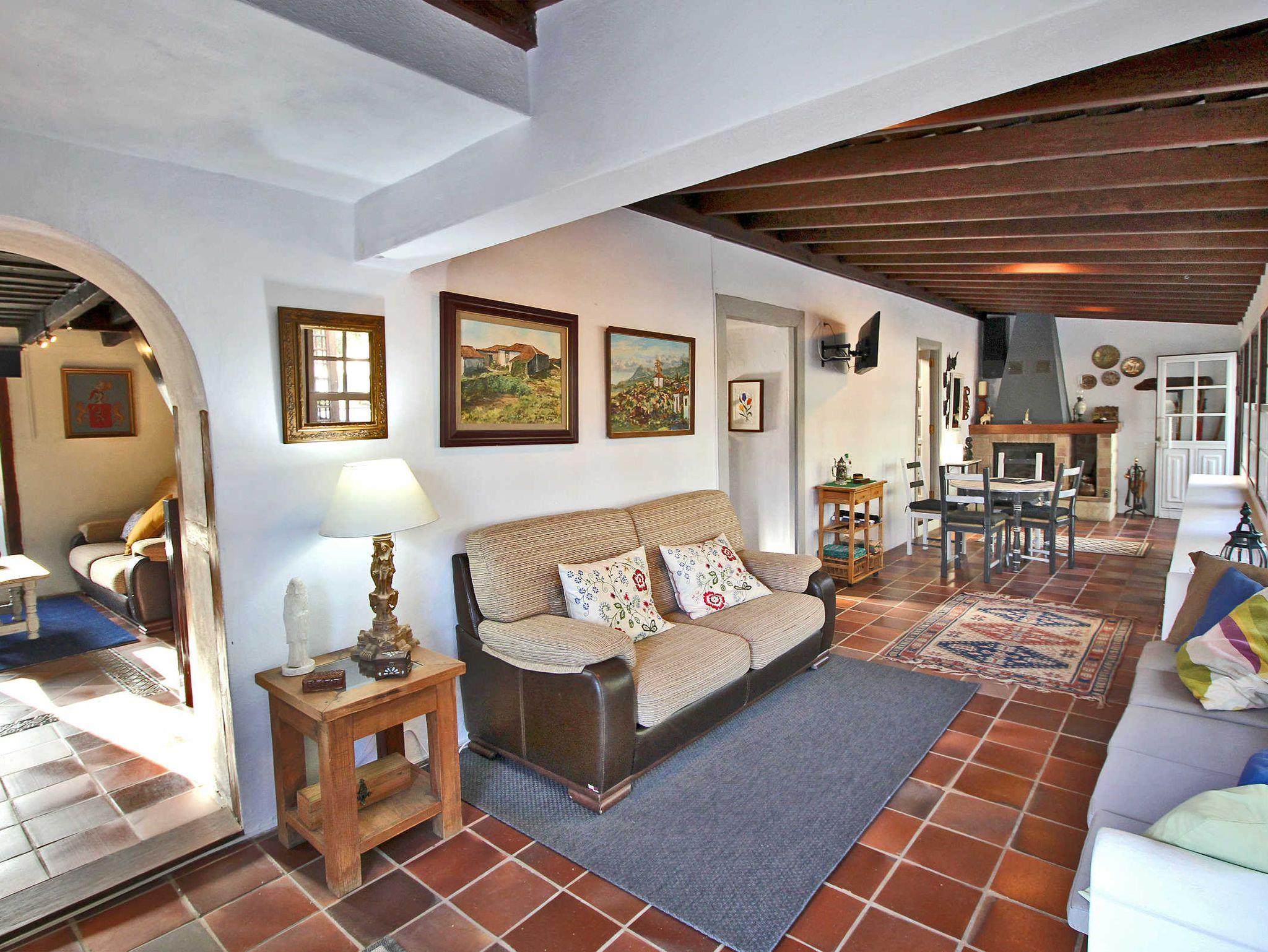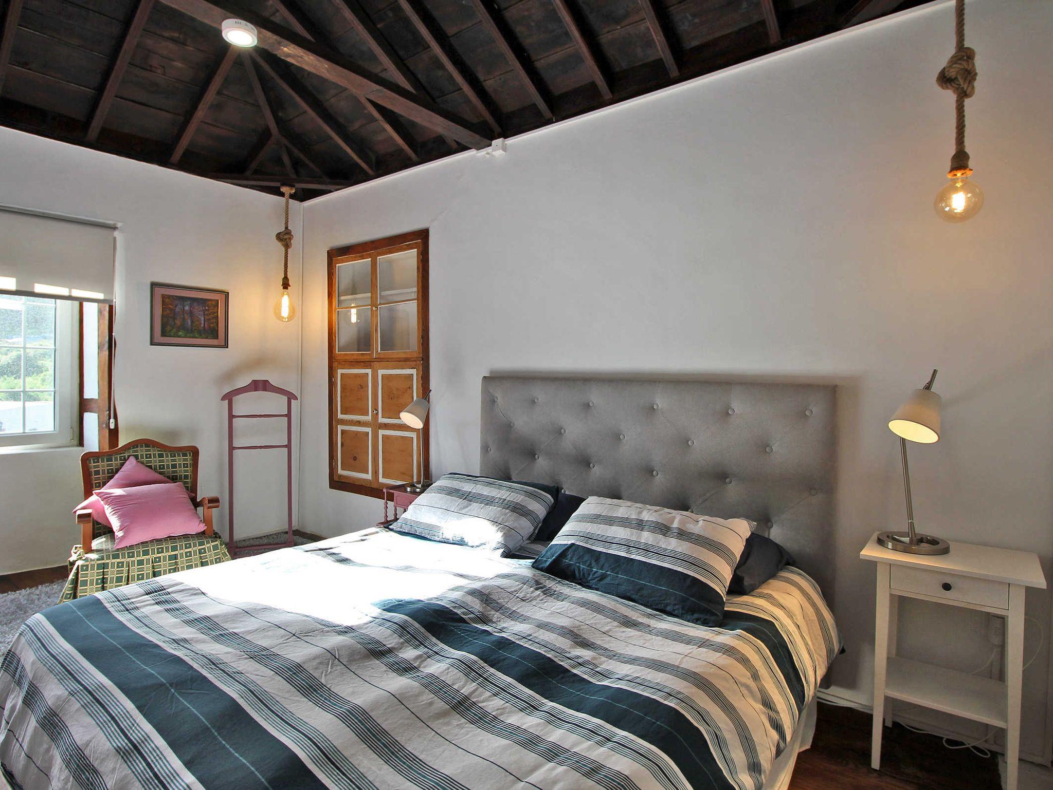 Im Wohnzimmer mit Sofa, Chaiselongue und TV befinden sich auch Bücher, darunter das Werk Arquitectura de La Palma (Architektur auf La Palma), in dem auch ein Bericht mit Fotos vom Haus zu finden ist. Vom Wohnzimmer geht das Kinderschlafzimmer ab, es hat Glastüren, zwei ausziehbare Betten, einen kleinen Schreibtisch sowie eine Kleiderstange und eine Truhe. Das schöne kanarische Erkerfenster bietet sich als Sitzplatz oder Ablagefläche an.