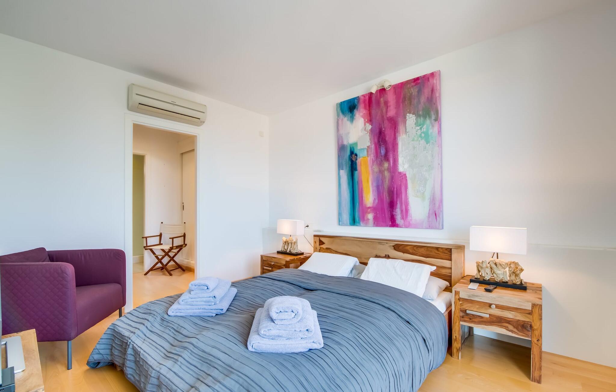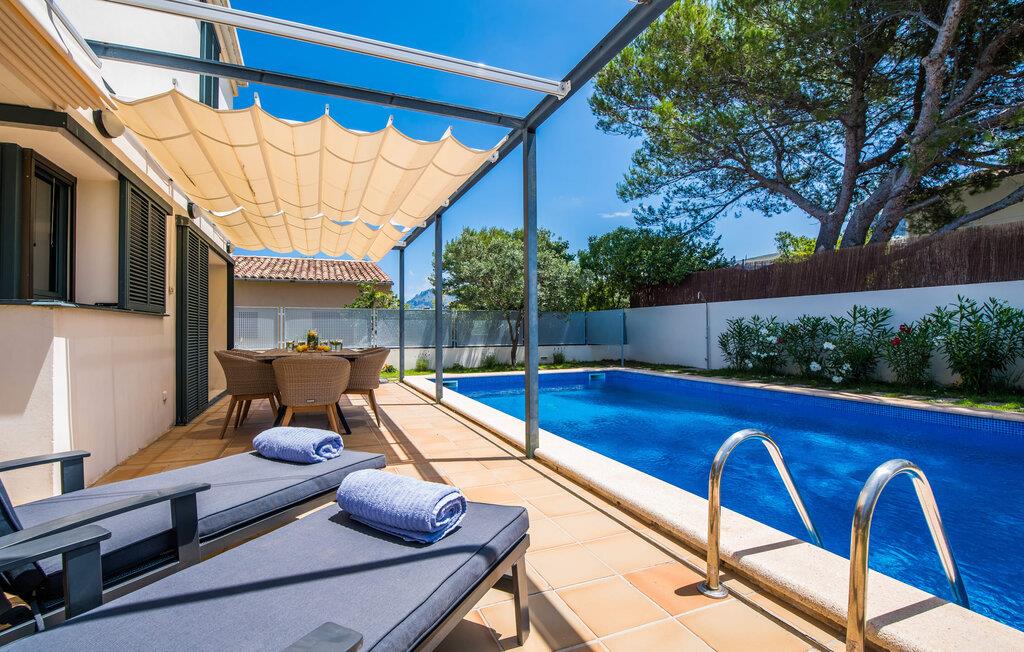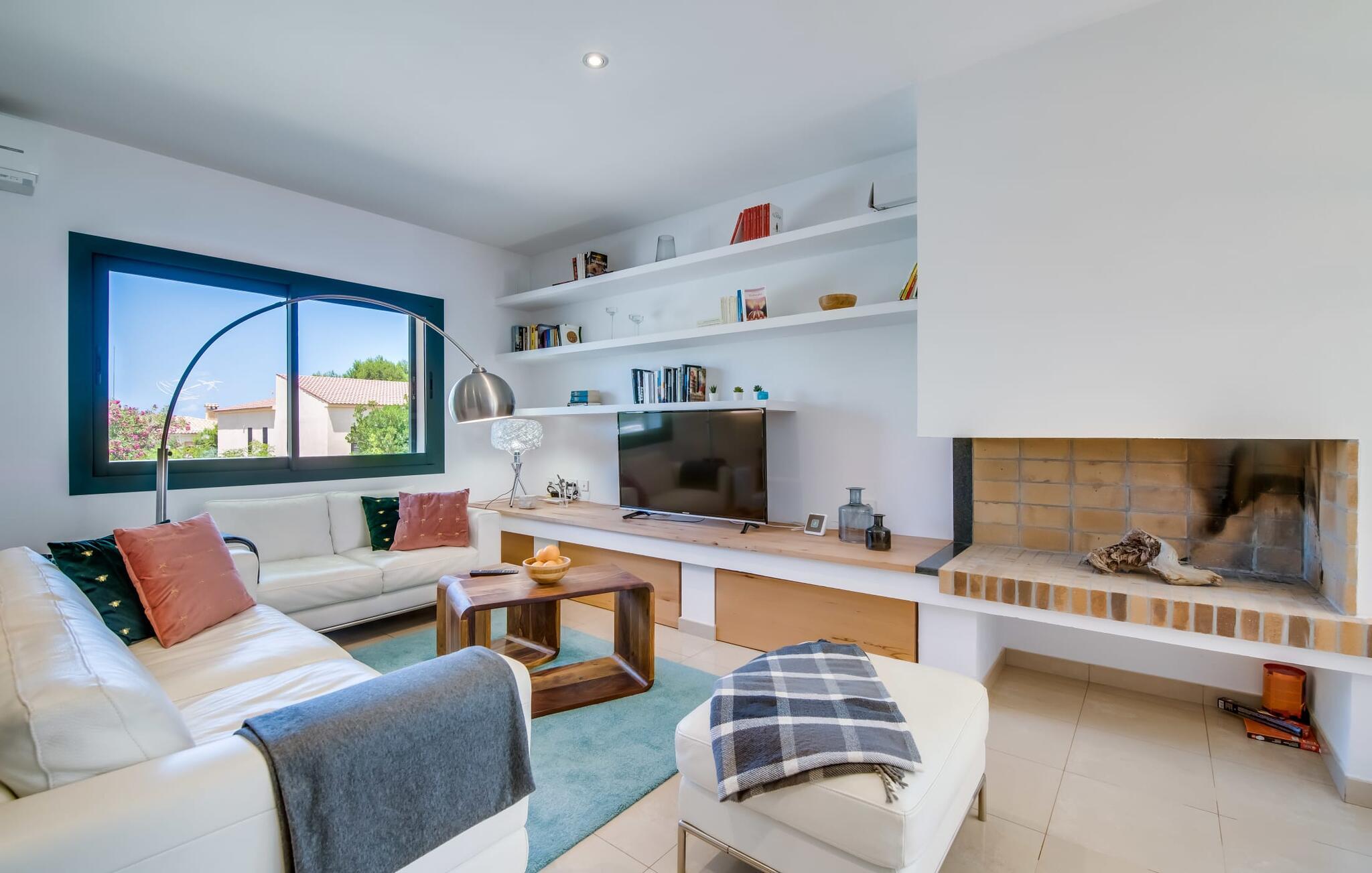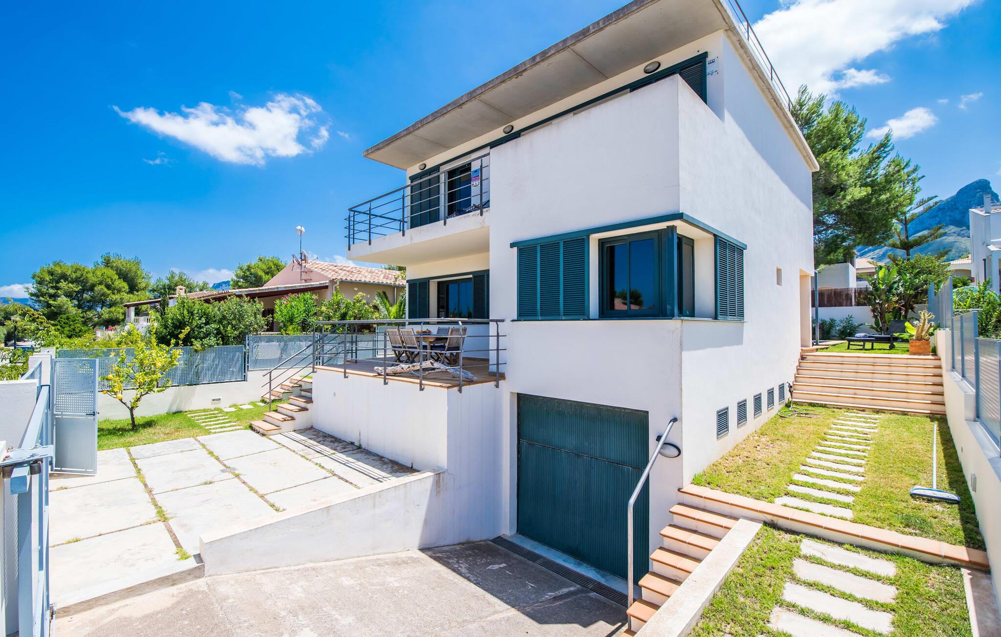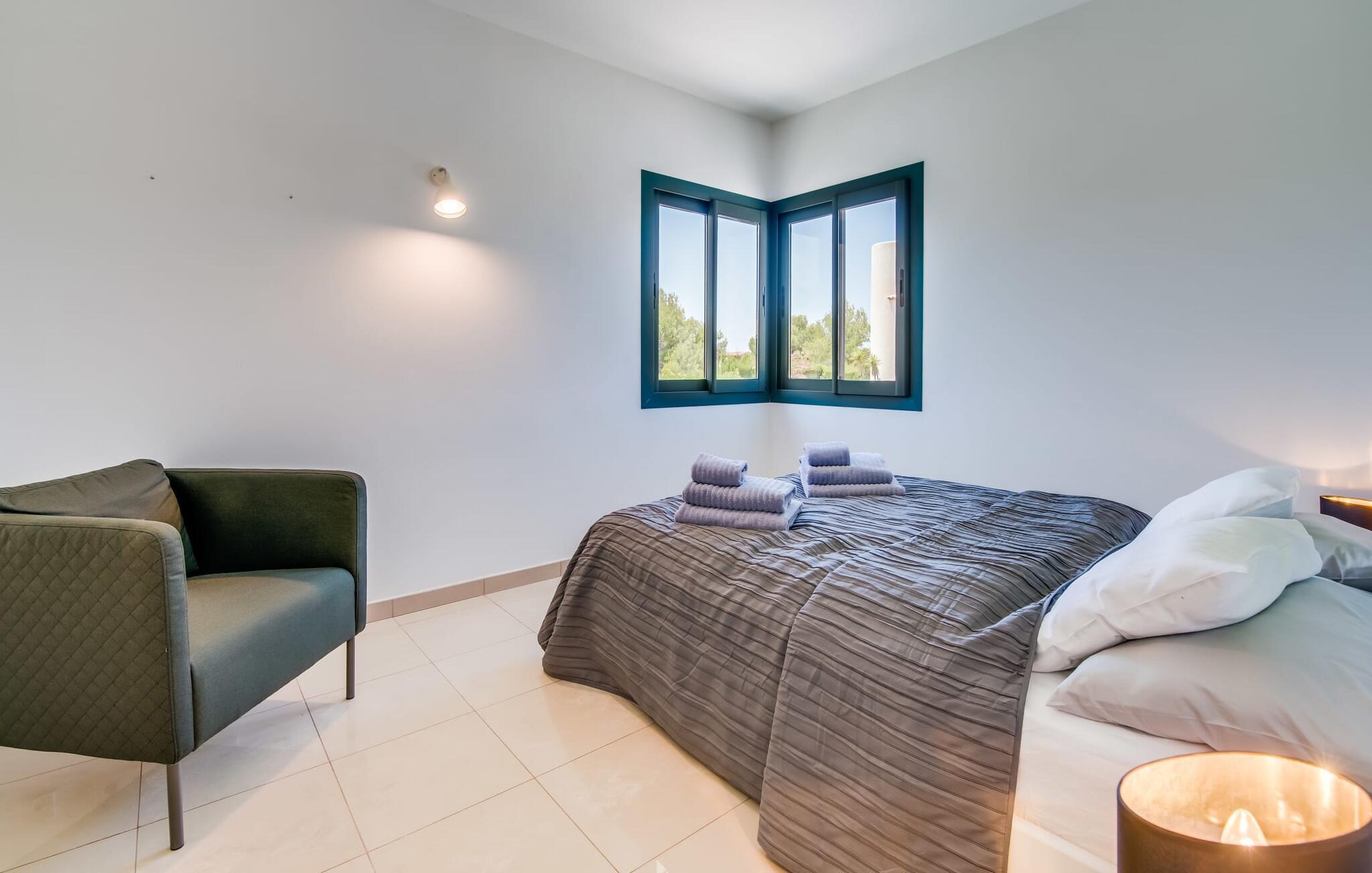 Villa "Mediterra" inviterer jer til at slappe af og nyde middelhavslivsstilen. Fra balkonen kan I nyde udsigten over det turkise hav, mærke den blide brise og indånde den friske kystluft. For dem, der ønsker at slappe af, fører kun få skridt fra huset til den bageste terrasse med pool, perfekt til en forfriskende svømmetur. Komfortable liggestole og en moderne gasgrill venter på jer, ideel til en eftermiddag med afslapning og udendørs spisning. Nyd jeres måltider ved træbordet med rattanstole og nyd de rolige omgivelser. Villaen har også en tagterrasse med en fantastisk udsigt over Alcudia-bugten og bjergene. Indenfor forbinder en stor terrassedør poolområdet med opholds- og spiseområdet i åbent plan. Den lyse, sommerlige indretning har hvide vægge, varme træaccenter og farverige kunstværker. Et moderne fjernsyn, en åben pejs og en behagelig sofa skaber en indbydende atmosfære til køligere aftener. Det veludstyrede køkken byder på alt hvad I behøver til en afslappende ferie, lige fra en mikrobølgeovn til en kaffemaskine. Med fire dobbeltværelser og tre badeværelser (to en suite) sikrer Villa "Mediterra" et behageligt ophold for alle. Den smukke, moderne finca "Mediterra" ligger i Alcúdia-bugten, i det mangfoldige østlige Mallorca. Beliggende midt i den velholdte urbanisering af Montferrutx, er supermarkeder, små butikker og gode restauranter inden for nem gåafstand. Den charmerende middelalderby Artà ligger kun 13 km væk. Stranden i Colònia de Sant Pere ligger kun 10 minutters gang væk, mens hvis I tager mod vest, vil I snart nå stranden i Son Serra de Marina.