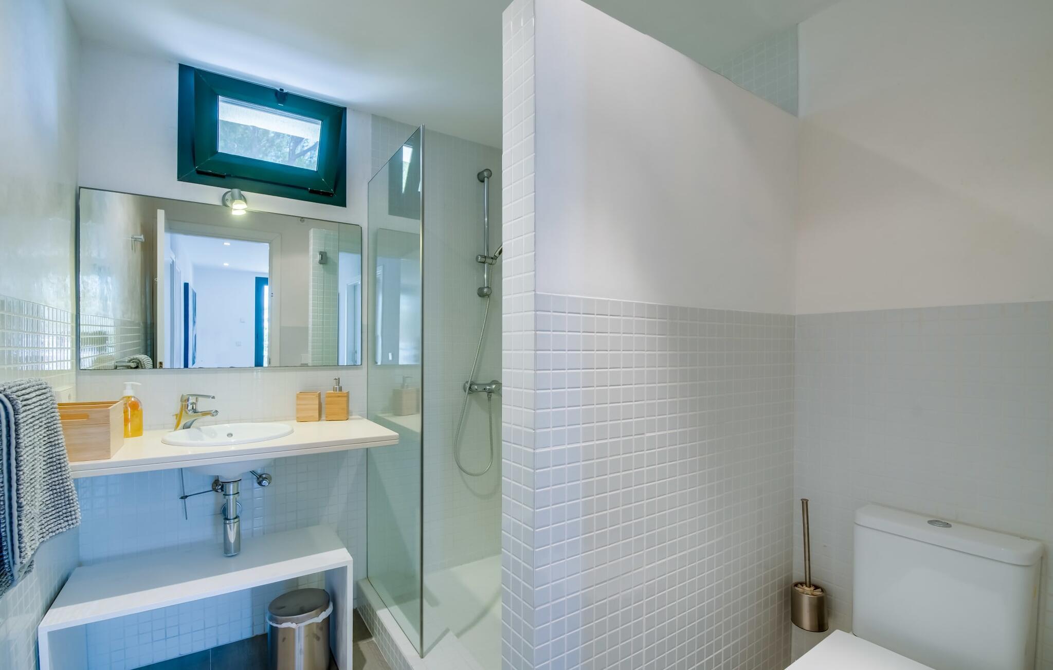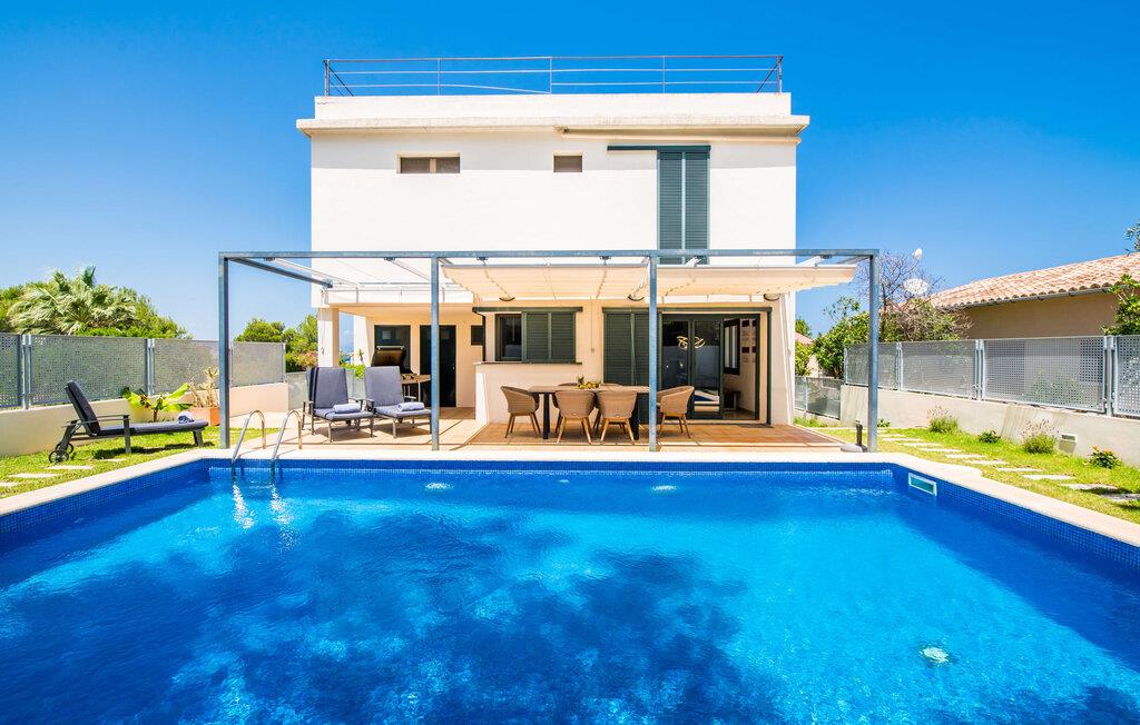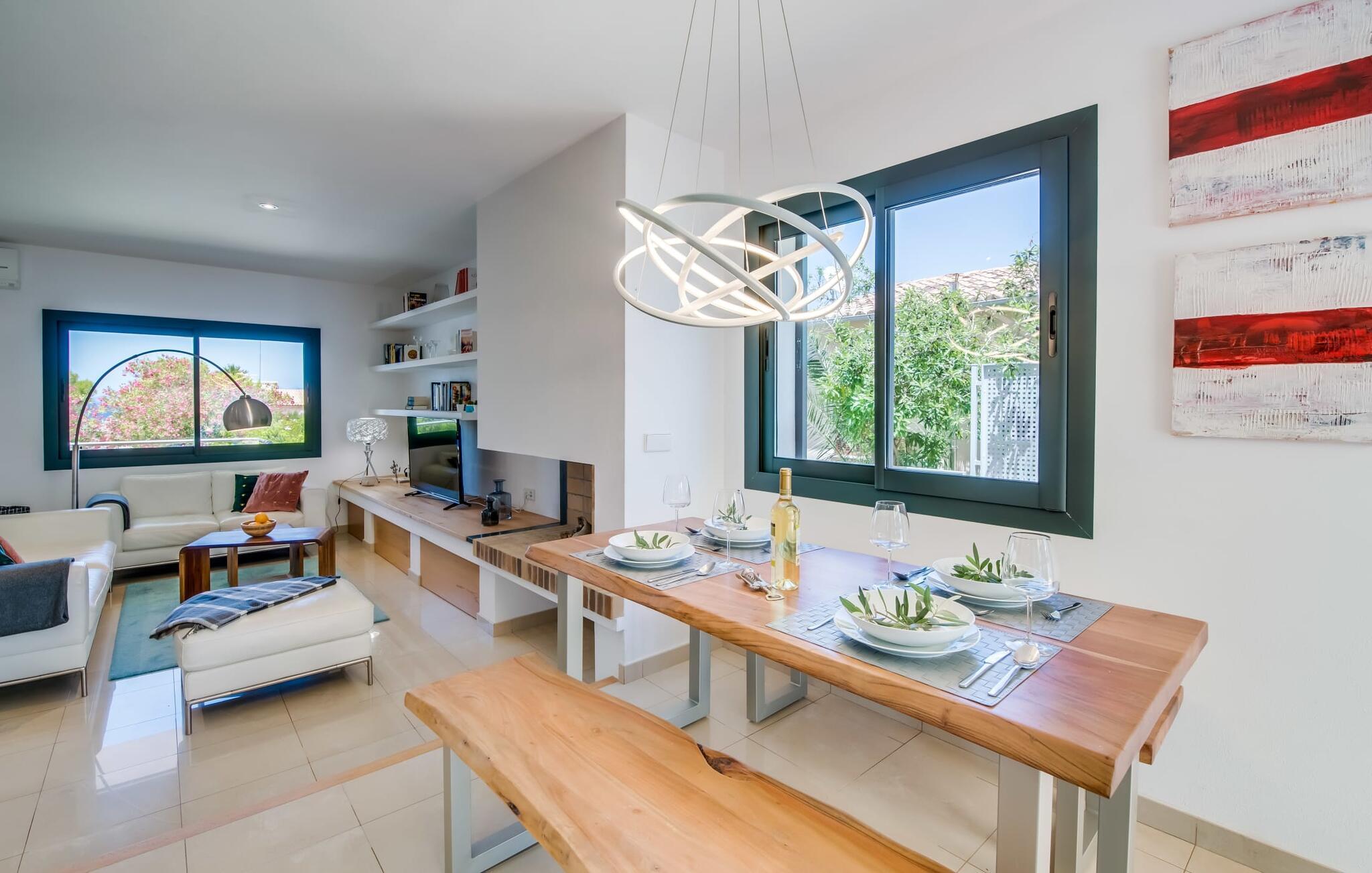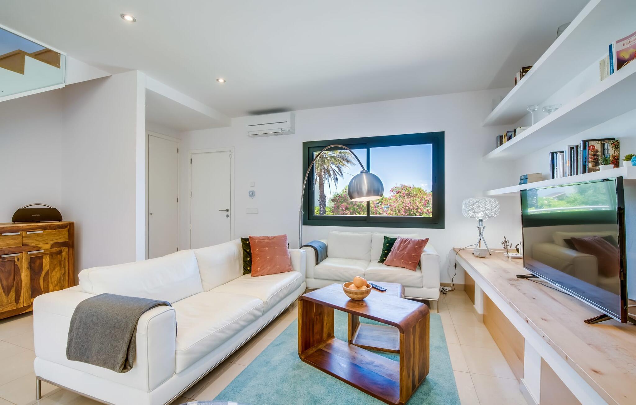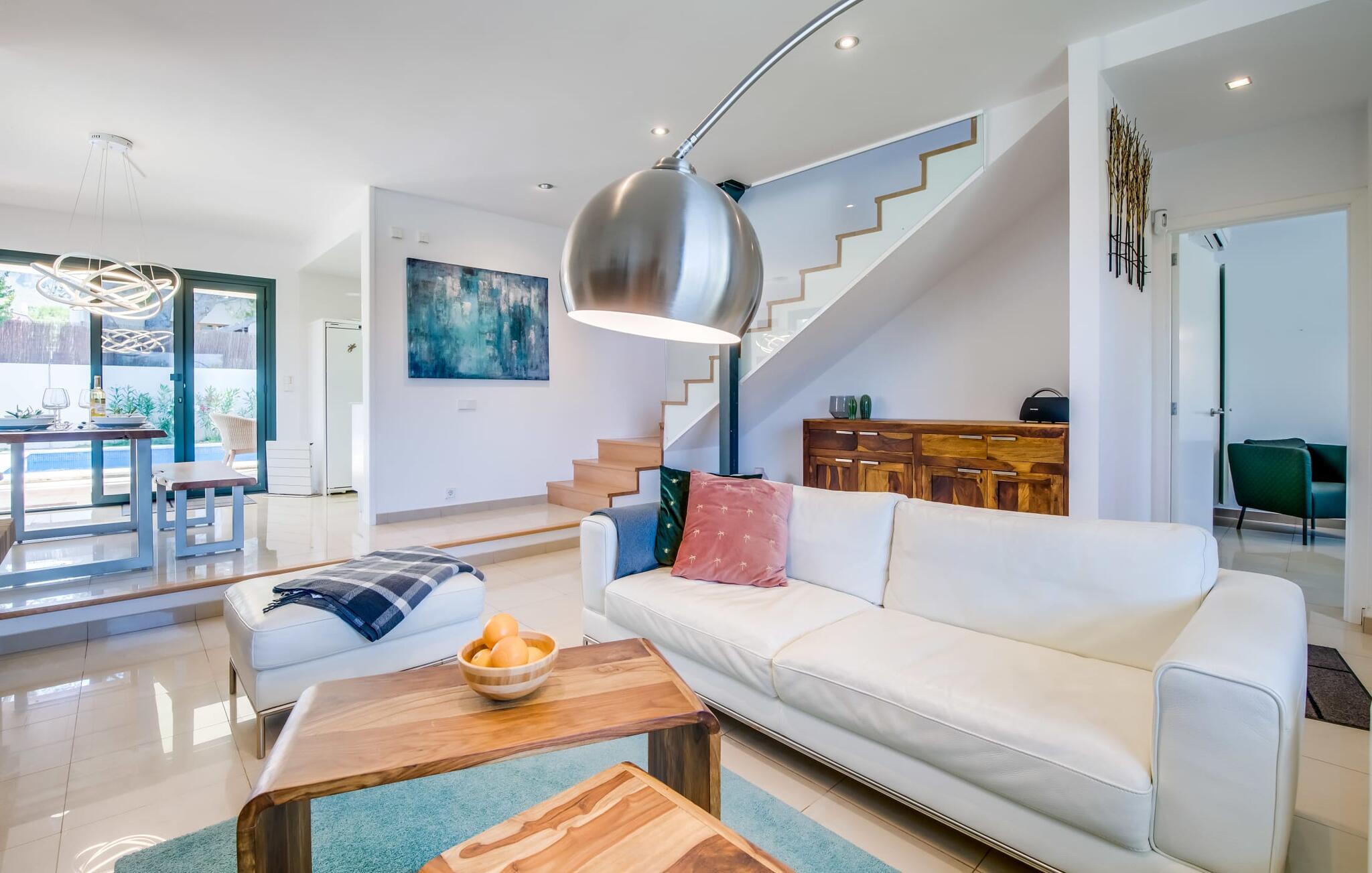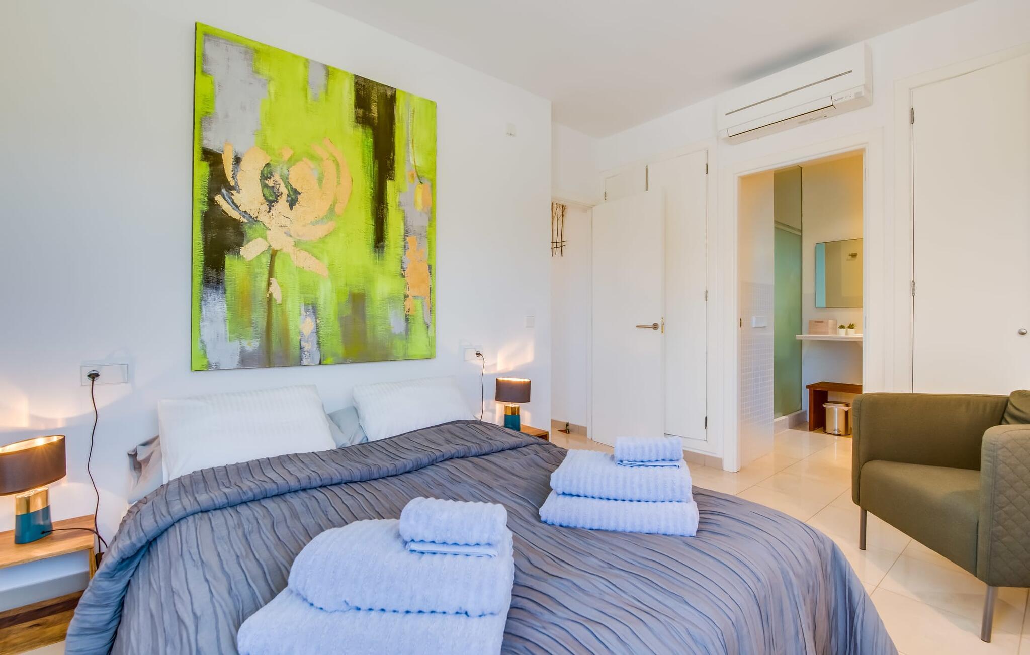 Villa "Mediterra" inviterer jer til at slappe af og nyde middelhavslivsstilen. Fra balkonen kan I nyde udsigten over det turkise hav, mærke den blide brise og indånde den friske kystluft. For dem, der ønsker at slappe af, fører kun få skridt fra huset til den bageste terrasse med pool, perfekt til en forfriskende svømmetur. Komfortable liggestole og en moderne gasgrill venter på jer, ideel til en eftermiddag med afslapning og udendørs spisning. Nyd jeres måltider ved træbordet med rattanstole og nyd de rolige omgivelser. Villaen har også en tagterrasse med en fantastisk udsigt over Alcudia-bugten og bjergene. Indenfor forbinder en stor terrassedør poolområdet med opholds- og spiseområdet i åbent plan. Den lyse, sommerlige indretning har hvide vægge, varme træaccenter og farverige kunstværker. Et moderne fjernsyn, en åben pejs og en behagelig sofa skaber en indbydende atmosfære til køligere aftener. Det veludstyrede køkken byder på alt hvad I behøver til en afslappende ferie, lige fra en mikrobølgeovn til en kaffemaskine. Med fire dobbeltværelser og tre badeværelser (to en suite) sikrer Villa "Mediterra" et behageligt ophold for alle. Den smukke, moderne finca "Mediterra" ligger i Alcúdia-bugten, i det mangfoldige østlige Mallorca. Beliggende midt i den velholdte urbanisering af Montferrutx, er supermarkeder, små butikker og gode restauranter inden for nem gåafstand. Den charmerende middelalderby Artà ligger kun 13 km væk. Stranden i Colònia de Sant Pere ligger kun 10 minutters gang væk, mens hvis I tager mod vest, vil I snart nå stranden i Son Serra de Marina.