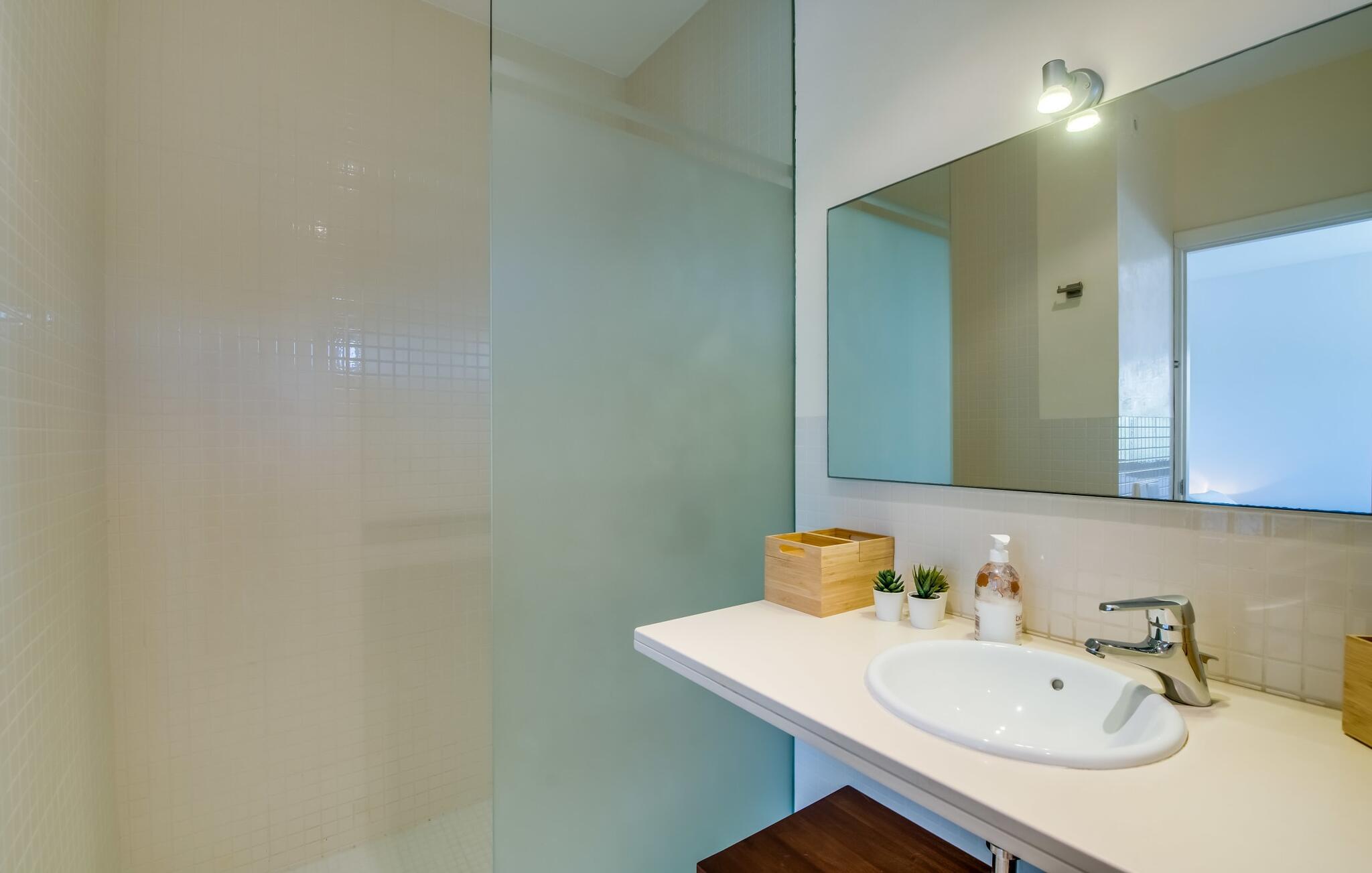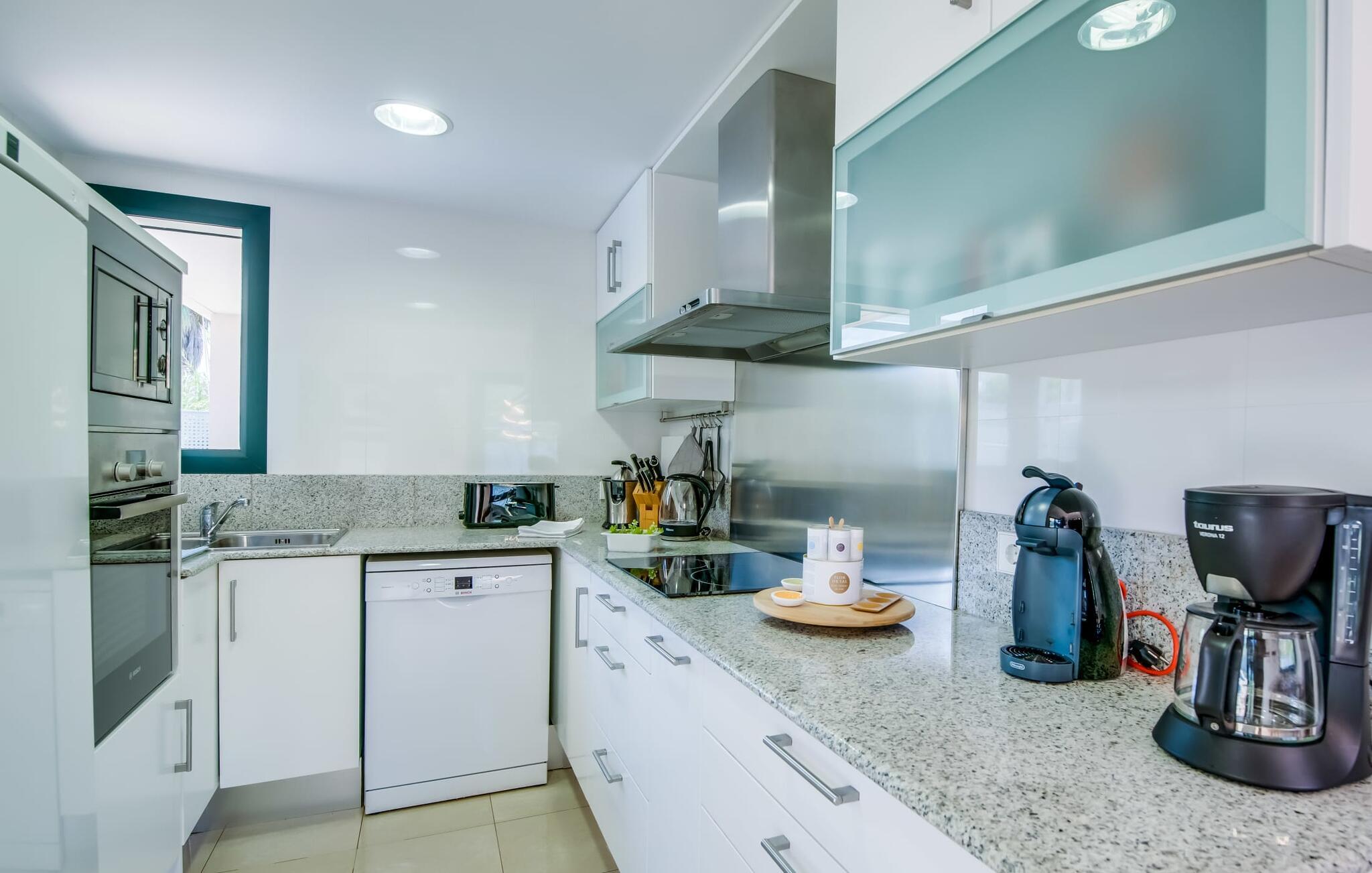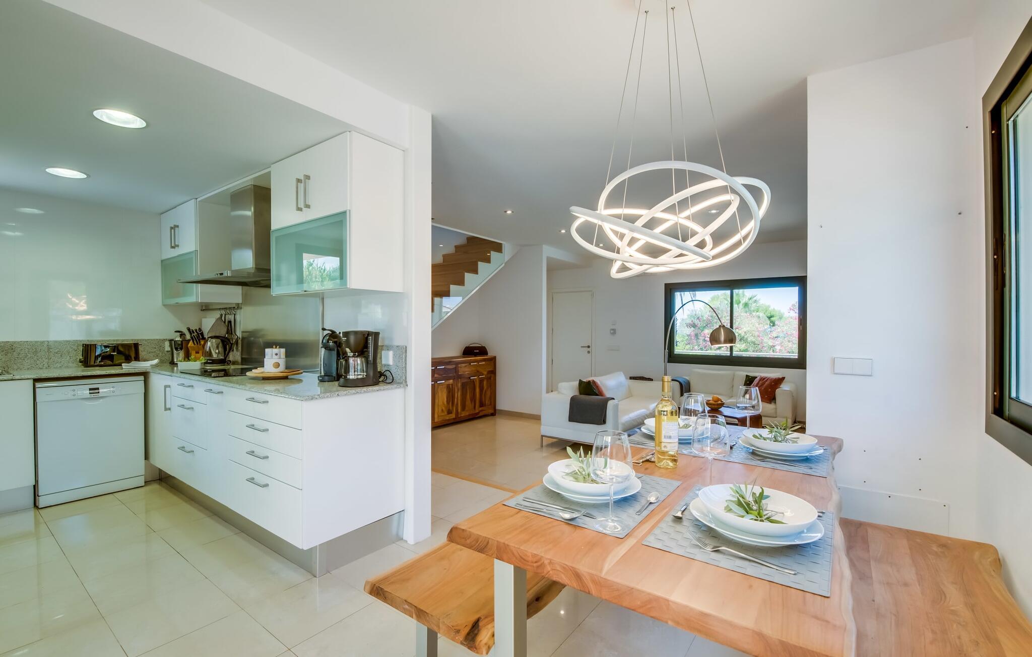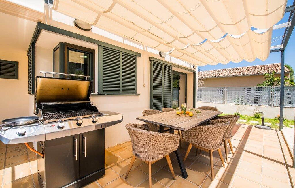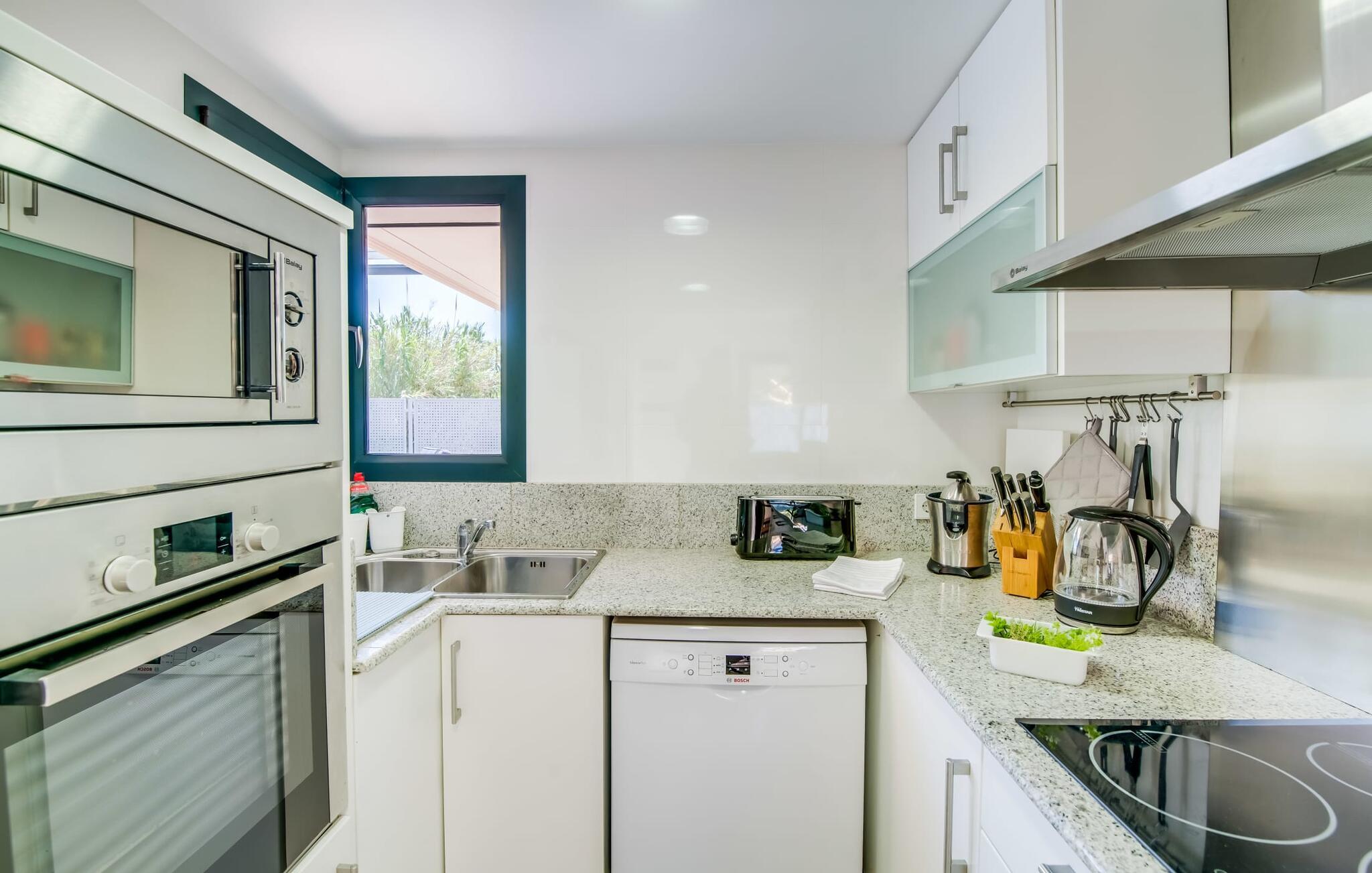 Villa "Mediterra" inviterer jer til at slappe af og nyde middelhavslivsstilen. Fra balkonen kan I nyde udsigten over det turkise hav, mærke den blide brise og indånde den friske kystluft. For dem, der ønsker at slappe af, fører kun få skridt fra huset til den bageste terrasse med pool, perfekt til en forfriskende svømmetur. Komfortable liggestole og en moderne gasgrill venter på jer, ideel til en eftermiddag med afslapning og udendørs spisning. Nyd jeres måltider ved træbordet med rattanstole og nyd de rolige omgivelser. Villaen har også en tagterrasse med en fantastisk udsigt over Alcudia-bugten og bjergene. Indenfor forbinder en stor terrassedør poolområdet med opholds- og spiseområdet i åbent plan. Den lyse, sommerlige indretning har hvide vægge, varme træaccenter og farverige kunstværker. Et moderne fjernsyn, en åben pejs og en behagelig sofa skaber en indbydende atmosfære til køligere aftener. Det veludstyrede køkken byder på alt hvad I behøver til en afslappende ferie, lige fra en mikrobølgeovn til en kaffemaskine. Med fire dobbeltværelser og tre badeværelser (to en suite) sikrer Villa "Mediterra" et behageligt ophold for alle. Den smukke, moderne finca "Mediterra" ligger i Alcúdia-bugten, i det mangfoldige østlige Mallorca. Beliggende midt i den velholdte urbanisering af Montferrutx, er supermarkeder, små butikker og gode restauranter inden for nem gåafstand. Den charmerende middelalderby Artà ligger kun 13 km væk. Stranden i Colònia de Sant Pere ligger kun 10 minutters gang væk, mens hvis I tager mod vest, vil I snart nå stranden i Son Serra de Marina.