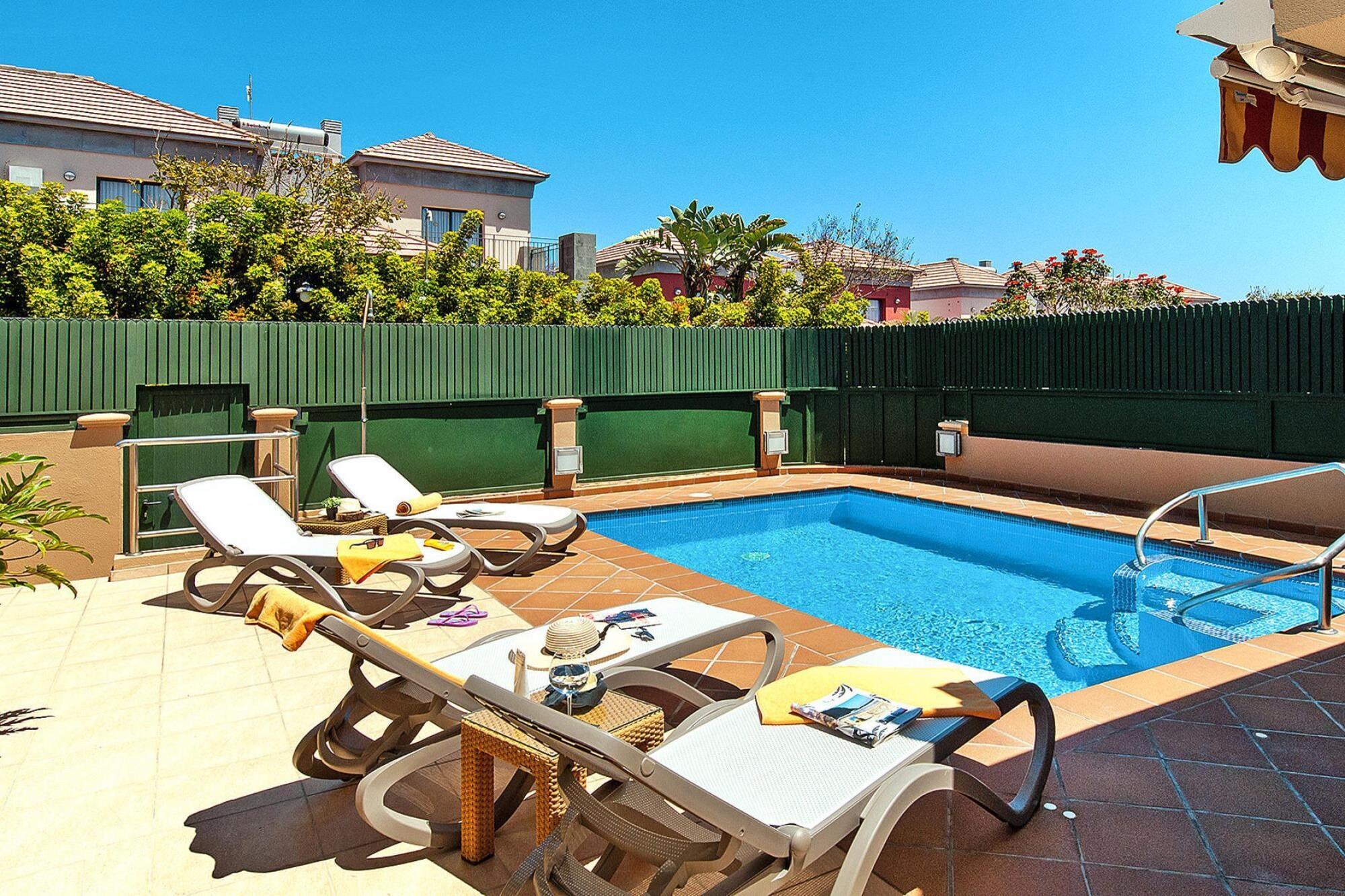 Det smarte feriehus med privat udendørs pool tilbyder dig en masse komfort og er det ideelle valg til en vellykket ferie med familie eller venner. Start dagen med en solid morgenmad på din terrasse og planlæg din daglige rutine: Hvad med en afslappende dag på stranden eller ved din egen pool? For mere variation, tag en tur rundt på øen eller besøg Palmitos Park. De, der vil dyrke motion, finder de bedste forhold i det lille fitnessrum i kælderen. Kort sagt har dit sommerhus alt til en perfekt ferie. Promenaden starter ved Maspalomas Fyrtårn og snor sig til den elegante badeby Meloneras, cirka to kilometer langs kysten. Den dejlige gåtur fører dig forbi restauranter, caféer og barer. Du kan spise godt langs boulevarden, mens du nyder udsigten over havet. Meloneras er den vestlige forlængelse af det populære feriested Maspalomas og er ideel for golfspillere og alle, der søger fred og ro. Detaljer: Forbrugsbaserede energiomkostninger, sengelinned, håndklæder, slutrengøring Velkomstpakke Brunchservice Aktiviteter i nærheden:. Kasinoet i Meloneras er især populært om aftenen, hvor du kan prøve lykken på roulettehjulet eller Blackjack og derefter til den berømte Legendary kabaret Sandstranden er perfekt til solbadning og svømning i det klare vand i Atlanterhavet Ocean.Den eksklusive feriedestination venter dig også med en 18-hullers golfbane med frodige greens, spektakulær udsigt og selvfølgelig et meget flot klubhus. Det veludviklede vejnet på Gran Canaria er ideelt til interessante og varierede dagsture. Kør igennem magiske landsbyer til de højeste tinder i island.Walk komfortabelt langs promenaden i Mogan eller oplev maleriske hjørner i centrum af Teror.A AB er påkrævet