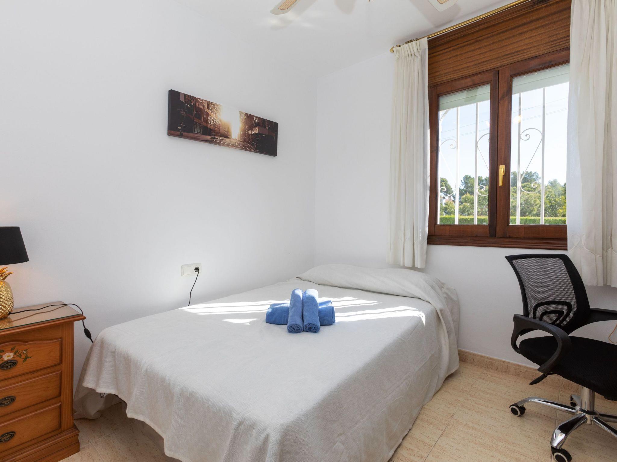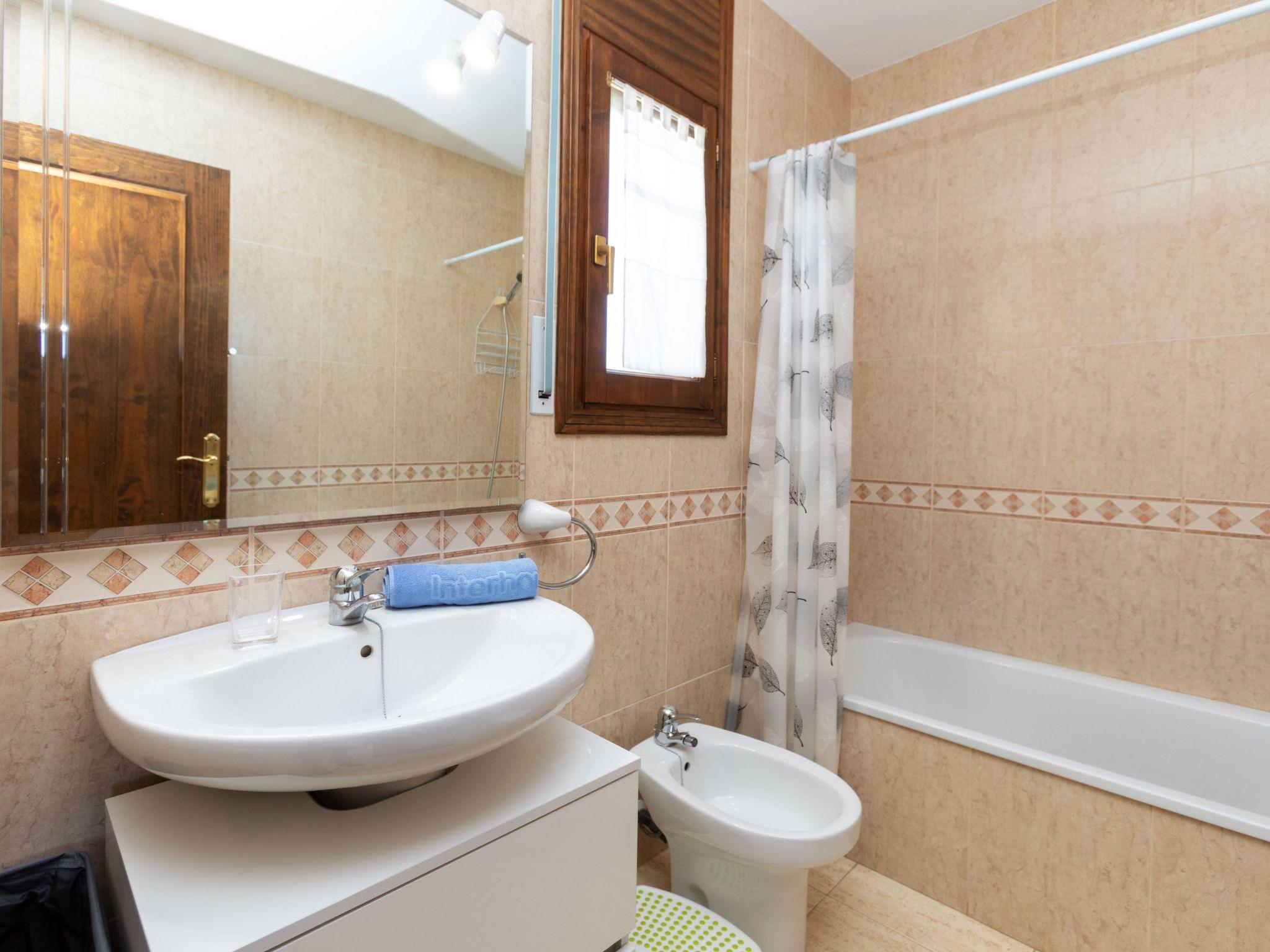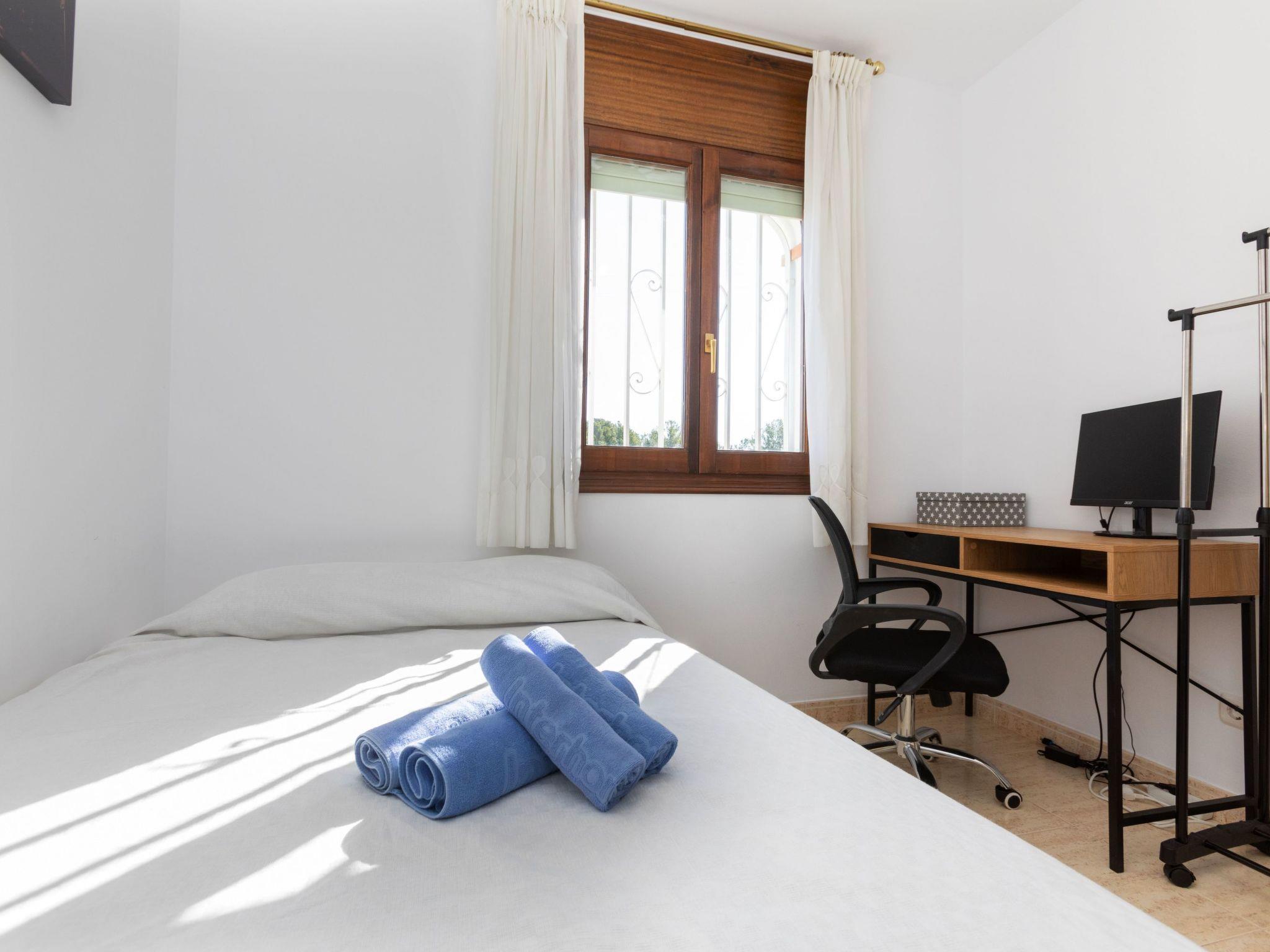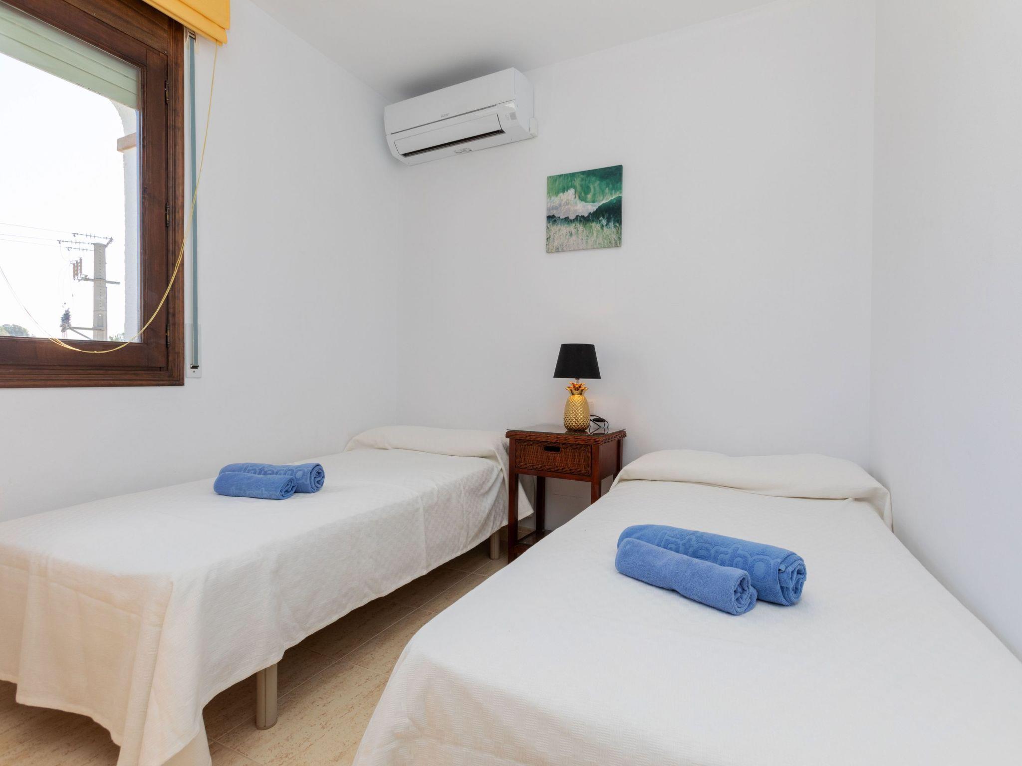 "Cristal", 4-room terraced house 100 m2 on 2 levels. Comfortable and cosy furnishings: living/dining room with dining table, digital TV and air conditioning. Exit to the garden, to the loggia. 1 room with 1 french bed (140 cm, length 190 cm), fan. Kitchen (oven, dishwasher, 4 ceramic glass hob hotplates, toaster, kettle, microwave, electric coffee machine). Shower/WC. No heating option. Upper floor: 1 room with 2 beds (90 cm, length 190 cm), air conditioning. 1 room with 1 french bed (150 cm, length 190 cm), air conditioning. Exit to the loggia. Bath/bidet/WC. Large balcony. Terrace furniture, barbecue. View of the garden. Facilities: washing machine, children's high chair, hair dryer. Internet (WiFi, free). Parking at the house. Please note: maximum 1 pet/ dog allowed. TV only ES. HUTT-065199-91 // Reg. Nr.: ESFCTU00004303200010728600000000000000HUTT-065199-917