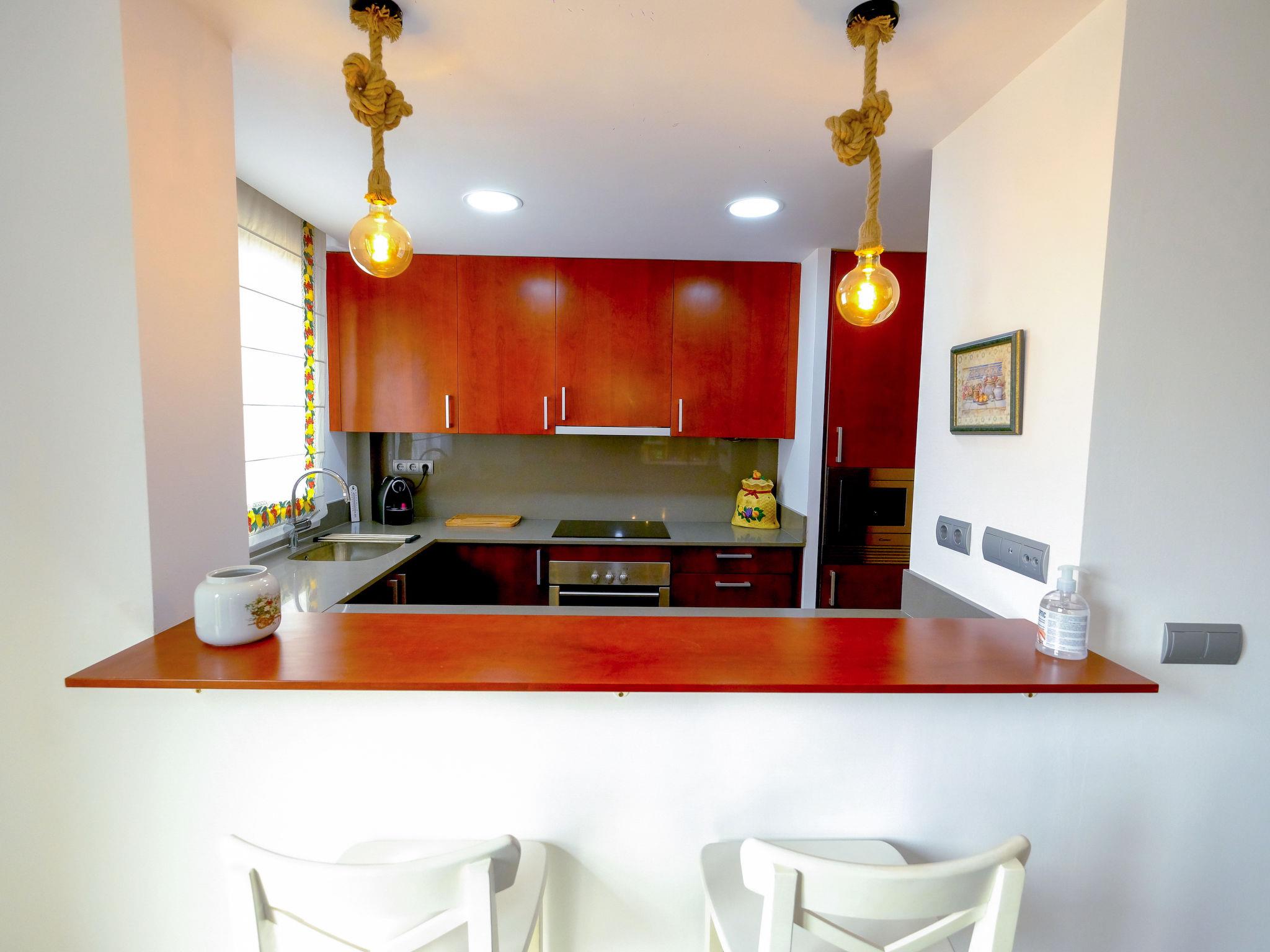 3-room apartment 131 m2, on the ground floor. Practical and comfortable furnishings: living/dining room 25 m2 with sliding door curtain with dining table, satellite TV, air conditioning and forced-air heating. Exit to the patio. 1 room with sliding door with 1 french bed (150 cm, length 190 cm). Exit to the garden. 1 room with 1 pull-out bed (2 pers. 2 x 90 cm, length 190 cm). Exit to the garden. Open kitchen (oven, 3 ceramic glass hob hotplates, toaster, kettle, microwave, electric coffee machine) with bar. Bath/bidet/WC, shower/bidet/WC. Patio. Terrace furniture. Beautiful view of the swimming pool, the garden and golf course. Facilities: washing machine, iron, children's high chair, baby cot for up to 2 year olds, hair dryer. Internet (WiFi, free). Parking (1 car) at the house. Please note: no lift. HUTT061956 // Reg. Nr.: ESFCTU00004303200016910900000000000000HUTT-061956-499