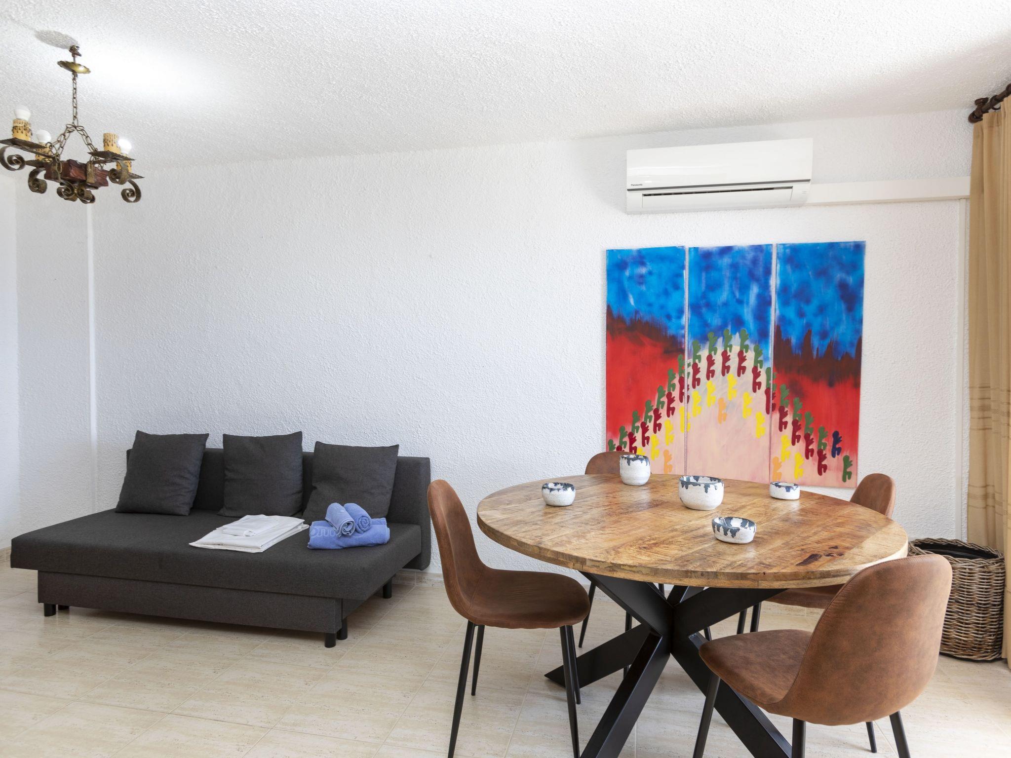 "Miami Palace", 2-room apartment 50 m2, on the lower ground floor. Living/dining room with 1 sofabed (135 cm), dining table, digital TV and air conditioning. Exit to the terrace. 1 room with 1 french bed (135 cm). Kitchen (oven, dishwasher, 4 ceramic glass hob hotplates, toaster, kettle, microwave, electric coffee machine). Shower/bidet/WC. No heating option. Terrace. Terrace furniture. View of the sea. Facilities: washing machine, iron, children's high chair, baby cot, hair dryer. Parking space n 57. HUTT-068812 // Reg. Nr.: ESFCTU00004303200026914400000000000000000HUTT-0688125
