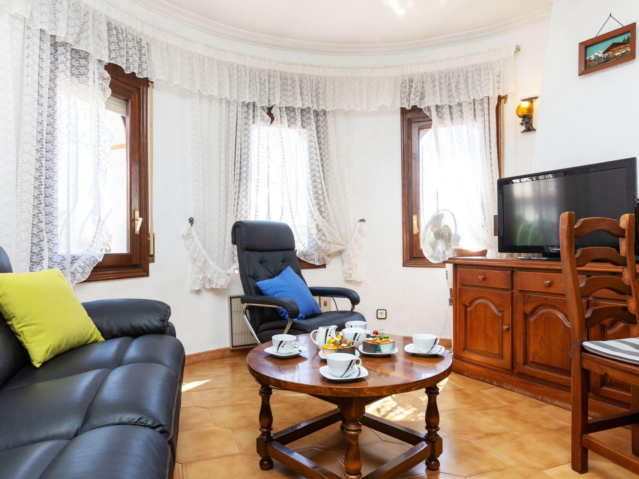 "Castilla", 3-room house 60 m2. Practical and rustic furnishings: living/dining room with open-hearth fireplace (only for decoration), dining table, satellite TV, digital TV and DVD. Exit to the terrace. 1 small room with 2 beds (90 cm, length 190 cm). 1 room with 1 french bed (135 cm, length 190 cm). Small, open kitchen (oven, 3 ceramic glass hob hotplates, toaster, microwave, freezer, electric coffee machine). Bath/WC, sep. WC. No heating option. Terrace. Terrace furniture, barbecue, deck chairs (4), conservatory. Facilities: washing machine, iron, baby cot (extra). Maximum 1 pet/ dog allowed. HUTT001572