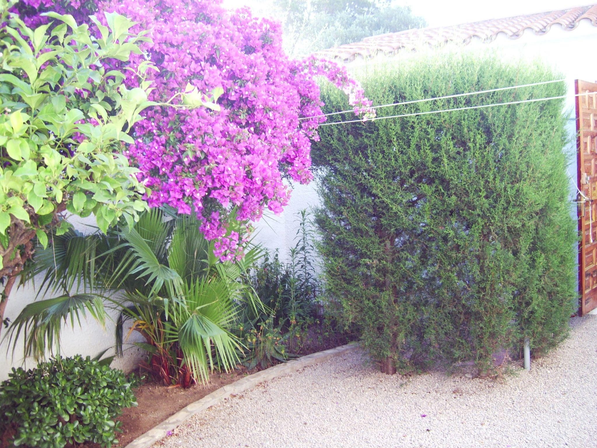 The ingrown and secluded garden is furnished with dining areas and loungers, as well as a brick-built outdoor barbecue. The patio/courtyard behind the house is accessible via the kitchen and the garage and is also furnished with a dining area. Lemons grow there, which you are welcome to pick. There is also a practical additional outdoor shower, which provides refreshment in summer. From here you can see the nearby mountains