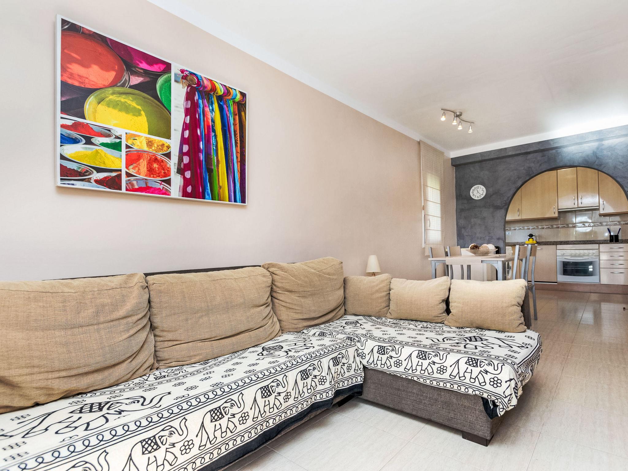 "Jalisco 2", 3-room terraced house 68 m2. Practical and comfortable furnishings: living/dining room with dining table, digital TV and air conditioning. Exit to the terrace. 2 rooms, each room with 1 x 2 bunk beds (90 cm), 1 french bed (135 cm). Kitchen (oven, dishwasher, 4 ceramic glass hob hotplates, toaster, kettle, microwave, electric coffee machine). Shower/bidet/WC. No heating option. Terrace furniture, electric barbecue. Facilities: washing machine, iron, hair dryer. Internet (WiFi, free). Parking. HUTT-003399 // Reg. Nr.: ESFCTU00004303200016130100000000000000000HUTT-0033990
