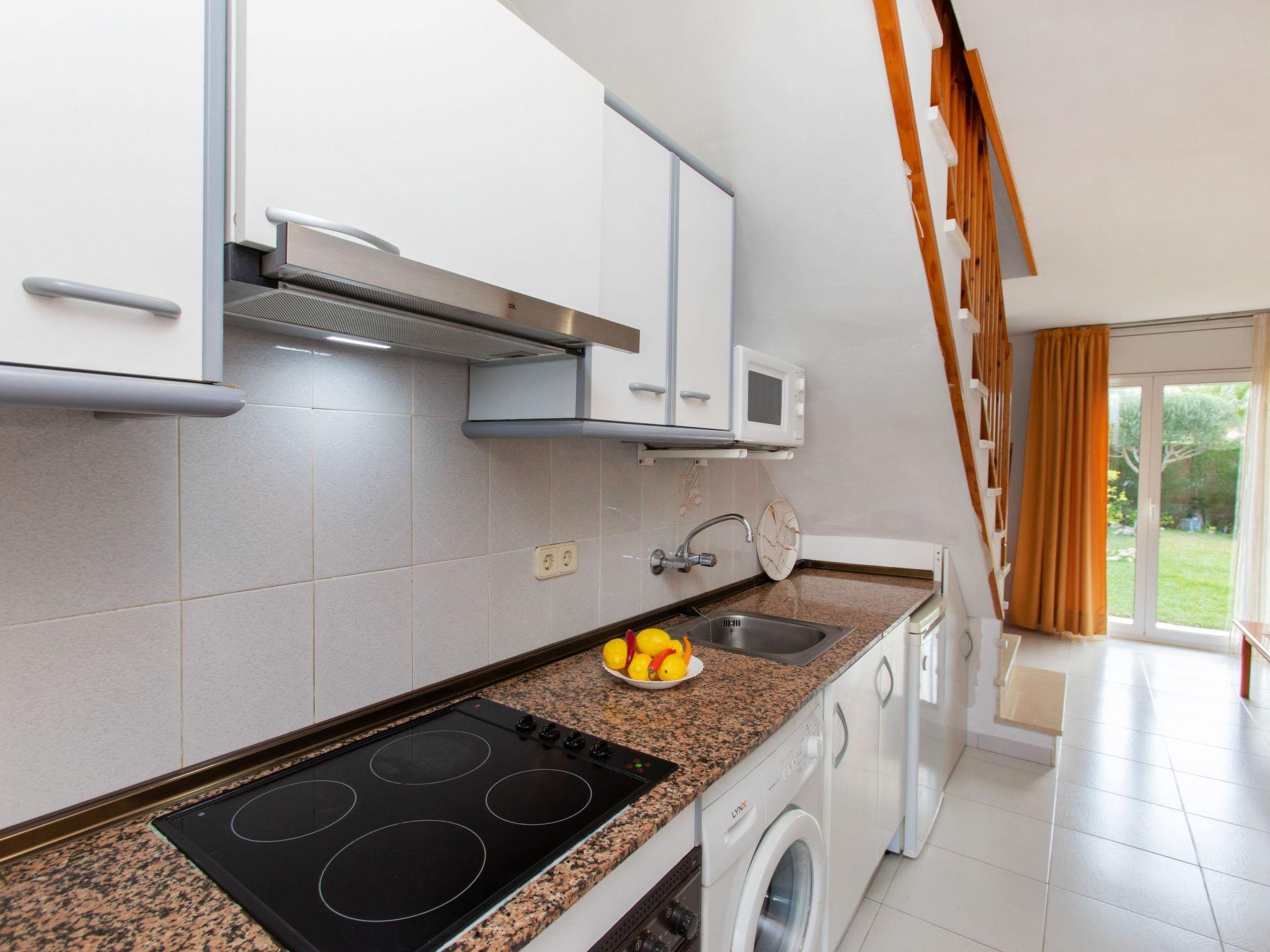 4-room terraced house 65 m2 on 2 levels. Simple furnishings: living/dining room 16 m2 with dining table, satellite TV and digital TV. Exit to the garden. 1 room 12 m2 with 1 french bed (135 cm), bath/bidet/WC and fan. Exit to the patio, to the swimming pool. Kitchenette (oven, dishwasher, 4 ceramic glass hob hotplates, toaster, kettle, microwave, electric coffee machine). No heating option. Upper floor: 1 room with 1 double sofabed (2 x 80 cm). Exit to the terrace. 1 room 10 m2 with 2 beds (90 cm), fan. Exit to the terrace. Shower/WC. Terrace 6 m2, terrace 10 m2. Terrace furniture, barbecue. Facilities: washing machine, iron, hair dryer. Internet (WiFi, free). Parking (fenced 2 cars), garage. Please note: maximum 1 pet/ dog allowed. TV only ES, DE, FR. HUTT010133 // Reg. Nr.: ESFCTU00004303200005219700000000000000000HUTT-0101332