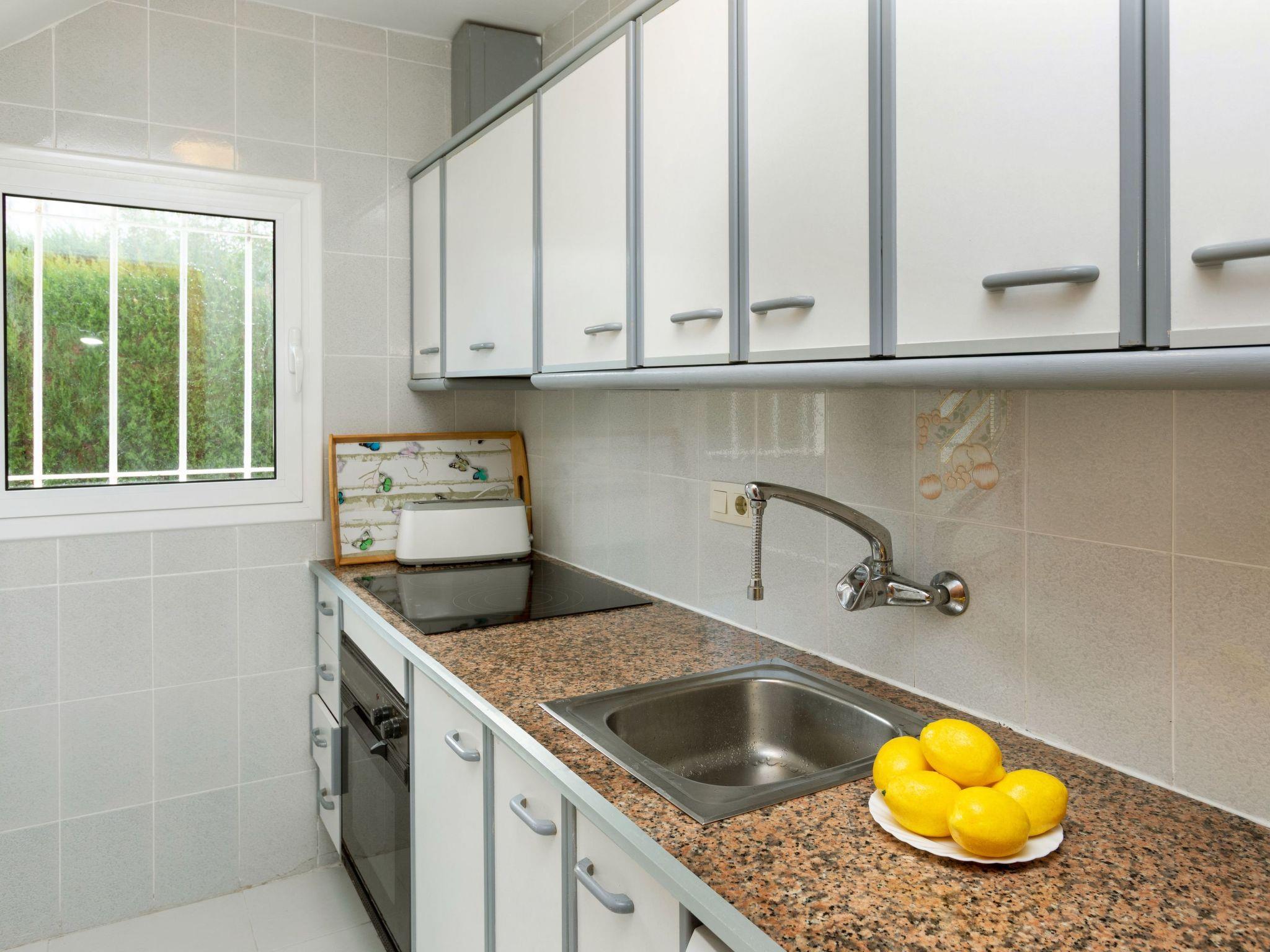 5-room house 100 m2 on 2 levels. Comfortable furnishings: living/dining room with dining table, satellite TV, digital TV and fan. Exit to the patio. 1 room with 2 beds (90 cm), fan. Exit to the garden, to the swimming pool. 1 room with 2 beds (90 cm), fan. Exit to the garden, to the swimming pool. Kitchen (oven, dishwasher, 4 ceramic glass hob hotplates, toaster, kettle, microwave, electric coffee machine). Shower/WC. No heating option. Upper floor: 1 room with 1 french bed (135 cm), fan. Exit to the terrace. 1 room with 2 beds (90 cm), fan. Exit to the terrace. Bath/bidet/WC. Terrace 20 m2, terrace 10 m2, garden 350 m2. Terrace furniture, barbecue. Facilities: washing machine, iron, children's high chair, baby cot, hair dryer. Internet (WiFi, free). Parking (fenced), garage. Maximum 1 pet/ dog allowed. HUTT006866 // Reg. Nr.: ESFCTU000043032000051763000000000000000000HUTT0068669