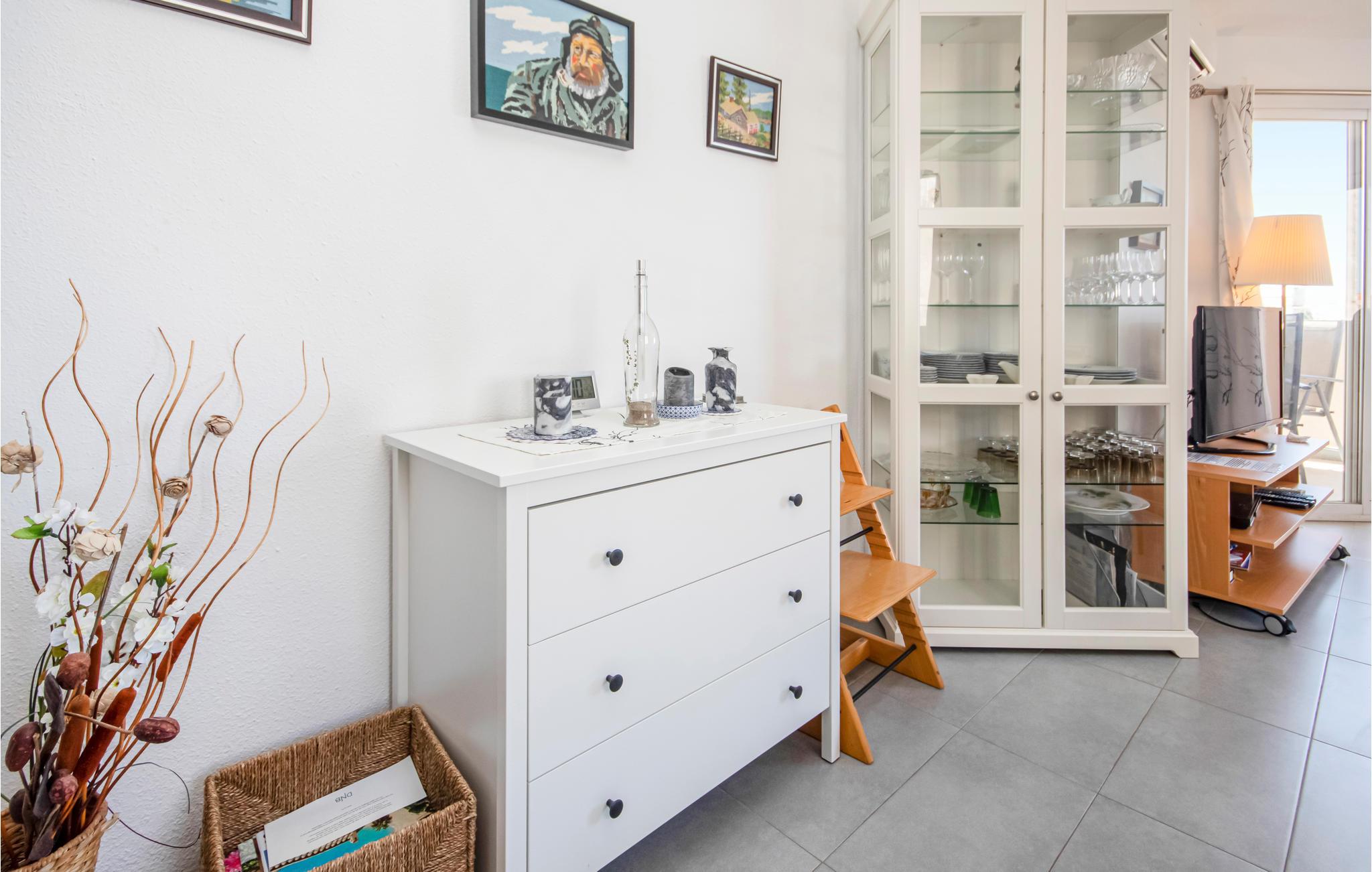 Denne lette og luftige lejlighed er stilfuldt møbleret og tilbyder en stue / spisestue med tekøkken og en udendørs terrasse. Opholdsstuen er indrettet med spisebord og stole, tv og en behagelig sofa. Loungen fører ud til den sydøstvendte terrasse med udsigt over urbaniseringen til havet. Tekøkkenet er fuldt udstyret.