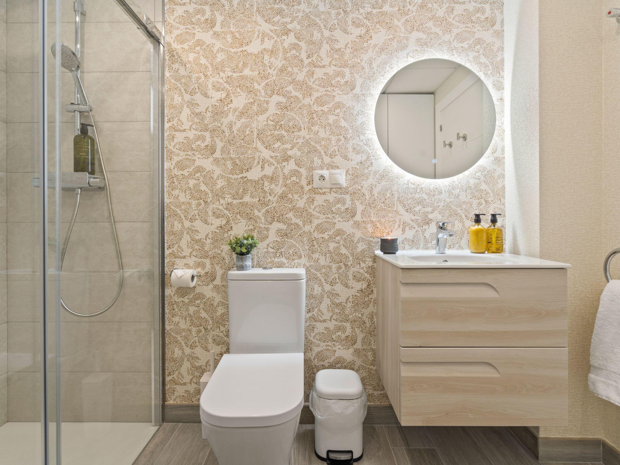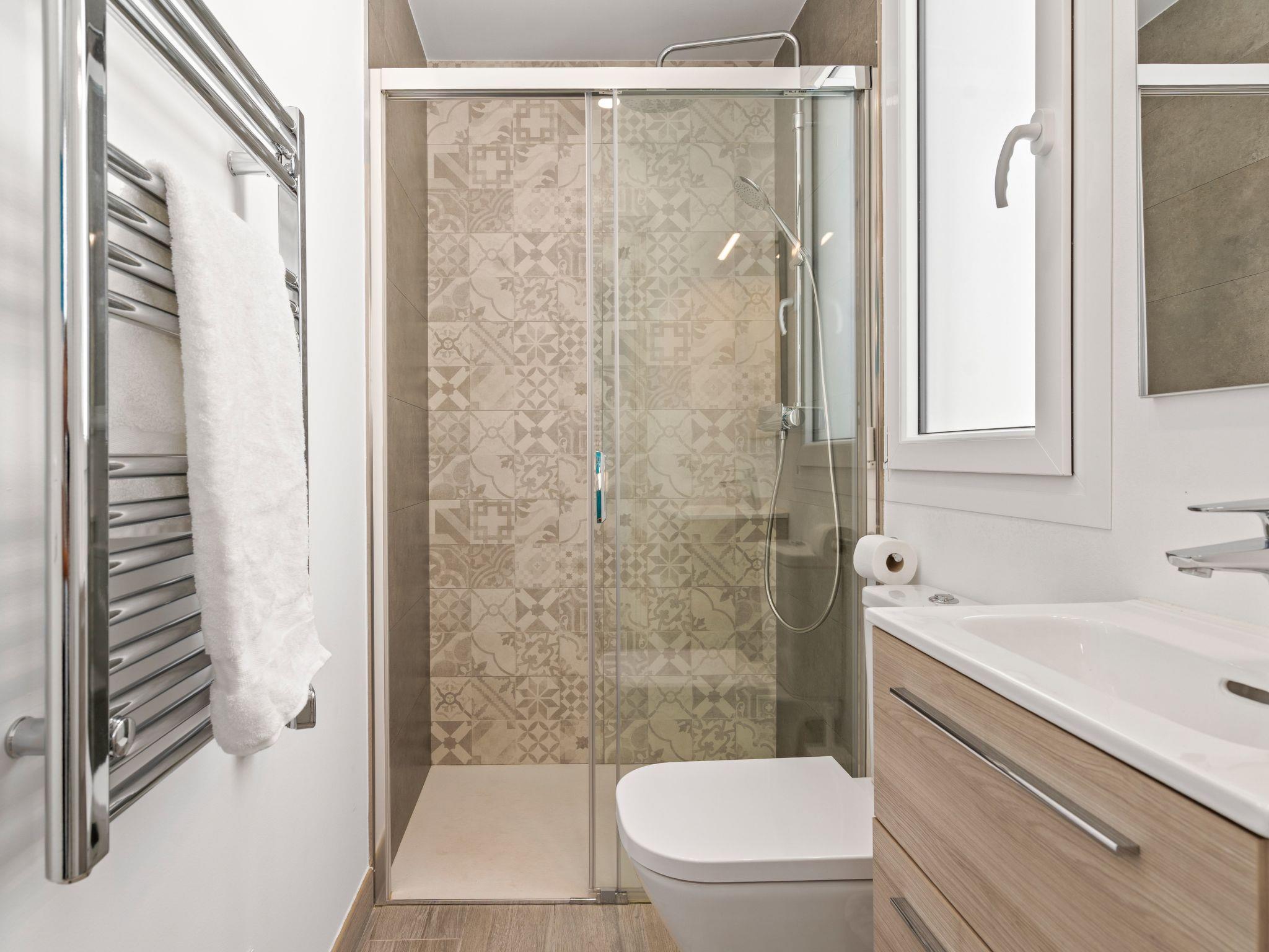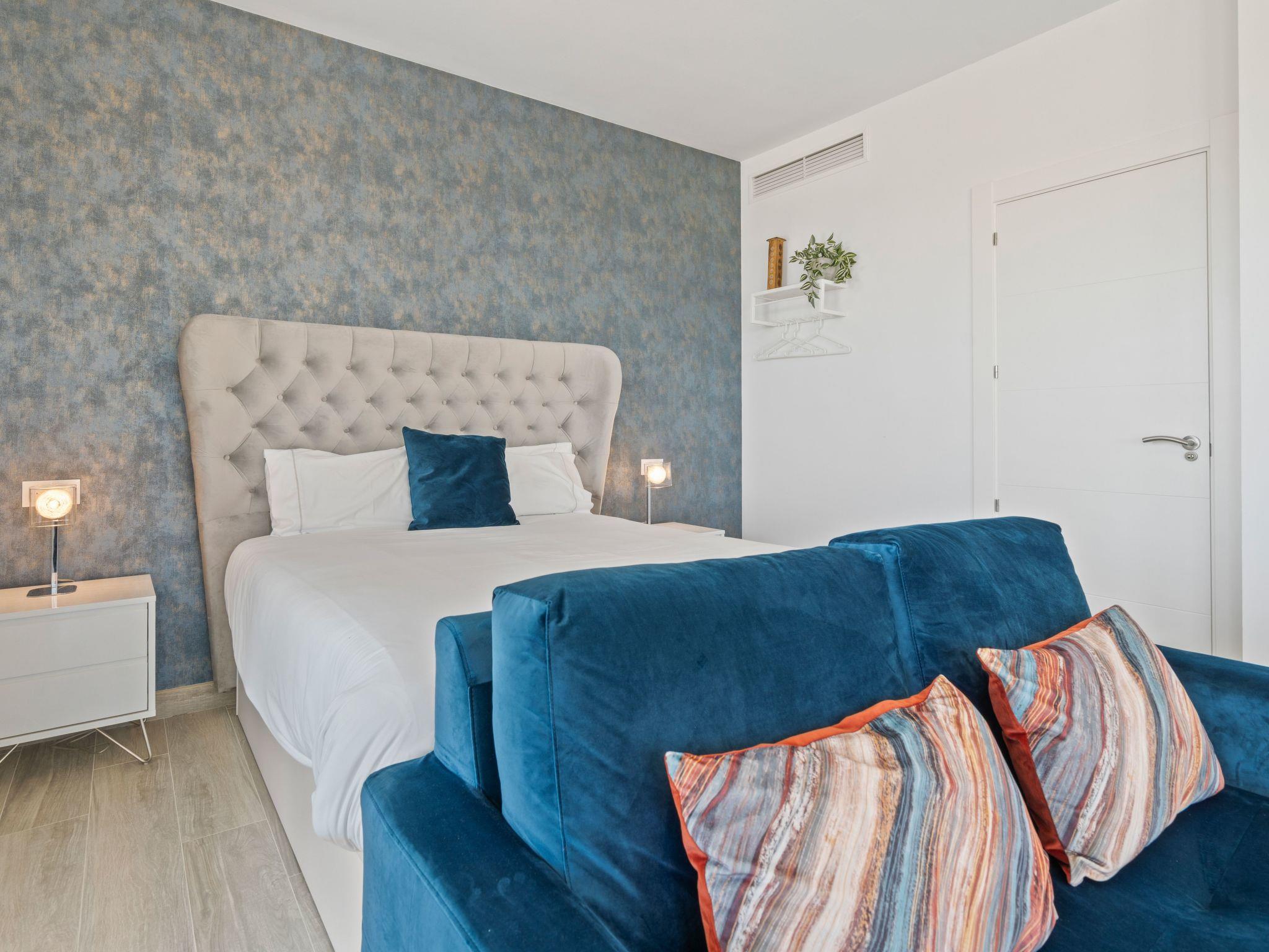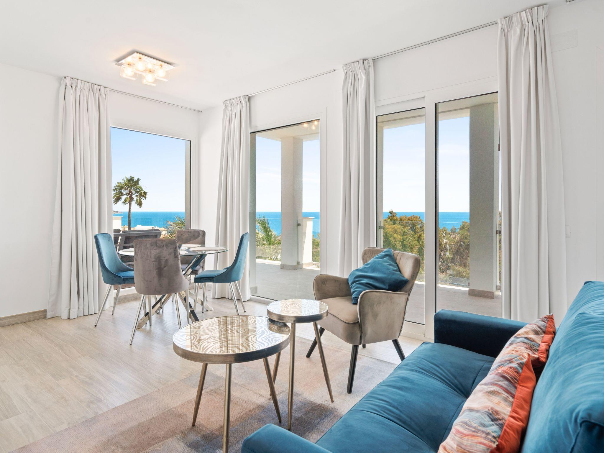 - Bedroom 2 (first floor): King-size bed, full-length windows with sea views, sitting area with flat-screen smart TV, sofa and glass table that can be used for intimate meals, work or study. This room also has sliding doors to the upstairs terrace and a separate bathroom with shower and toilet.