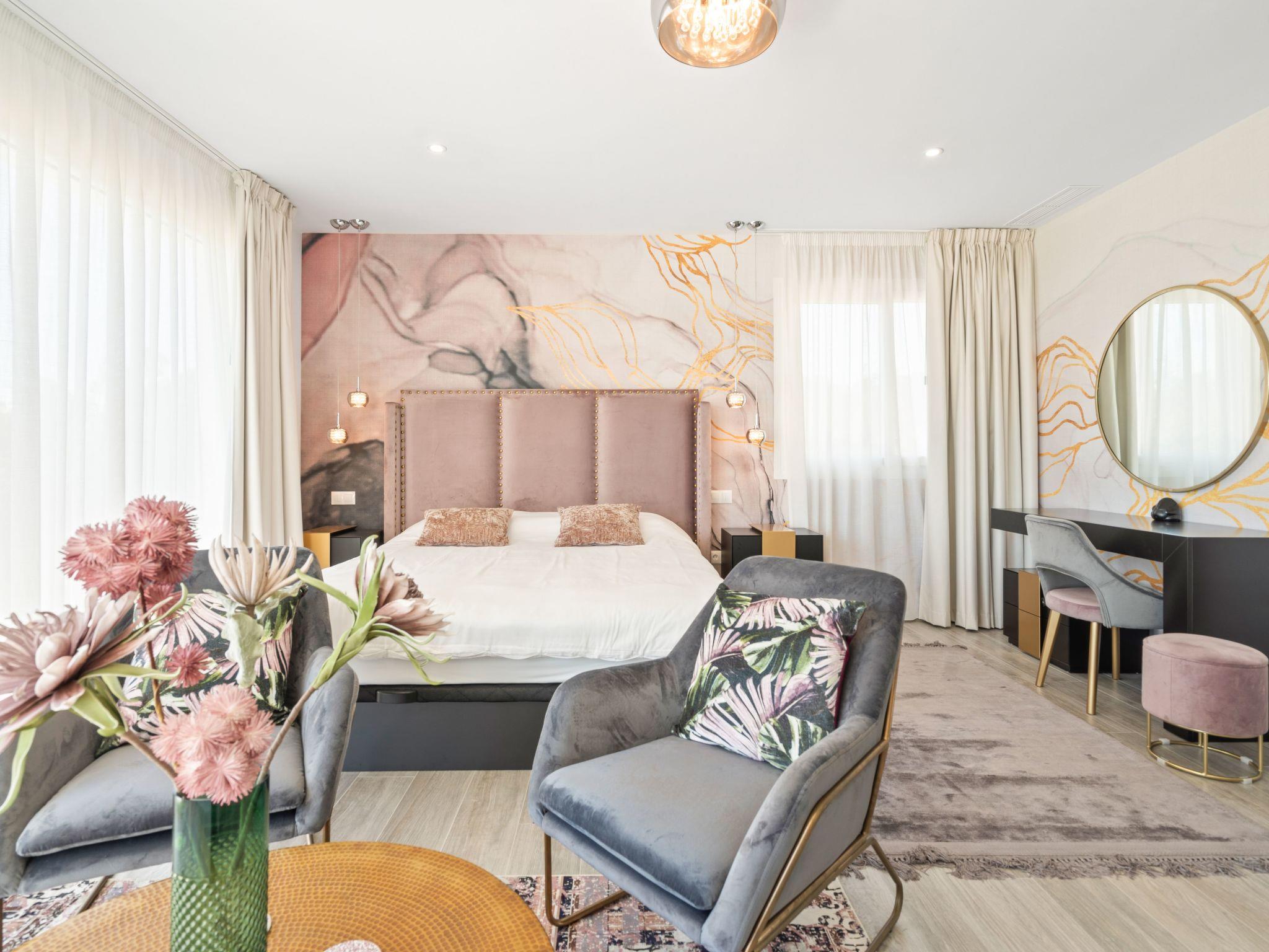 - Bedroom 3 (ground floor): A beautifully furnished second master bedroom on the ground floor with king-size bed, en-suite bathroom with bath and separate shower, full-length window and sliding door with direct access to the outdoor pool and garden.