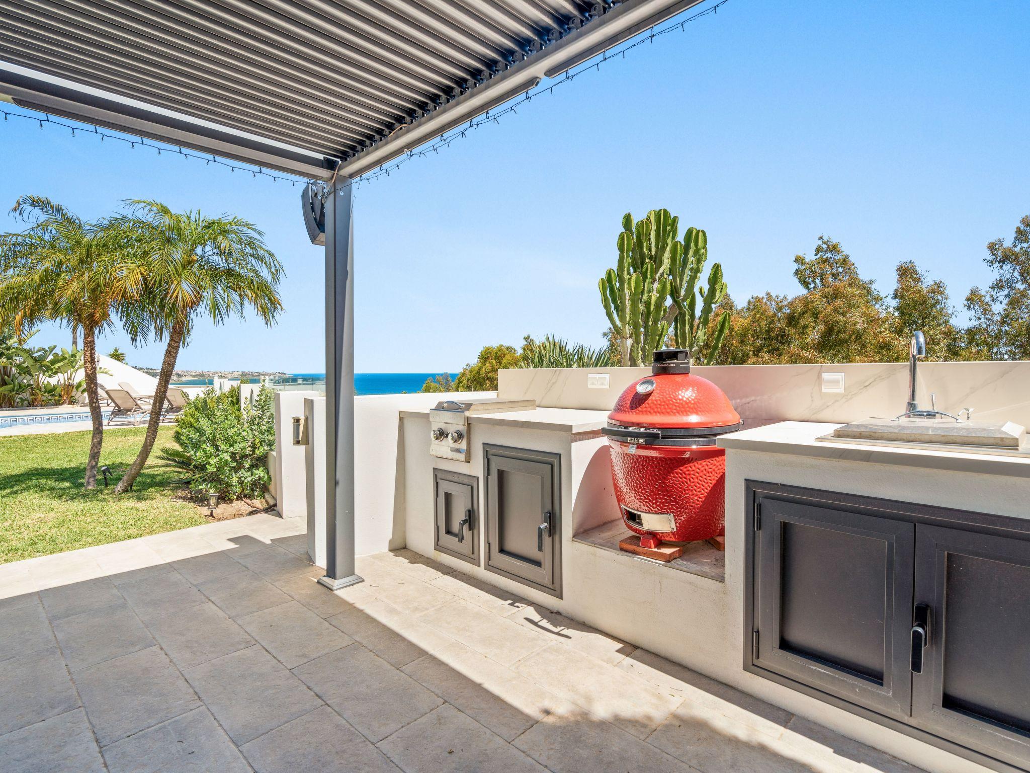 The adjacent Kamado Joe barbecue makes outdoor entertaining effortless, whether grilling fresh seafood or enjoying a sunset dinner with family and friends. The covered pergola, with its comfortable seating and dining area, allows you to relax while enjoying uninterrupted sea views.