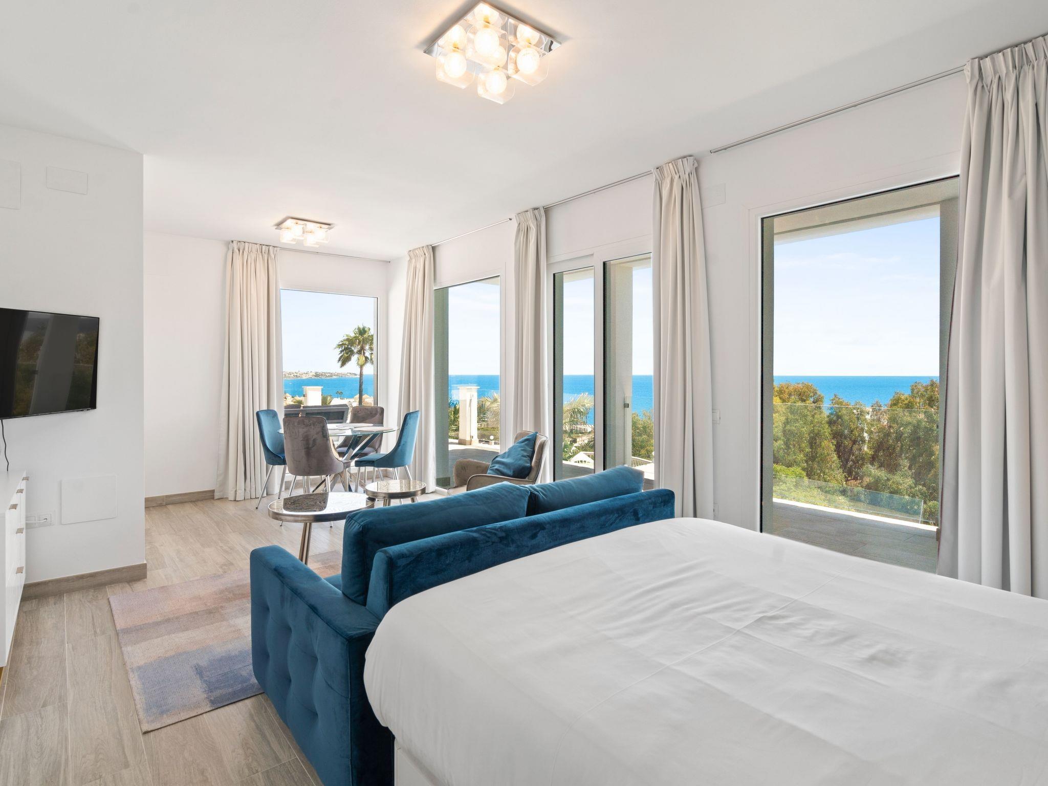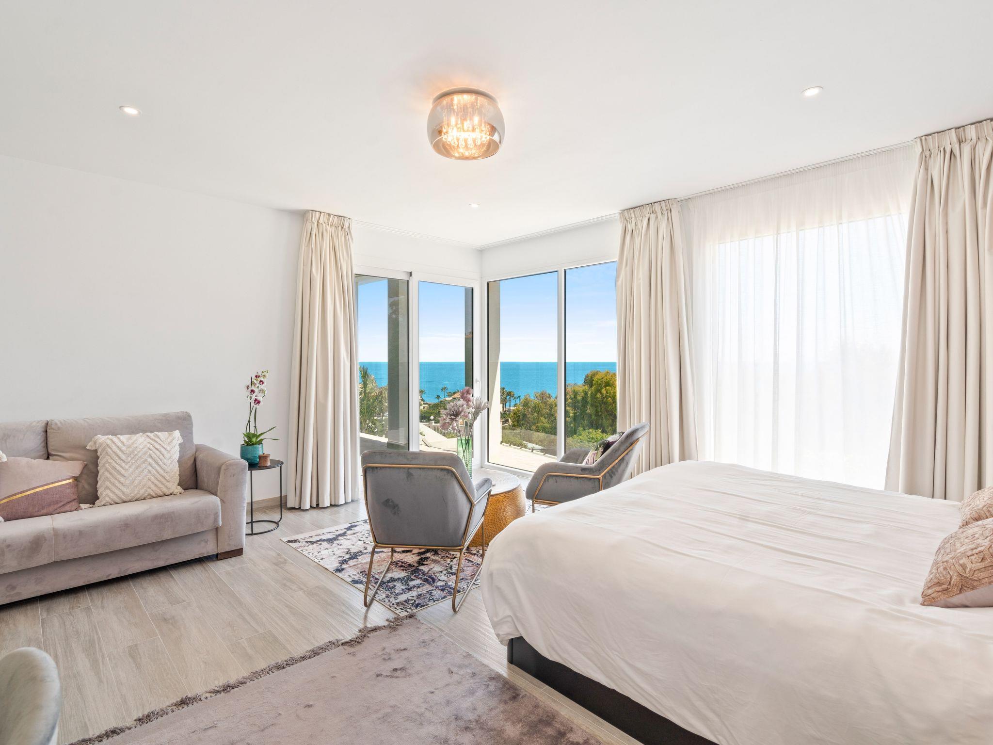 - Master Suite Bedroom 1 (first floor): This spacious suite has a super-king bed and full-length windows that offer incredible sea views. You can wake up to the sunrise over the Mediterranean from the comfort of your bed! There's a sofa and seating area where you can sip a coffee, then step out onto the large balcony and terrace to enjoy the morning sun. There's also a dressing room, a large en suite bathroom with bath, a separate large shower cubicle and an enclosed toilet.