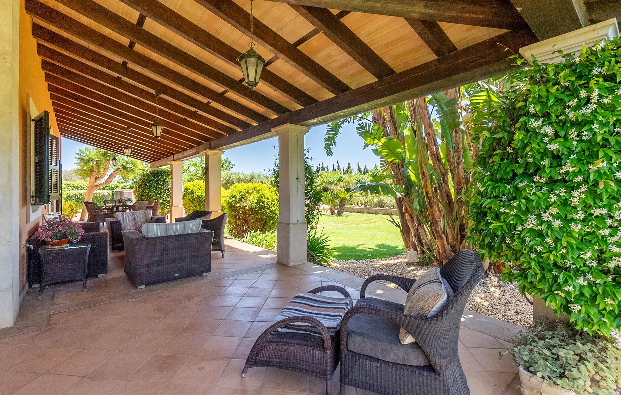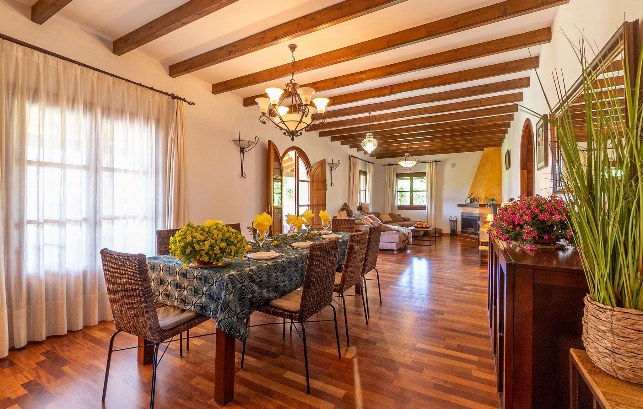 Beliggende i et rummeligt, velholdt havelandskab tilbyder denne rummelige og luksuriøst indrettede finca jer en solrig oase af fred, hvor I kan nyde middelhavsklimaet til fulde med venner eller familie. Det rummelige, velindrettede og højkvalitets interiør kombinerer rustik charme med moderne komfort og lover et behageligt indeklima og en ægte atmosfære året rundt. Glæd jer til hyggelige madlavningsaftener i det veludstyrede køkken i landlig stil og nyd dagens måltider i den indbydende spiseplads. Til hyggelige aftener, hvor I ser tv, kan I føle jer godt tilpas på det komfortable sofaområde. Spil PlayStation eller billard, eller nyd harmoniske aftener ved pejsen i de køligere måneder.