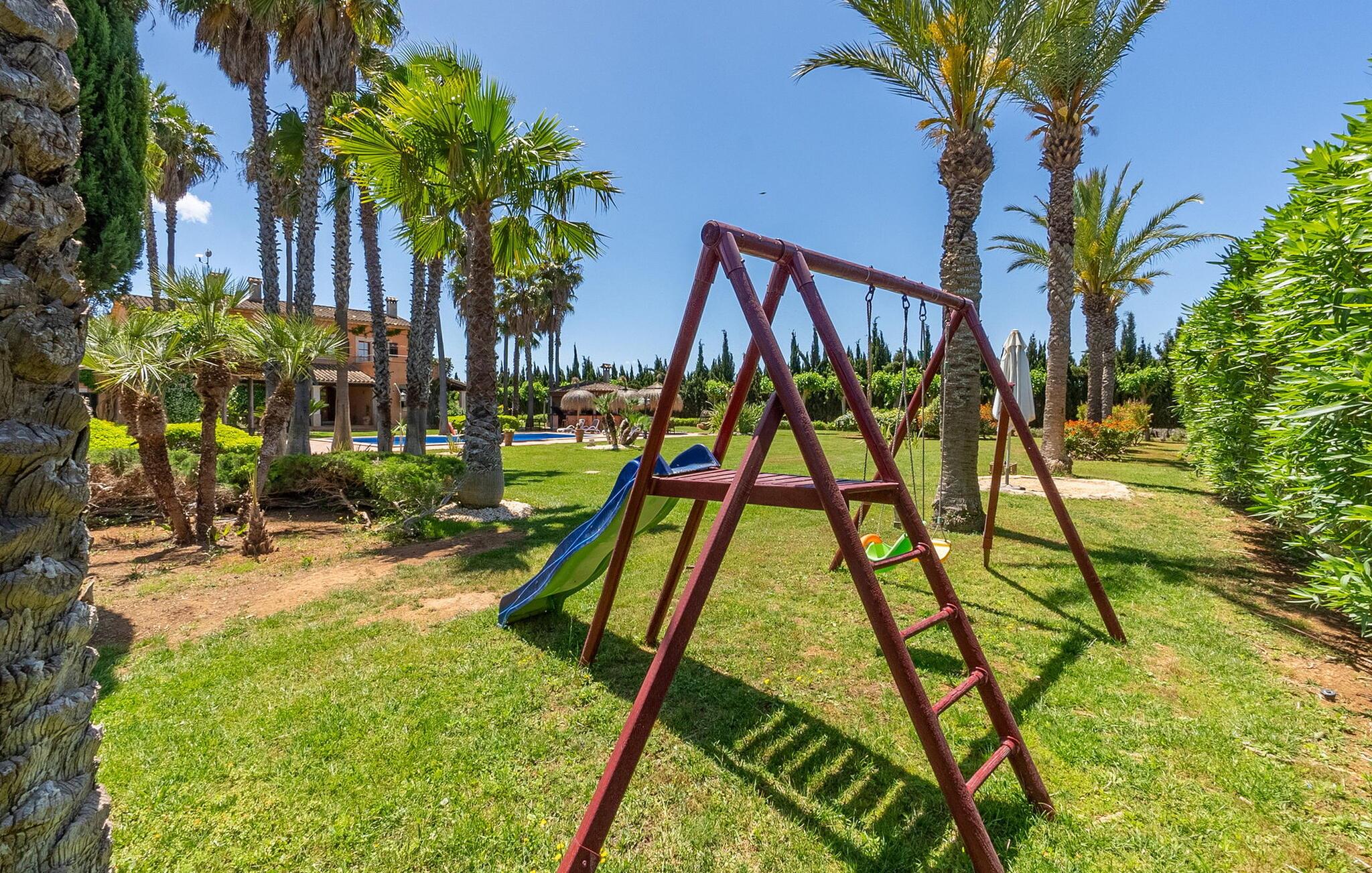 Ferieglæde opstår, så snart I ankommer. Den parklignende have med middelhavsplanter, store græsplæner og afsondrede tilflugter er afsondret og tilbyder maksimal privatliv. Slap af i den rummelige pool og tag afslappende siesta i skyggen af ??parasollerne, mens de yngre gæster hygger sig ved bordtennisbordet, ved fodboldbordet eller på legepladsen. Senest mødes I igen, når I tænder for grillen i poolhuset med haneanlæg for at nyde de lune sommeraftener med stemningsfulde grillaftener. jeres tagterrasse er også et ideelt sted for romantiske stunder med en velafkølet hvidvin: Herfra kan I nyde en fantastisk udsigt over ejendommen og op til bjergene.