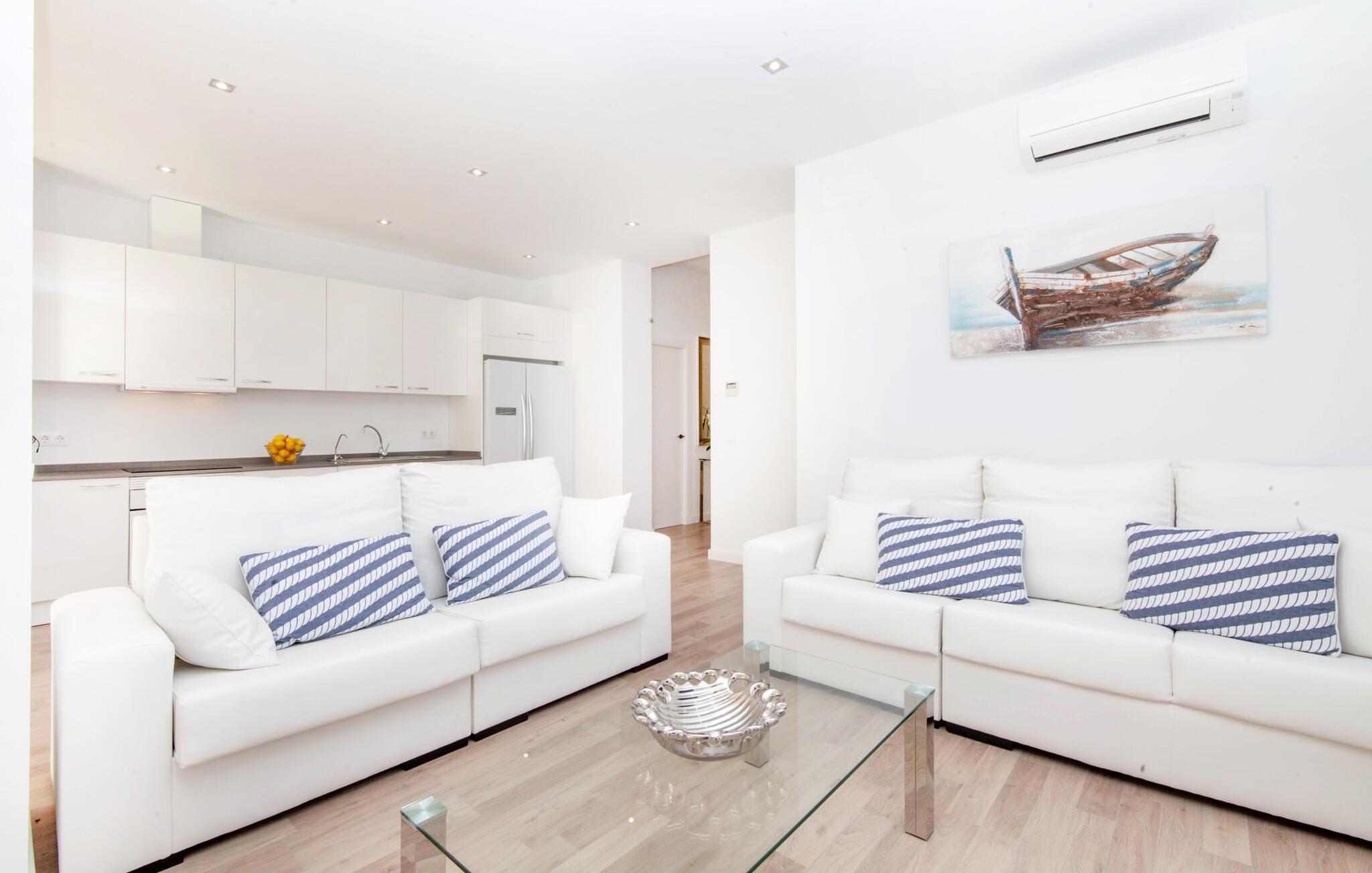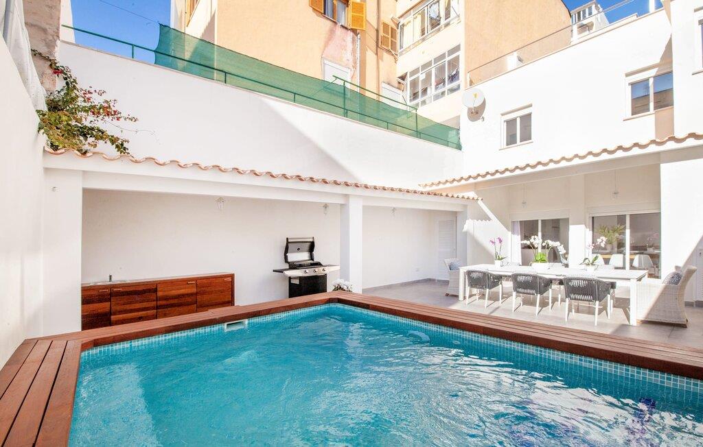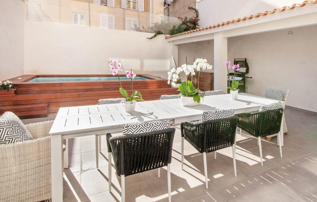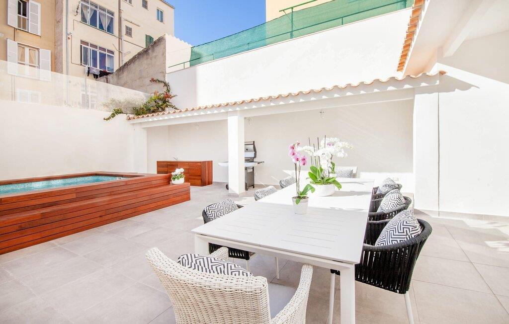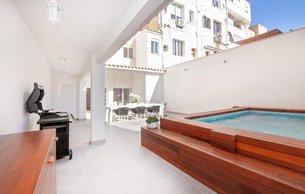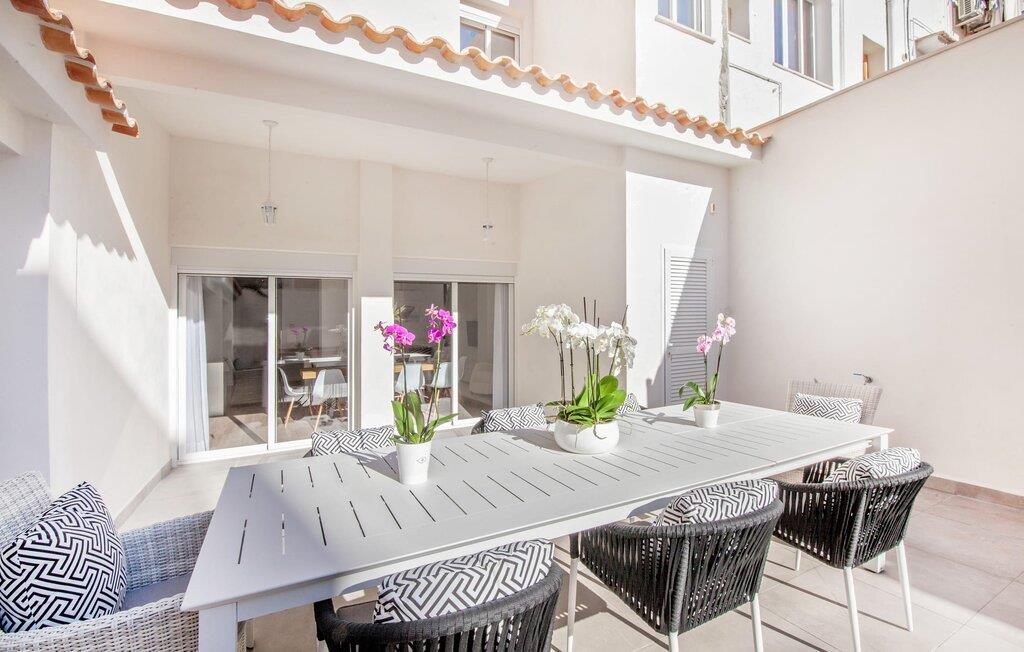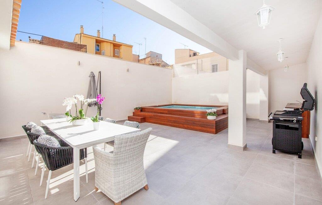 Kan I indimellem godt lide at danse til jeres egen rytme? Er den klassiske mallorcanske stil med sandsten lidt for gammeldags til dig? Så prøv at leve helt i hvidt. Enhver, der kan lide dette klare udseende af lethed, vil elske det smukke rækkehus "Miquel Santandreu 40" i Palma. Den glitrende turkisblå pool indrammet af træ er et absolut blikfang i jeres brolagte gårdhave. Her kan I slappe af i middagssolen og nyde en siesta, mens butikkerne er lukkede. Den mobile grill under den overdækkede terrasse og det lange spisebord venter bare på, at I skal prøve den ene delikatesse efter den anden. På tagterrassen kan I nyde udsigten til den solrige øs blå himmel. Men først ting først, inden I går til første sal: I stueetagen kan I forvente et åbent design med masser af plads til jeres personlige ferieglæde. Det hvide, moderne køkken harmonerer perfekt med sofaen og spisepladsen. Takket være det store køleskab kan I holde mange af jeres hverdagsting friske. Hvis I får lyst til at lave mad, kan I gå i gang med det samme. Et soveværelse med dobbeltseng og toilet samt eget badeværelse fuldender indretningen af stueetagen. Med billeder af sejlbåde kan I endda mærke en let havbrise her i byen. En vindeltrappe og en trappe med moderne glasomgivelser tager jer til høje højder. Anden sal byder jer også velkommen med lyse hvide og subtile nuancer af blå. To soveværelser med dobbeltsenge og to værelser med enkeltsenge byder på masser af plads. Badeværelserne er ekstremt moderne takket være de få fliser på væggen. En stor fordel ved rækkehuset er, at I hurtigt kan nå jeres drømmedestinationer takket være gaden direkte foran huset. Det nærmeste supermarked ligger kun 400 m væk. Lufthavnen ligger kun 10 km væk, så I kan tjekke ind i jeres rækkehus praktisk talt, så snart I lander og ikke behøver at køre en lang køretur. Palma er hovedattraktionen på hele øen. Glem ikke at give nok tid til sightseeing og shopping, selvom I føler jer hjemme i jeres rækkehus. Det ugentlige marked i s'Arenal ligger kun 13 km væk. I kan også nyde den strålende green på den nærliggende golfbane, som ligger kun 6 km væk. Med dette rækkehus kan I være sikker på, at alle vil finde passende aktiviteter i umiddelbar nærhed: uanset om de er festdeltagere, dem, der søger fred og ro, byboere eller strandelskere. Turen langs Platja de Palma er omkring 10 km lang. Mallorcas hjerte ligger i Palma. Så meget desto bedre venter det smarte rækkehus "Miquel Santandreu 40", hvor I kan nyde afslappende stunder på trods af det livlige byliv. Leder I efter sightseeing i den gamle bydel, eller elsker I omfattende shoppingture i trendy butikker eller hele festlivet i s'Arenal? I øens hovedstad finder I alt, hvad I leder efter på jeres solrige ø. Og selvfølgelig kan havet hurtigt nås. Den berømte Platja de Palma ligger omkring 10 km væk.