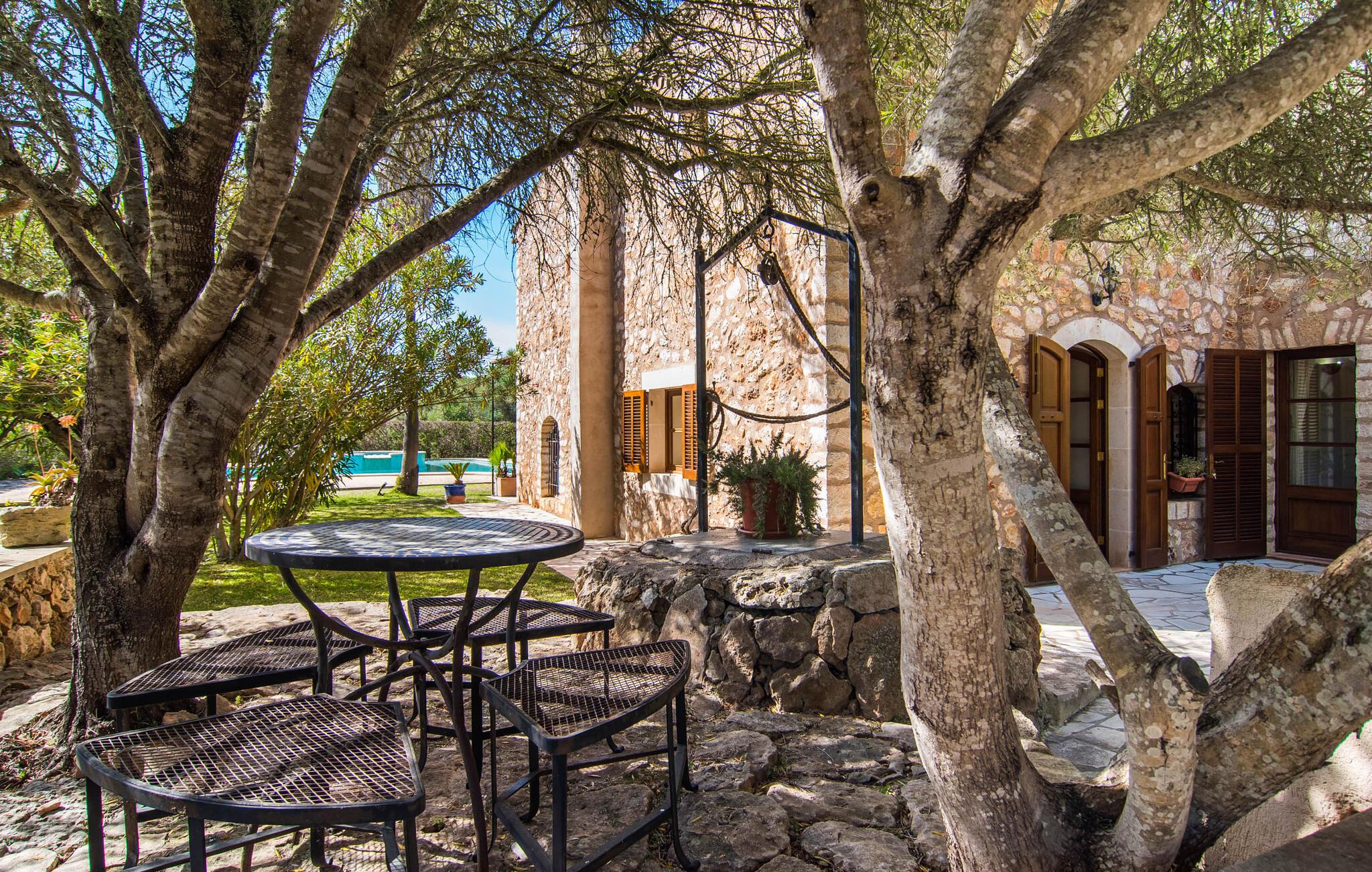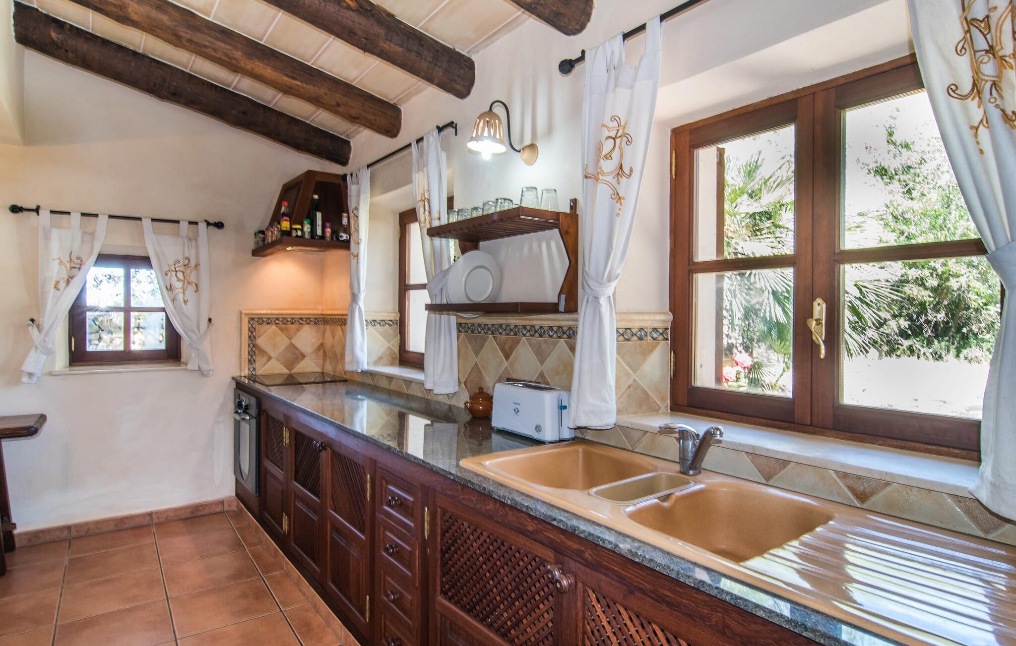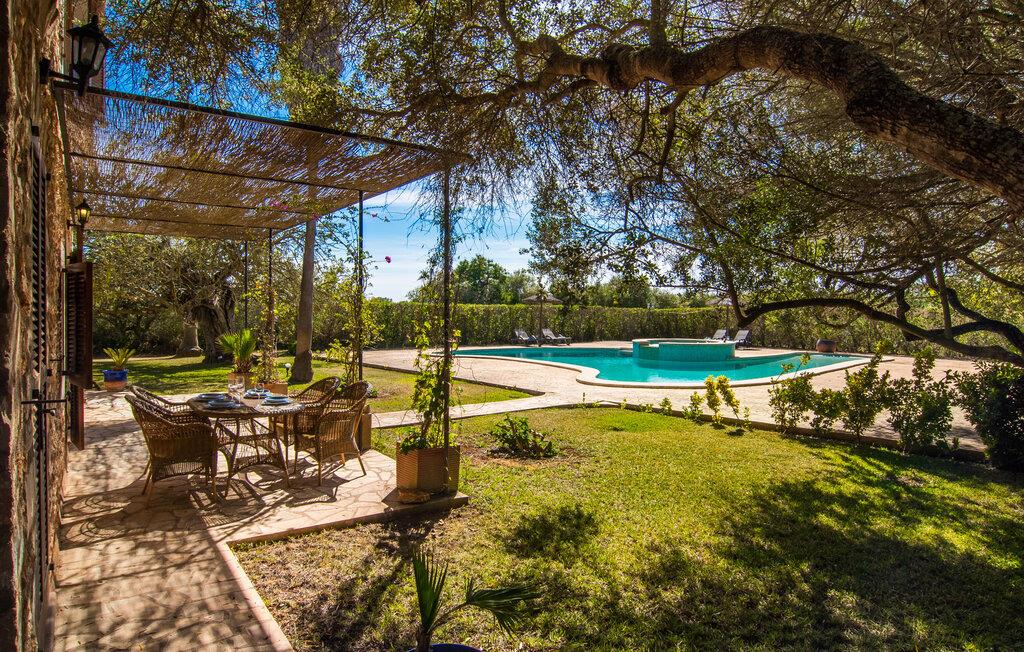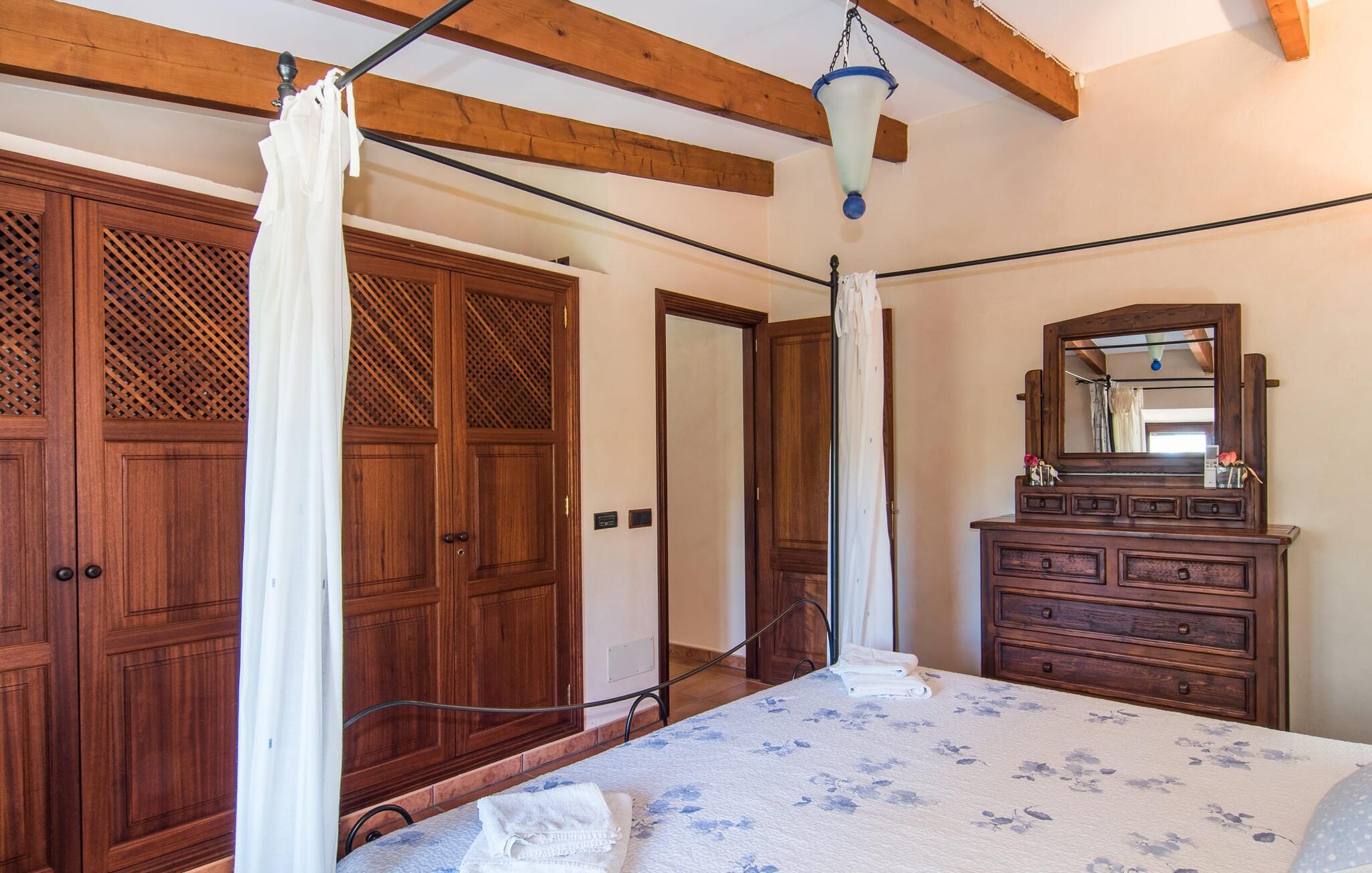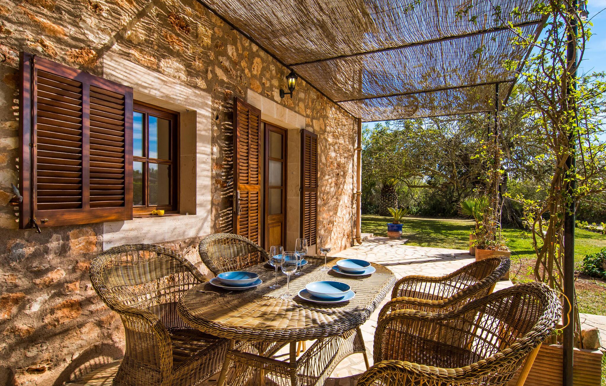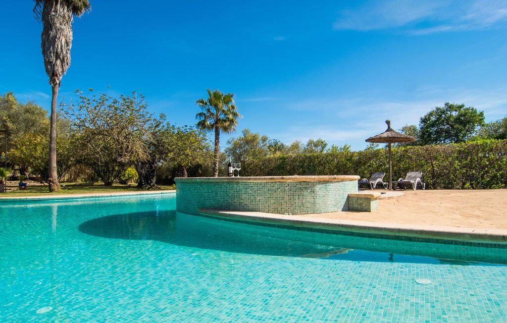 Det er altid en fornøjelse at præsentere jer for endnu en naturstensvilla, der er så smuk, at den ligner noget ud af en film og på alle måder ser præcis ud, som I forestiller jer en traditionel landvilla, selvom den først blev bygget i 2004. En foret landevej fører jer til grusparkeringspladsen og huset. Gamle, knudrede oliventræer, stole under det stråtækte terrassetag, behagelige siddepladser ved den naturlige dam eller midt mellem frodige palmer, fred på landet. Alt dette inspirerer jer til at bringe baguettes, oliven og vin på bordet, tage en dyb indånding og tilbringe dagen med at nyde solen og lave ingenting. Der er også plads nok til liggestole på den 7.000 m² store ejendom. Eller hvad med et glas champagne i det cirkulære vandfaldsboblebad, selvom det normalt ikke er en del af jeres livsstil? Den buede pool med en samlet længde på 16 m er bestemt højdepunktet i "Mirabó Ramonet", så meget, at I ikke engang tænker på havet i starten. Det er som en rolig, blå lagune midt i ingenting; Fra oven kan I se, hvor meget plads der er mellem denne landlige idyl og bjergene i det fjerne. At bo i en villa skal selvfølgelig passe til denne udendørs følelse, og hvis et landsted annonceres, må det hellere være et landsted. I kan forvente sprossevinduer, træbjælker og rustikke, ja endda antikke møbler, et veludstyret køkken med spisekammer, hvor I kan smøge ærmerne op og gå på arbejde, selvom det blot betyder, at I skal forberede en stor salat til grillen med frisk ingredienser fra markedet. Pejsen i spisepladsen sørger for en hyggelig stemning på køligere aftener, tv og læsehjørne er det helt rigtige for fire venner; Men I skal selv finde ud af historien - eller legenden - bag det lille nichealter i væggen, når I er her. Herfra fører trappen op til de to klimatiserede soveværelser og det store badeværelse med badekar og bruser - det mindre brusebad er bekvemt placeret i stueetagen. Nogle par kan måske genopleve følelsen af deres bryllupsrejse bag gardinerne i den romantiske himmelseng, selvom børnene egentlig burde være lige ved siden af. Hvis I foretrækker at have jeres egen madras, er det andet soveværelse perfekt til jer. Den "moderne" gulvvarme er ikke et traditionelt træk ved et landsted, men vi er kun alt for glade for at tilgive denne pause i stilen... Måske vil I holde jeres fødder varme, mens I vandrer, hvilket ikke er usandsynligt, fordi bakkerne omkring Santanyí, Es Carritxó og S'Alqueria Blanca, der minder om Toscana. En vandretur på omkring to timer tager jer op til klosteret Puig de Sant Salvador, et pilgrimssted nær Felanitx, hvorfra I ikke kun kan beundre skønheden ved jeres feriedestination, men mærkeligt nok også kan se den mallorcanske cykelverdensmester Guillermo. , Mortimers trøje, som er udstillet der . Heldigvis har det landlige Mallorca bevaret sin autenticitet, og I kan stadig sidde på caféer blandt de lokale eller finde et roligt hjørne for jer selv. Og de små bugter mod Portopetro eller den caribisk-lignende naturstrand Es Trenc har altid et sted lige til jer (i hvert fald i vandet), selv i højsæsonen. Det rustikke landsted "Mirabó Ramonet" med en kæmpe pool på en stor naturgrund er roligt beliggende i et af de smukkeste dallandskaber i den sydøstlige del af Mallorca - 5 km fra Felanitx og 3 km fra kunstnerlandsbyen Cas Concos des Cavaller. I landsbyerne er der supermarkeder, ugentlige markeder, trendy restauranter og kunst at beundre. I en gennemsnitlig afstand på 15 km finder I smukke bugter som Caló de sa Torre og Sa Barca Trencada og på en halv time kan I fordybe jer i havnebilledet i Portocolom.