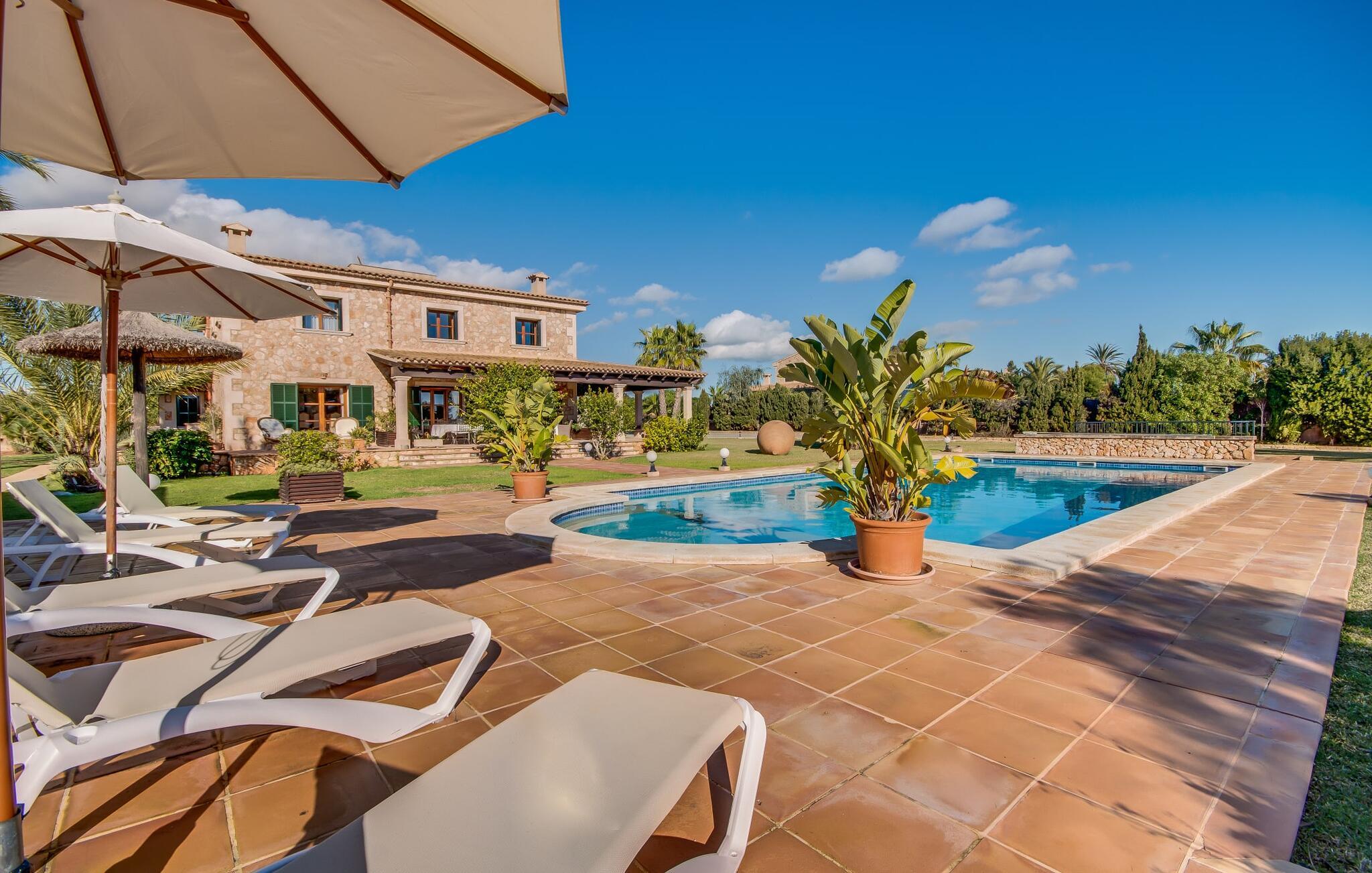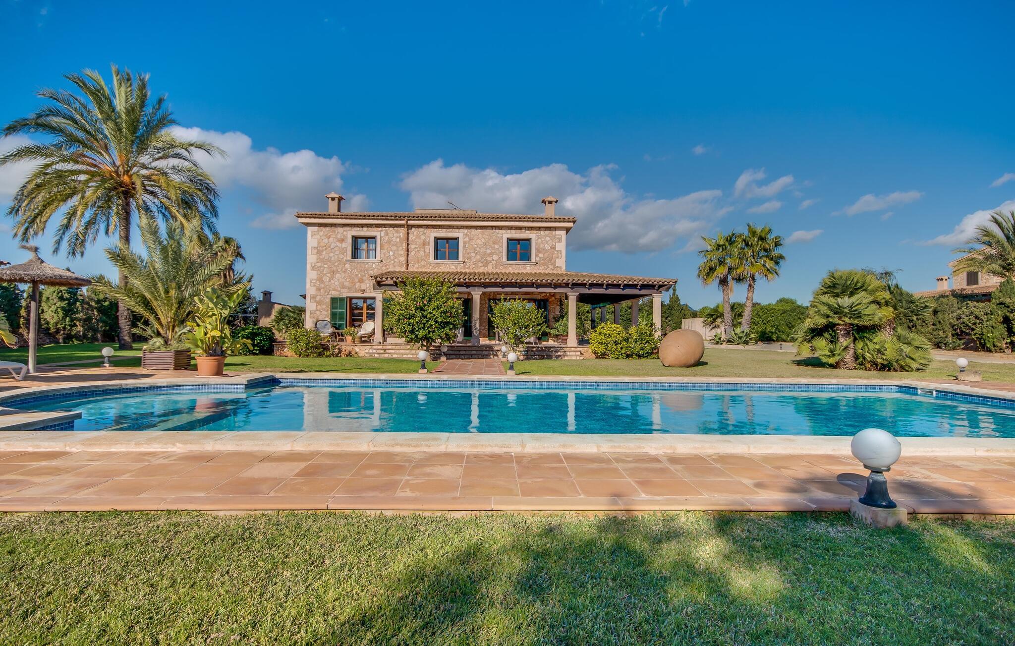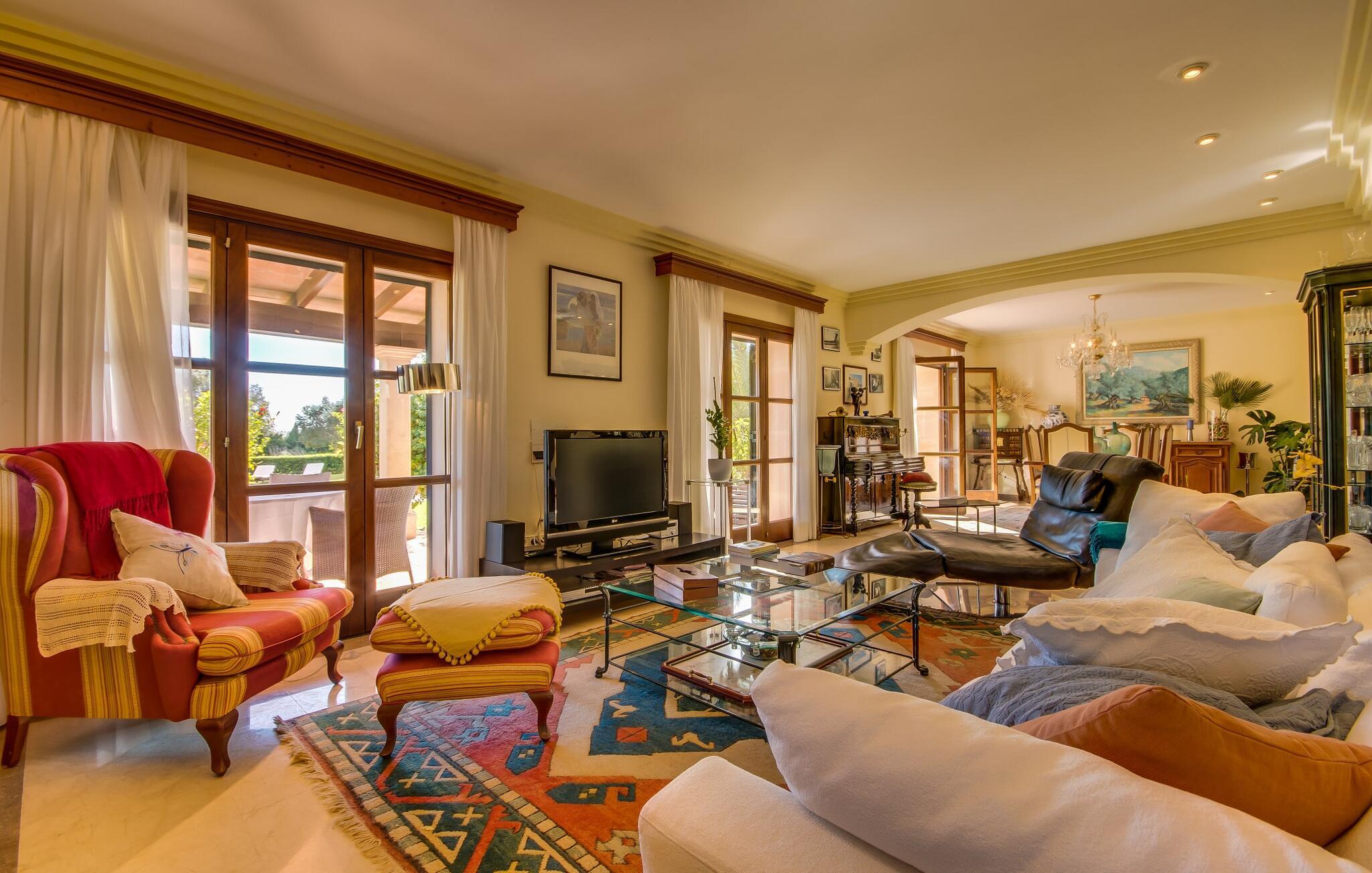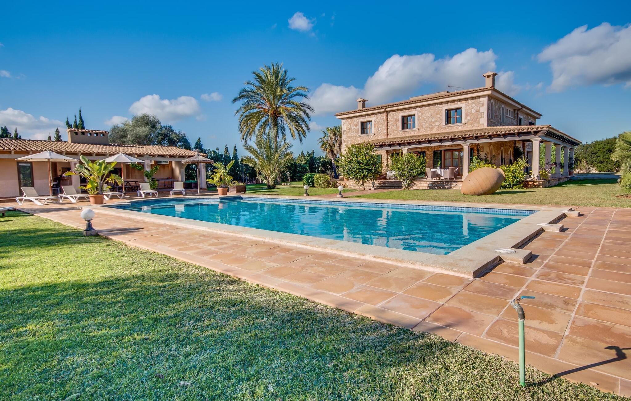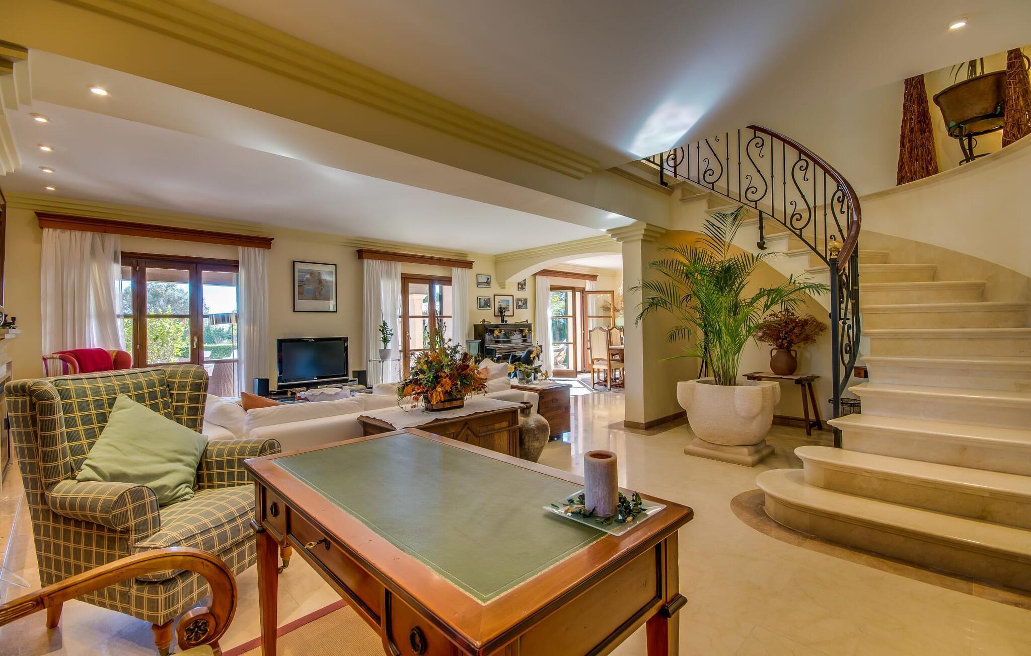 Når man ser på billederne af villaen “Mitjana” kan man ikke få nok: Stort land, palmer og cypresser mod en helårsgrøn baggrund, i det fjerne Middelhavet og midt i det hele ligger det smukke traditionelle stenbrudshus med hvide lister, trævinduer, grønne skodder og de lertagsten, der er typiske for regionen. "Mitjana" er et af de smukke, klassiske stykker af Mallora, som vi alle elsker så højt, og det er tæt på stranden. Proportionerne af komplekset er perfekt realiseret og lige ved siden af den storslåede hovedbygning med dens overdækkede terrasse og plads nok til en udendørs spiseplads er der en swimmingpool på næsten 80 m². Det meget praktiske udendørs badeværelse er integreret i udekøkkenets murstensstruktur lige ved siden af, som har to indbyggede BBQ-grill og en brændeovn. Der er en dejlig rustik atmosfære, hvor I kan afslutte dagen med at slappe af med venner og familie, mens I nyder en lækker BBQ. I kan købe friske, sprøde produkter på markedet i Felanitx eller Santanyí. Hvis I ikke laver andet, kan I hoppe i swimmingpoolen eller teste jeres færdigheder ved bordtennisbordet. Samlet set byder den omfattende have i maritim stil på mange muligheder for børn til at slippe damp og have det sjovt. Det er så enkelt som at lade dem gå. Indretningen af huset gør det ideelt for to familier af venner, der rejser sammen. I alt 350 m² boligareal er fordelt på to etager og er elegant designet og indrettet, som passer godt til husets traditionelle facade. I stueetagen, på den anden side af terrassen, er den udsøgte opholds- og spisestue med en behagelig sofa, hyggelig pejs, TV, bibliotek og klaver. Husets klassiske charme med stukafslutninger, moderne møbler af høj kvalitet, tæpper og lysekroner suppleres af integreret spotbelysning og særligt skinnende blankpolerede gulve. Det store, alsidige køkken i landlig stil med varme træskabe er meget moderne udstyret, herunder en opvaskemaskine og et amerikansk køleskab med ismaskine til kølige drikkevarer, men har også en gammeldags brændeovn. Det har også en ekstra spiseplads foran en gammel pejs. Der er også et toilet på denne etage, som er tilgængeligt for alle gæster. Det er meget rart, at alle soveværelser er på øverste etage. Dette omfatter to store soveværelser, der deler et separat opholdsområde og et tilstødende badeværelse. Yderligere tre badeværelser, hver med to enkeltsenge, deler et badeværelse med badekar - ideel til at bringe alle børn sammen, eller endda til venner eller bedsteforældre, der er med på turen. Alle værelser har aircondition og selvfølgelig opvarmet. I har sikkert allerede fundet billederne af badeværelset bag det store soveværelse, hvor I finder et boblebad og en bruser med massagedyser. Her venter jer virkelig himmelske oplevelser - og selvfølgelig er der meget mere at udforske og opdage uden for villaen. I kan opdage mangfoldigheden af de smukkeste Baleariske Øer, især langs den sydøstlige kyst. Udover hyggelige byer med let turisme, livlige promenader med gode restauranter og et par barer, er der også talrige strande, der er perfekte til en ferie ved vandet. Disse omfatter villaens navnebror, Cala Mitjana, men også Cala Sa Nau, Cala Petita, Cala Serena, Cala Ferrera og mange flere. Disse steder har alle imponerende fjordlignende bugter med klart vand. Den nærliggende landevej, som fører enten ind i landet eller til attraktive destinationer langs kysten, er delvist hørbar fra ejendommen, men kun når vinden er lige tilpas. Nærheden af denne motorvej betyder, at I kan nyde en landlig beliggenhed, der stadig giver nem adgang til en række ferieaktiviteter, som endda kan omfatte et besøg på den nærliggende Vall d'Or golfbane. Hvordan I slapper af og tager en pause fra hverdagens stress er op til jer - men vi hos Fincallorca gør vores bedste for at tilbyde jer det perfekte sted at gøre det, og i vores øjne er Villa “Mitjana” lige sagen. Den udsøgte naturstensvilla "Mitjana" med stor anlagt have, poolområde og rustikt udekøkken ligger kun få minutters gang fra badebugten af samme navn nær Cala D'Or. I denne charmerende lille by med sin enkle hvide arkitektur kan I shoppe eller gå en tur langs promenaden. For øens berømte markeder kan I tage til Santantyí eller længere inde i landet til Felanitx. Nyd et mangfoldigt udvalg af brede, fjordlignende badebugter, der nemt kan nås med jeres lejebil.