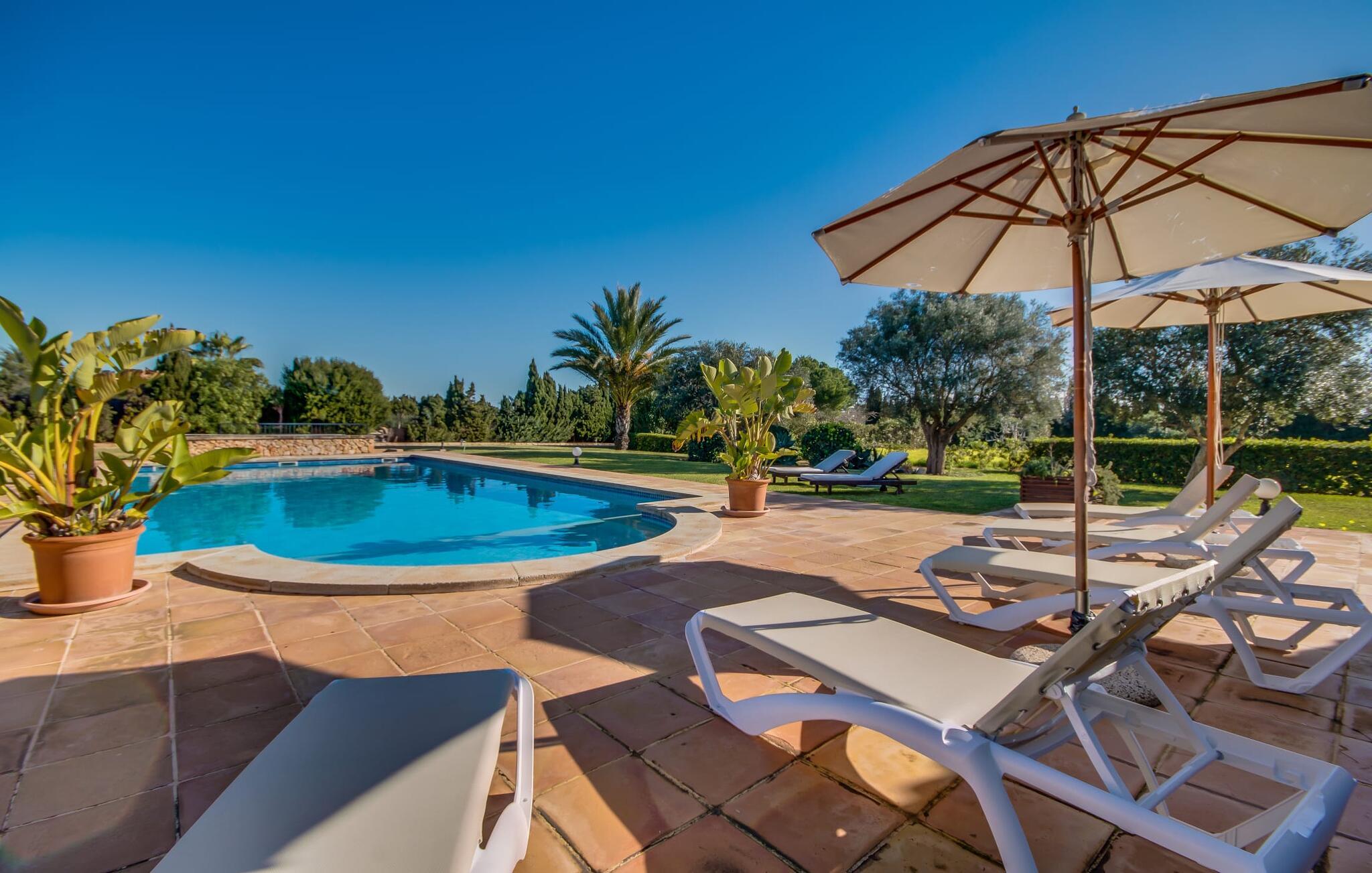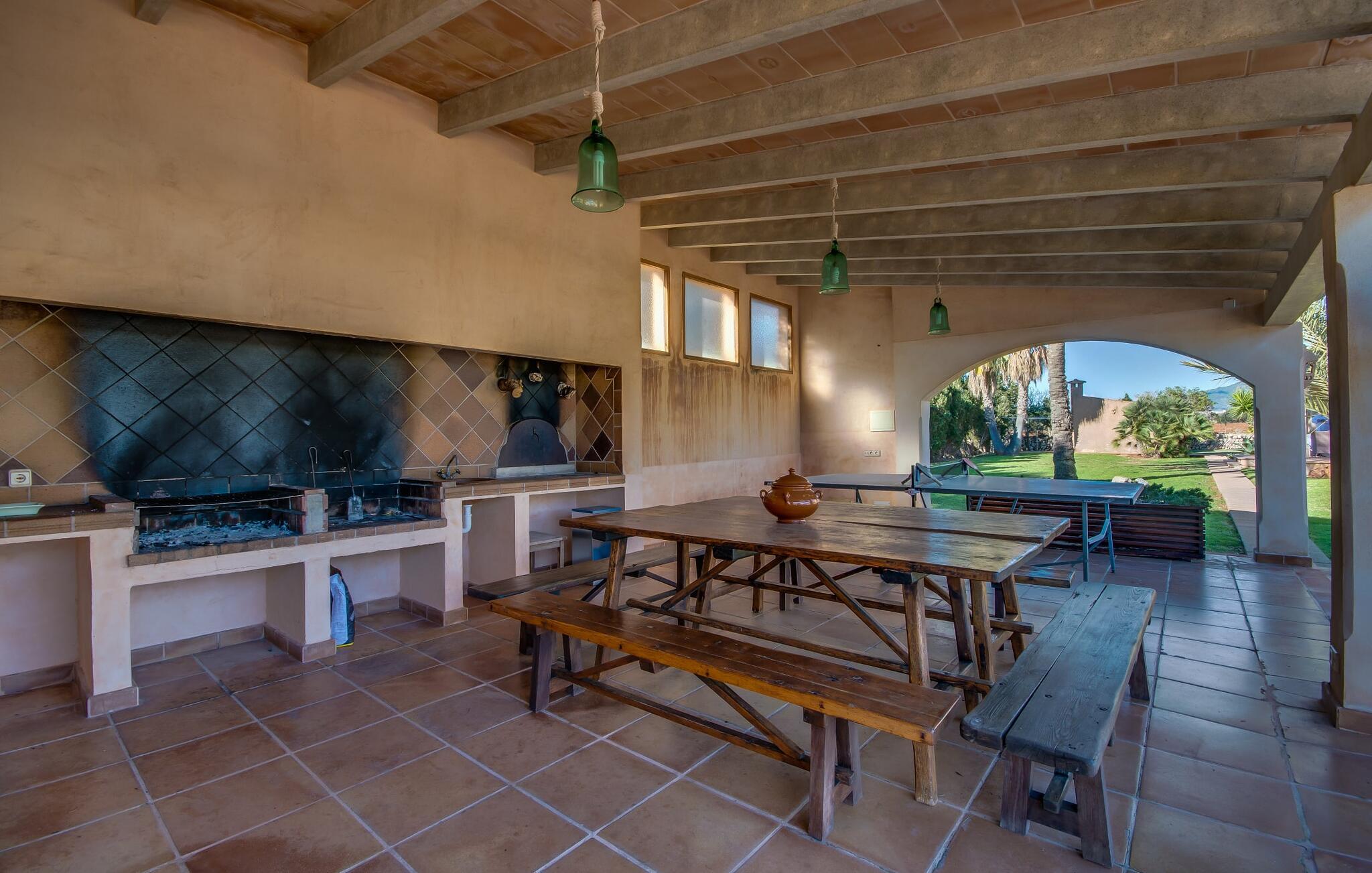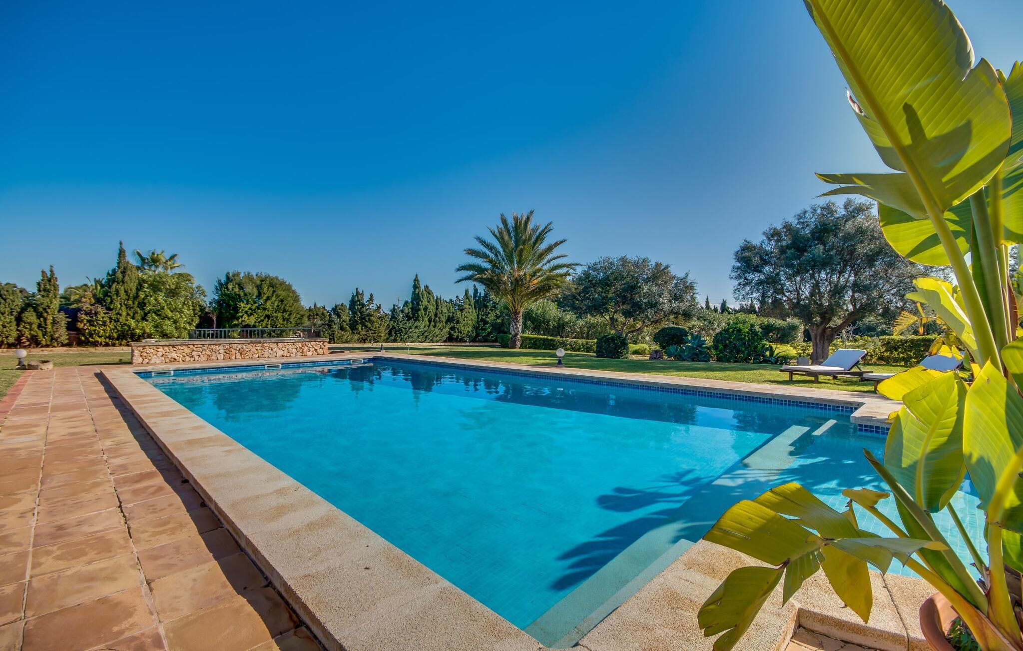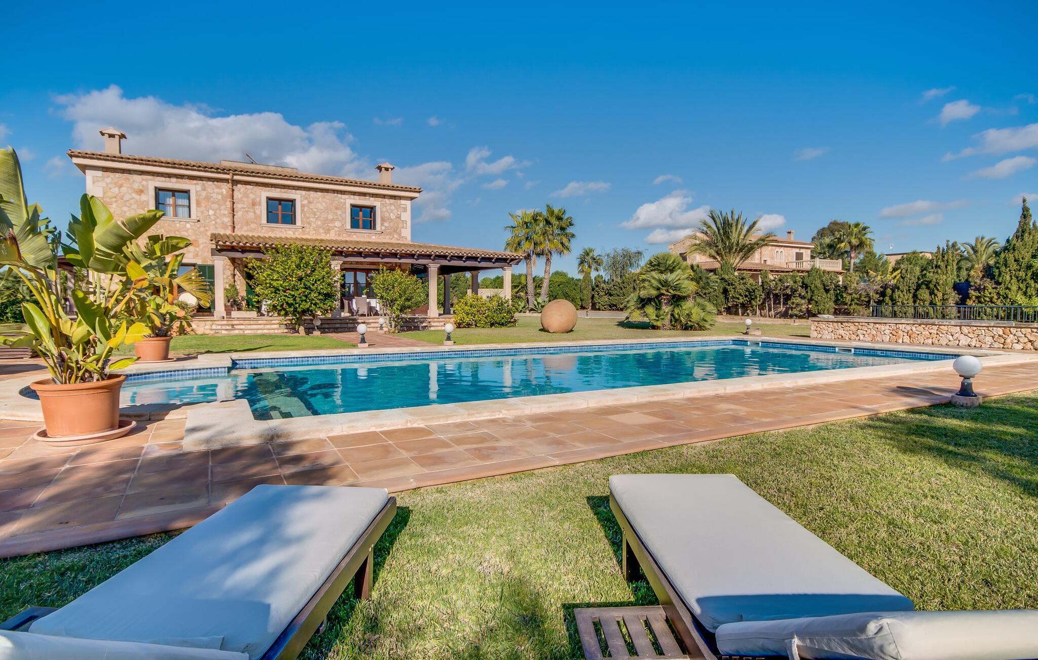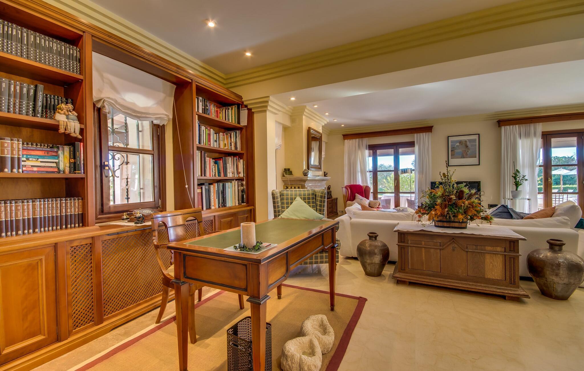 Når man ser på billederne af villaen “Mitjana” kan man ikke få nok: Stort land, palmer og cypresser mod en helårsgrøn baggrund, i det fjerne Middelhavet og midt i det hele ligger det smukke traditionelle stenbrudshus med hvide lister, trævinduer, grønne skodder og de lertagsten, der er typiske for regionen. "Mitjana" er et af de smukke, klassiske stykker af Mallora, som vi alle elsker så højt, og det er tæt på stranden. Proportionerne af komplekset er perfekt realiseret og lige ved siden af den storslåede hovedbygning med dens overdækkede terrasse og plads nok til en udendørs spiseplads er der en swimmingpool på næsten 80 m². Det meget praktiske udendørs badeværelse er integreret i udekøkkenets murstensstruktur lige ved siden af, som har to indbyggede BBQ-grill og en brændeovn. Der er en dejlig rustik atmosfære, hvor I kan afslutte dagen med at slappe af med venner og familie, mens I nyder en lækker BBQ. I kan købe friske, sprøde produkter på markedet i Felanitx eller Santanyí. Hvis I ikke laver andet, kan I hoppe i swimmingpoolen eller teste jeres færdigheder ved bordtennisbordet. Samlet set byder den omfattende have i maritim stil på mange muligheder for børn til at slippe damp og have det sjovt. Det er så enkelt som at lade dem gå. Indretningen af huset gør det ideelt for to familier af venner, der rejser sammen. I alt 350 m² boligareal er fordelt på to etager og er elegant designet og indrettet, som passer godt til husets traditionelle facade. I stueetagen, på den anden side af terrassen, er den udsøgte opholds- og spisestue med en behagelig sofa, hyggelig pejs, TV, bibliotek og klaver. Husets klassiske charme med stukafslutninger, moderne møbler af høj kvalitet, tæpper og lysekroner suppleres af integreret spotbelysning og særligt skinnende blankpolerede gulve. Det store, alsidige køkken i landlig stil med varme træskabe er meget moderne udstyret, herunder en opvaskemaskine og et amerikansk køleskab med ismaskine til kølige drikkevarer, men har også en gammeldags brændeovn. Det har også en ekstra spiseplads foran en gammel pejs. Der er også et toilet på denne etage, som er tilgængeligt for alle gæster. Det er meget rart, at alle soveværelser er på øverste etage. Dette omfatter to store soveværelser, der deler et separat opholdsområde og et tilstødende badeværelse. Yderligere tre badeværelser, hver med to enkeltsenge, deler et badeværelse med badekar - ideel til at bringe alle børn sammen, eller endda til venner eller bedsteforældre, der er med på turen. Alle værelser har aircondition og selvfølgelig opvarmet. I har sikkert allerede fundet billederne af badeværelset bag det store soveværelse, hvor I finder et boblebad og en bruser med massagedyser. Her venter jer virkelig himmelske oplevelser - og selvfølgelig er der meget mere at udforske og opdage uden for villaen. I kan opdage mangfoldigheden af de smukkeste Baleariske Øer, især langs den sydøstlige kyst. Udover hyggelige byer med let turisme, livlige promenader med gode restauranter og et par barer, er der også talrige strande, der er perfekte til en ferie ved vandet. Disse omfatter villaens navnebror, Cala Mitjana, men også Cala Sa Nau, Cala Petita, Cala Serena, Cala Ferrera og mange flere. Disse steder har alle imponerende fjordlignende bugter med klart vand. Den nærliggende landevej, som fører enten ind i landet eller til attraktive destinationer langs kysten, er delvist hørbar fra ejendommen, men kun når vinden er lige tilpas. Nærheden af denne motorvej betyder, at I kan nyde en landlig beliggenhed, der stadig giver nem adgang til en række ferieaktiviteter, som endda kan omfatte et besøg på den nærliggende Vall d'Or golfbane. Hvordan I slapper af og tager en pause fra hverdagens stress er op til jer - men vi hos Fincallorca gør vores bedste for at tilbyde jer det perfekte sted at gøre det, og i vores øjne er Villa “Mitjana” lige sagen. Den udsøgte naturstensvilla "Mitjana" med stor anlagt have, poolområde og rustikt udekøkken ligger kun få minutters gang fra badebugten af samme navn nær Cala D'Or. I denne charmerende lille by med sin enkle hvide arkitektur kan I shoppe eller gå en tur langs promenaden. For øens berømte markeder kan I tage til Santantyí eller længere inde i landet til Felanitx. Nyd et mangfoldigt udvalg af brede, fjordlignende badebugter, der nemt kan nås med jeres lejebil.