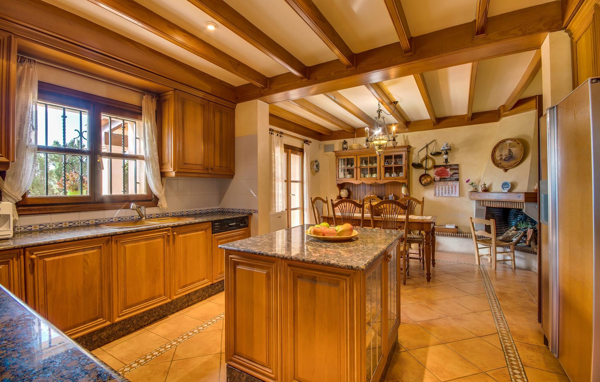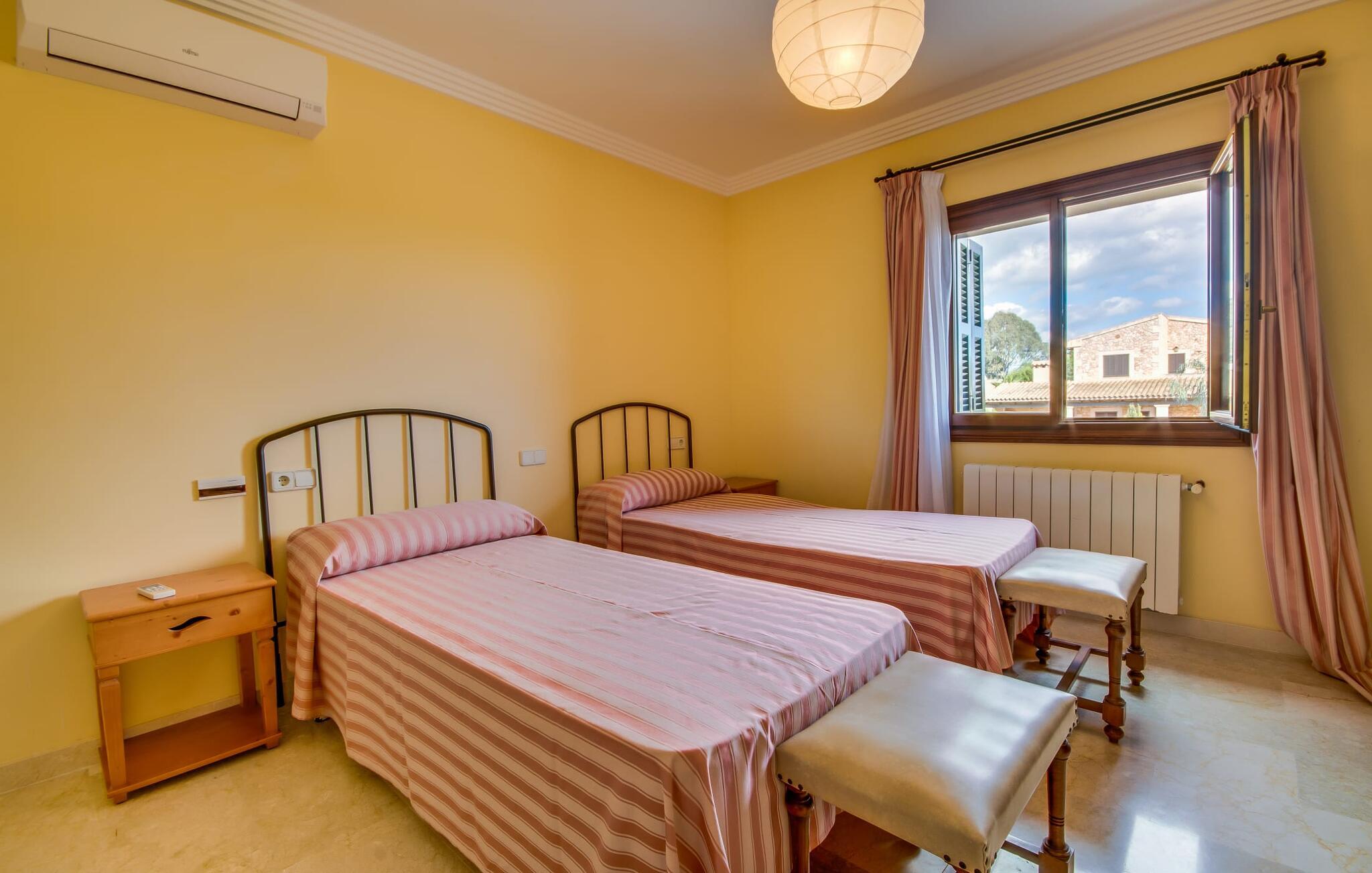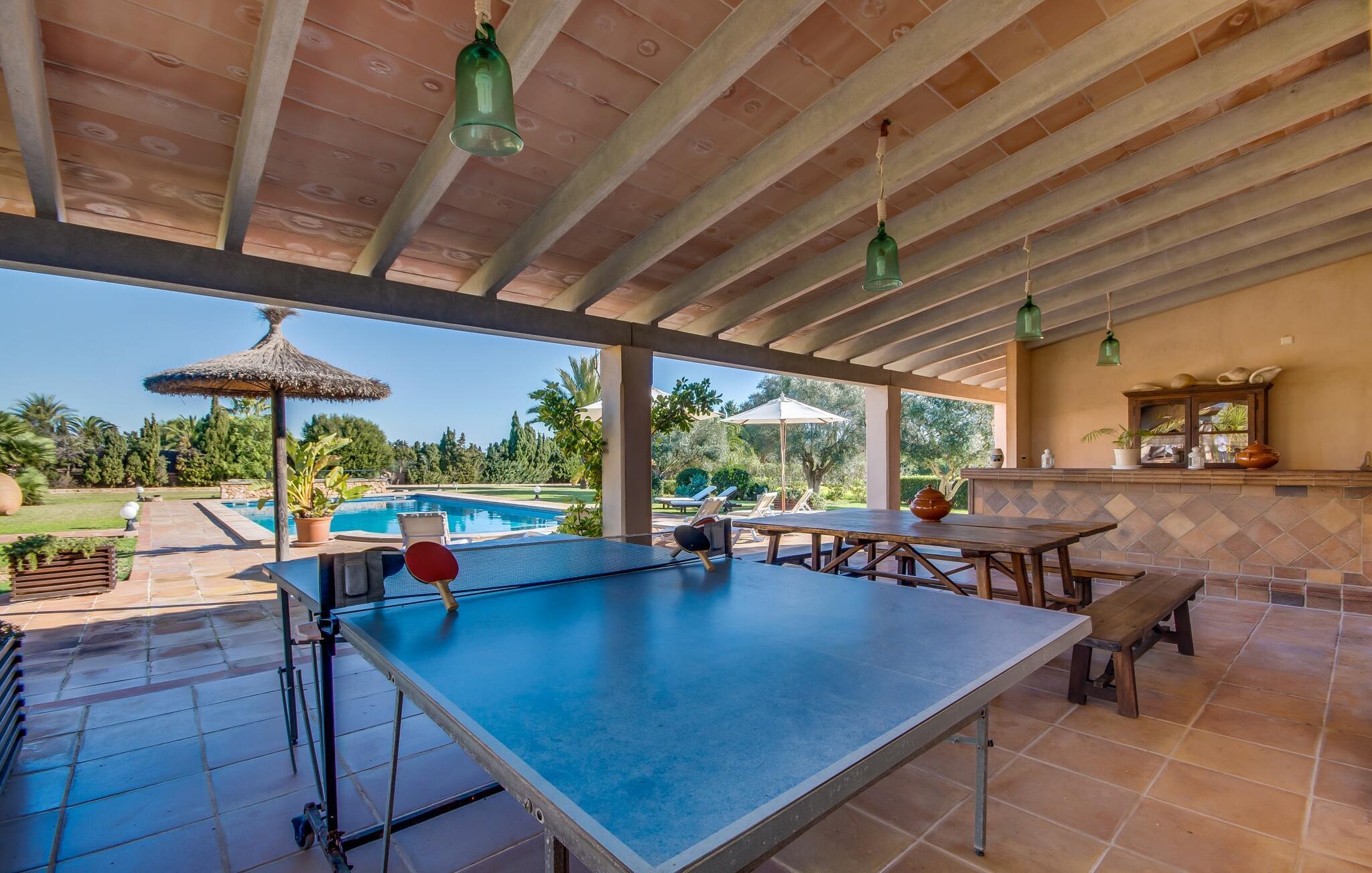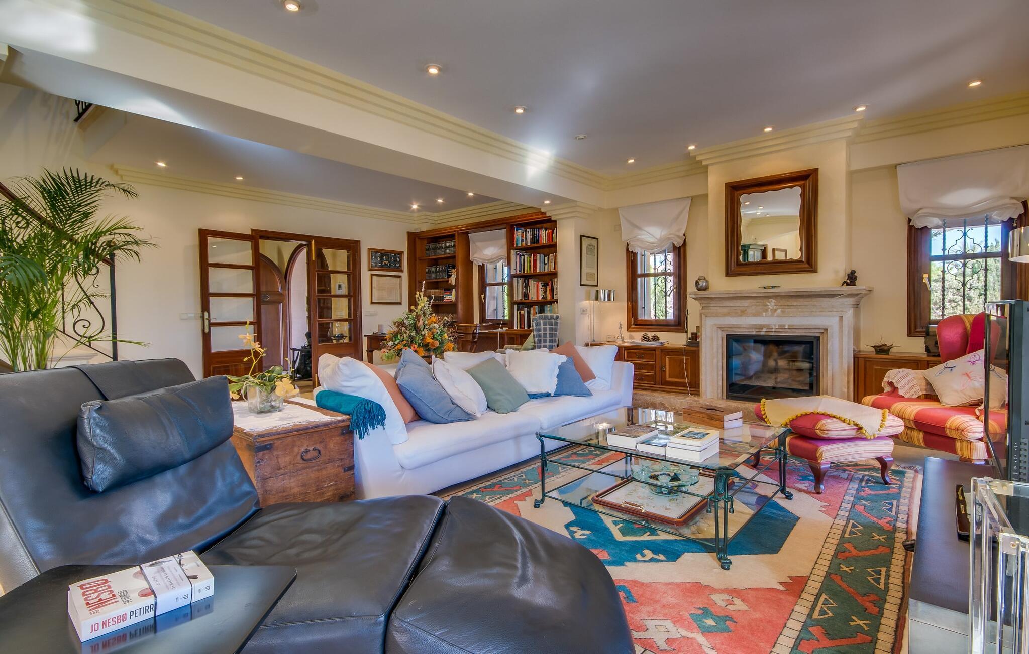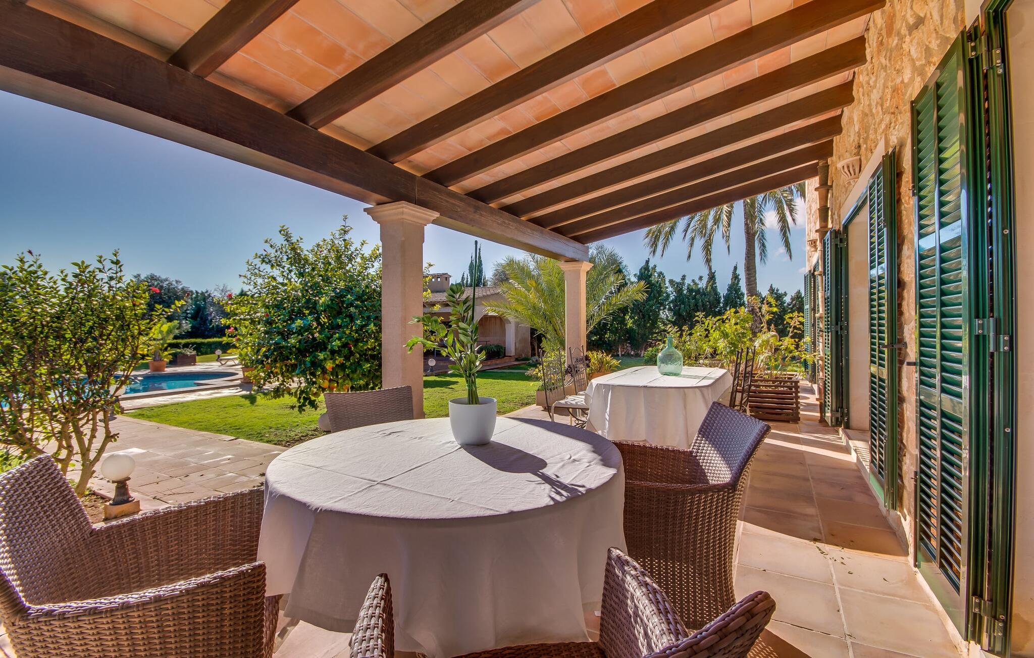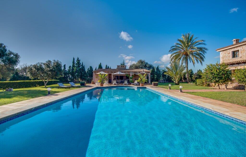 Når man ser på billederne af villaen “Mitjana” kan man ikke få nok: Stort land, palmer og cypresser mod en helårsgrøn baggrund, i det fjerne Middelhavet og midt i det hele ligger det smukke traditionelle stenbrudshus med hvide lister, trævinduer, grønne skodder og de lertagsten, der er typiske for regionen. "Mitjana" er et af de smukke, klassiske stykker af Mallora, som vi alle elsker så højt, og det er tæt på stranden. Proportionerne af komplekset er perfekt realiseret og lige ved siden af den storslåede hovedbygning med dens overdækkede terrasse og plads nok til en udendørs spiseplads er der en swimmingpool på næsten 80 m². Det meget praktiske udendørs badeværelse er integreret i udekøkkenets murstensstruktur lige ved siden af, som har to indbyggede BBQ-grill og en brændeovn. Der er en dejlig rustik atmosfære, hvor I kan afslutte dagen med at slappe af med venner og familie, mens I nyder en lækker BBQ. I kan købe friske, sprøde produkter på markedet i Felanitx eller Santanyí. Hvis I ikke laver andet, kan I hoppe i swimmingpoolen eller teste jeres færdigheder ved bordtennisbordet. Samlet set byder den omfattende have i maritim stil på mange muligheder for børn til at slippe damp og have det sjovt. Det er så enkelt som at lade dem gå. Indretningen af huset gør det ideelt for to familier af venner, der rejser sammen. I alt 350 m² boligareal er fordelt på to etager og er elegant designet og indrettet, som passer godt til husets traditionelle facade. I stueetagen, på den anden side af terrassen, er den udsøgte opholds- og spisestue med en behagelig sofa, hyggelig pejs, TV, bibliotek og klaver. Husets klassiske charme med stukafslutninger, moderne møbler af høj kvalitet, tæpper og lysekroner suppleres af integreret spotbelysning og særligt skinnende blankpolerede gulve. Det store, alsidige køkken i landlig stil med varme træskabe er meget moderne udstyret, herunder en opvaskemaskine og et amerikansk køleskab med ismaskine til kølige drikkevarer, men har også en gammeldags brændeovn. Det har også en ekstra spiseplads foran en gammel pejs. Der er også et toilet på denne etage, som er tilgængeligt for alle gæster. Det er meget rart, at alle soveværelser er på øverste etage. Dette omfatter to store soveværelser, der deler et separat opholdsområde og et tilstødende badeværelse. Yderligere tre badeværelser, hver med to enkeltsenge, deler et badeværelse med badekar - ideel til at bringe alle børn sammen, eller endda til venner eller bedsteforældre, der er med på turen. Alle værelser har aircondition og selvfølgelig opvarmet. I har sikkert allerede fundet billederne af badeværelset bag det store soveværelse, hvor I finder et boblebad og en bruser med massagedyser. Her venter jer virkelig himmelske oplevelser - og selvfølgelig er der meget mere at udforske og opdage uden for villaen. I kan opdage mangfoldigheden af de smukkeste Baleariske Øer, især langs den sydøstlige kyst. Udover hyggelige byer med let turisme, livlige promenader med gode restauranter og et par barer, er der også talrige strande, der er perfekte til en ferie ved vandet. Disse omfatter villaens navnebror, Cala Mitjana, men også Cala Sa Nau, Cala Petita, Cala Serena, Cala Ferrera og mange flere. Disse steder har alle imponerende fjordlignende bugter med klart vand. Den nærliggende landevej, som fører enten ind i landet eller til attraktive destinationer langs kysten, er delvist hørbar fra ejendommen, men kun når vinden er lige tilpas. Nærheden af denne motorvej betyder, at I kan nyde en landlig beliggenhed, der stadig giver nem adgang til en række ferieaktiviteter, som endda kan omfatte et besøg på den nærliggende Vall d'Or golfbane. Hvordan I slapper af og tager en pause fra hverdagens stress er op til jer - men vi hos Fincallorca gør vores bedste for at tilbyde jer det perfekte sted at gøre det, og i vores øjne er Villa “Mitjana” lige sagen. Den udsøgte naturstensvilla "Mitjana" med stor anlagt have, poolområde og rustikt udekøkken ligger kun få minutters gang fra badebugten af samme navn nær Cala D'Or. I denne charmerende lille by med sin enkle hvide arkitektur kan I shoppe eller gå en tur langs promenaden. For øens berømte markeder kan I tage til Santantyí eller længere inde i landet til Felanitx. Nyd et mangfoldigt udvalg af brede, fjordlignende badebugter, der nemt kan nås med jeres lejebil.