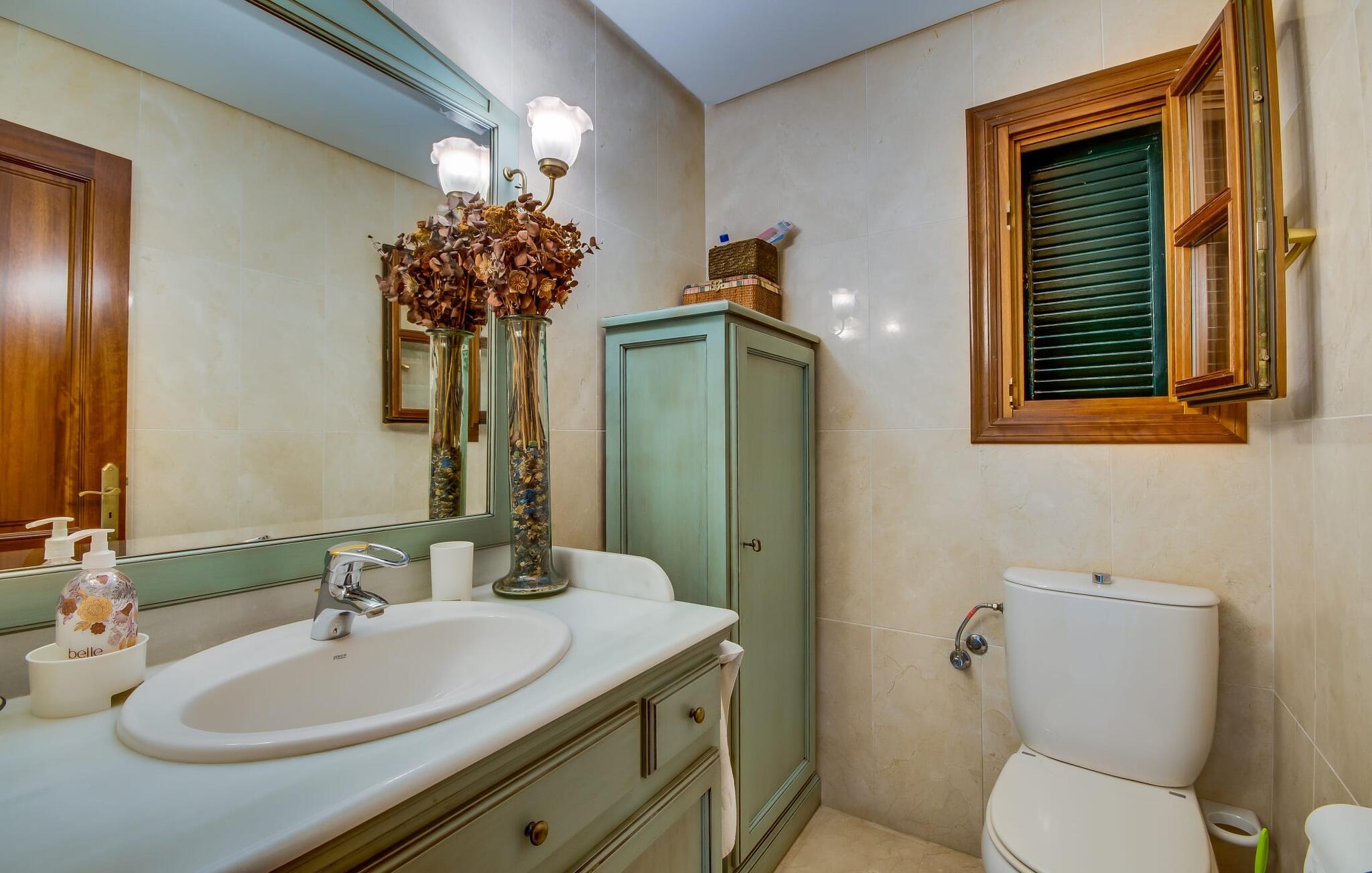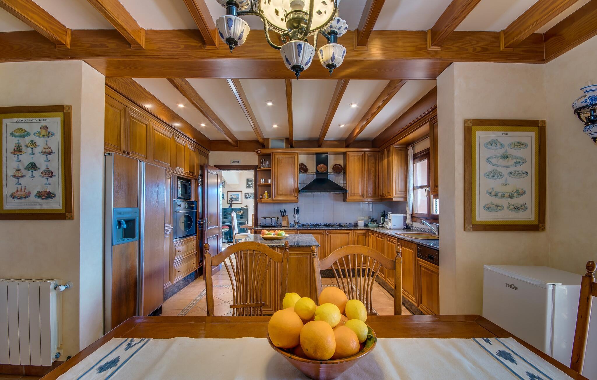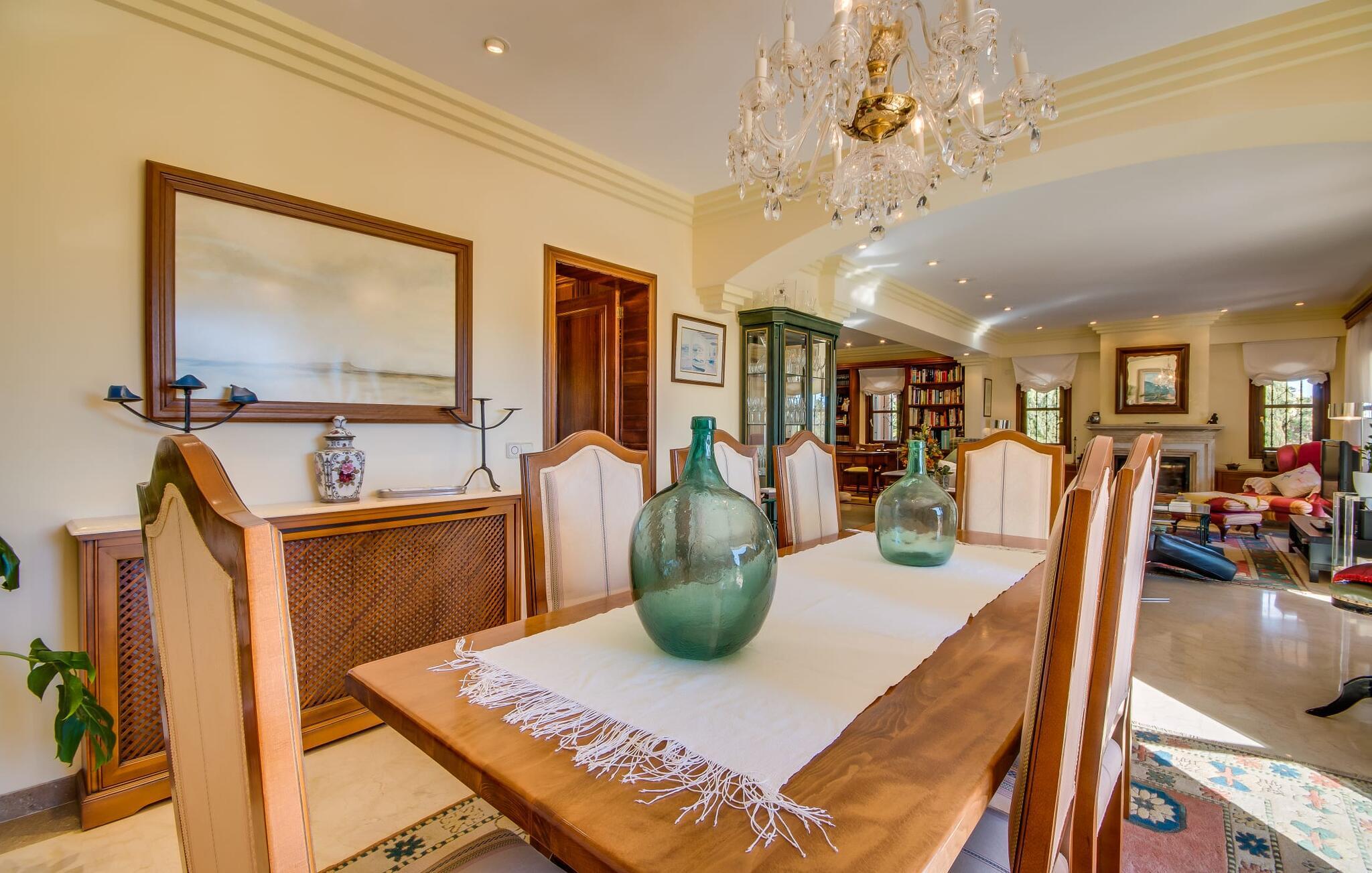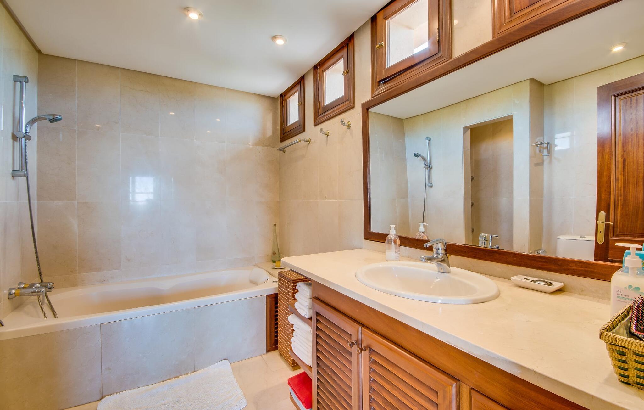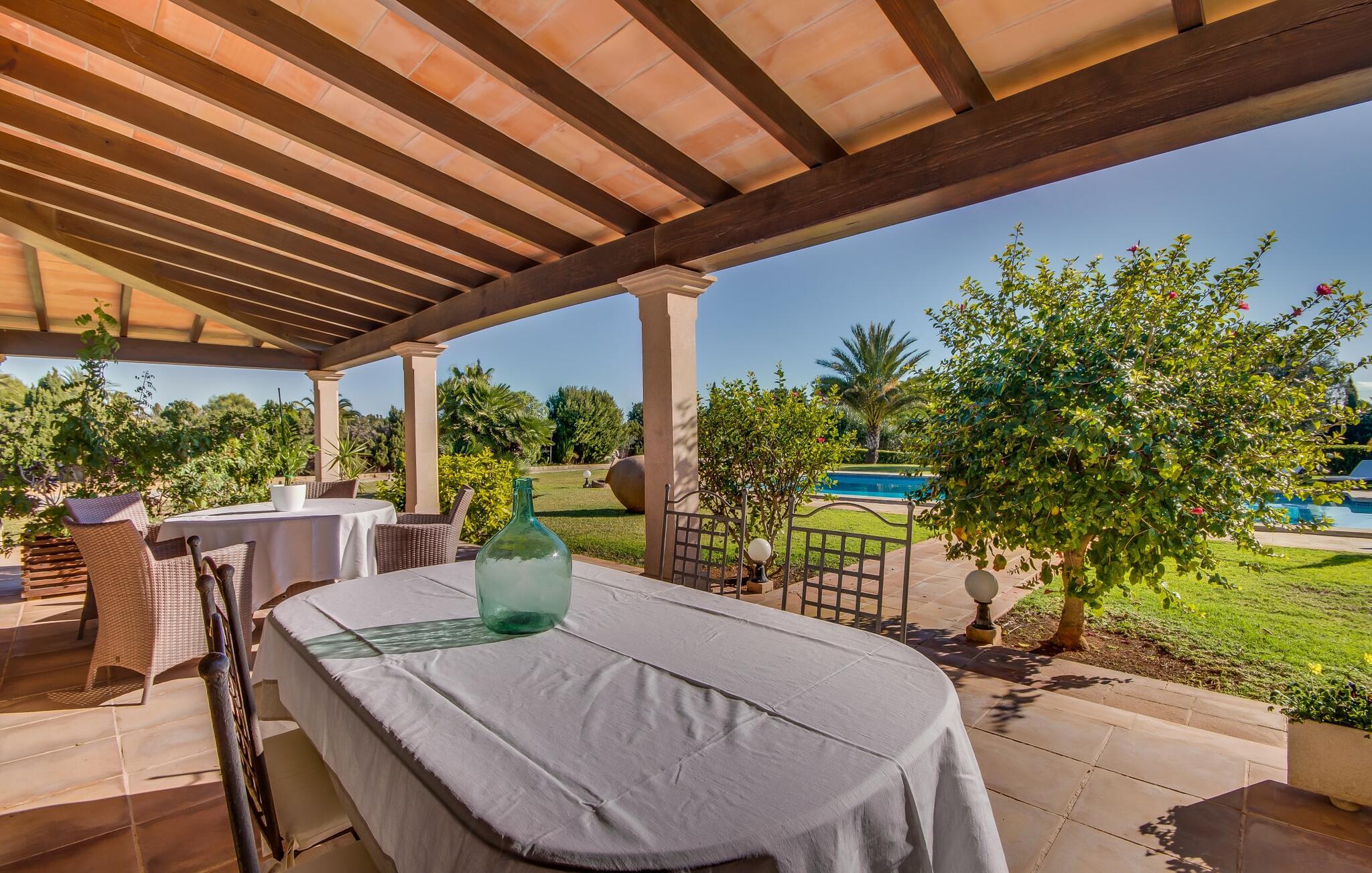 Når man ser på billederne af villaen “Mitjana” kan man ikke få nok: Stort land, palmer og cypresser mod en helårsgrøn baggrund, i det fjerne Middelhavet og midt i det hele ligger det smukke traditionelle stenbrudshus med hvide lister, trævinduer, grønne skodder og de lertagsten, der er typiske for regionen. "Mitjana" er et af de smukke, klassiske stykker af Mallora, som vi alle elsker så højt, og det er tæt på stranden. Proportionerne af komplekset er perfekt realiseret og lige ved siden af den storslåede hovedbygning med dens overdækkede terrasse og plads nok til en udendørs spiseplads er der en swimmingpool på næsten 80 m². Det meget praktiske udendørs badeværelse er integreret i udekøkkenets murstensstruktur lige ved siden af, som har to indbyggede BBQ-grill og en brændeovn. Der er en dejlig rustik atmosfære, hvor I kan afslutte dagen med at slappe af med venner og familie, mens I nyder en lækker BBQ. I kan købe friske, sprøde produkter på markedet i Felanitx eller Santanyí. Hvis I ikke laver andet, kan I hoppe i swimmingpoolen eller teste jeres færdigheder ved bordtennisbordet. Samlet set byder den omfattende have i maritim stil på mange muligheder for børn til at slippe damp og have det sjovt. Det er så enkelt som at lade dem gå. Indretningen af huset gør det ideelt for to familier af venner, der rejser sammen. I alt 350 m² boligareal er fordelt på to etager og er elegant designet og indrettet, som passer godt til husets traditionelle facade. I stueetagen, på den anden side af terrassen, er den udsøgte opholds- og spisestue med en behagelig sofa, hyggelig pejs, TV, bibliotek og klaver. Husets klassiske charme med stukafslutninger, moderne møbler af høj kvalitet, tæpper og lysekroner suppleres af integreret spotbelysning og særligt skinnende blankpolerede gulve. Det store, alsidige køkken i landlig stil med varme træskabe er meget moderne udstyret, herunder en opvaskemaskine og et amerikansk køleskab med ismaskine til kølige drikkevarer, men har også en gammeldags brændeovn. Det har også en ekstra spiseplads foran en gammel pejs. Der er også et toilet på denne etage, som er tilgængeligt for alle gæster. Det er meget rart, at alle soveværelser er på øverste etage. Dette omfatter to store soveværelser, der deler et separat opholdsområde og et tilstødende badeværelse. Yderligere tre badeværelser, hver med to enkeltsenge, deler et badeværelse med badekar - ideel til at bringe alle børn sammen, eller endda til venner eller bedsteforældre, der er med på turen. Alle værelser har aircondition og selvfølgelig opvarmet. I har sikkert allerede fundet billederne af badeværelset bag det store soveværelse, hvor I finder et boblebad og en bruser med massagedyser. Her venter jer virkelig himmelske oplevelser - og selvfølgelig er der meget mere at udforske og opdage uden for villaen. I kan opdage mangfoldigheden af de smukkeste Baleariske Øer, især langs den sydøstlige kyst. Udover hyggelige byer med let turisme, livlige promenader med gode restauranter og et par barer, er der også talrige strande, der er perfekte til en ferie ved vandet. Disse omfatter villaens navnebror, Cala Mitjana, men også Cala Sa Nau, Cala Petita, Cala Serena, Cala Ferrera og mange flere. Disse steder har alle imponerende fjordlignende bugter med klart vand. Den nærliggende landevej, som fører enten ind i landet eller til attraktive destinationer langs kysten, er delvist hørbar fra ejendommen, men kun når vinden er lige tilpas. Nærheden af denne motorvej betyder, at I kan nyde en landlig beliggenhed, der stadig giver nem adgang til en række ferieaktiviteter, som endda kan omfatte et besøg på den nærliggende Vall d'Or golfbane. Hvordan I slapper af og tager en pause fra hverdagens stress er op til jer - men vi hos Fincallorca gør vores bedste for at tilbyde jer det perfekte sted at gøre det, og i vores øjne er Villa “Mitjana” lige sagen. Den udsøgte naturstensvilla "Mitjana" med stor anlagt have, poolområde og rustikt udekøkken ligger kun få minutters gang fra badebugten af samme navn nær Cala D'Or. I denne charmerende lille by med sin enkle hvide arkitektur kan I shoppe eller gå en tur langs promenaden. For øens berømte markeder kan I tage til Santantyí eller længere inde i landet til Felanitx. Nyd et mangfoldigt udvalg af brede, fjordlignende badebugter, der nemt kan nås med jeres lejebil.