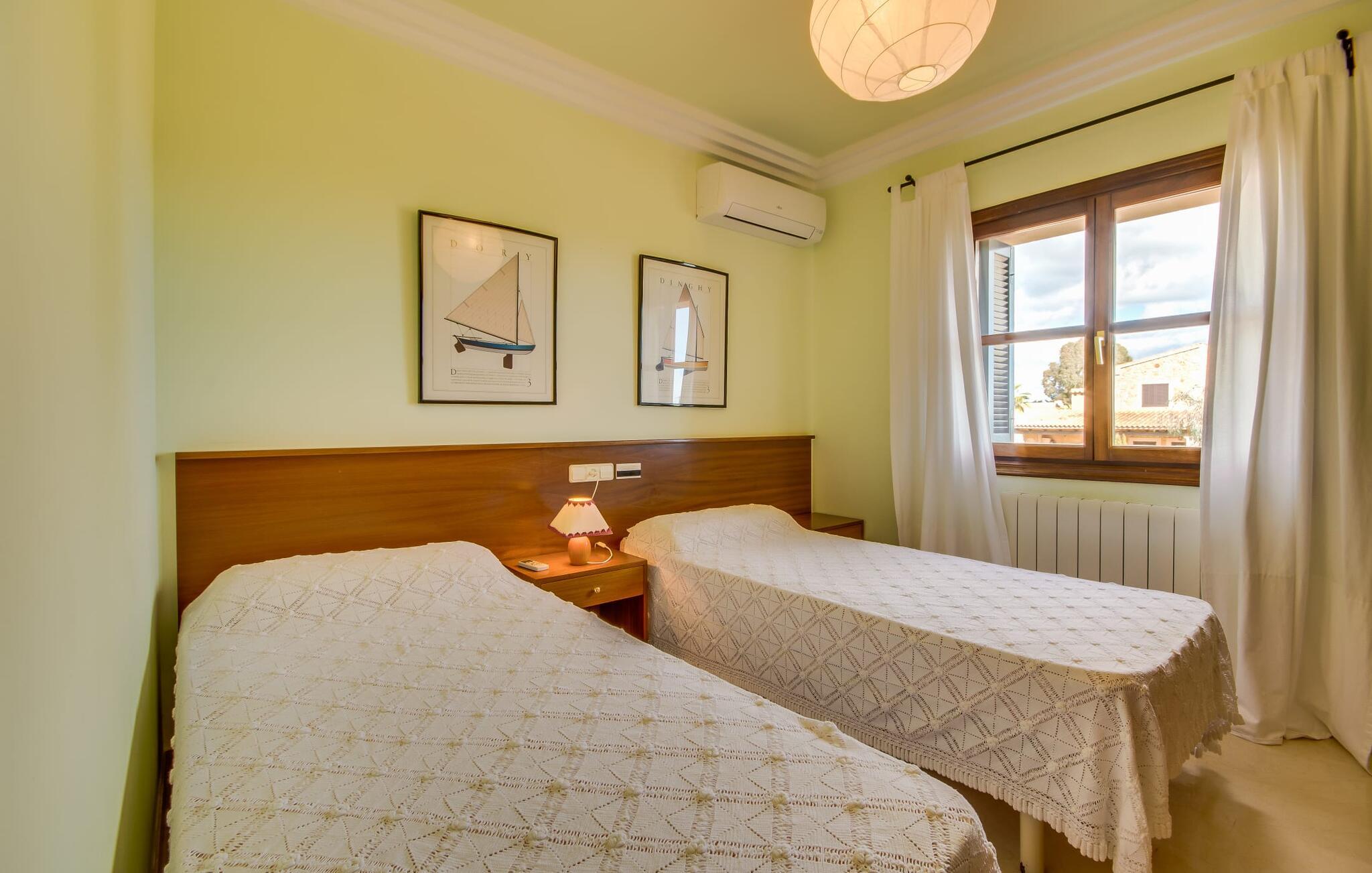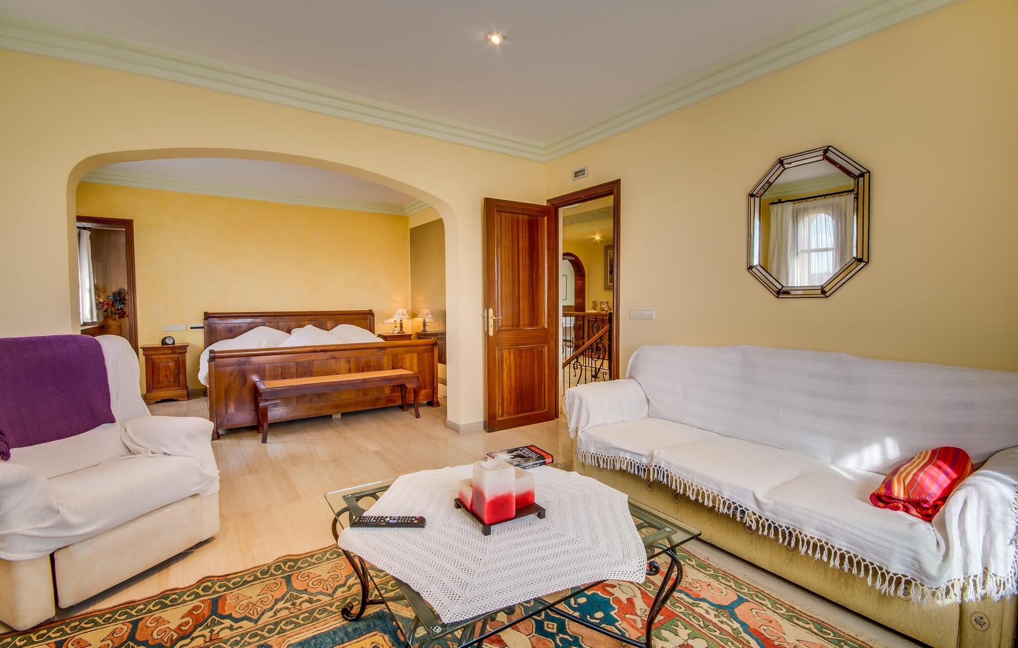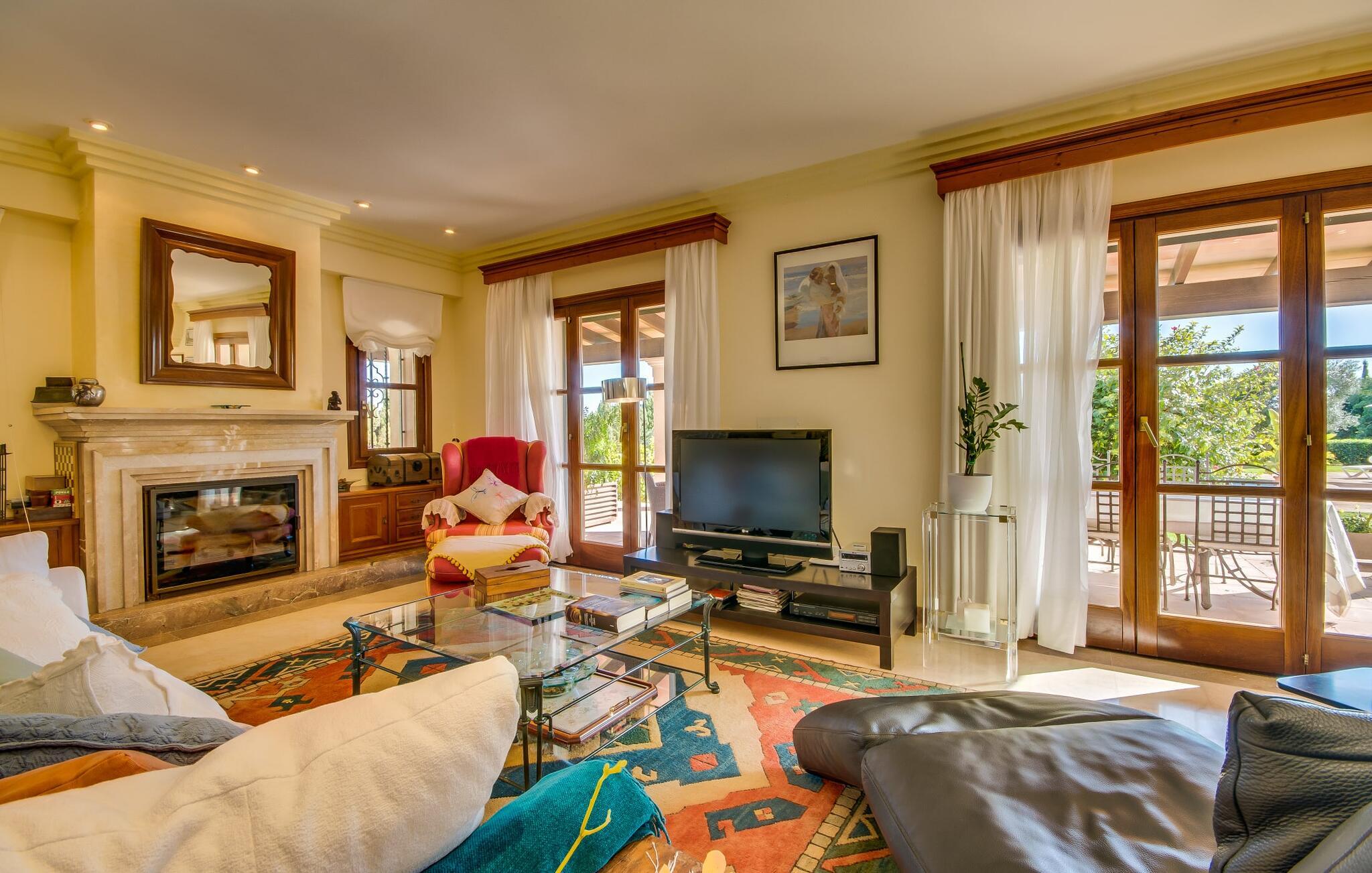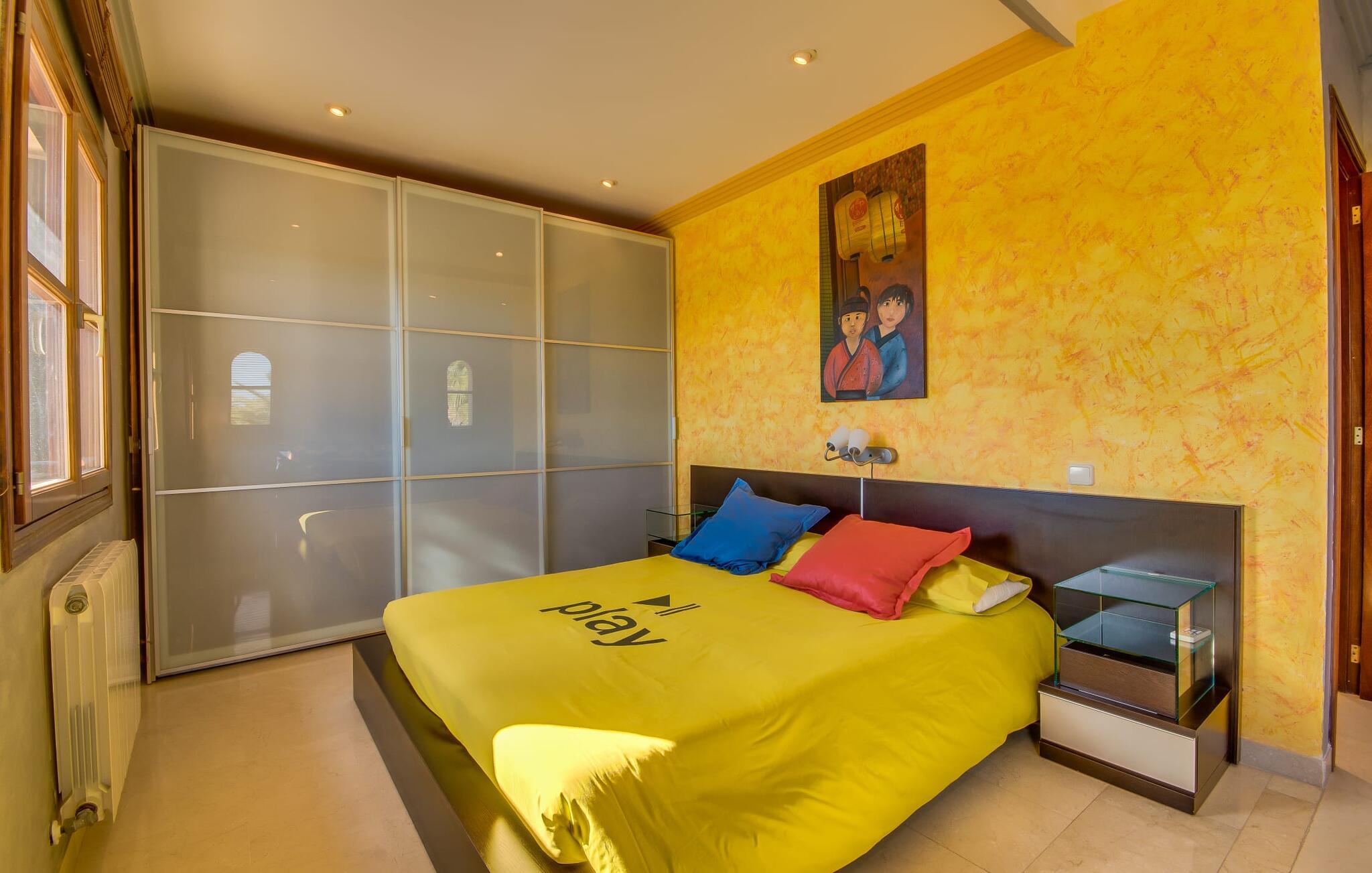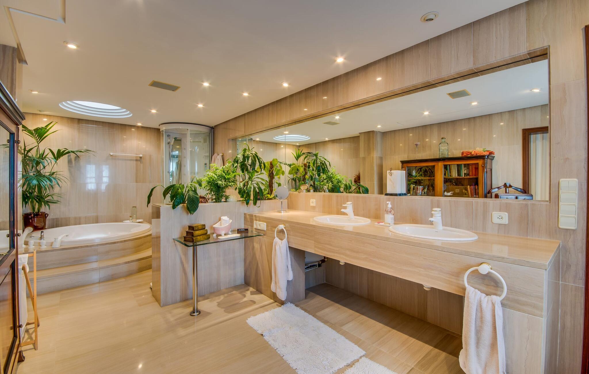 Når man ser på billederne af villaen “Mitjana” kan man ikke få nok: Stort land, palmer og cypresser mod en helårsgrøn baggrund, i det fjerne Middelhavet og midt i det hele ligger det smukke traditionelle stenbrudshus med hvide lister, trævinduer, grønne skodder og de lertagsten, der er typiske for regionen. "Mitjana" er et af de smukke, klassiske stykker af Mallora, som vi alle elsker så højt, og det er tæt på stranden. Proportionerne af komplekset er perfekt realiseret og lige ved siden af den storslåede hovedbygning med dens overdækkede terrasse og plads nok til en udendørs spiseplads er der en swimmingpool på næsten 80 m². Det meget praktiske udendørs badeværelse er integreret i udekøkkenets murstensstruktur lige ved siden af, som har to indbyggede BBQ-grill og en brændeovn. Der er en dejlig rustik atmosfære, hvor I kan afslutte dagen med at slappe af med venner og familie, mens I nyder en lækker BBQ. I kan købe friske, sprøde produkter på markedet i Felanitx eller Santanyí. Hvis I ikke laver andet, kan I hoppe i swimmingpoolen eller teste jeres færdigheder ved bordtennisbordet. Samlet set byder den omfattende have i maritim stil på mange muligheder for børn til at slippe damp og have det sjovt. Det er så enkelt som at lade dem gå. Indretningen af huset gør det ideelt for to familier af venner, der rejser sammen. I alt 350 m² boligareal er fordelt på to etager og er elegant designet og indrettet, som passer godt til husets traditionelle facade. I stueetagen, på den anden side af terrassen, er den udsøgte opholds- og spisestue med en behagelig sofa, hyggelig pejs, TV, bibliotek og klaver. Husets klassiske charme med stukafslutninger, moderne møbler af høj kvalitet, tæpper og lysekroner suppleres af integreret spotbelysning og særligt skinnende blankpolerede gulve. Det store, alsidige køkken i landlig stil med varme træskabe er meget moderne udstyret, herunder en opvaskemaskine og et amerikansk køleskab med ismaskine til kølige drikkevarer, men har også en gammeldags brændeovn. Det har også en ekstra spiseplads foran en gammel pejs. Der er også et toilet på denne etage, som er tilgængeligt for alle gæster. Det er meget rart, at alle soveværelser er på øverste etage. Dette omfatter to store soveværelser, der deler et separat opholdsområde og et tilstødende badeværelse. Yderligere tre badeværelser, hver med to enkeltsenge, deler et badeværelse med badekar - ideel til at bringe alle børn sammen, eller endda til venner eller bedsteforældre, der er med på turen. Alle værelser har aircondition og selvfølgelig opvarmet. I har sikkert allerede fundet billederne af badeværelset bag det store soveværelse, hvor I finder et boblebad og en bruser med massagedyser. Her venter jer virkelig himmelske oplevelser - og selvfølgelig er der meget mere at udforske og opdage uden for villaen. I kan opdage mangfoldigheden af de smukkeste Baleariske Øer, især langs den sydøstlige kyst. Udover hyggelige byer med let turisme, livlige promenader med gode restauranter og et par barer, er der også talrige strande, der er perfekte til en ferie ved vandet. Disse omfatter villaens navnebror, Cala Mitjana, men også Cala Sa Nau, Cala Petita, Cala Serena, Cala Ferrera og mange flere. Disse steder har alle imponerende fjordlignende bugter med klart vand. Den nærliggende landevej, som fører enten ind i landet eller til attraktive destinationer langs kysten, er delvist hørbar fra ejendommen, men kun når vinden er lige tilpas. Nærheden af denne motorvej betyder, at I kan nyde en landlig beliggenhed, der stadig giver nem adgang til en række ferieaktiviteter, som endda kan omfatte et besøg på den nærliggende Vall d'Or golfbane. Hvordan I slapper af og tager en pause fra hverdagens stress er op til jer - men vi hos Fincallorca gør vores bedste for at tilbyde jer det perfekte sted at gøre det, og i vores øjne er Villa “Mitjana” lige sagen. Den udsøgte naturstensvilla "Mitjana" med stor anlagt have, poolområde og rustikt udekøkken ligger kun få minutters gang fra badebugten af samme navn nær Cala D'Or. I denne charmerende lille by med sin enkle hvide arkitektur kan I shoppe eller gå en tur langs promenaden. For øens berømte markeder kan I tage til Santantyí eller længere inde i landet til Felanitx. Nyd et mangfoldigt udvalg af brede, fjordlignende badebugter, der nemt kan nås med jeres lejebil.