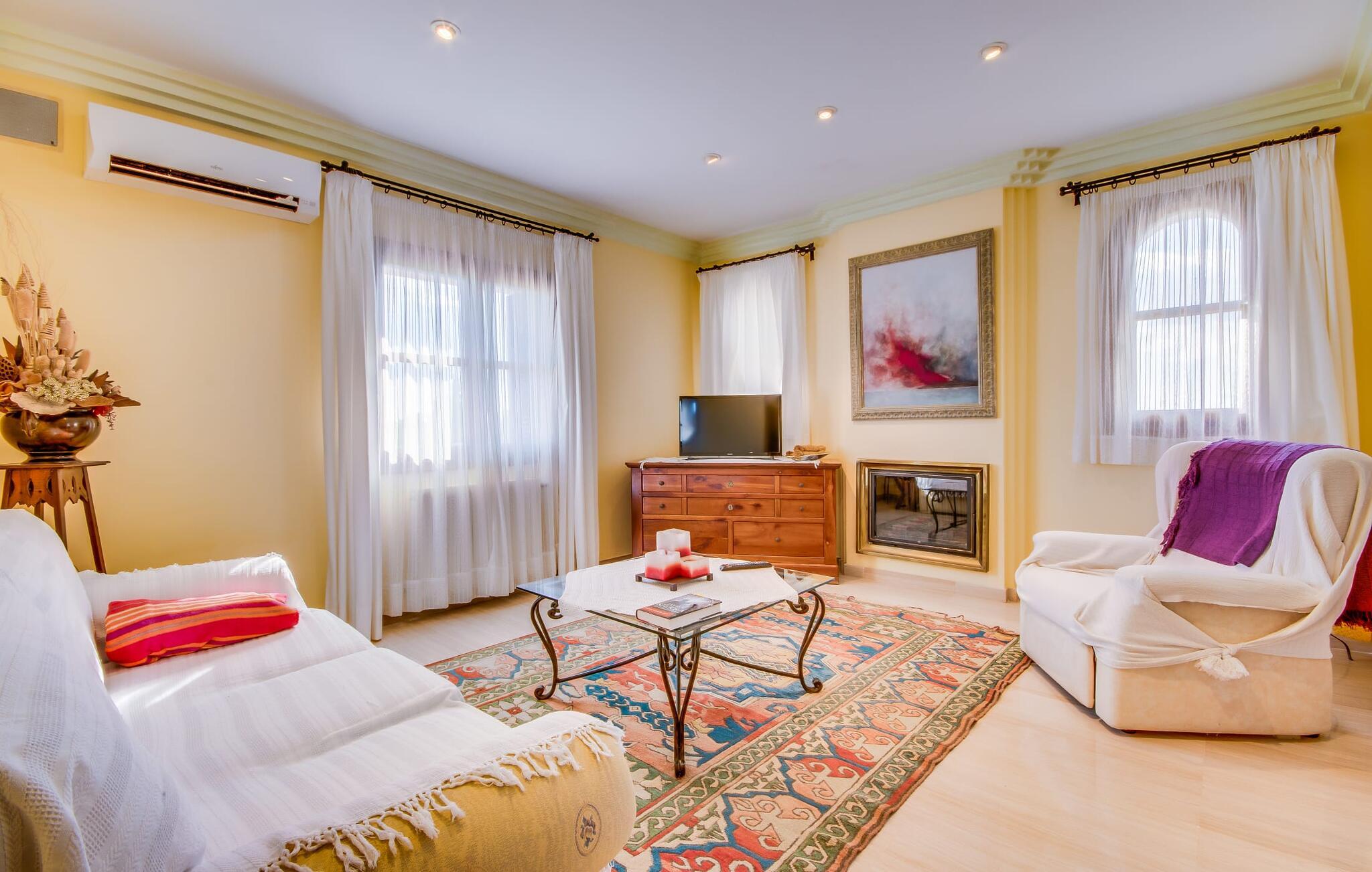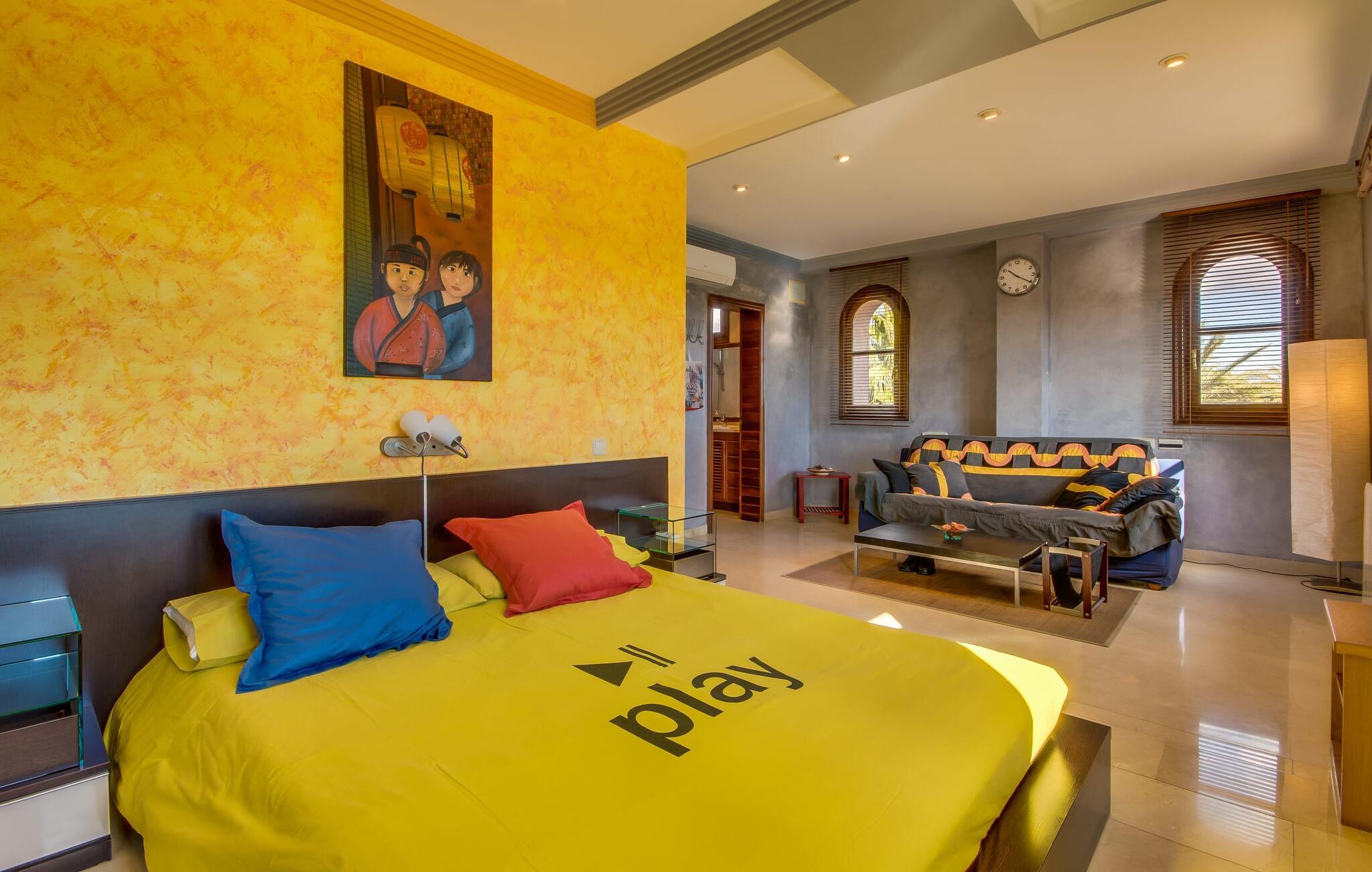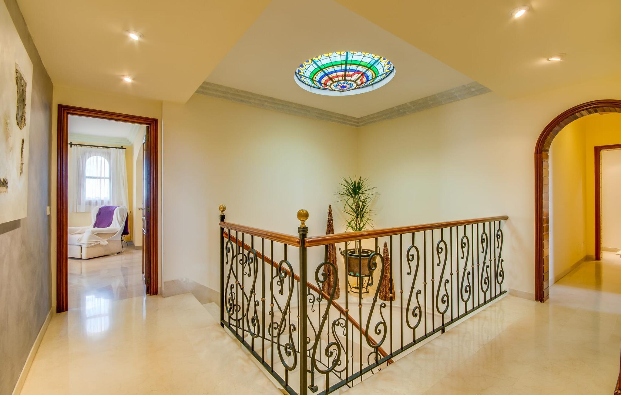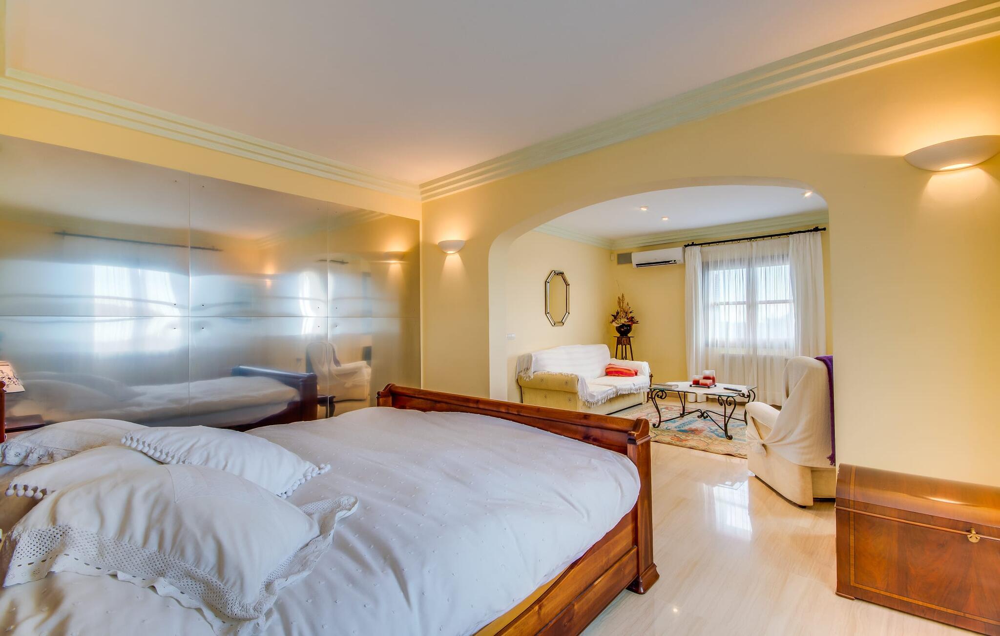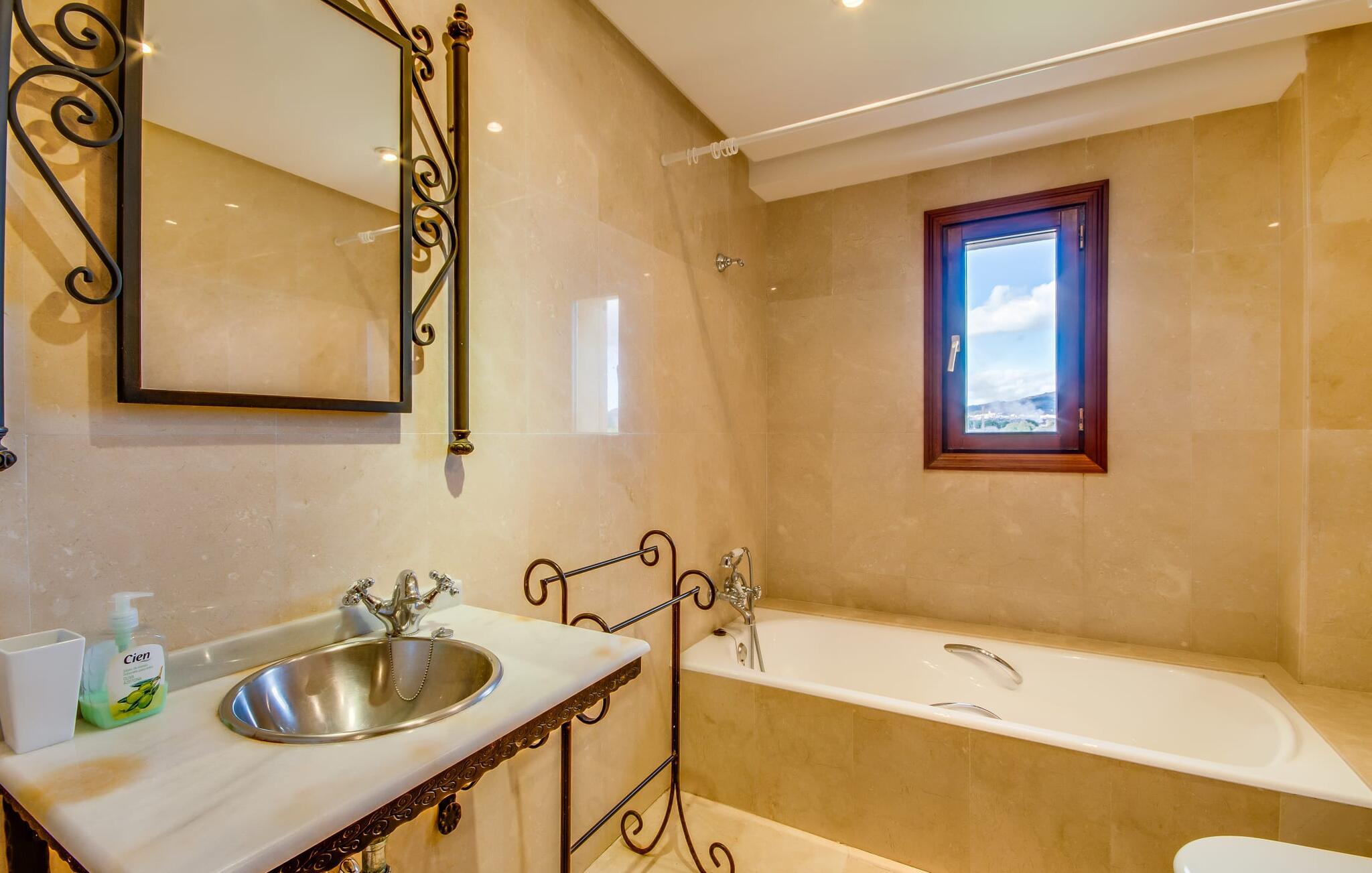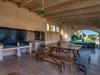 Når man ser på billederne af villaen “Mitjana” kan man ikke få nok: Stort land, palmer og cypresser mod en helårsgrøn baggrund, i det fjerne Middelhavet og midt i det hele ligger det smukke traditionelle stenbrudshus med hvide lister, trævinduer, grønne skodder og de lertagsten, der er typiske for regionen. "Mitjana" er et af de smukke, klassiske stykker af Mallora, som vi alle elsker så højt, og det er tæt på stranden. Proportionerne af komplekset er perfekt realiseret og lige ved siden af den storslåede hovedbygning med dens overdækkede terrasse og plads nok til en udendørs spiseplads er der en swimmingpool på næsten 80 m². Det meget praktiske udendørs badeværelse er integreret i udekøkkenets murstensstruktur lige ved siden af, som har to indbyggede BBQ-grill og en brændeovn. Der er en dejlig rustik atmosfære, hvor I kan afslutte dagen med at slappe af med venner og familie, mens I nyder en lækker BBQ. I kan købe friske, sprøde produkter på markedet i Felanitx eller Santanyí. Hvis I ikke laver andet, kan I hoppe i swimmingpoolen eller teste jeres færdigheder ved bordtennisbordet. Samlet set byder den omfattende have i maritim stil på mange muligheder for børn til at slippe damp og have det sjovt. Det er så enkelt som at lade dem gå. Indretningen af huset gør det ideelt for to familier af venner, der rejser sammen. I alt 350 m² boligareal er fordelt på to etager og er elegant designet og indrettet, som passer godt til husets traditionelle facade. I stueetagen, på den anden side af terrassen, er den udsøgte opholds- og spisestue med en behagelig sofa, hyggelig pejs, TV, bibliotek og klaver. Husets klassiske charme med stukafslutninger, moderne møbler af høj kvalitet, tæpper og lysekroner suppleres af integreret spotbelysning og særligt skinnende blankpolerede gulve. Det store, alsidige køkken i landlig stil med varme træskabe er meget moderne udstyret, herunder en opvaskemaskine og et amerikansk køleskab med ismaskine til kølige drikkevarer, men har også en gammeldags brændeovn. Det har også en ekstra spiseplads foran en gammel pejs. Der er også et toilet på denne etage, som er tilgængeligt for alle gæster. Det er meget rart, at alle soveværelser er på øverste etage. Dette omfatter to store soveværelser, der deler et separat opholdsområde og et tilstødende badeværelse. Yderligere tre badeværelser, hver med to enkeltsenge, deler et badeværelse med badekar - ideel til at bringe alle børn sammen, eller endda til venner eller bedsteforældre, der er med på turen. Alle værelser har aircondition og selvfølgelig opvarmet. I har sikkert allerede fundet billederne af badeværelset bag det store soveværelse, hvor I finder et boblebad og en bruser med massagedyser. Her venter jer virkelig himmelske oplevelser - og selvfølgelig er der meget mere at udforske og opdage uden for villaen. I kan opdage mangfoldigheden af de smukkeste Baleariske Øer, især langs den sydøstlige kyst. Udover hyggelige byer med let turisme, livlige promenader med gode restauranter og et par barer, er der også talrige strande, der er perfekte til en ferie ved vandet. Disse omfatter villaens navnebror, Cala Mitjana, men også Cala Sa Nau, Cala Petita, Cala Serena, Cala Ferrera og mange flere. Disse steder har alle imponerende fjordlignende bugter med klart vand. Den nærliggende landevej, som fører enten ind i landet eller til attraktive destinationer langs kysten, er delvist hørbar fra ejendommen, men kun når vinden er lige tilpas. Nærheden af denne motorvej betyder, at I kan nyde en landlig beliggenhed, der stadig giver nem adgang til en række ferieaktiviteter, som endda kan omfatte et besøg på den nærliggende Vall d'Or golfbane. Hvordan I slapper af og tager en pause fra hverdagens stress er op til jer - men vi hos Fincallorca gør vores bedste for at tilbyde jer det perfekte sted at gøre det, og i vores øjne er Villa “Mitjana” lige sagen. Den udsøgte naturstensvilla "Mitjana" med stor anlagt have, poolområde og rustikt udekøkken ligger kun få minutters gang fra badebugten af samme navn nær Cala D'Or. I denne charmerende lille by med sin enkle hvide arkitektur kan I shoppe eller gå en tur langs promenaden. For øens berømte markeder kan I tage til Santantyí eller længere inde i landet til Felanitx. Nyd et mangfoldigt udvalg af brede, fjordlignende badebugter, der nemt kan nås med jeres lejebil.