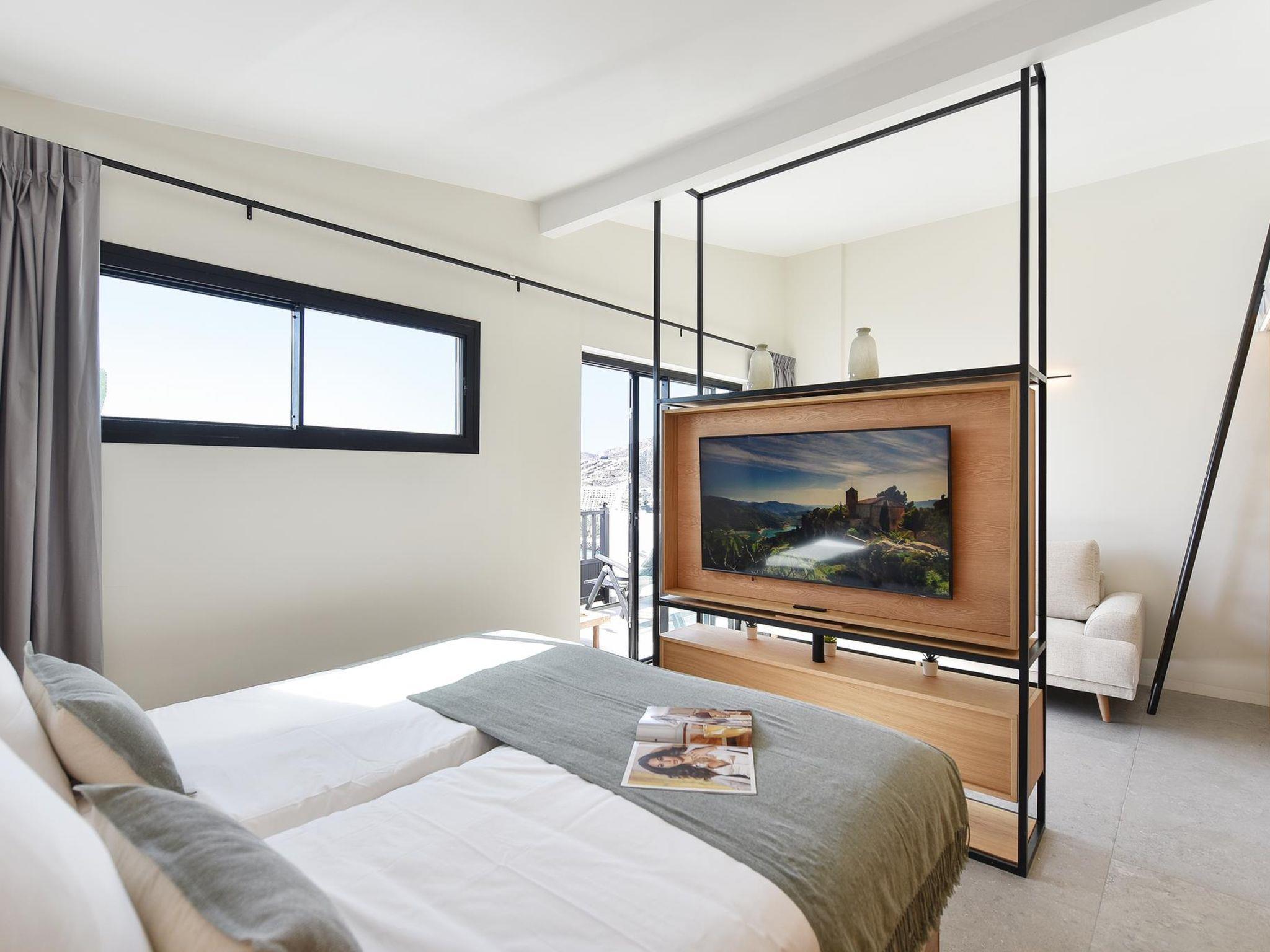 "Los Canarios 630 - Adults Only", 1-room studio 34 m2. Practical and modern furnishings: 1 room with 2 beds (80 cm, length 190 cm), digital TV and air conditioning. Exit to the balcony. Kitchen (3 ceramic glass hob hotplates, toaster, kettle, microwave, freezer, electric coffee machine). Shower/WC. Balcony. Balcony furniture. View of the sea. Facilities: washing machine, iron, hair dryer. Internet (WiFi, free). Please note: not suitable for small children. Non-smokers only. 2023-T13541 // Reg. Nr.: ESFCTU0000350210000905900000000000000VV-35-1-00209120