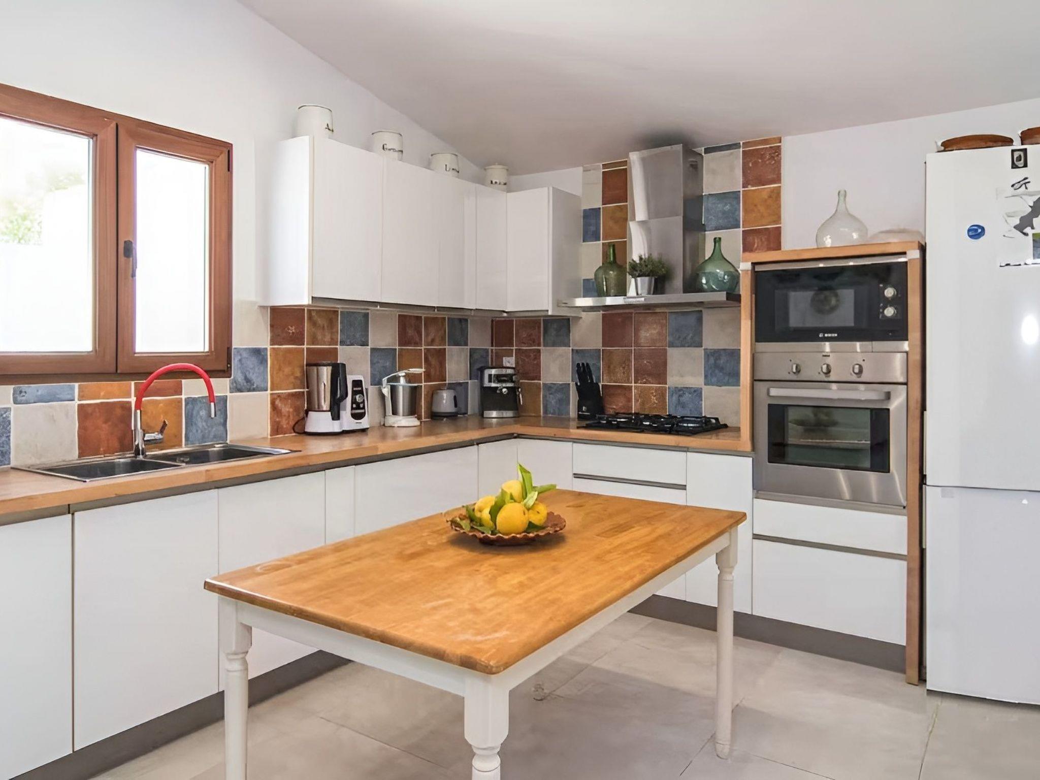 The house offers approximately 150 m² of living space on the ground floor, a lovingly furnished living room with ceiling fans, air conditioning and a comfortable sofa area with satellite TV. The fully equipped kitchen is located close to the living room and offers access to the covered terrace with dining table. There are a total of three bedrooms (2 double beds and 1 single bed) and two bathrooms with shower, one of them en suite. All bedrooms have air conditioning and ceiling fans.