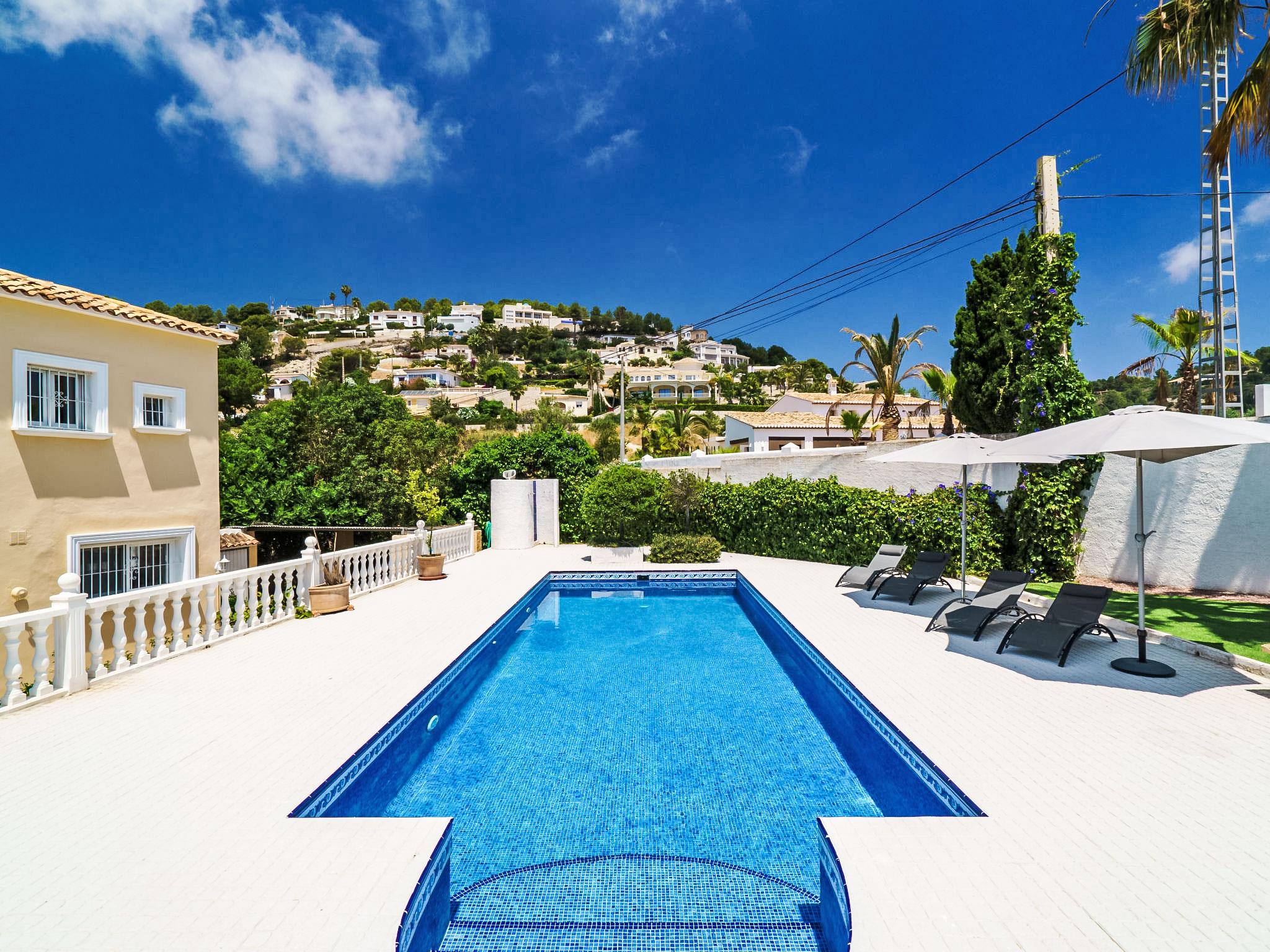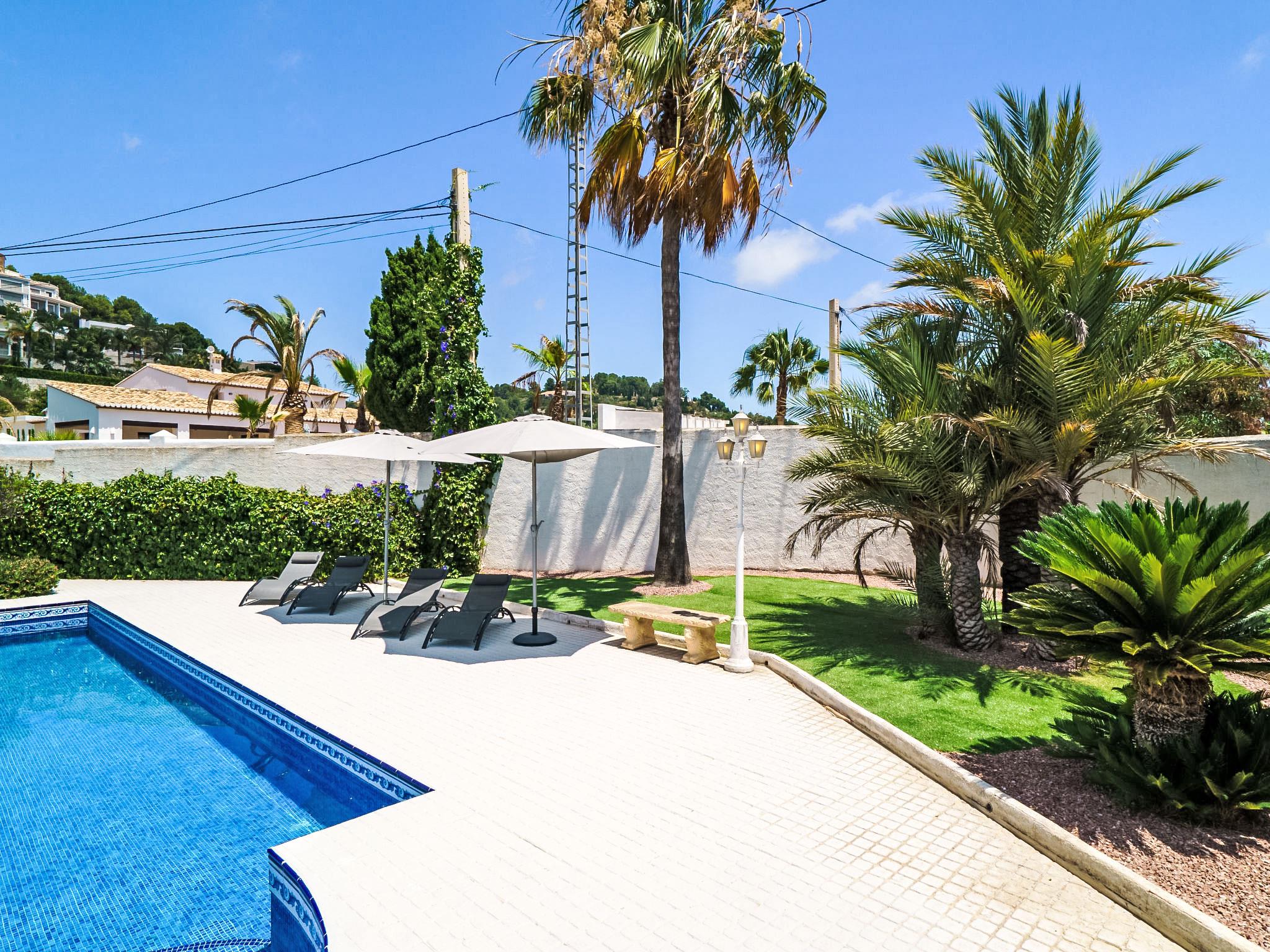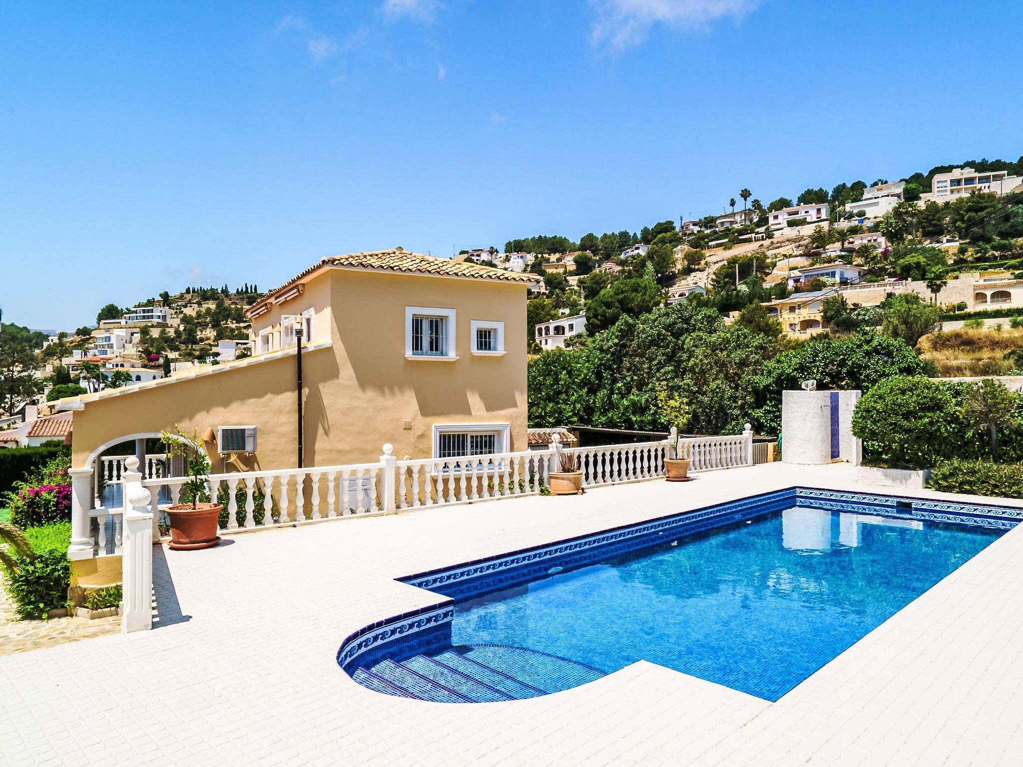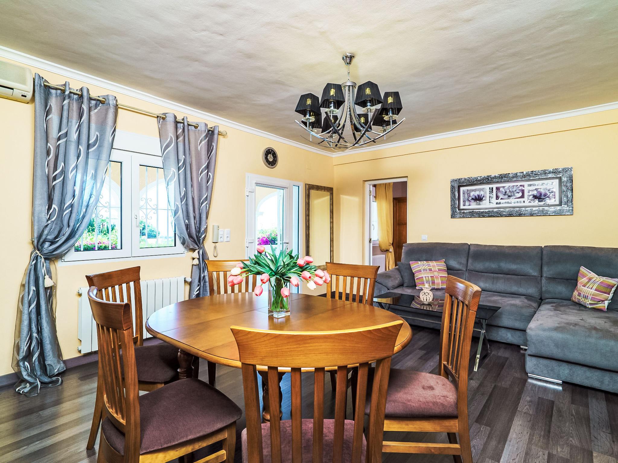 Los Bancales Benissa: Very beautiful, cosy, comfortable house "Alina", 2 storeys. In the district of Benissa 8 km from the centre of Moraira, 8 km from the centre of Calpe, in a secluded, quiet, sunny position, 1.5 km from the sea, 1.5 km from the beach, in a cul-de-sac. Private: large, beautiful, well-kept garden 910 m2 (fenced) with lawn and trees, swimming pool angular (4 x 10 m, depth 140 - 220 cm, seasonal availability: 01.Jan. - 31.Dec.) with internal staircase. Outdoor shower, terrace, garden furniture. In the house: internet access, WiFi, washing machine. Roofed, parking (for 3 cars) on the premises. Carport. Supermarket 1.5 km, restaurant 1.5 km, bus stop 7 km, sandy beach 5 km, swimming bay 1.5 km. Golf course (9 hole) 8 km. Please note: car recommended. Suitable for families, suitable for seniors. The owner does not accept any youth groups.