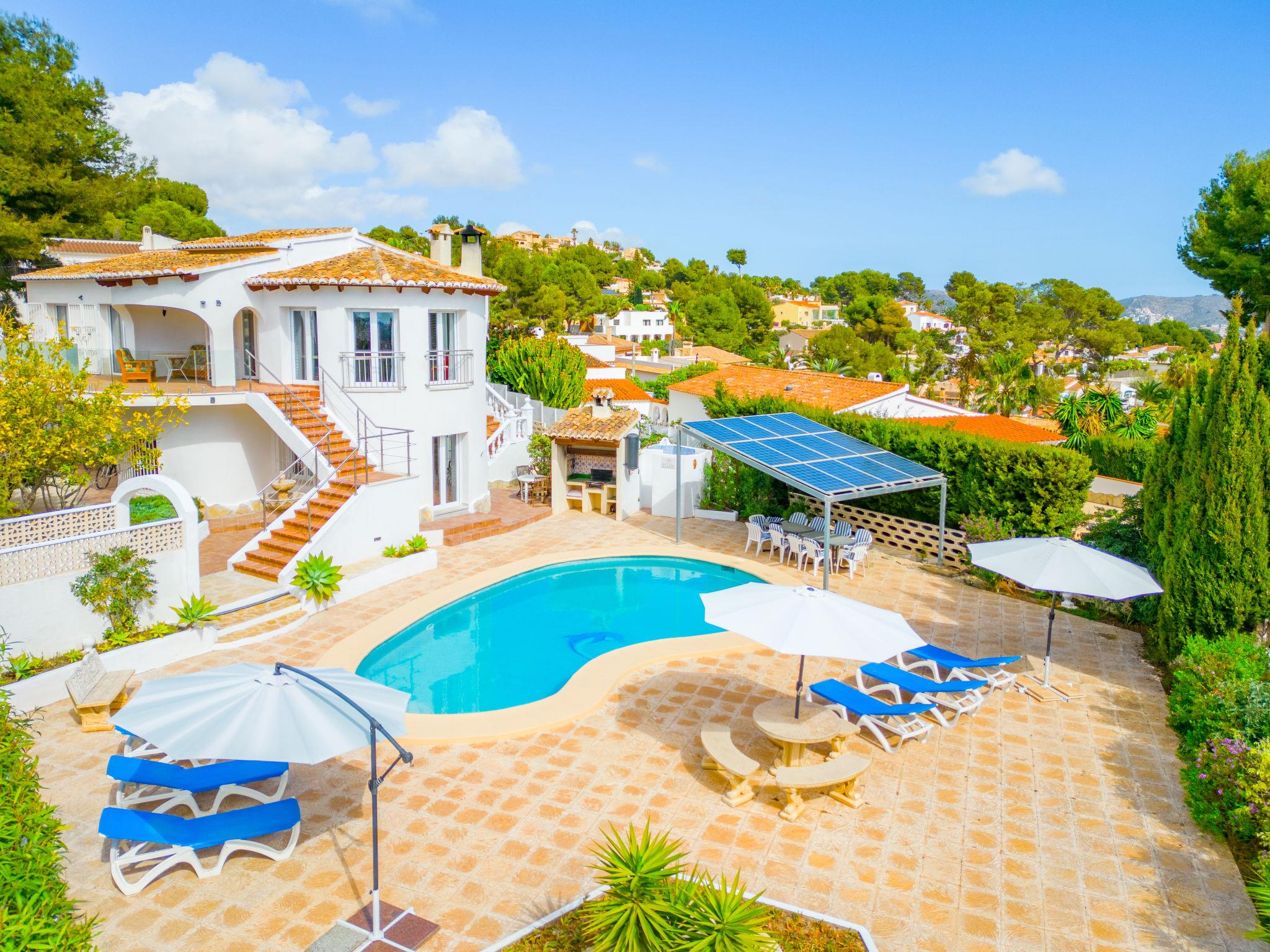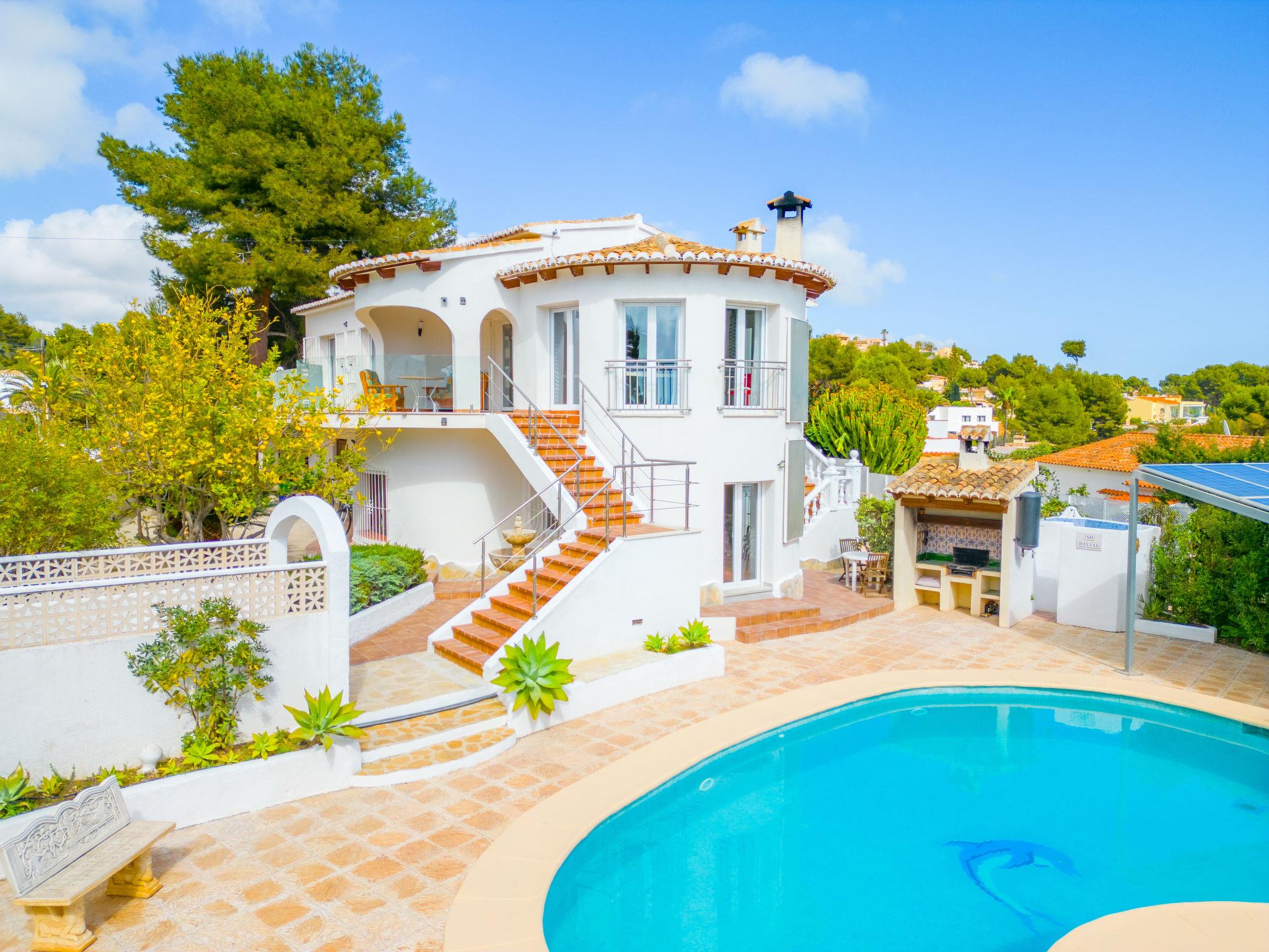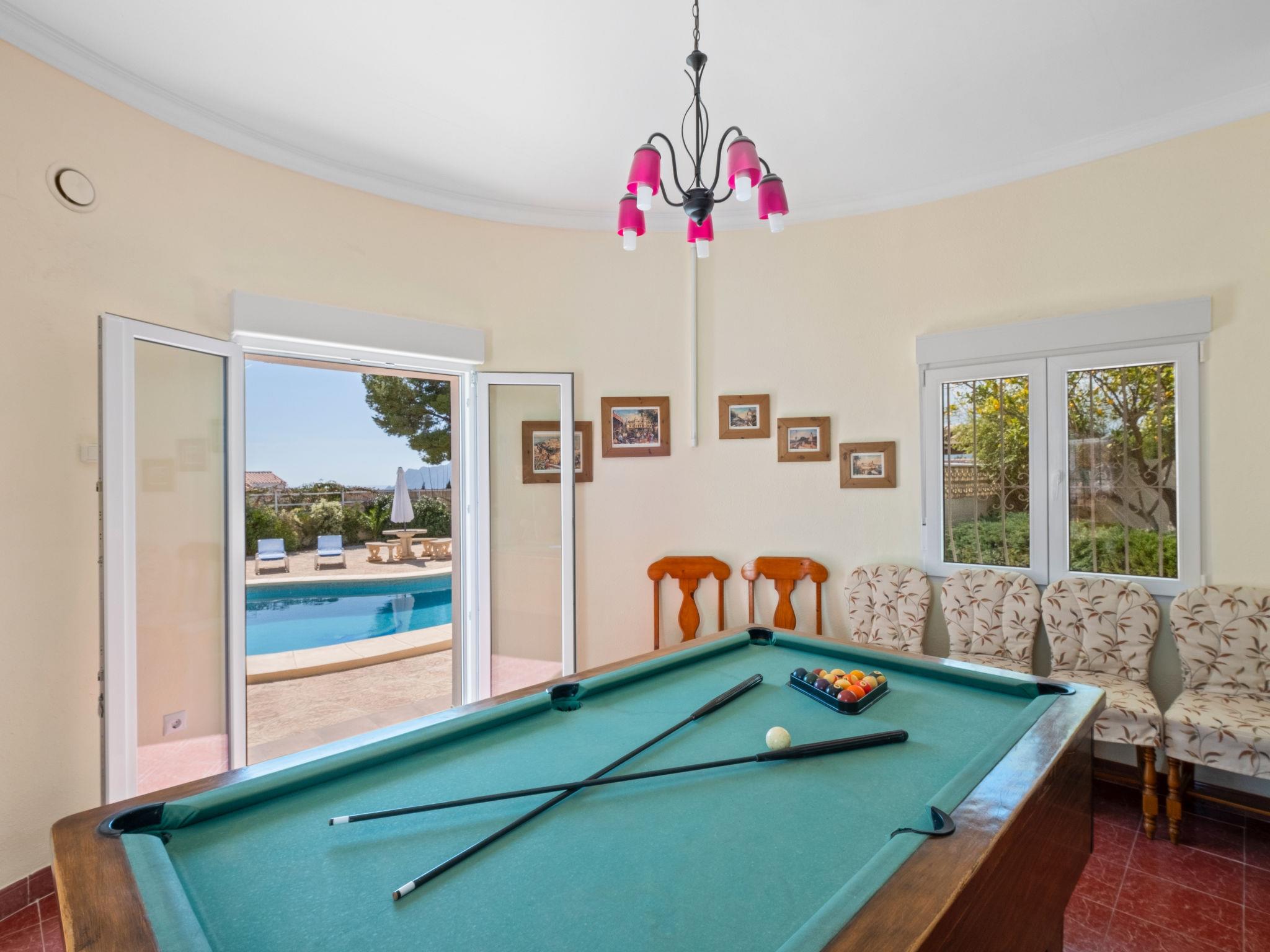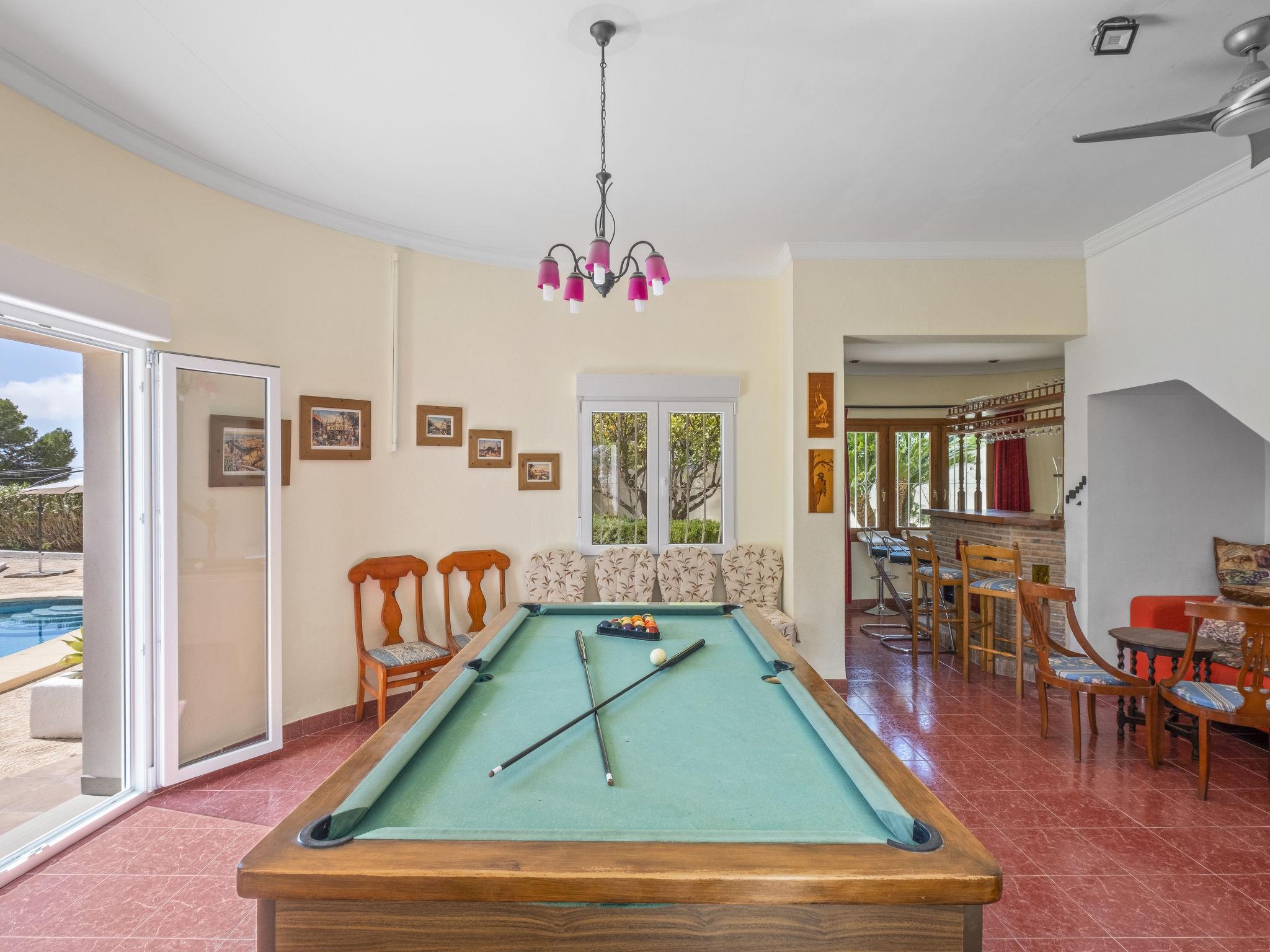 Large house "El Gazebo", 2 storeys. In the district of San Jaime 3.5 km from the centre of Moraira, in a sunny position, 1.7 km from the sea. Private: property 800 m2 (fenced), large, well-kept garden, swimming pool kidney shaped (6 x 10 m, depth 140 - 220 cm, seasonal availability: 01.Jan. - 31.Dec.) with internal staircase. Outdoor shower, barbecue house. In the house: billiard table, central heating system, washing machine. Roofed, parking on the premises. Shop, supermarket, restaurant, bar, bakery 450 m, bus stop 4 km, sandy beach 3 km, shingle beach 1.7 km. Golf course (18 hole) 1.5 km. The owner does not accept any youth groups.