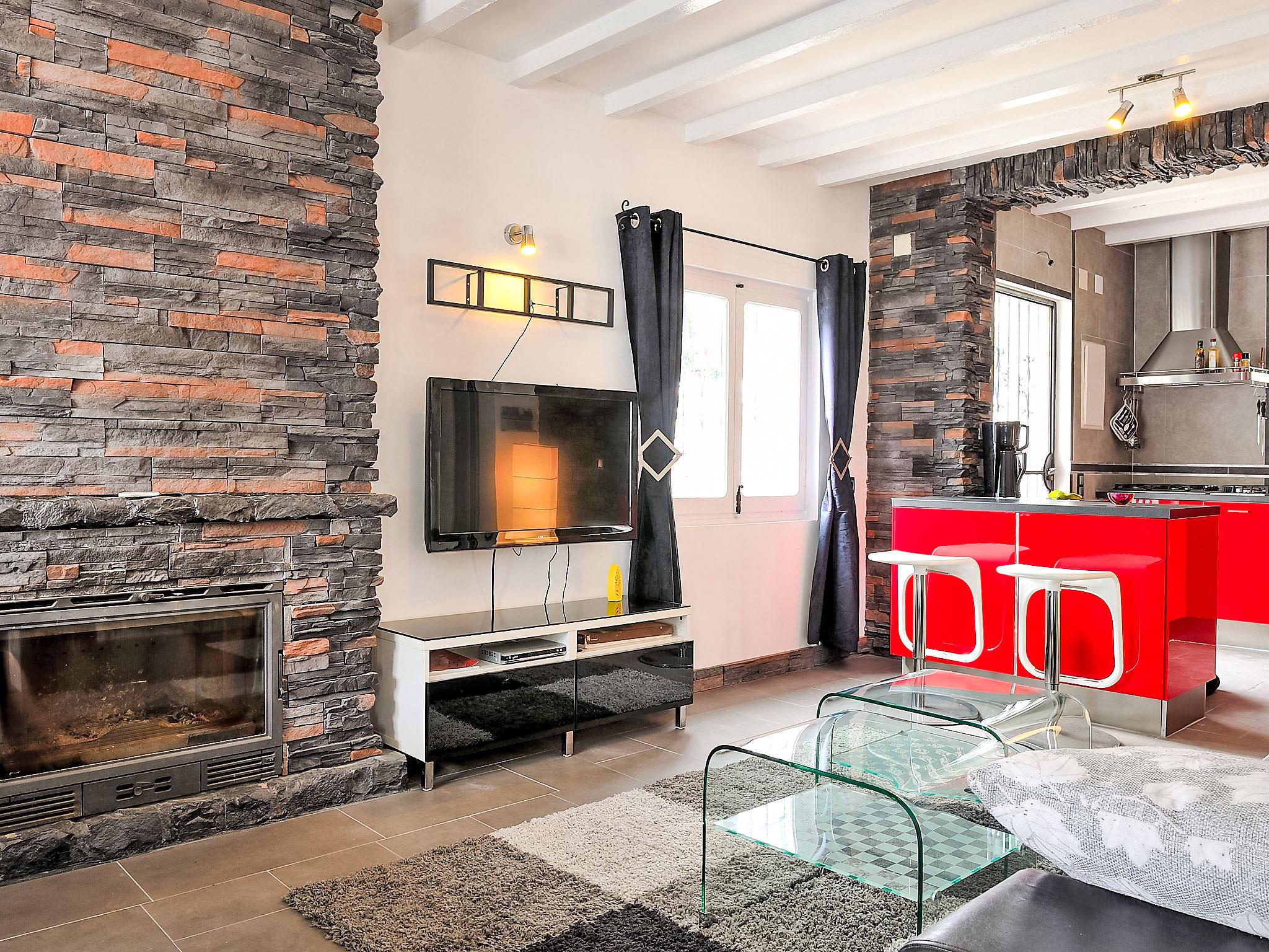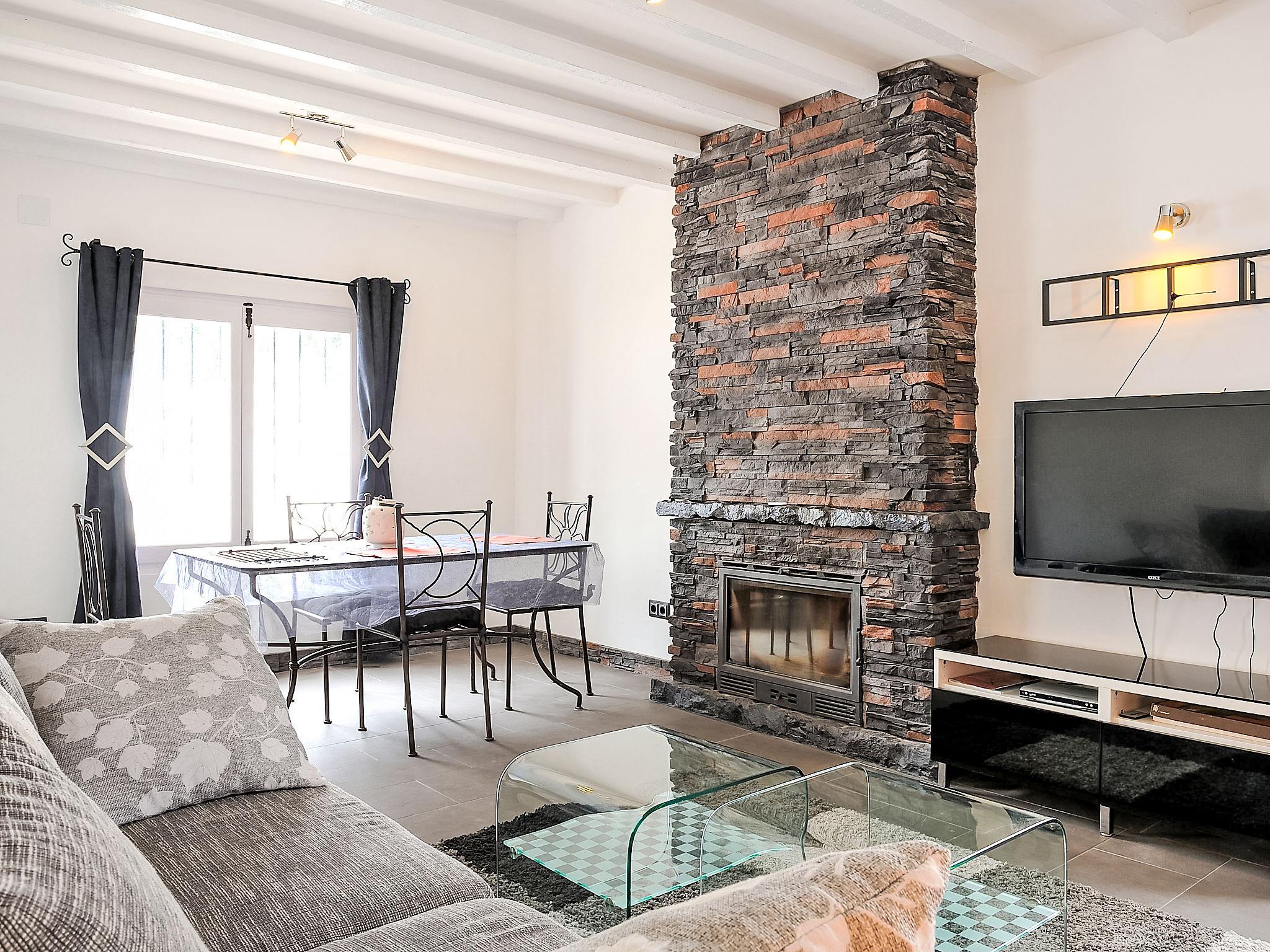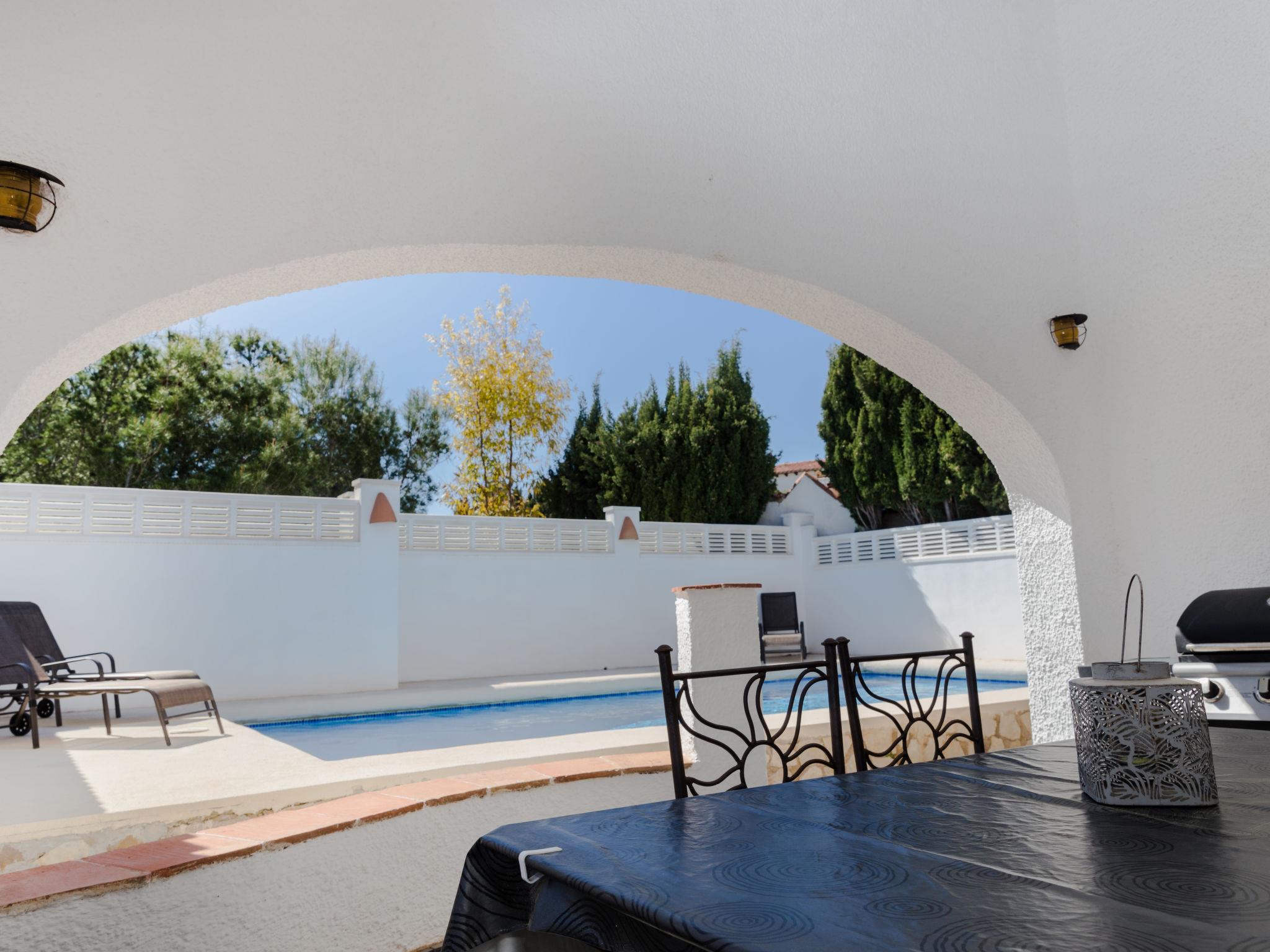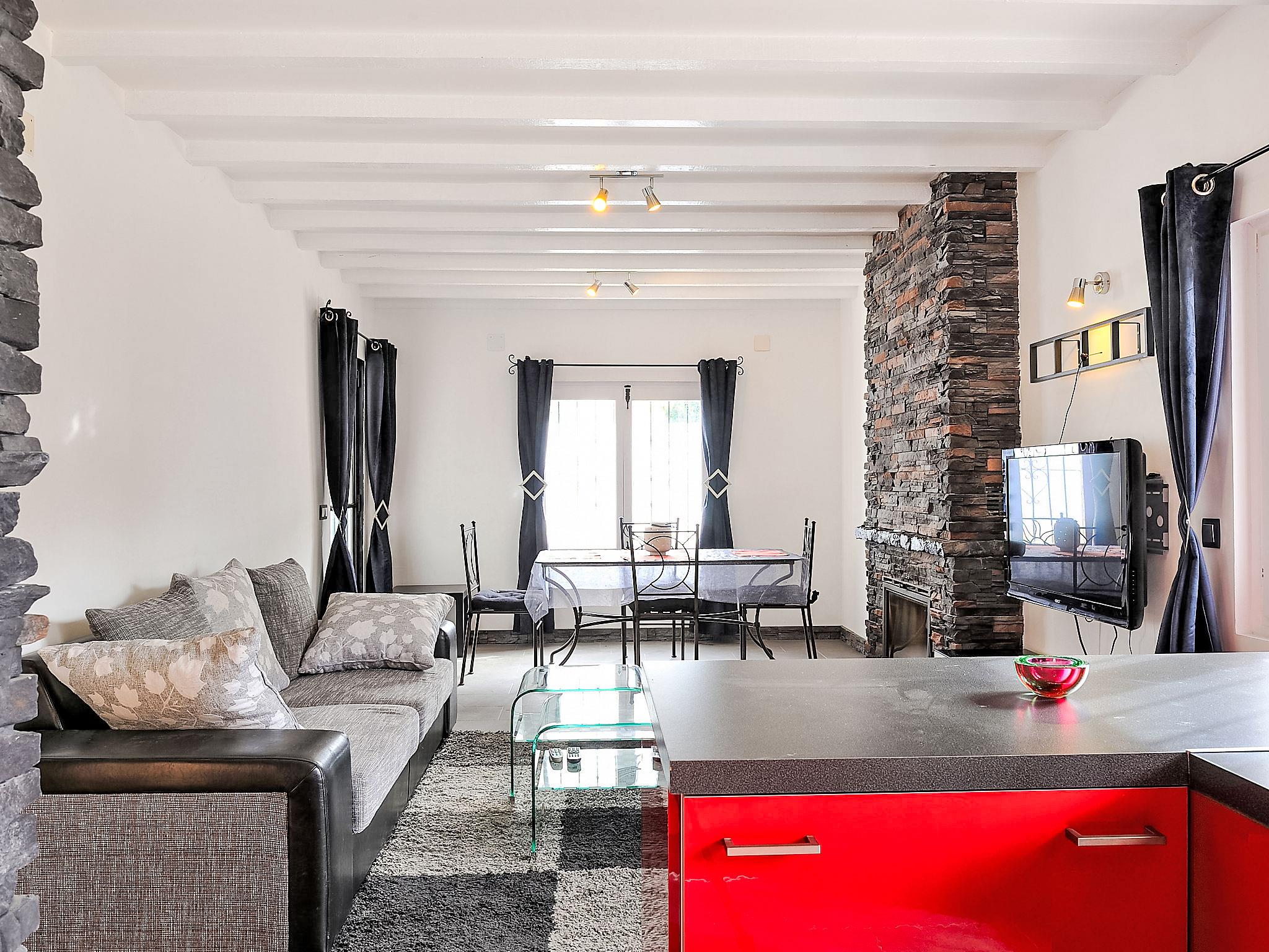 "La Yaya", 3-room house 75 m2. Modern and tasteful furnishings: living/dining room with Scandinavian wood stove, satellite TV and digital TV. Exit to the garden, to the terrace, to the swimming pool. 1 room with 1 french bed. Exit to the terrace, to the swimming pool. 1 room with 1 pull-out bed (2 pers.). Open kitchen (oven, dishwasher, freezer, electric coffee machine, combination microwave). Exit to the garden. Shower/WC, hydro massage shower. Terrace roofed, patio. Terrace furniture, barbecue, deck chairs (4). Facilities: washing machine, dryer. Internet (WiFi, free). Parking (fenced 2 cars). Please note: suitable for families. TV only DE, ES. CV-VUT0440975-A // Reg. Nr.: ESFCTU00000302900007697300000000000000000AT-440975-A7