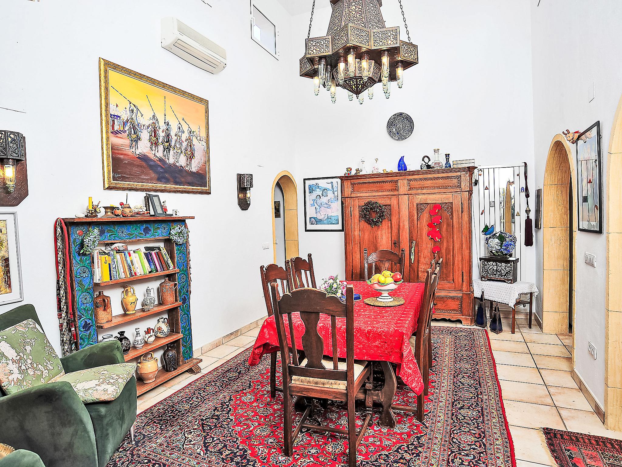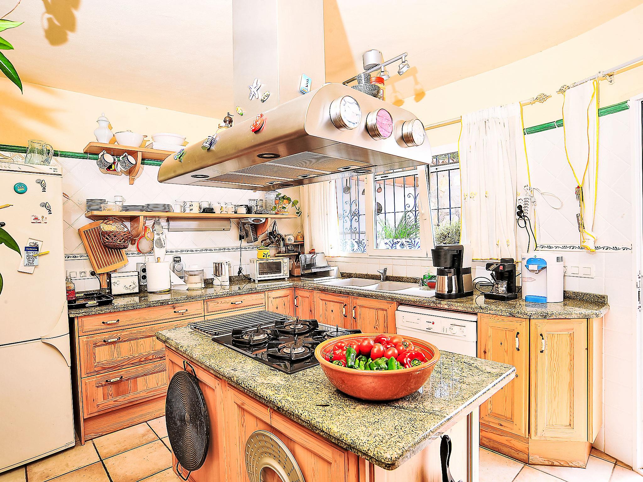 "Mirada al Sol", 6-room house 210 m2 on 2 levels. Spacious, fully renovated, comfortable and cosy furnishings: large living/dining room with Scandinavian wood stove, satellite TV, hi-fi system and air conditioning. Exit to the terrace, to the swimming pool. 1 room with 2 beds and air conditioning. 1 room with 1 french bed (140 cm, length 200 cm), air conditioning. 1 room with 2 beds and air conditioning. Large, open kitchen (oven, dishwasher, microwave, freezer, electric coffee machine, cooking island). Shower/bidet/WC, bath/shower/WC. On the lower ground floor: (exterior staircase) living/dining room with 1 double sofabed and satellite TV. Exit to the garden, to the terrace. 1 double bedroom with shower/WC. Open kitchen (oven, freezer, grill). 2 large terraces partly covered, patio. Terrace furniture, barbecue. Facilities: washing machine, children's high chair, baby cot for up to 3 year olds. Internet (WiFi, free). Suitable for families. Maximum 1 pet/ dog allowed. AT-440988-A // Reg. Nr.: ESFCTU00000303800077515100000000000000000AT-440988-A1