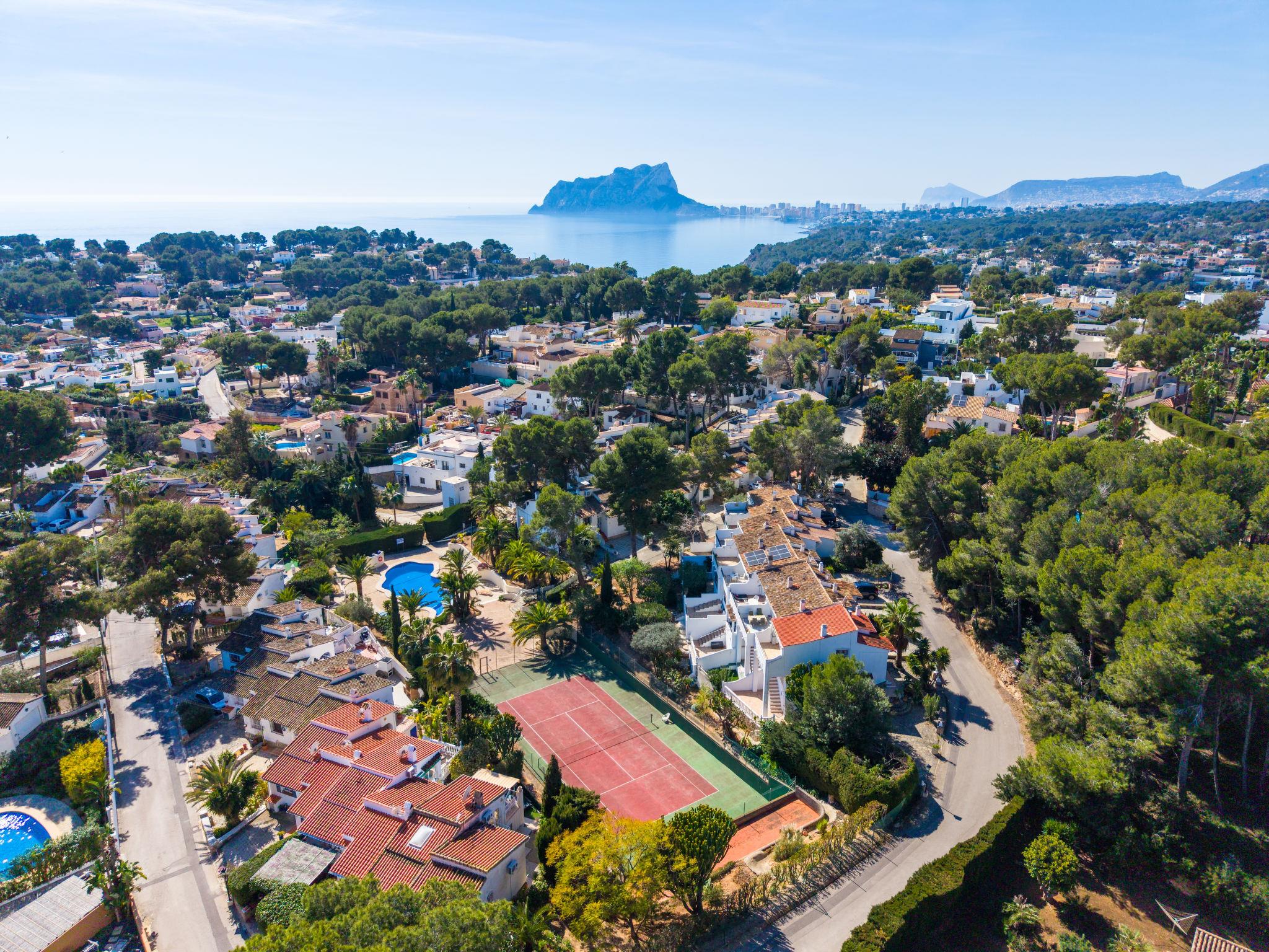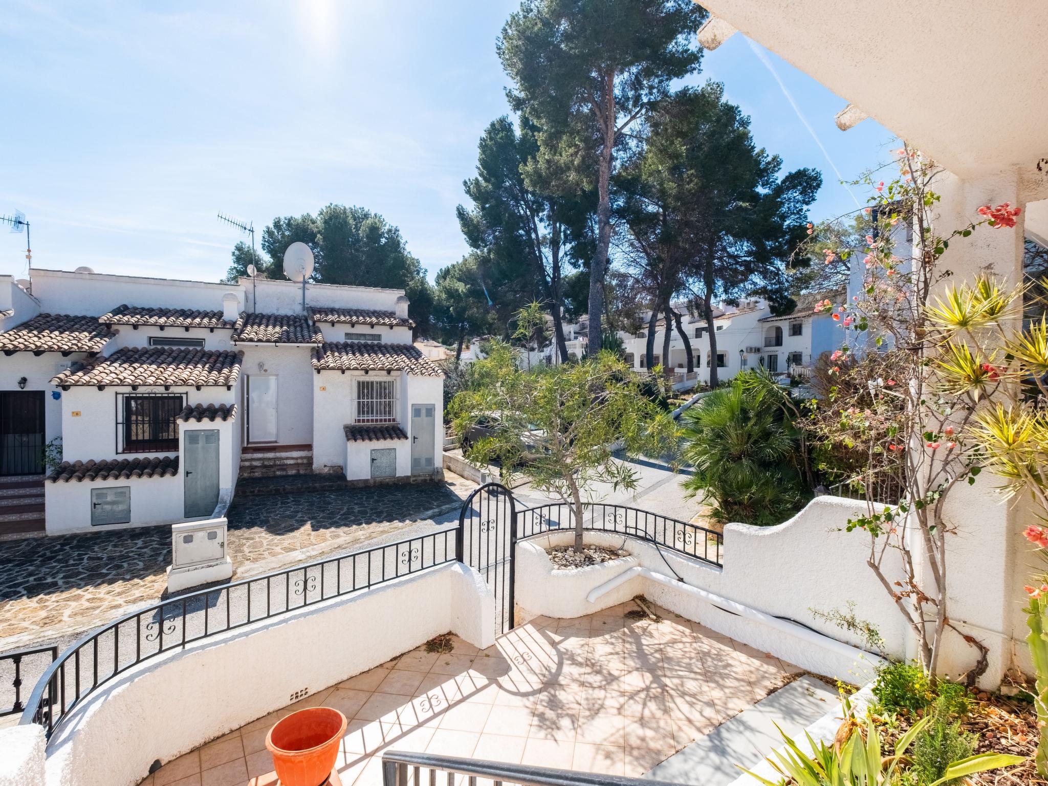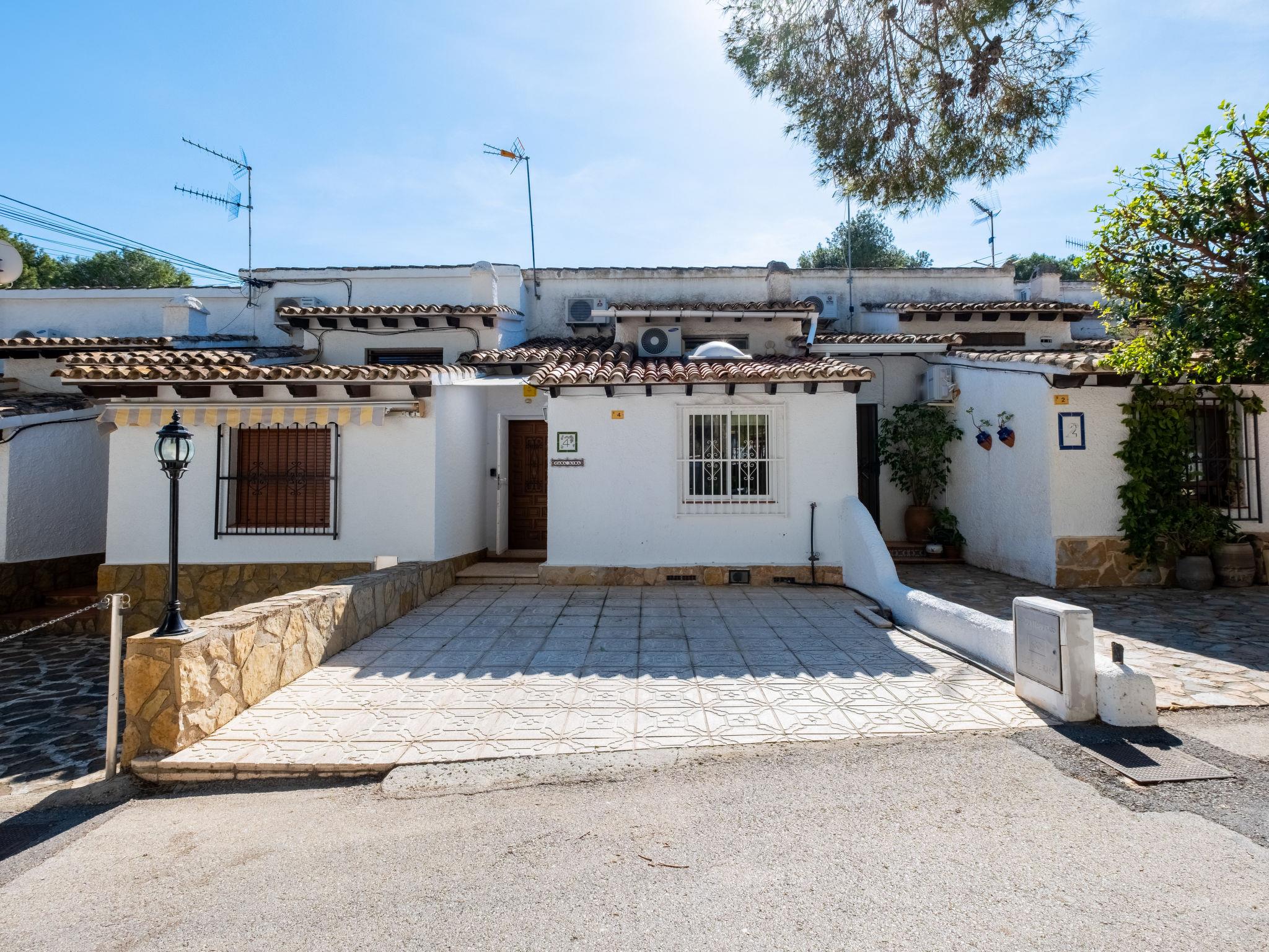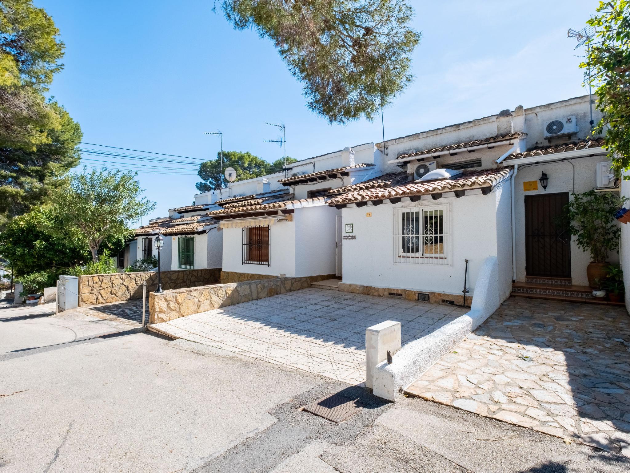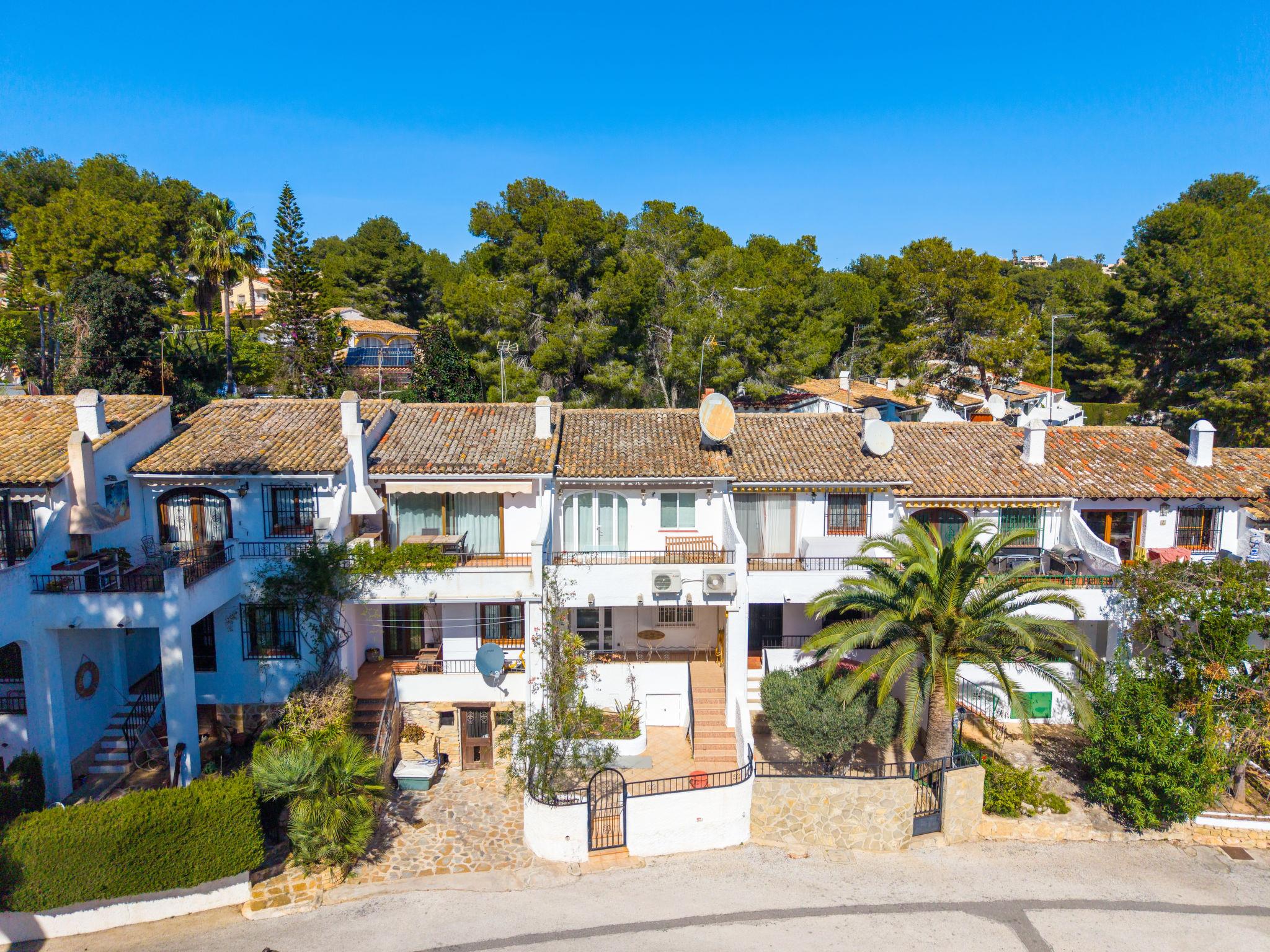 Els Pins: Beautiful terraced house "Lisa", 2 storeys. 3 km from the centre of Moraira, in a quiet, sunny position residential area (villas), traffic calmed area, 2 km from the sea, 2 km from the beach. For shared use: swimming pool (19 x 8 m, seasonal availability: 01.Jan. - 31.Dec.). Children's pool, outdoor shower, tennis, terrace. Private: property (fenced), garden. Terrace. Shop 1 km, grocery 1 km, supermarket 1 km, restaurant 650 m, bus stop 2 km, ferry 3 km, sandy beach "Playa Ampolla", rocky beach "Playa La Galera" 1.5 km. Sports harbour 4 km, marina 4 km, golf course (12 hole) 1.5 km. The owner does not accept any youth groups.