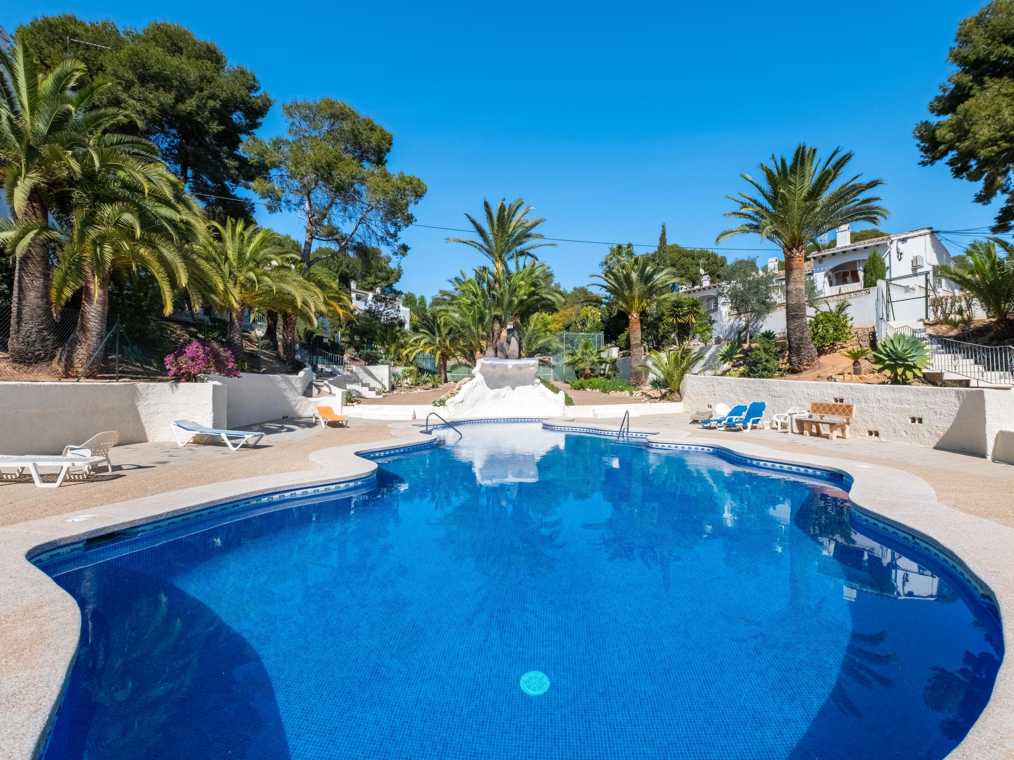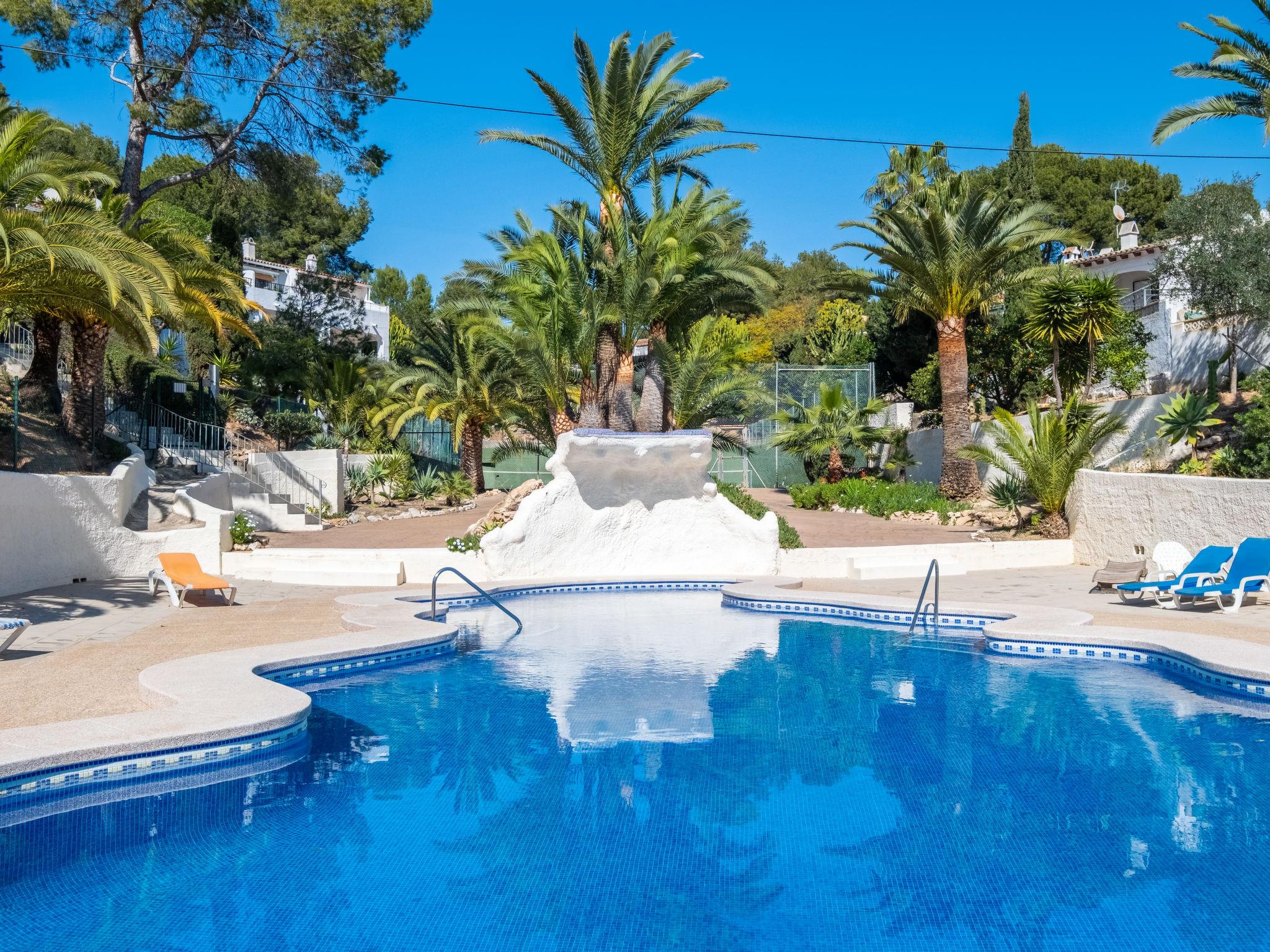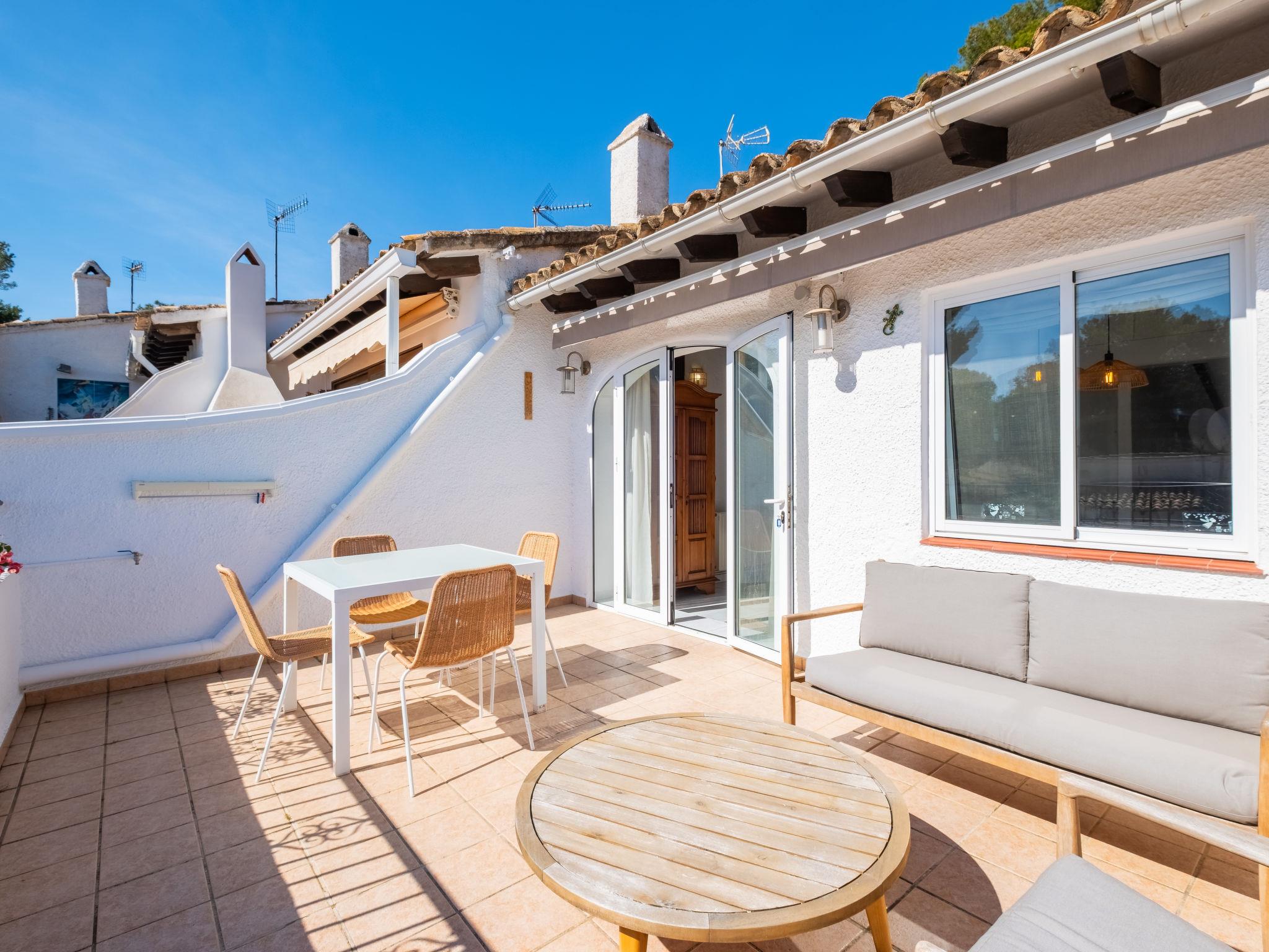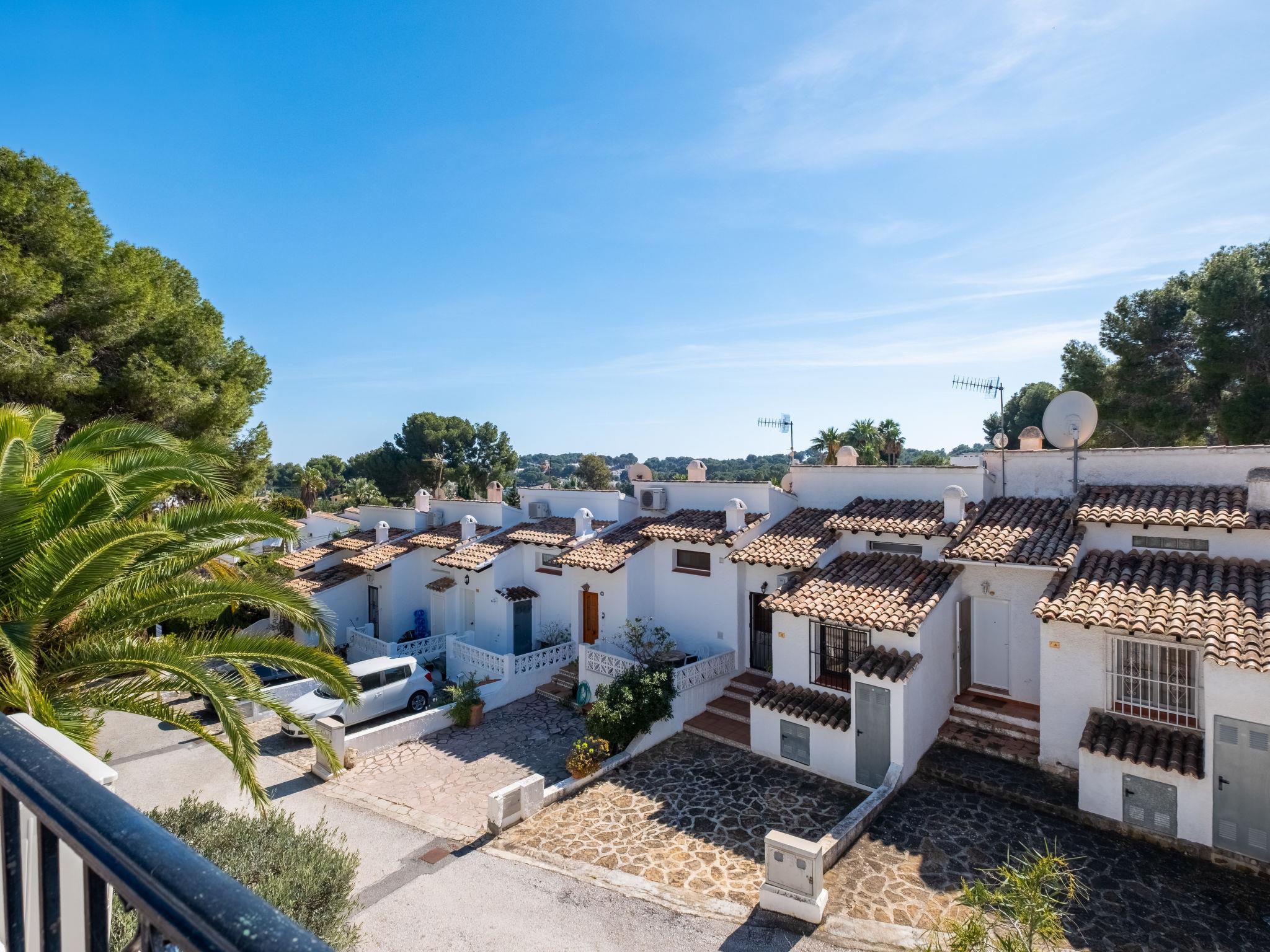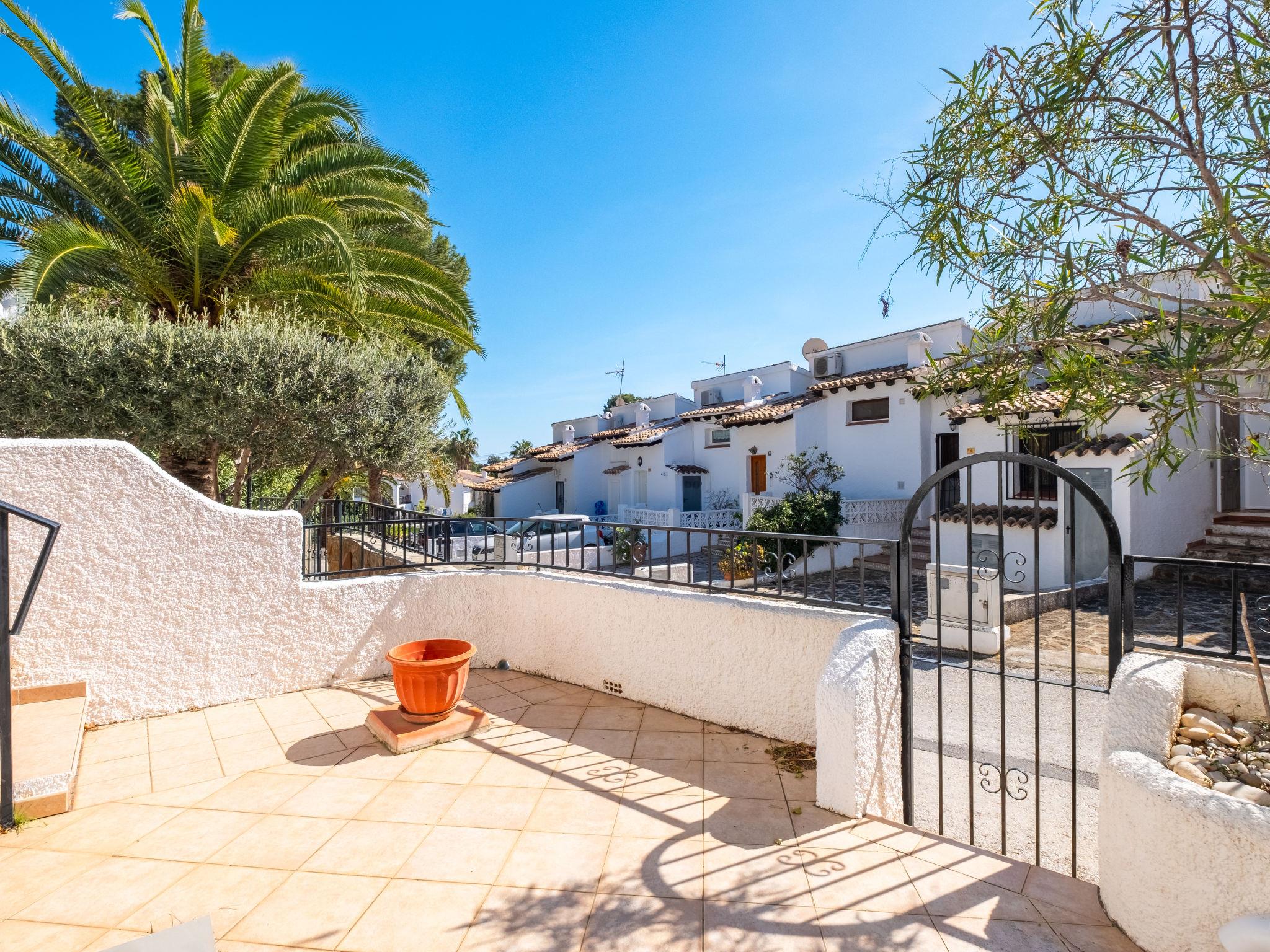 Els Pins: Beautiful terraced house "Lisa", 2 storeys. 3 km from the centre of Moraira, in a quiet, sunny position residential area (villas), traffic calmed area, 2 km from the sea, 2 km from the beach. For shared use: swimming pool (19 x 8 m, seasonal availability: 01.Jan. - 31.Dec.). Children's pool, outdoor shower, tennis, terrace. Private: property (fenced), garden. Terrace. Shop 1 km, grocery 1 km, supermarket 1 km, restaurant 650 m, bus stop 2 km, ferry 3 km, sandy beach "Playa Ampolla", rocky beach "Playa La Galera" 1.5 km. Sports harbour 4 km, marina 4 km, golf course (12 hole) 1.5 km. The owner does not accept any youth groups.