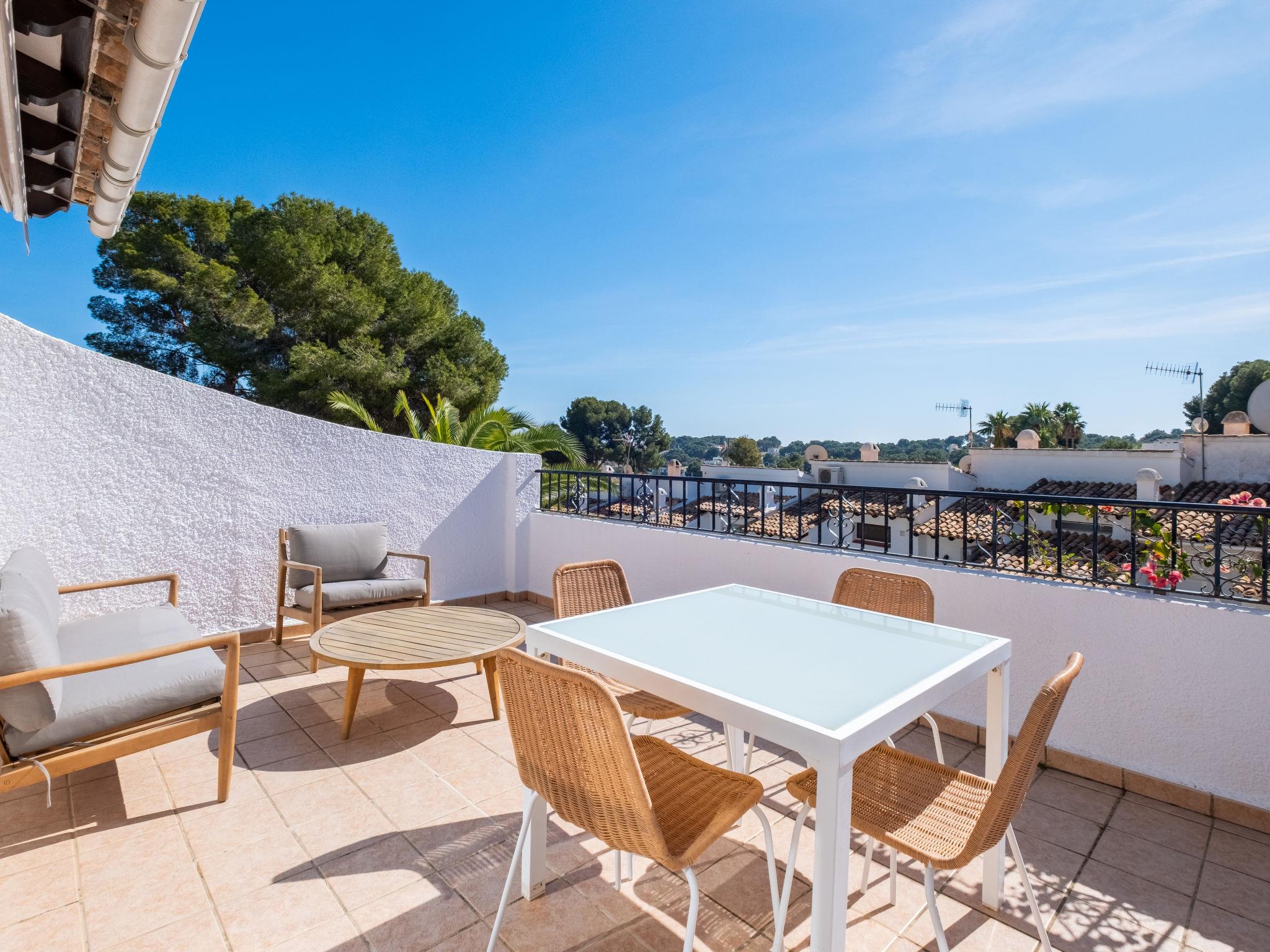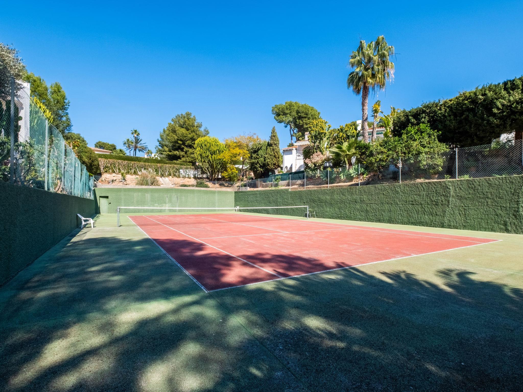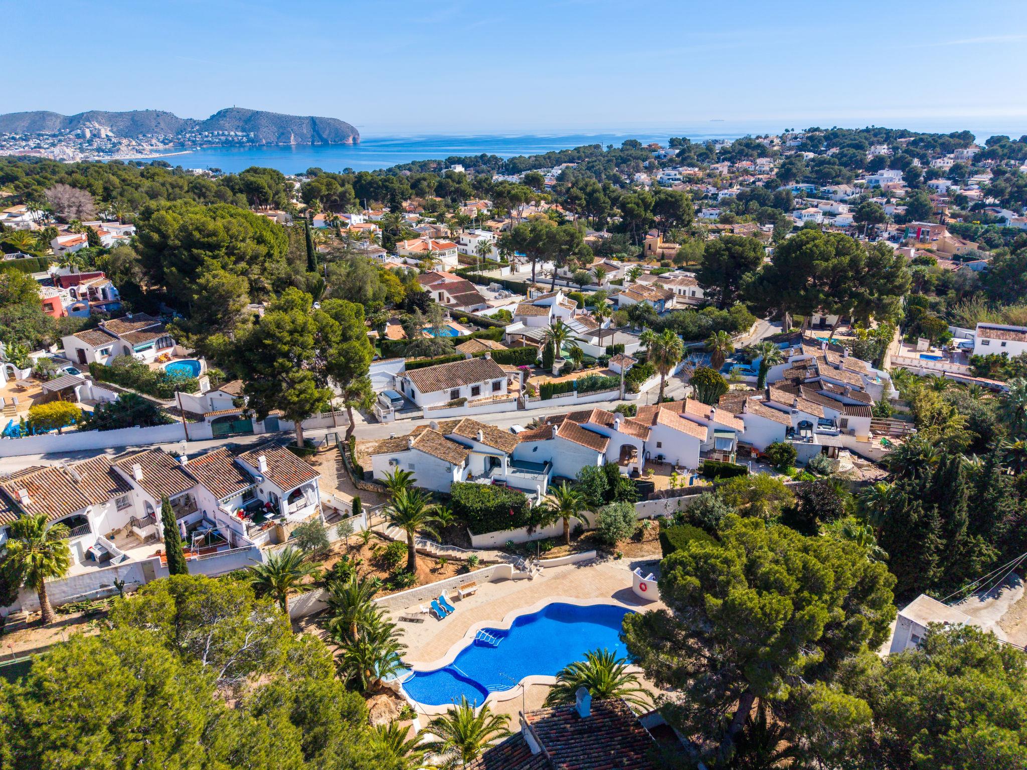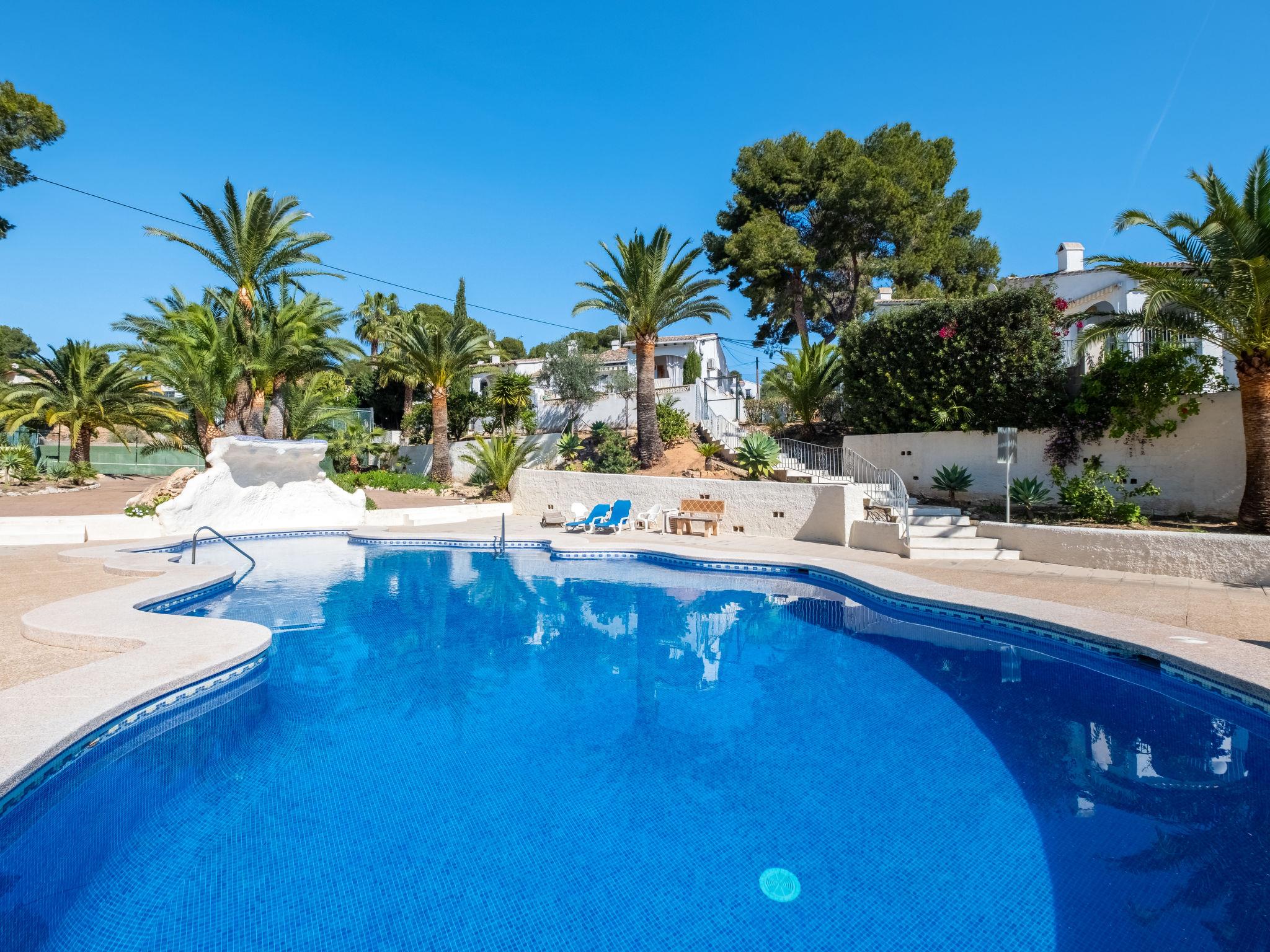 Els Pins: Beautiful terraced house "Lisa", 2 storeys. 3 km from the centre of Moraira, in a quiet, sunny position residential area (villas), traffic calmed area, 2 km from the sea, 2 km from the beach. For shared use: swimming pool (19 x 8 m, seasonal availability: 01.Jan. - 31.Dec.). Children's pool, outdoor shower, tennis, terrace. Private: property (fenced), garden. Terrace. Shop 1 km, grocery 1 km, supermarket 1 km, restaurant 650 m, bus stop 2 km, ferry 3 km, sandy beach "Playa Ampolla", rocky beach "Playa La Galera" 1.5 km. Sports harbour 4 km, marina 4 km, golf course (12 hole) 1.5 km. The owner does not accept any youth groups.