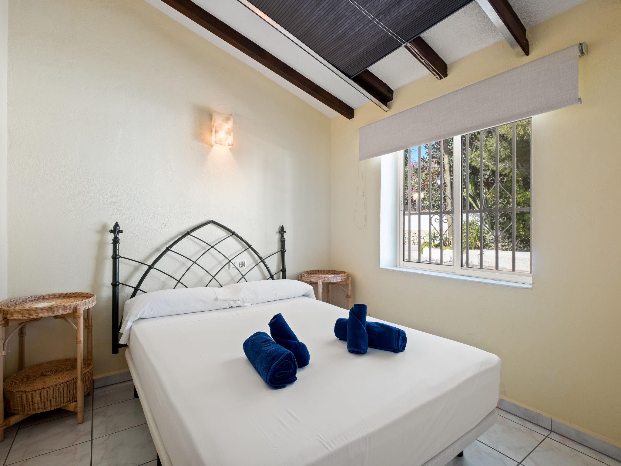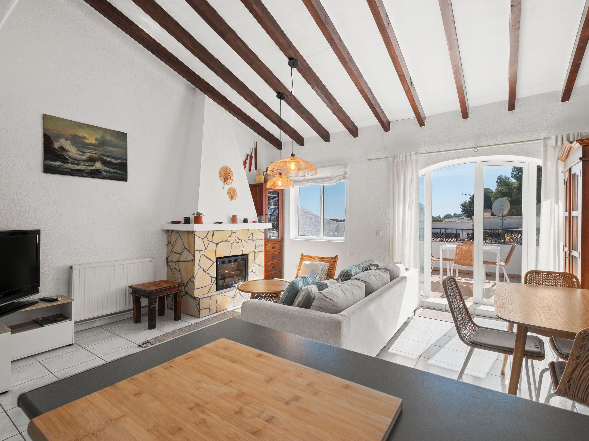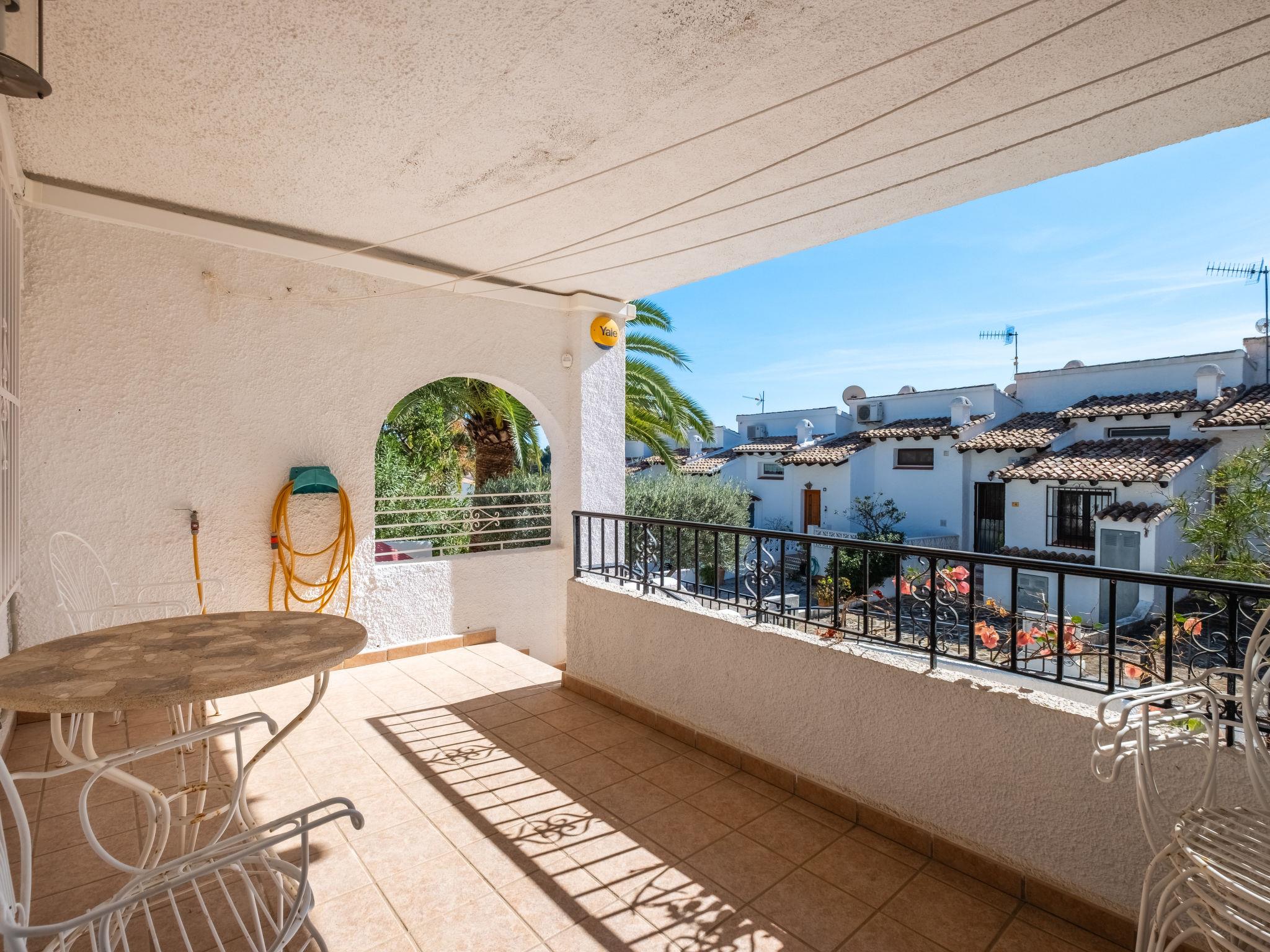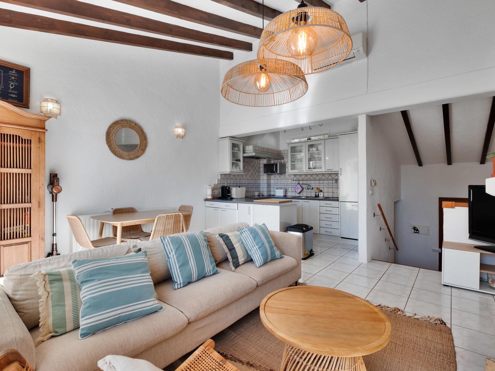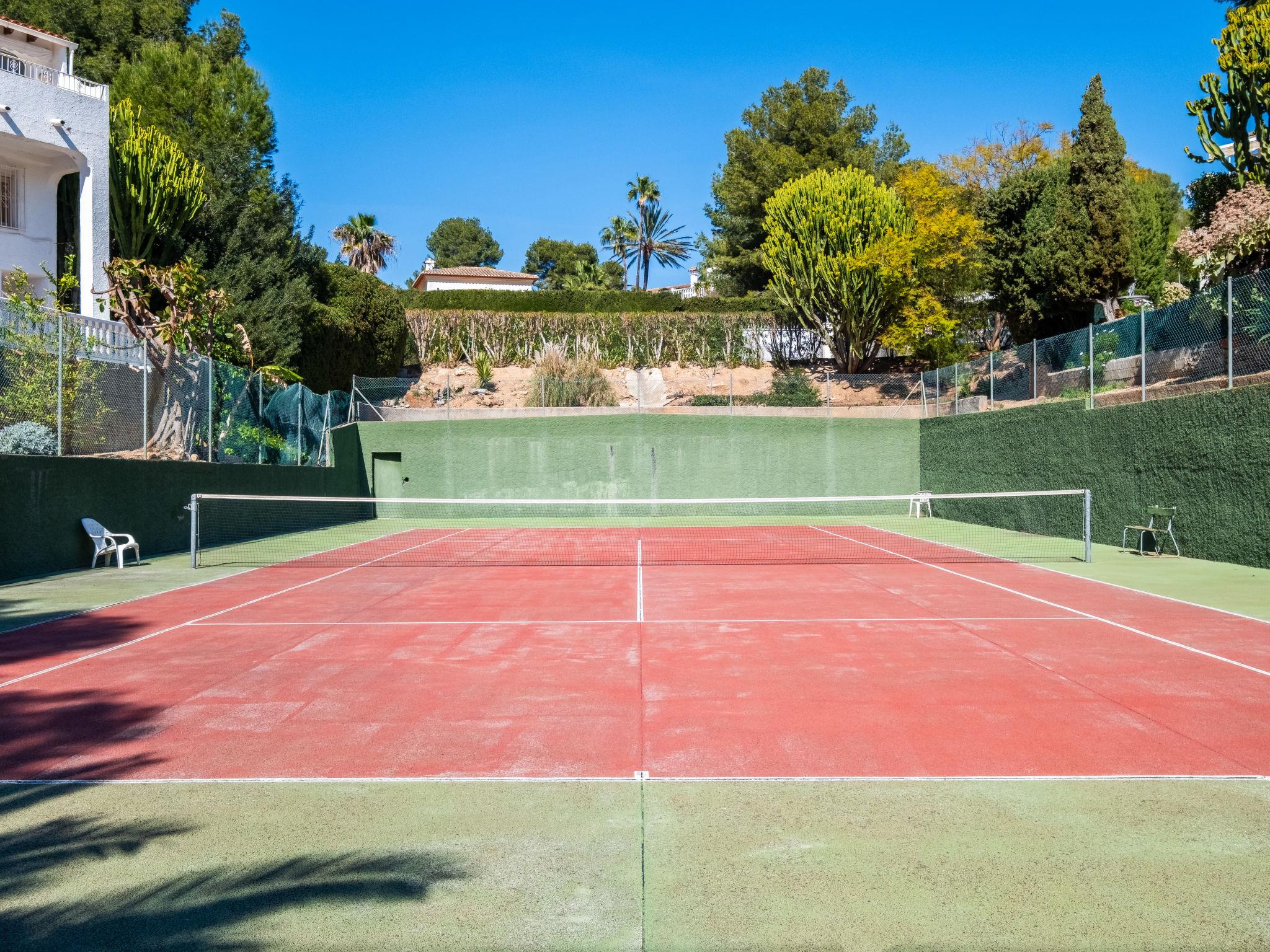Els Pins: Beautiful terraced house "Lisa", 2 storeys. 3 km from the centre of Moraira, in a quiet, sunny position residential area (villas), traffic calmed area, 2 km from the sea, 2 km from the beach. For shared use: swimming pool (19 x 8 m, seasonal availability: 01.Jan. - 31.Dec.). Children's pool, outdoor shower, tennis, terrace. Private: property (fenced), garden. Terrace. Shop 1 km, grocery 1 km, supermarket 1 km, restaurant 650 m, bus stop 2 km, ferry 3 km, sandy beach "Playa Ampolla", rocky beach "Playa La Galera" 1.5 km. Sports harbour 4 km, marina 4 km, golf course (12 hole) 1.5 km. The owner does not accept any youth groups.